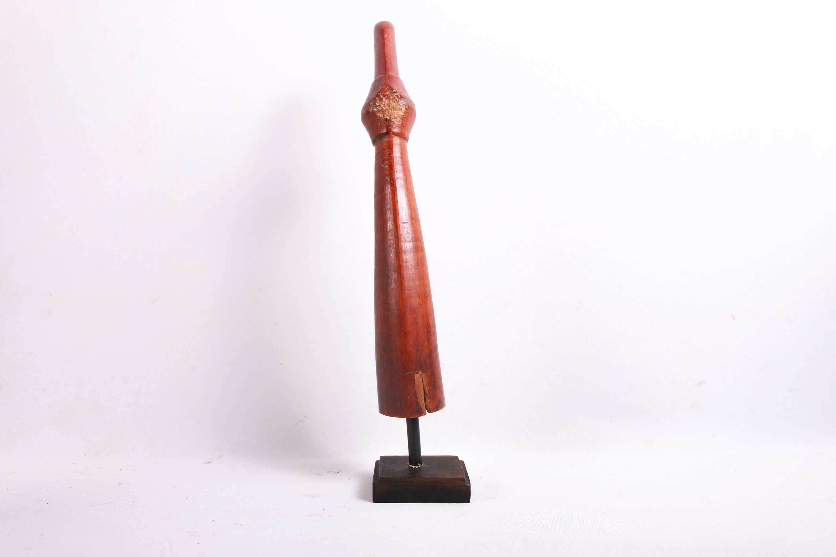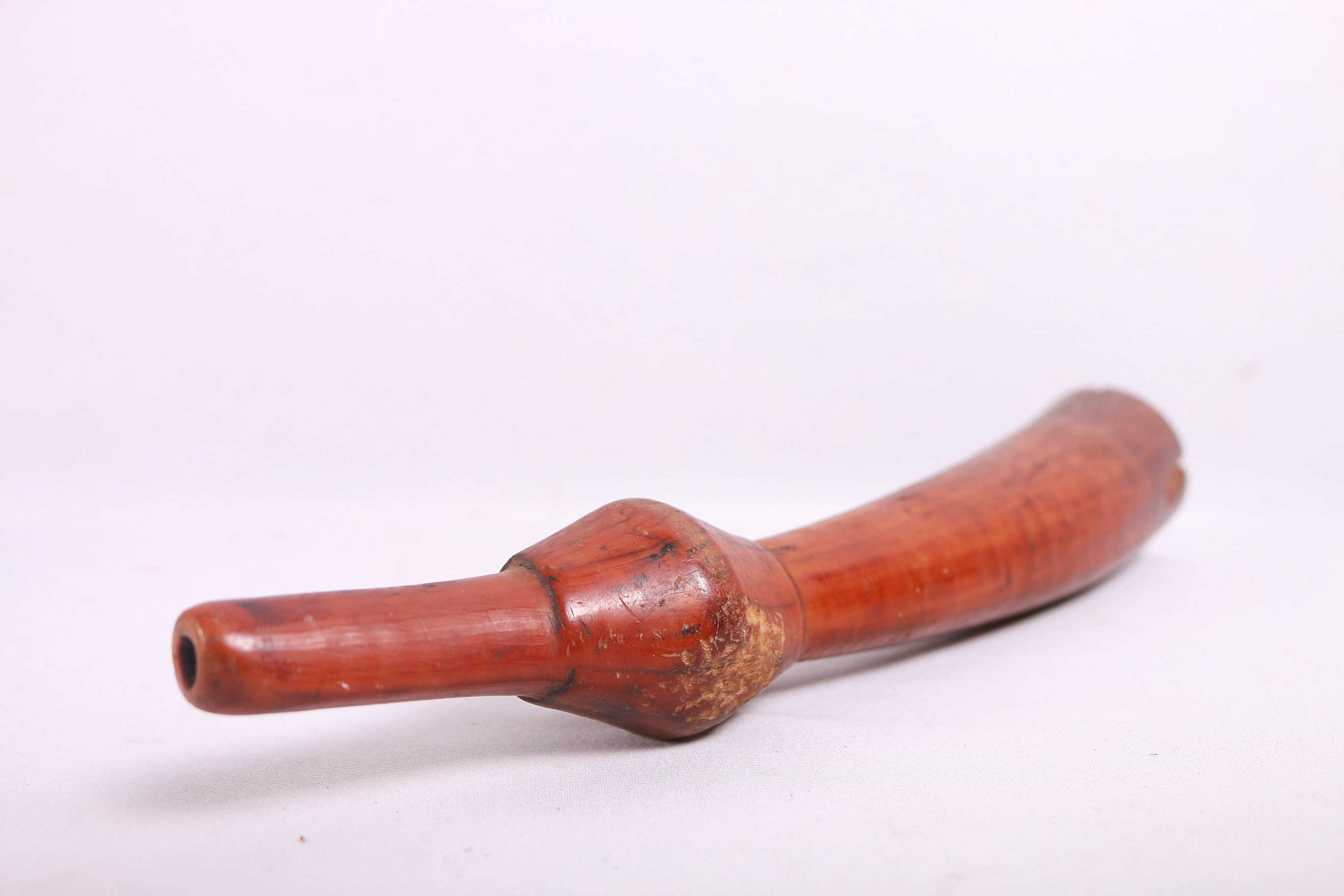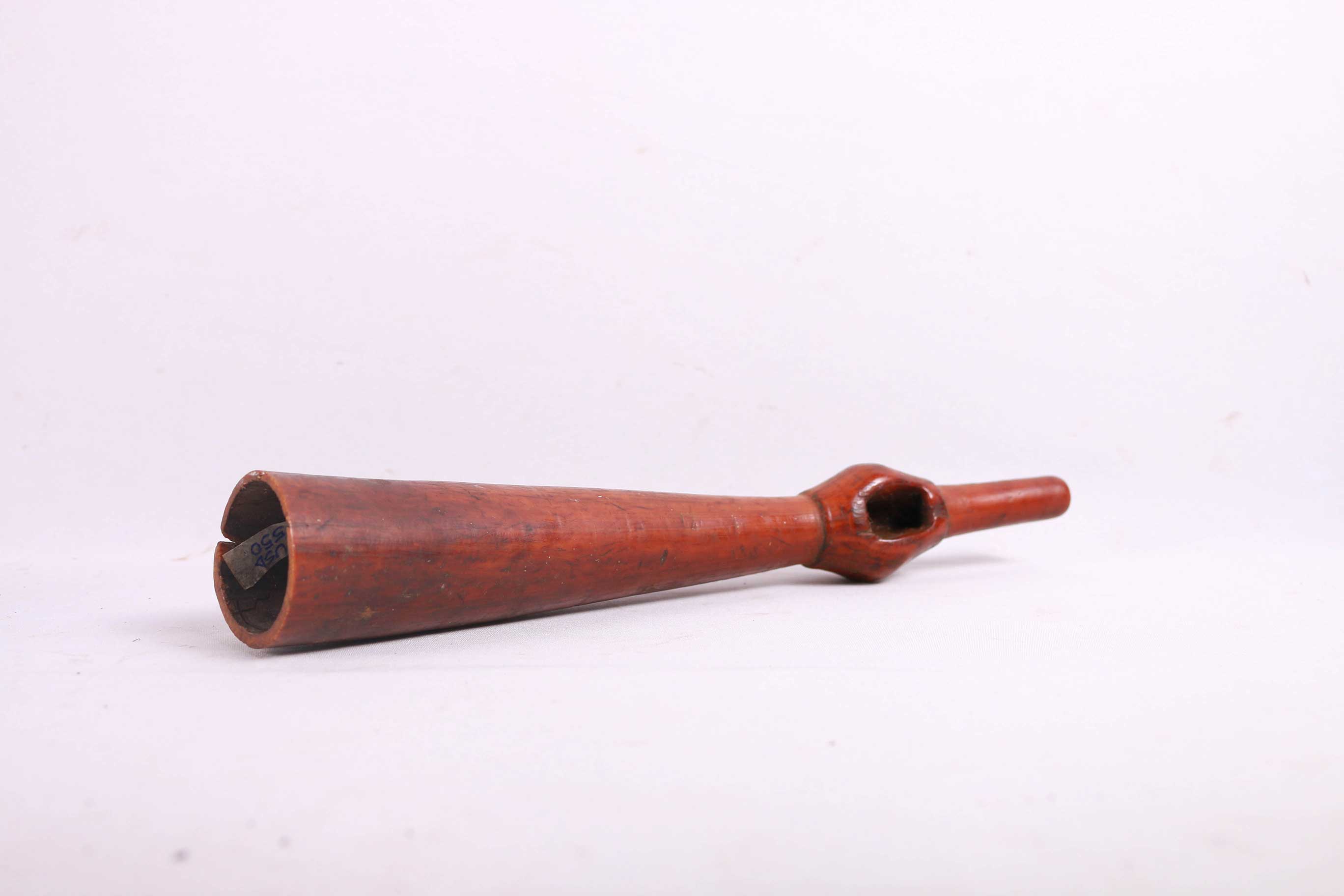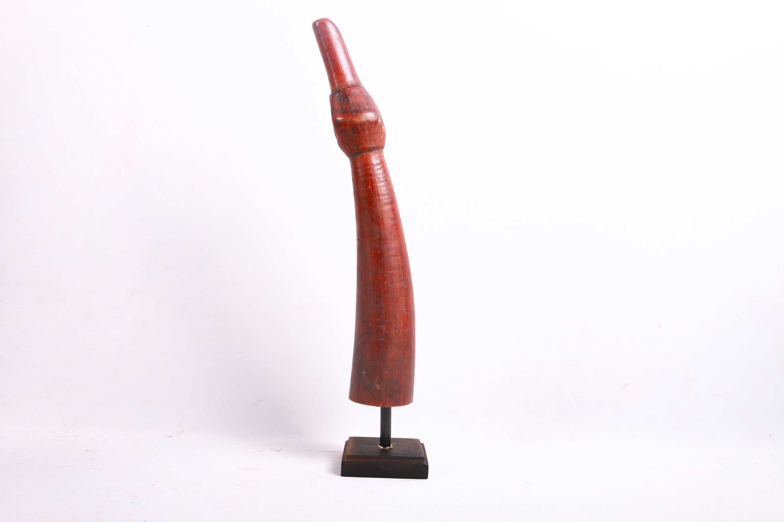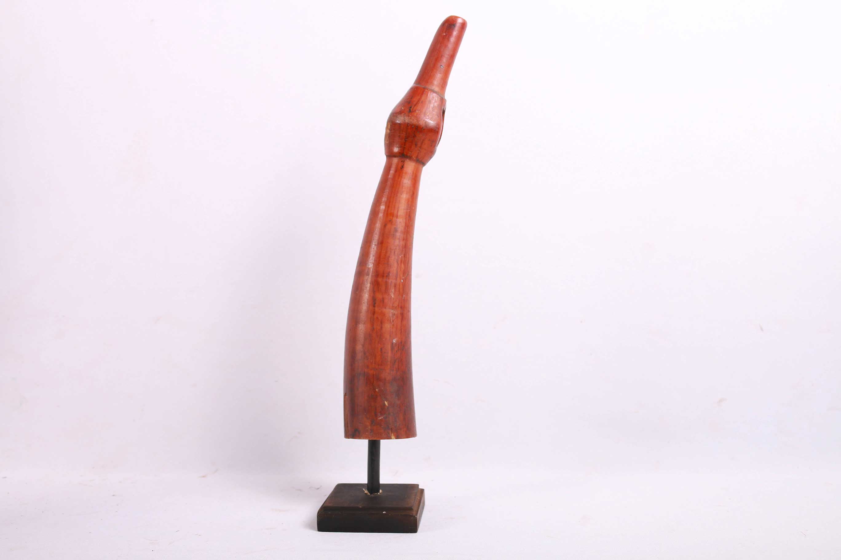 The Lega is an ethnic group found in the Democratic Republic of Congo. The Lega tribe art is created for primarily their semisecret associations of men and women, such as the Bwami society of the Lega peoples. The teachings of Bwami are a cornerstone of all aspects of life, guiding the moral development of the individual and governing relations with others. Bwami doctrine is represented by wood and ivory masks, heads, and small figures, all of which play a vital role during initiation into the society’s highest grades. This is a Lega mask commonly known as “Mpanda”, it is painted on the side with black lettering. It is a side-blown trumpet made of visibly very old ivory. With an oval mouthpiece on the inside, a charming face in relief on the thickened external body, and a hole for a carrying cord underneath. The external surfaces of the instrument are decorated with typical tribal motifs of geometric dots of the Lega, a tribe living in the eastern Democratic Republic of Congo. Such horns were blown in war dances, they also announced the killing of an elephant.