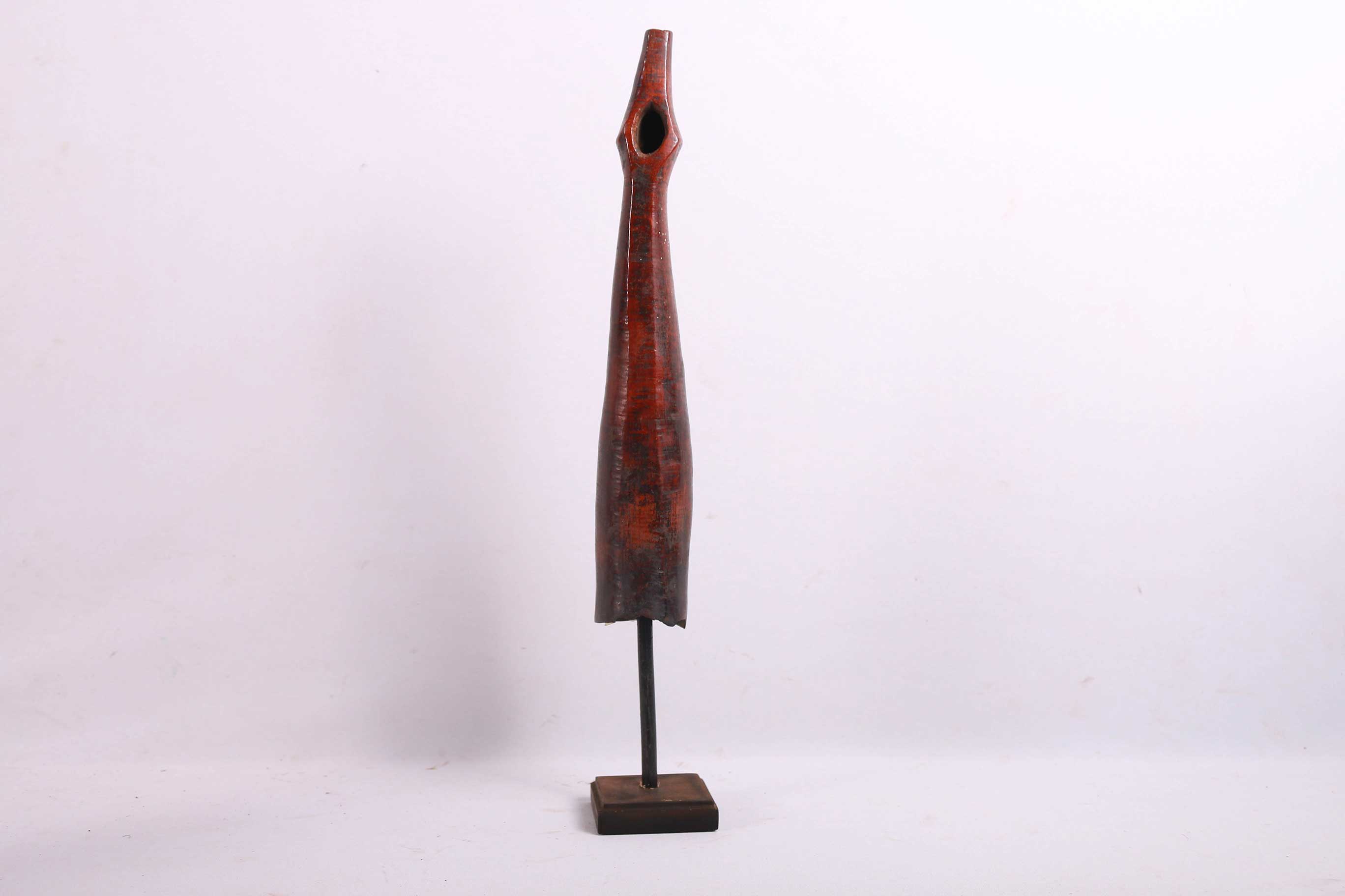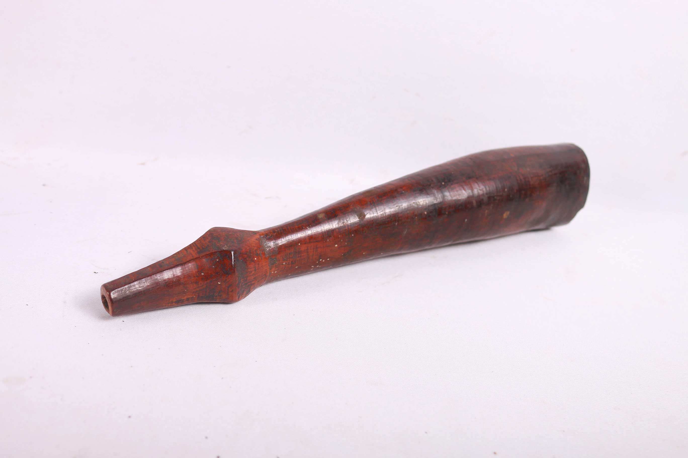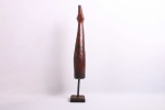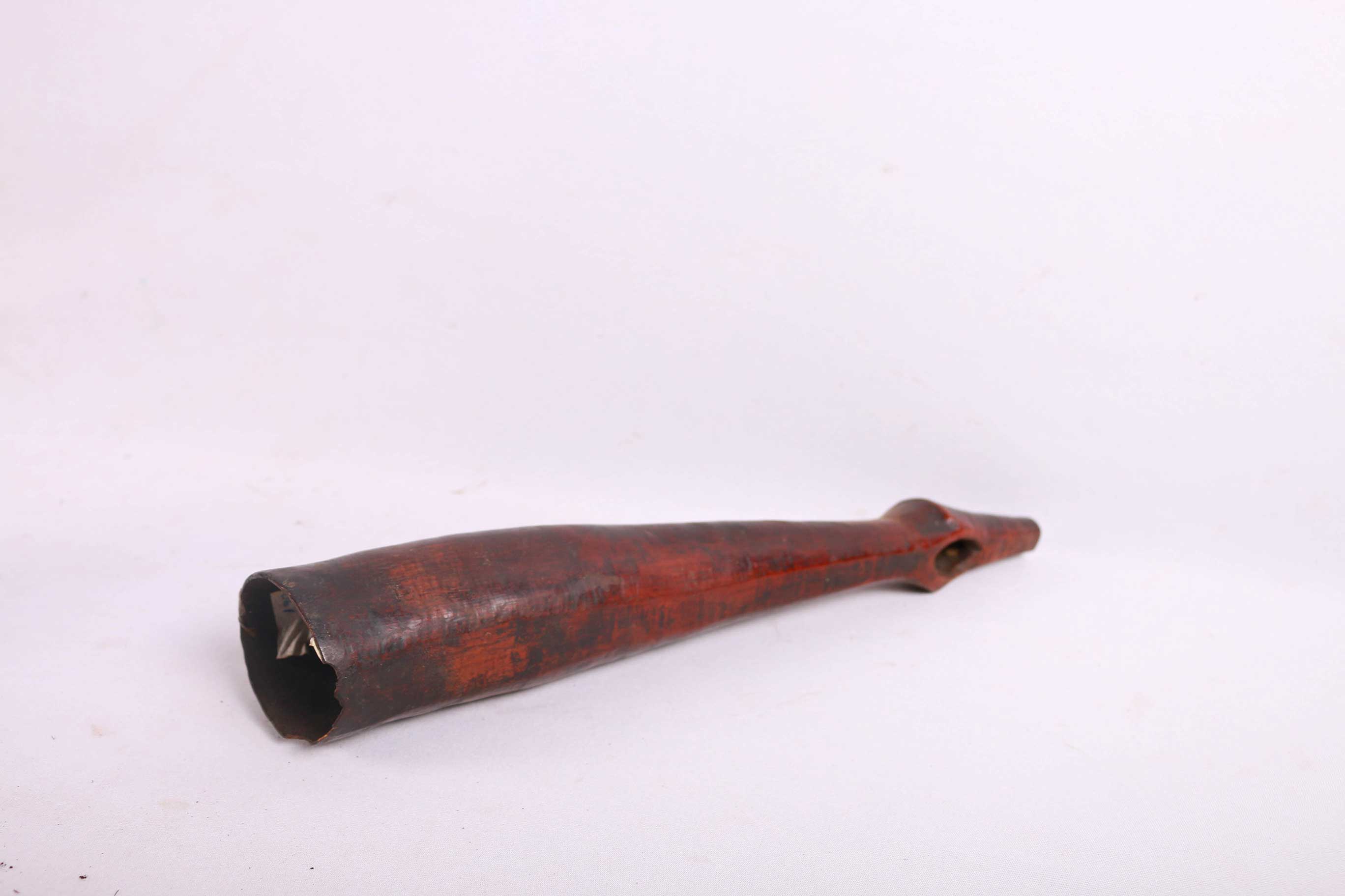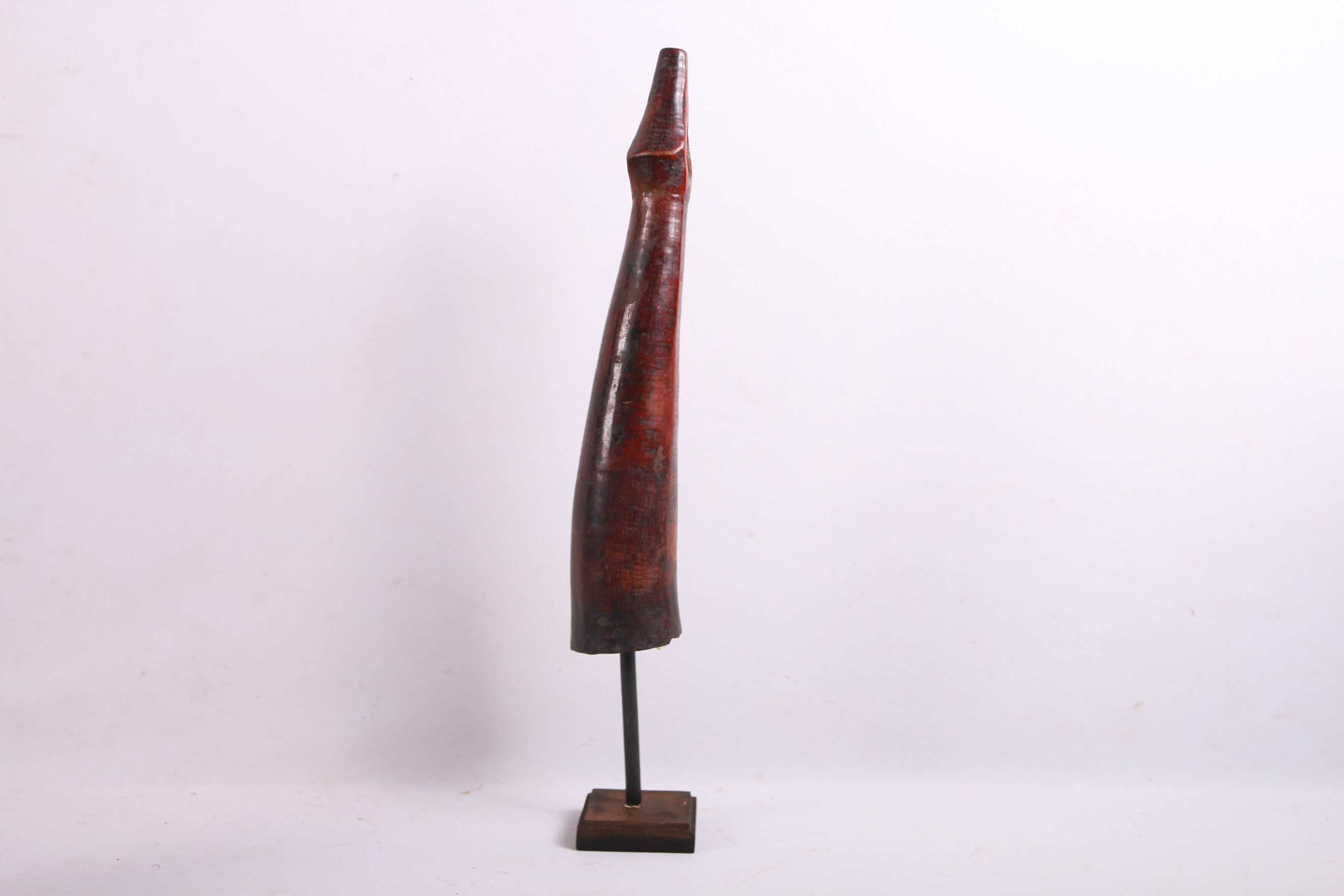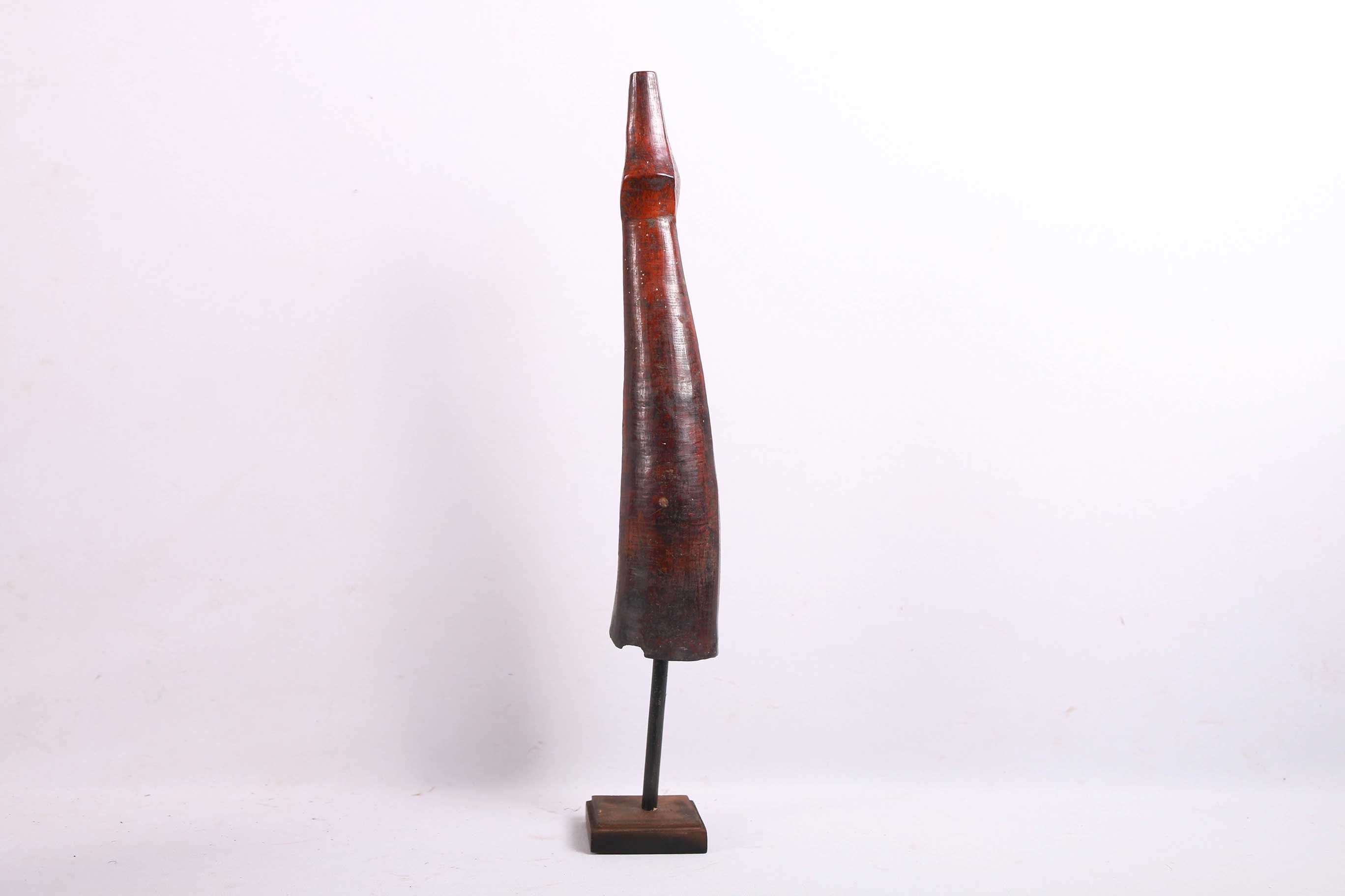 The Lega is an ethnic group found in the Democratic Republic of Congo. The Lega tribe art is created for primarily their semisecret associations of men and women, such as the Bwami society of the Lega peoples. The teachings of Bwami are a cornerstone of all aspects of life, guiding the moral development of the individual and governing relations with others. Bwami doctrine is represented by wood and ivory masks, heads, and small figures, all of which play a vital role during initiation into the society’s highest grades. This is a Lega mask commonly known as “Mpanda”, it is painted on the side with black lettering. It is a side-blown trumpet made of visibly very old ivory. With an oval mouthpiece on the inside, a charming face in relief on the thickened external body, and a hole for a carrying cord underneath. The external surfaces of the instrument are decorated with typical tribal motifs of geometric dots of the Lega, a tribe living in the eastern Democratic Republic of Congo. Such horns were blown in war dances, they also announced the killing of an elephant.