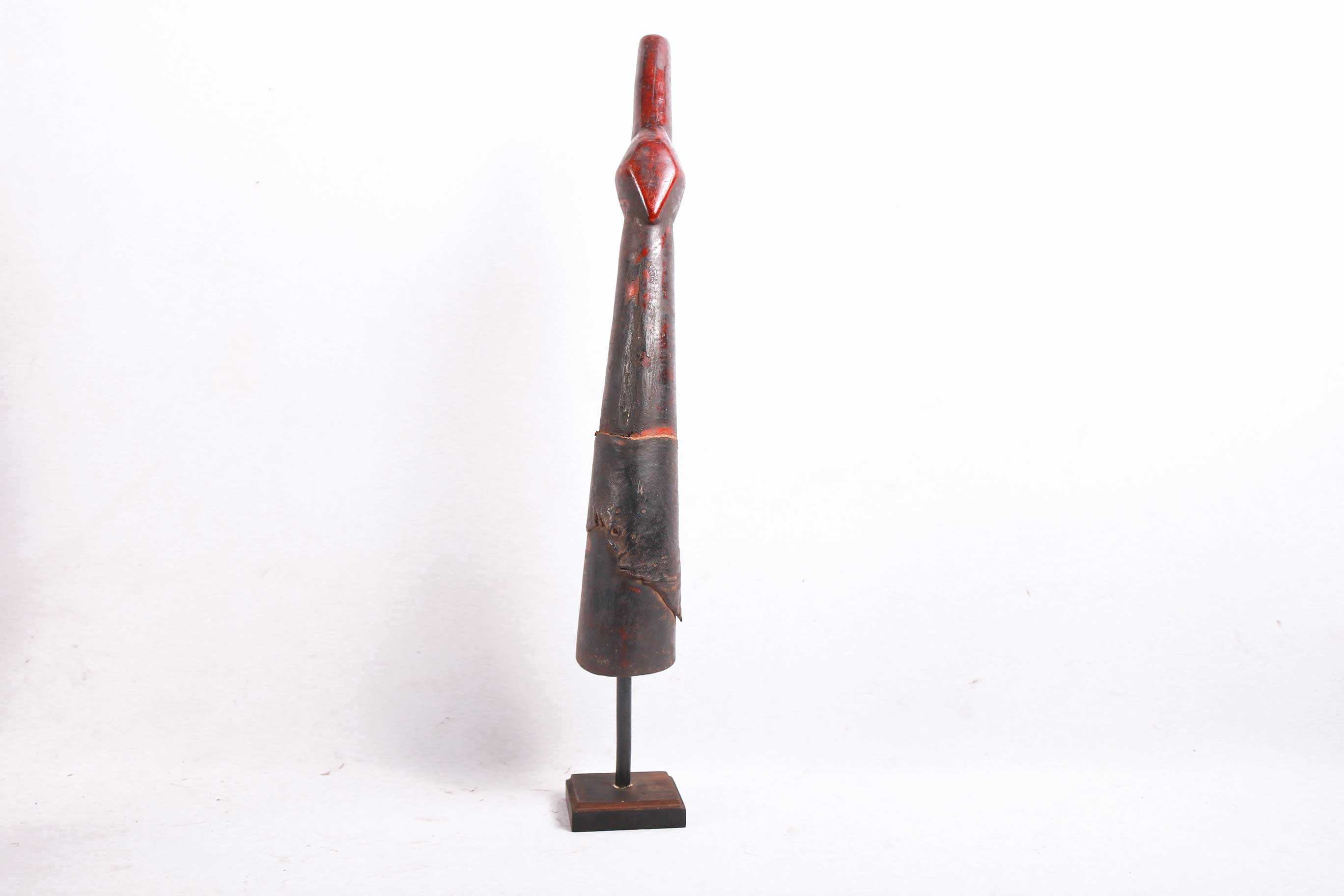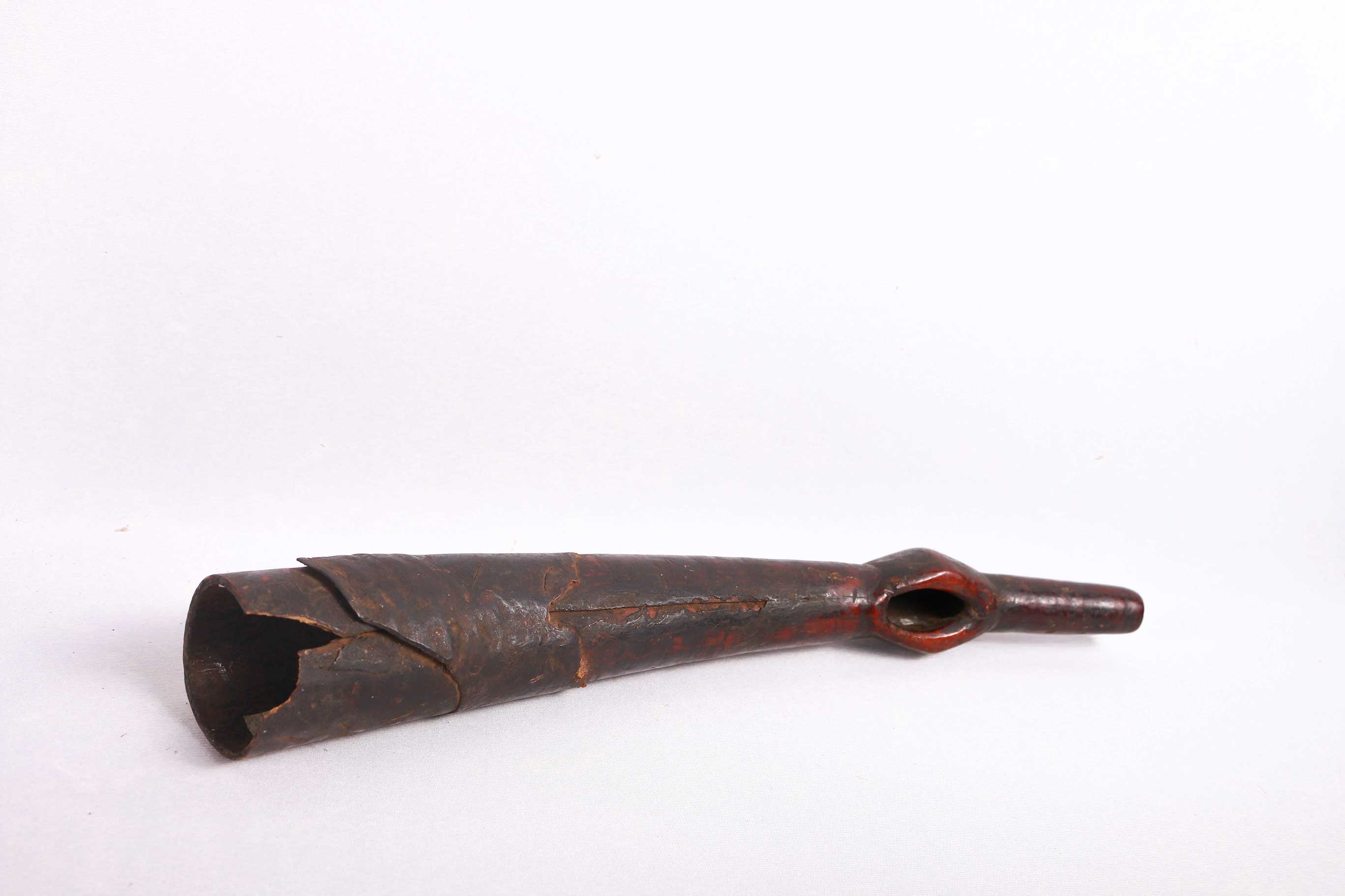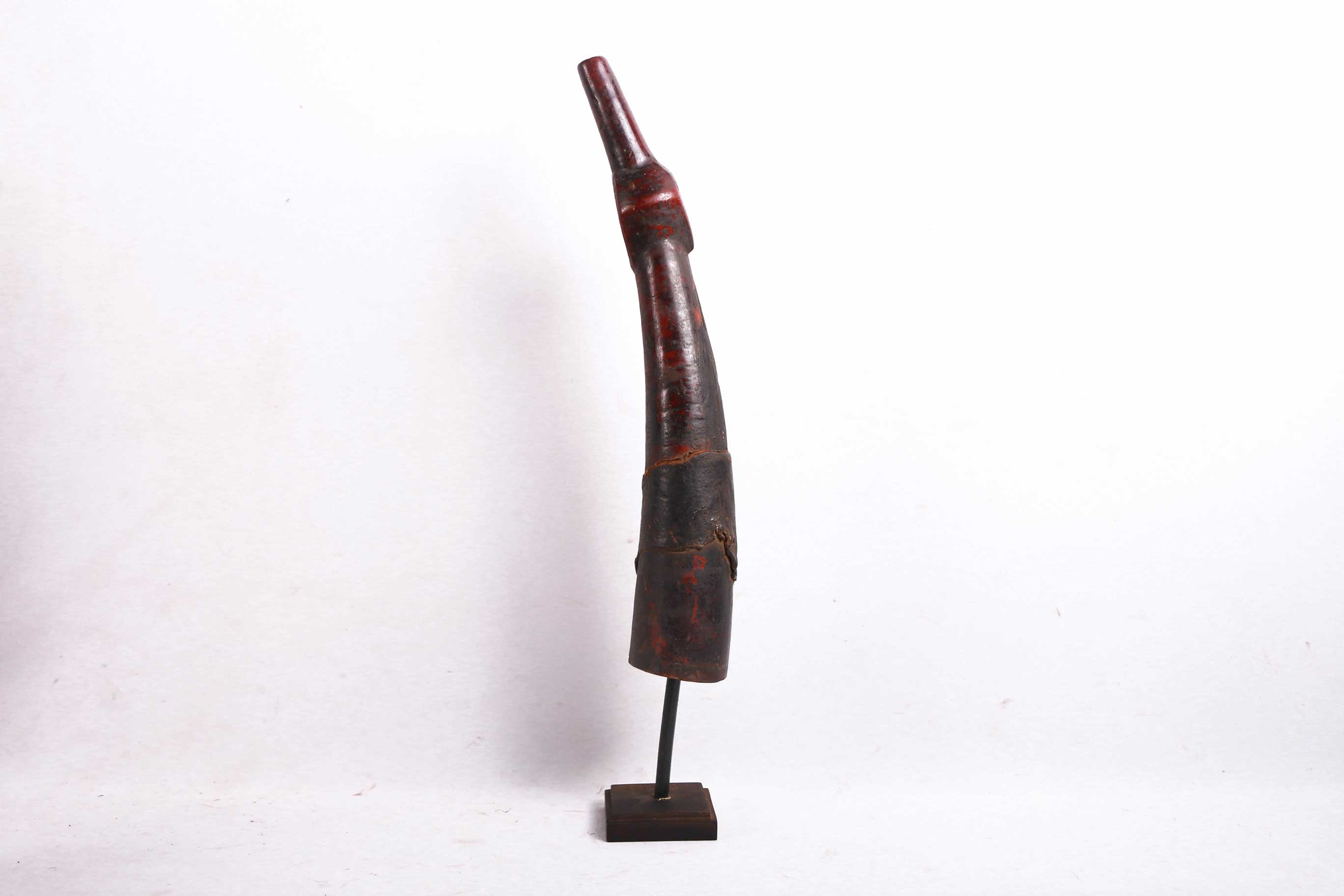 The Lega is an ethnic group found in the Democratic Republic of Congo. The Lega tribe art is created for primarily their semisecret associations of men and women, such as the Bwami society of the Lega peoples. The teachings of Bwami are a cornerstone of all aspects of life, guiding the moral development of the individual and governing relations with others. Bwami doctrine is represented by wood and ivory masks, heads, and small figures, all of which play a vital role during initiation into the society’s highest grades. This is a Lega mask commonly known as “Mpanda”, it is painted on the side with black lettering. The wide end is wrapped with animal skin. It is a side-blown trumpet made of visibly very old ivory. With an oval mouthpiece on the inside, a charming face in relief on the thickened external body, and a hole for a carrying cord underneath. It has old animal skin wrapped around it. Such horns were blown in war dances, they also announced the killing of an elephant.