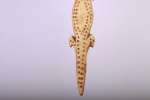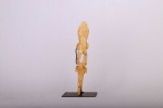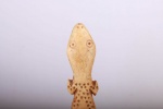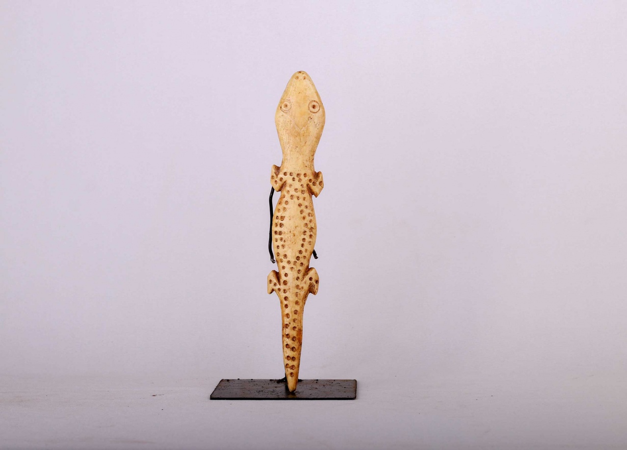 Zoomorphic forms are emblems used in initiation, individuals of lower grade may own them unless they are made of ivory. These stylized figures have prescribed a name during the ritual that does not necessarily correspond with the sculptural form. This is an old figure carved in lizard shape with a light brown patina and visible signs of old age and usage.
