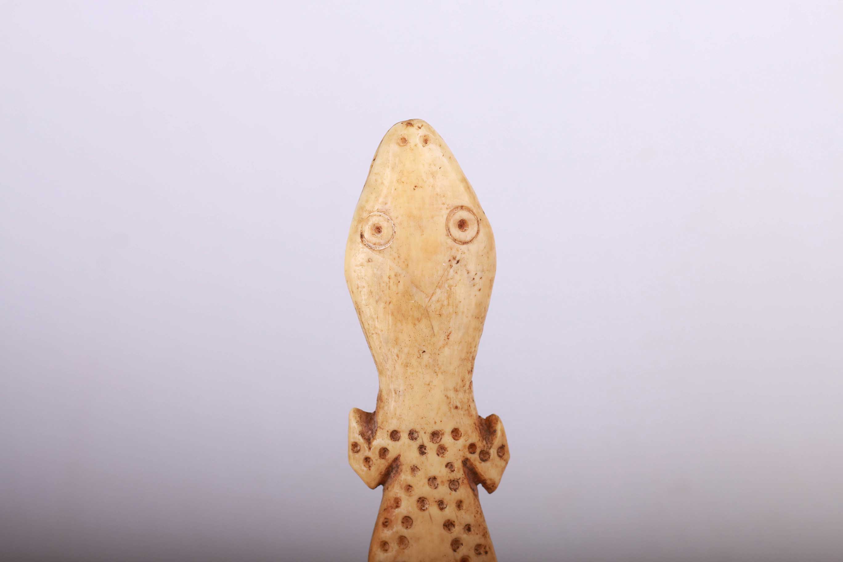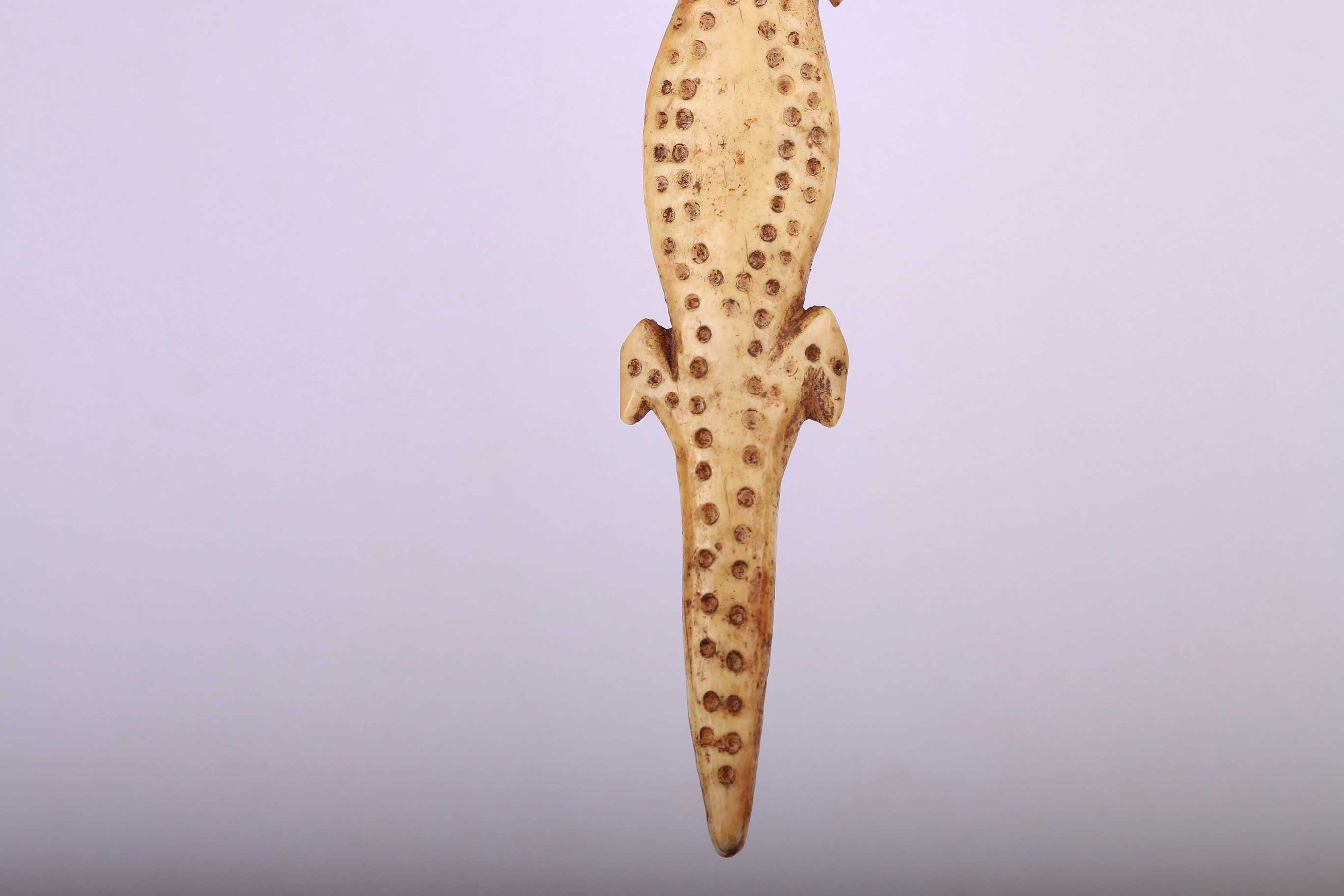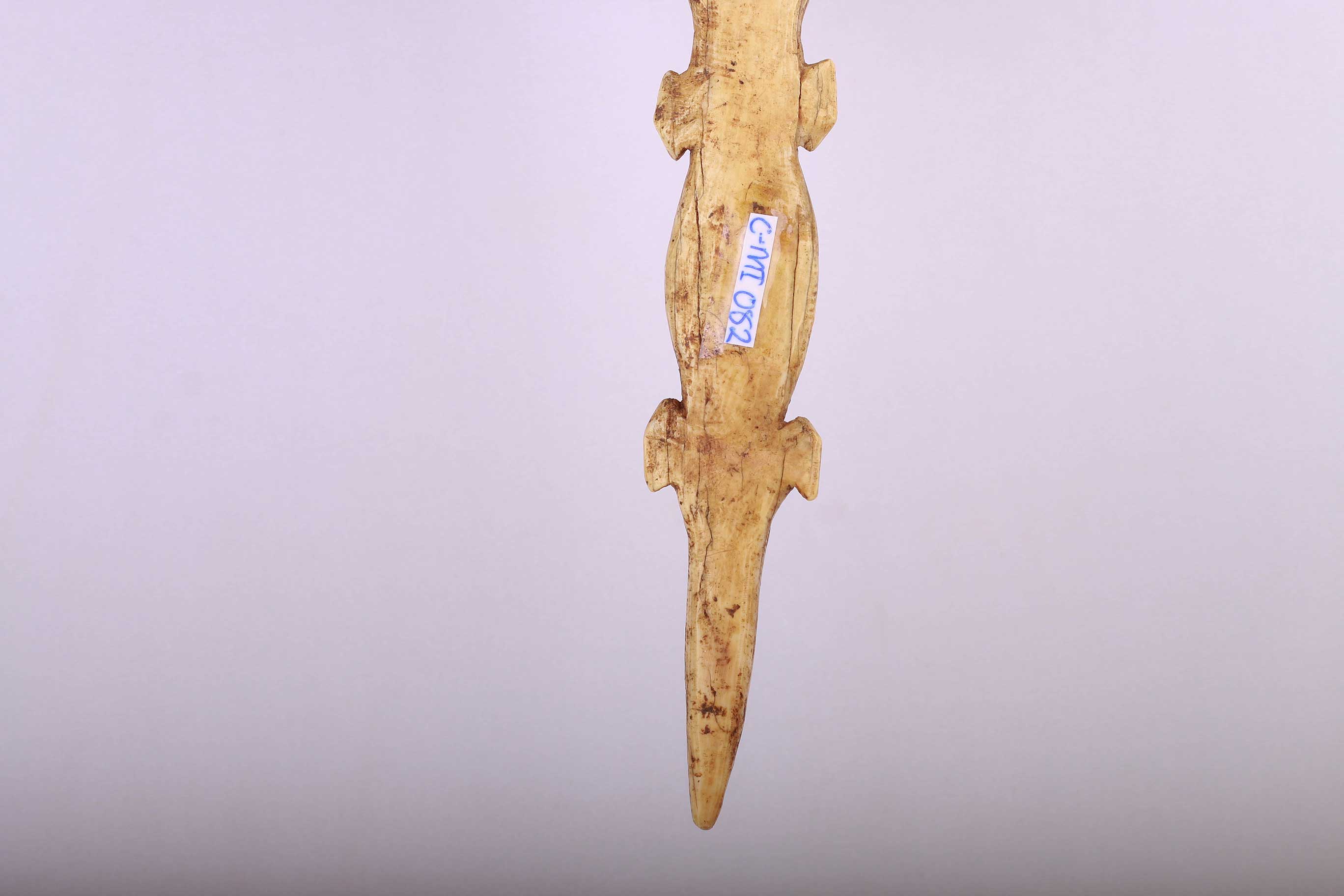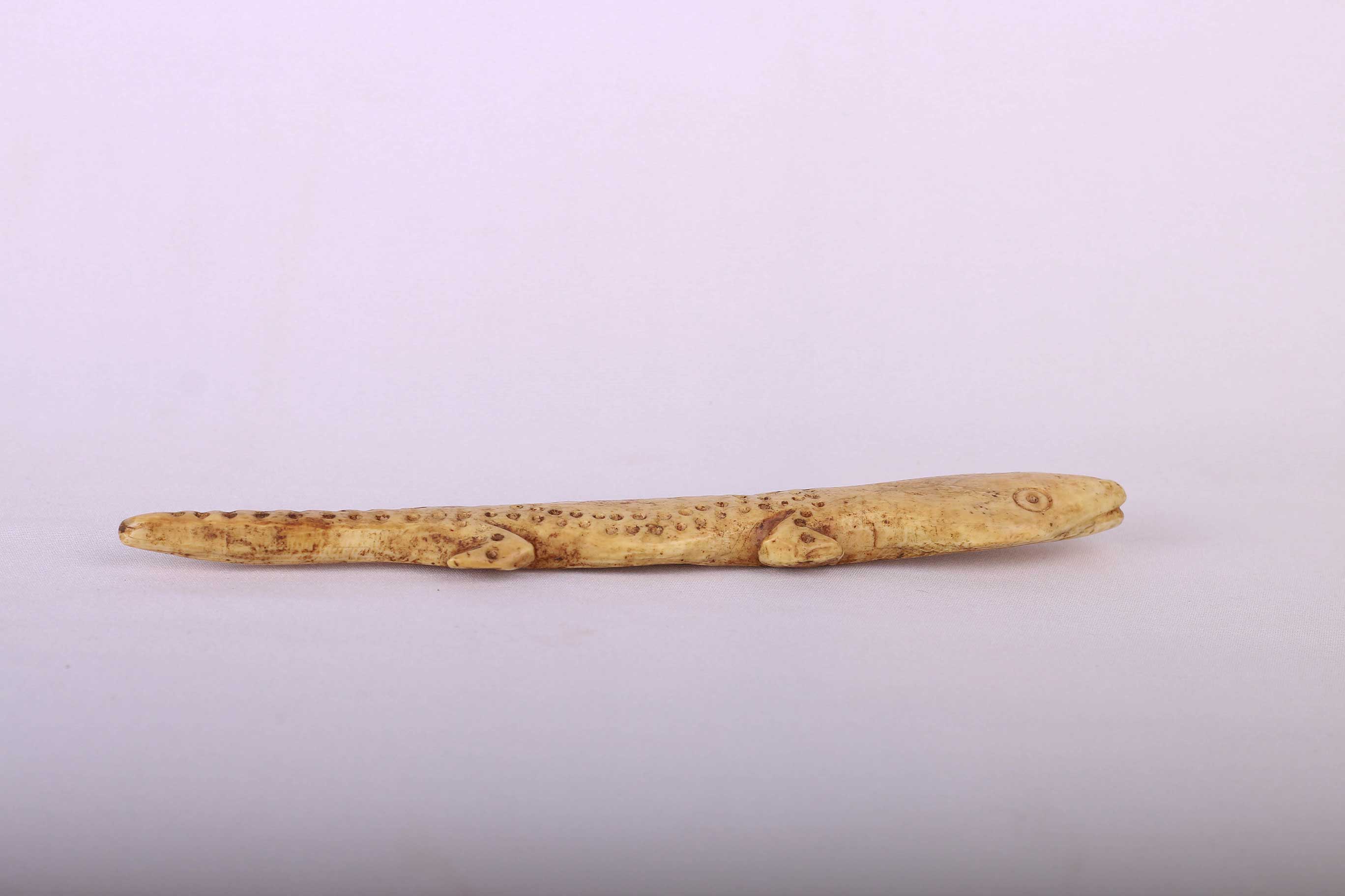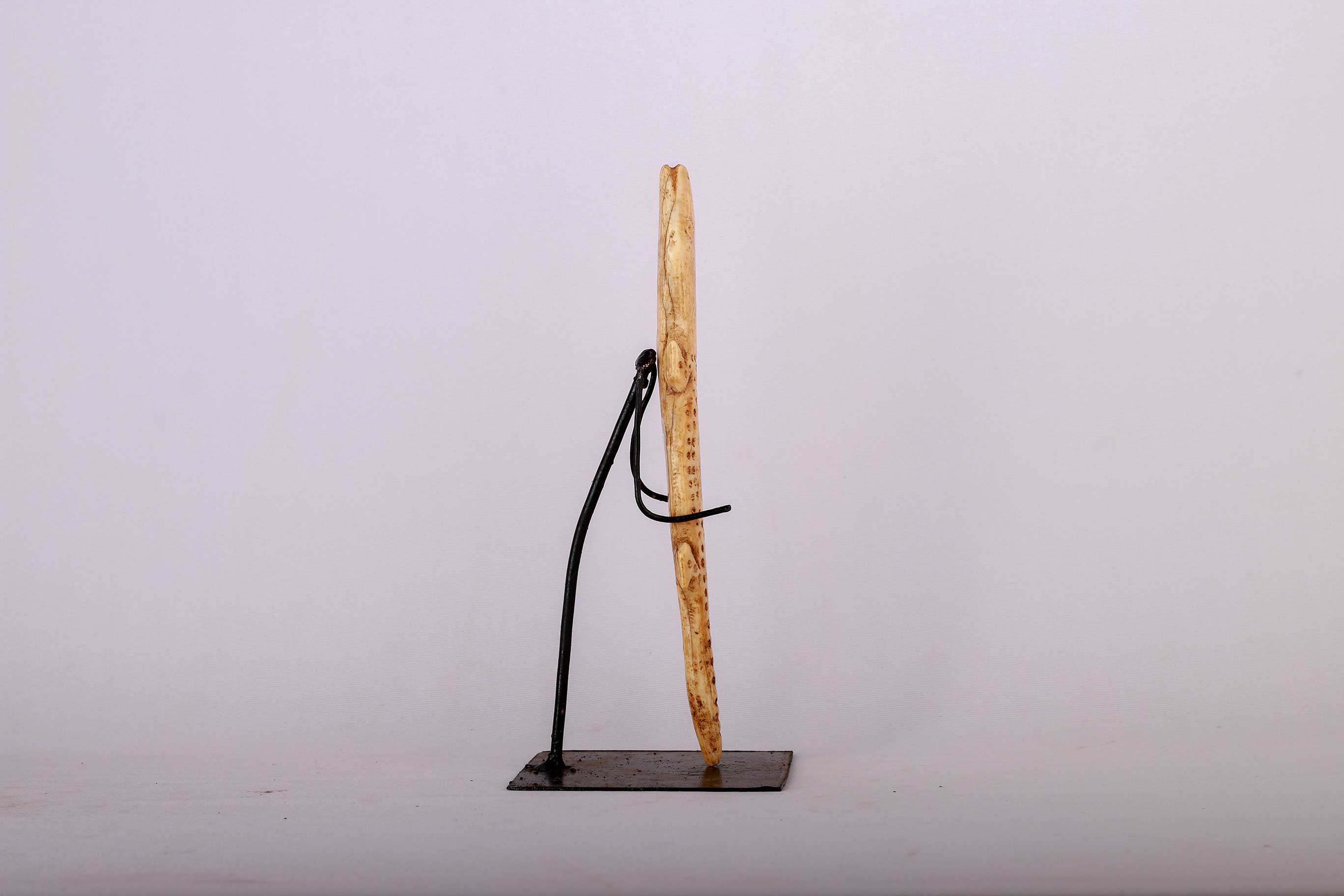 This is an old ivory zoomorphic carving locally known as “Mugugunda”, it originated from the Lega tribe an ethnic group found in the Democratic Republic of Congo. The Lega tribe art is created for primarily their semisecret associations of men and women, such as the Bwami society of the Lega peoples. Among the typology of zoomorphic items used in bwami, carved from wood, ivory, elephant bone, clay, there are hundreds of found object types displayed alongside ivory in initiation. Some zoomorphic sculptures, mostly quadrupeds are carved in an ambiguous form rendering them nearly impossible to identify.