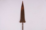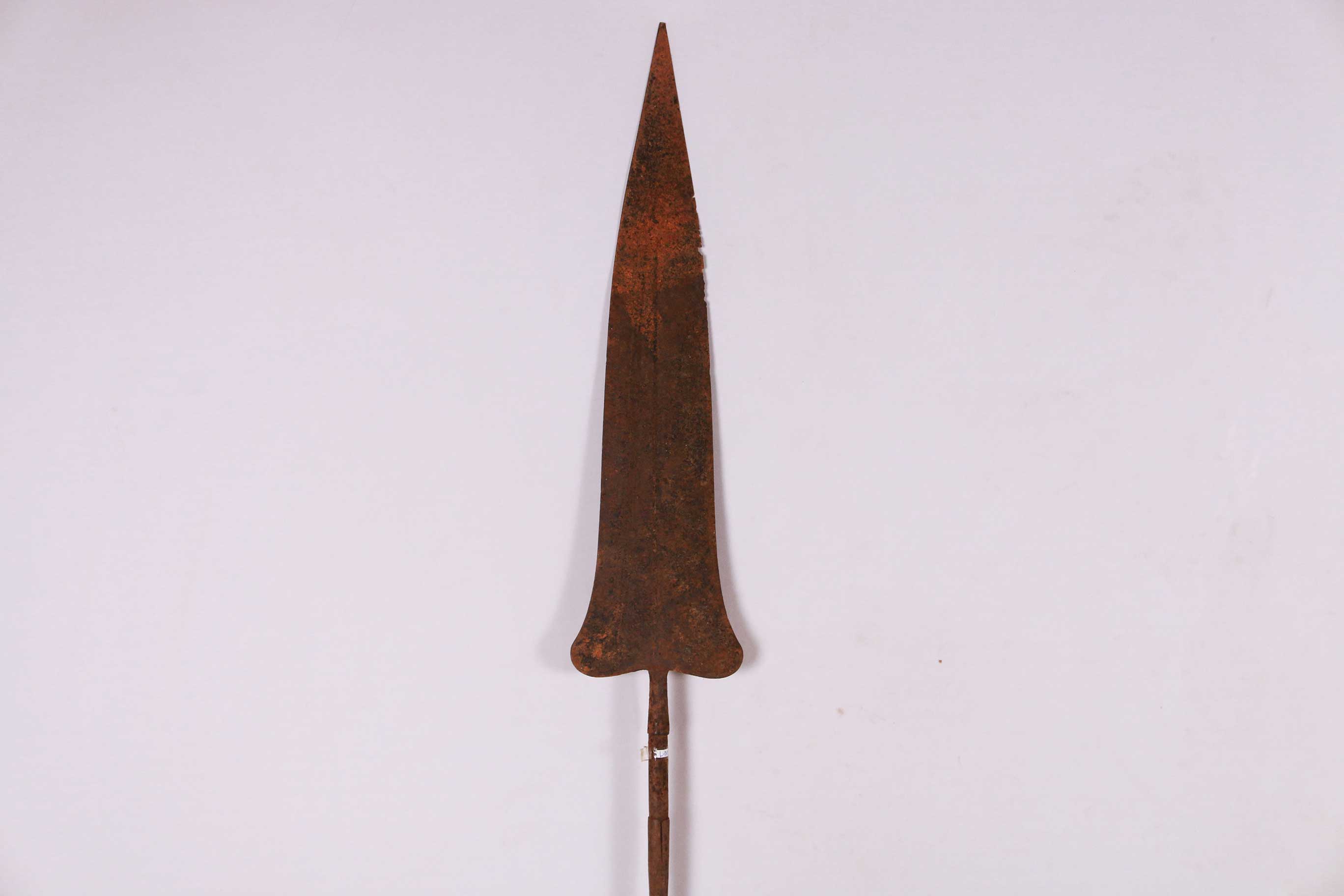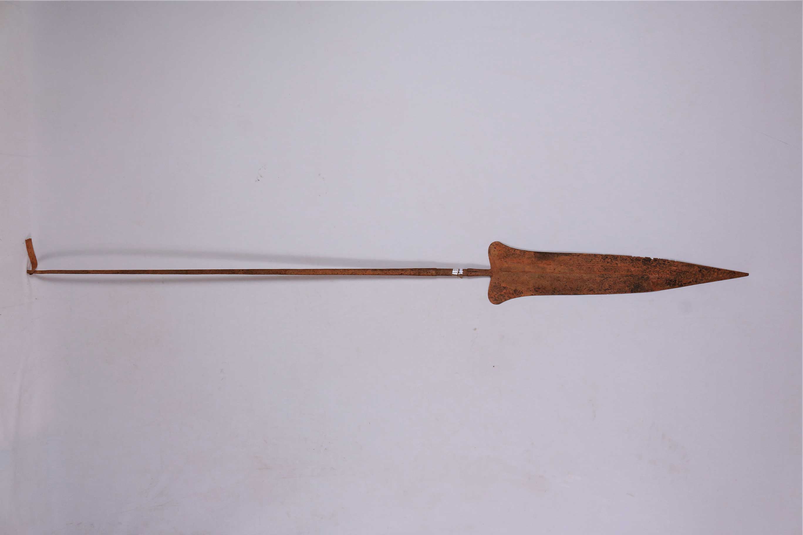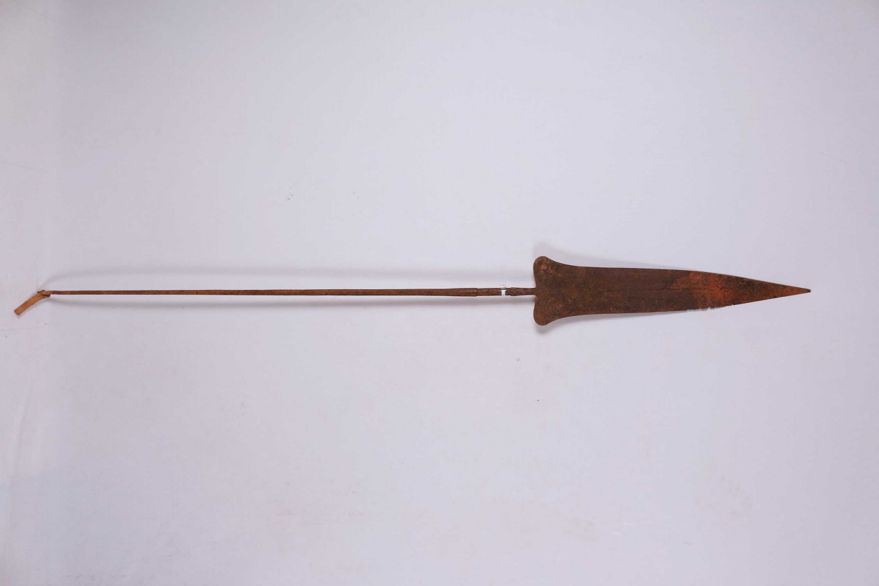 The Lokele as known as Kele people are a Bantu ethnic group located, in the Democratic Republic of Congo. They live on the banks of the Congo River. They neighbour the Topoke, Budja, etc. In this region, such spears ‘spear money’ commonly known as Liganda for large, important acquisitions like bride price, The present piece of ‘spear money’ shows a classical form of this ‘primitive money’. Forged from a single piece of iron. This rare Lokale spear is complete, without damage. It is a little rusty and shows signs of age but in good condition.