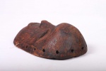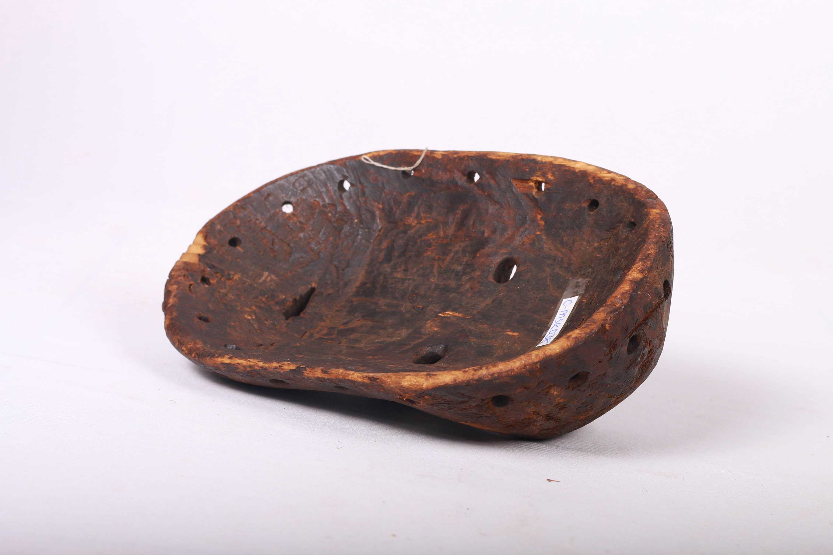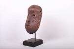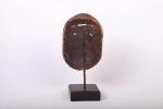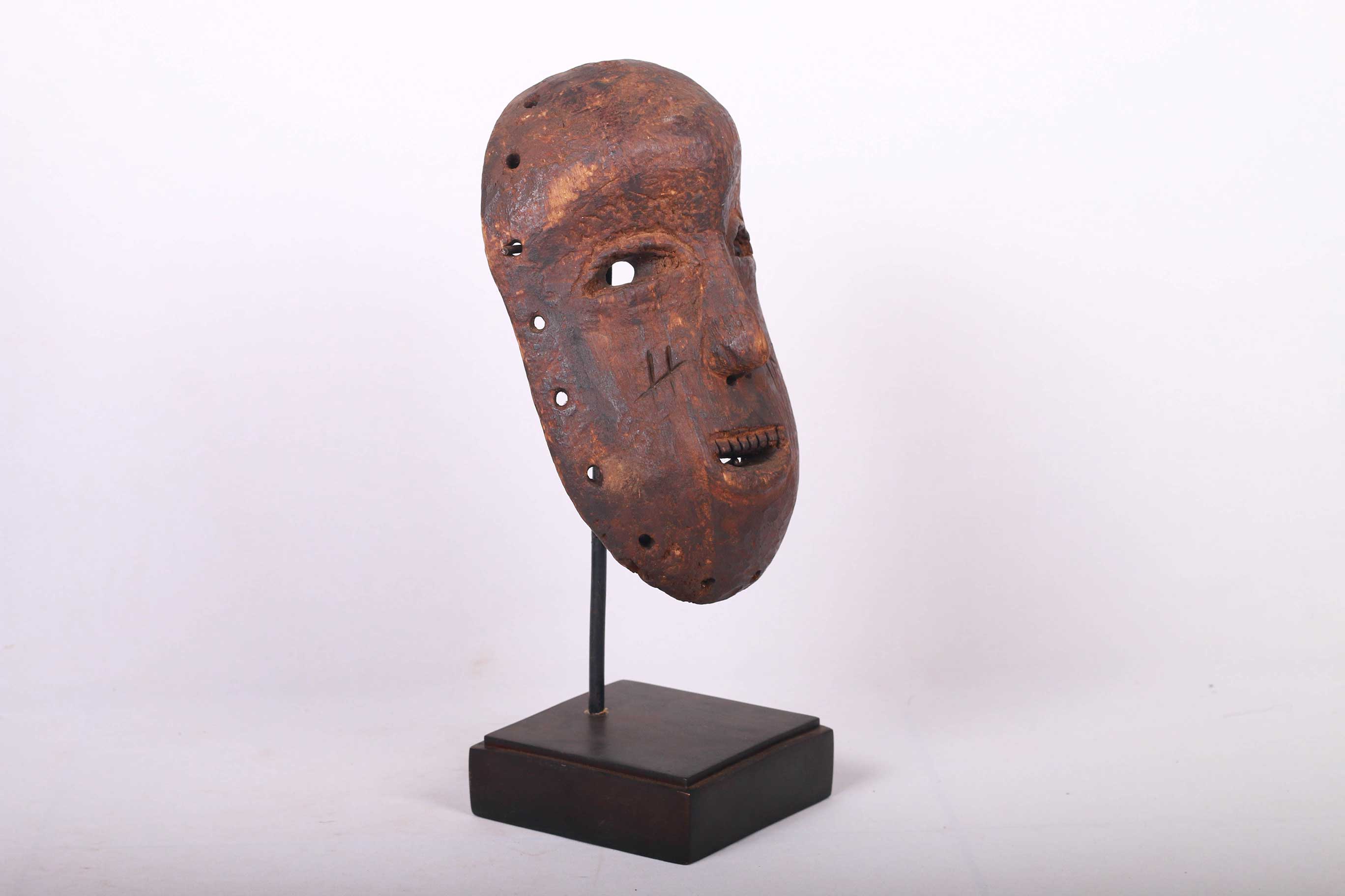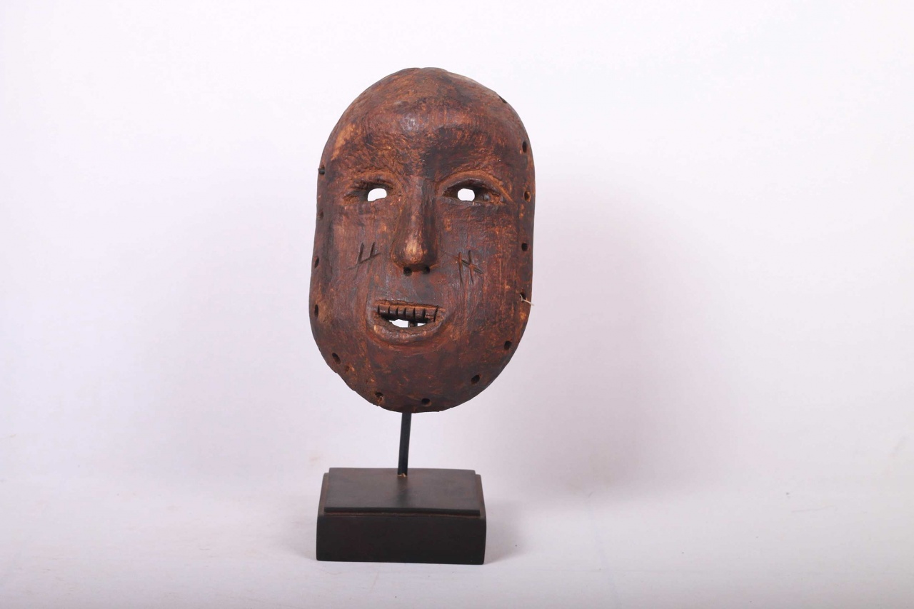 This astonishing mask originates from the Lombi, an ethnic group, located in the eastern Democratic Republic of Congo. They are extremely rare and quite an isolated group because they speak a Sudanic language but are surrounded by Bantu linguistic families. This is a vintage wooden old mask, it has two slanted large holes representing eyes, a mouth with two rows of teeth and a protruding forehead. Based on what happens among the Lombi’s neighbors, it is believed to have been used during ceremonies linked to the initiations of young men. It resembles a number of masks from the Ituri forest and has a worn-out dark brown patina.