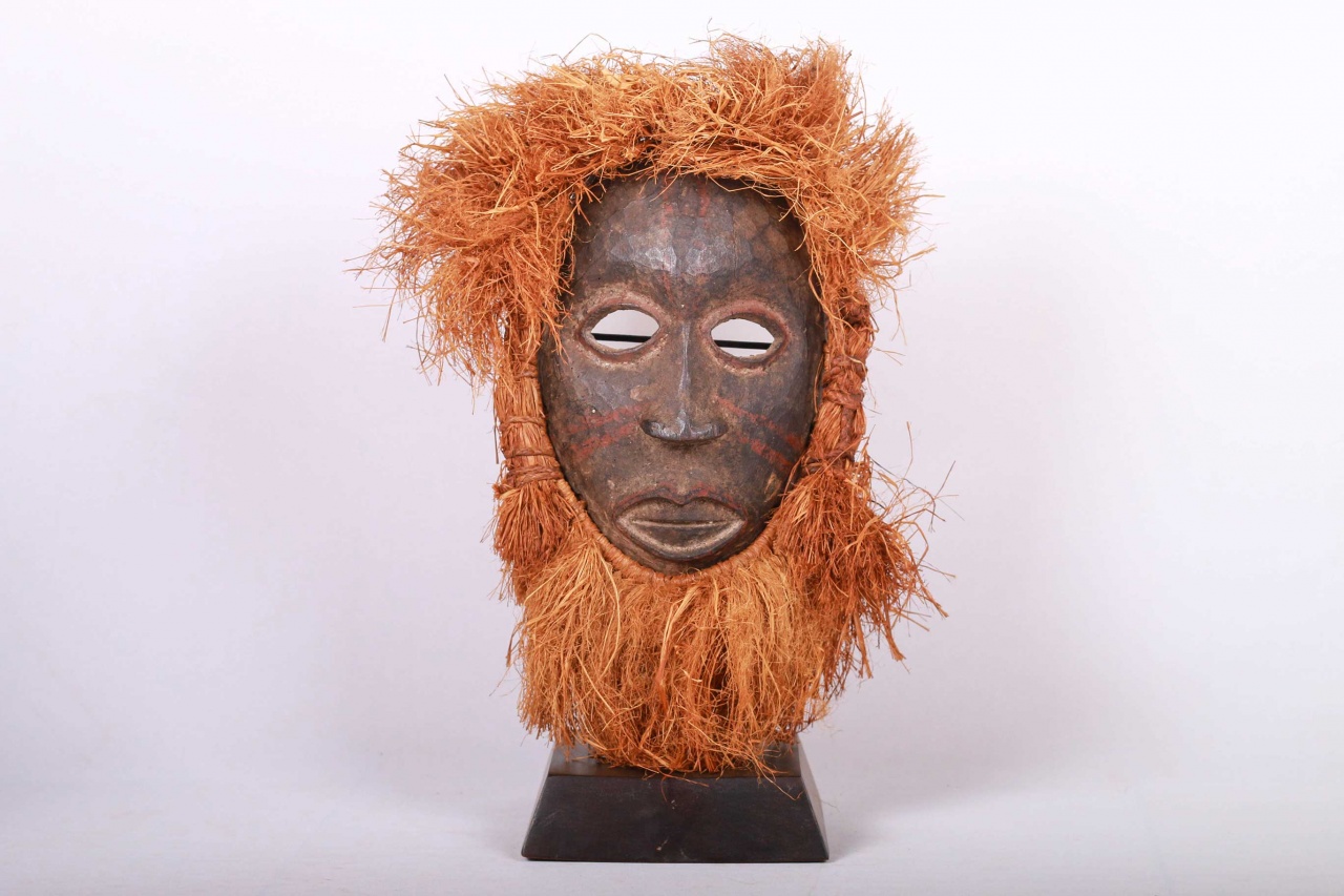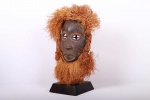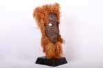 The Lombi made vintage masks with interesting features. The Lombi are an ethnic group, located in the eastern Democratic Republic of Congo. They are extremely rare and quite an isolated group because they speak a Sudanic language but are surrounded by Bantu linguistic families. This mask is flat and covered with faded white, blackish, red finger-applied dot pigment.