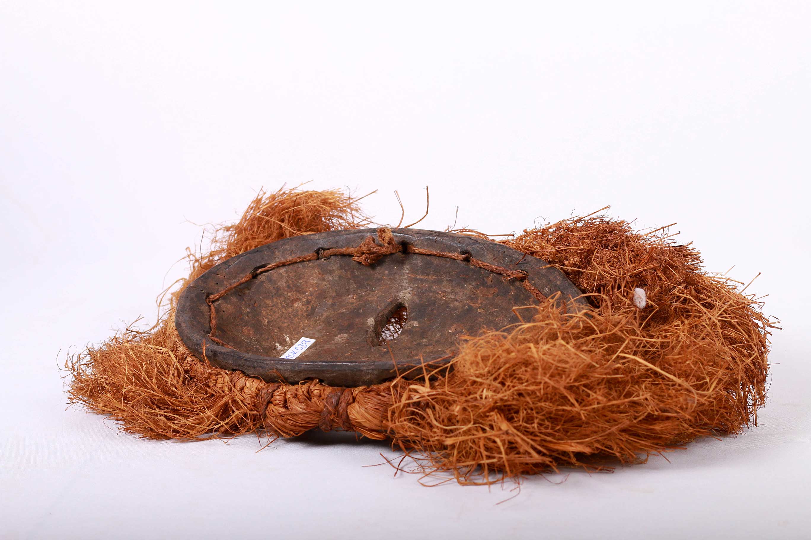 It has an unusual lozenge-shaped nose. This mask has two slanted large holes representing eyes. Based on what happens among the Lombi’s neighbors, it is believed to have been used during ceremonies linked to the initiations of young men. It resembles a number of masks from the Ituri mask.