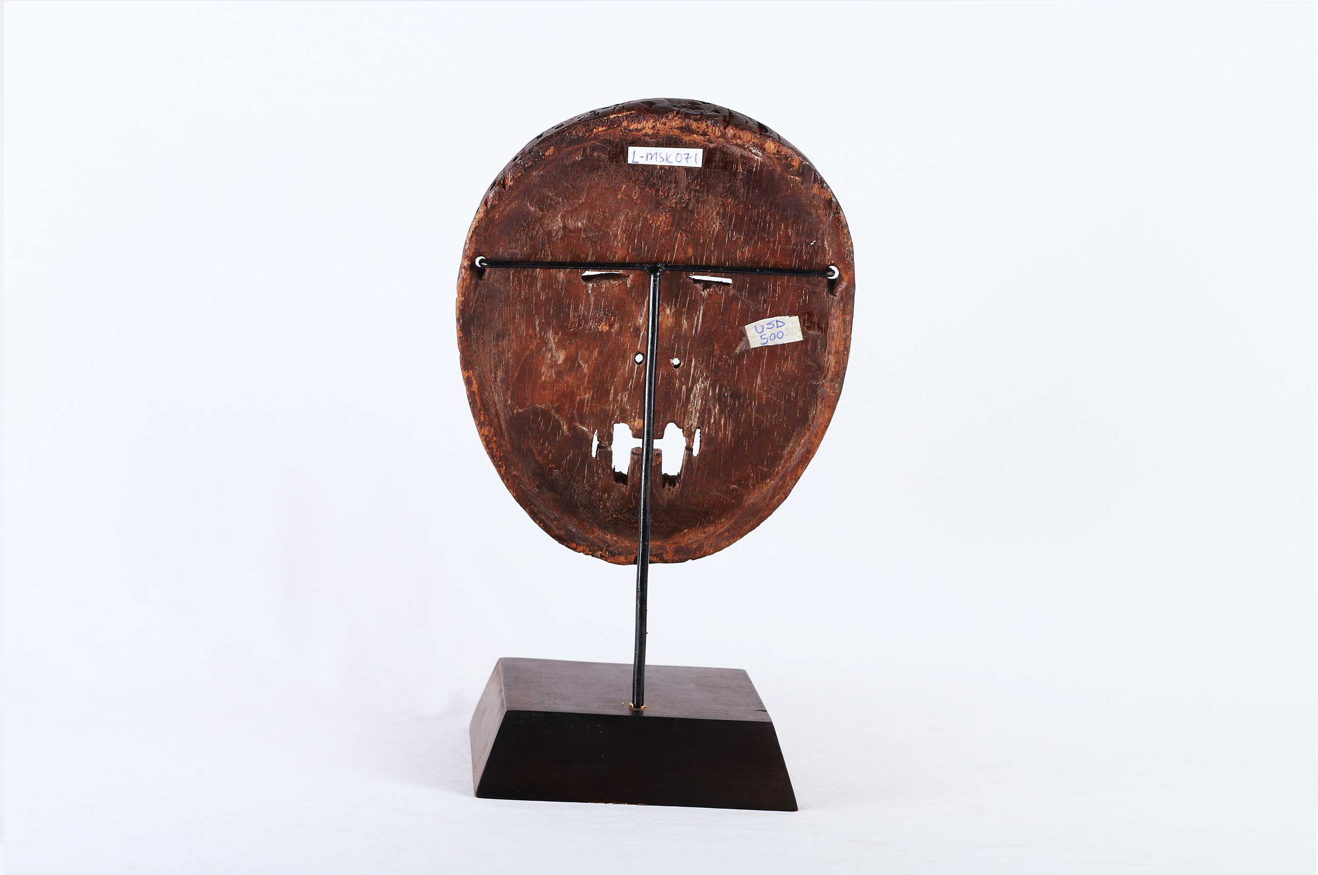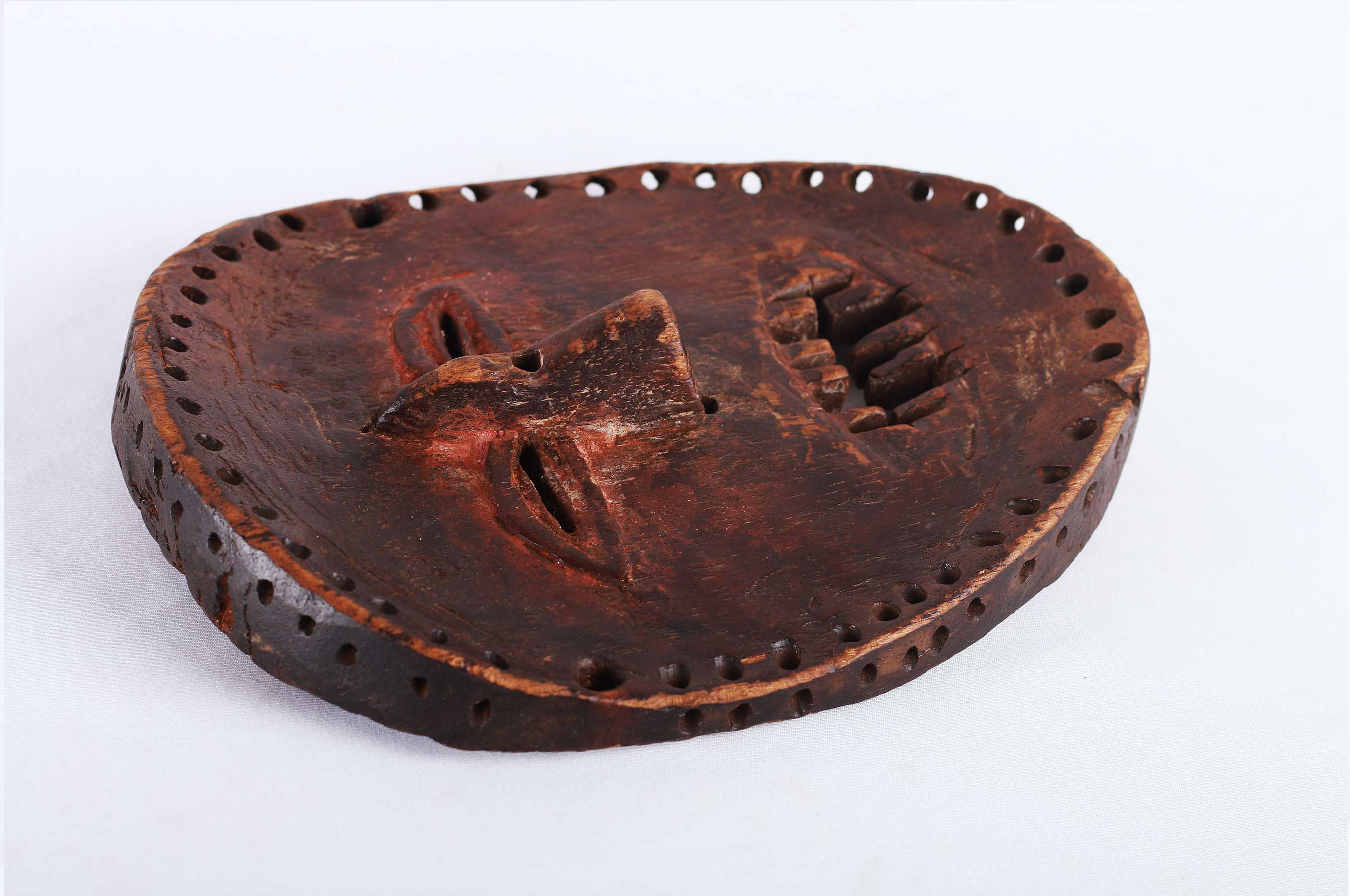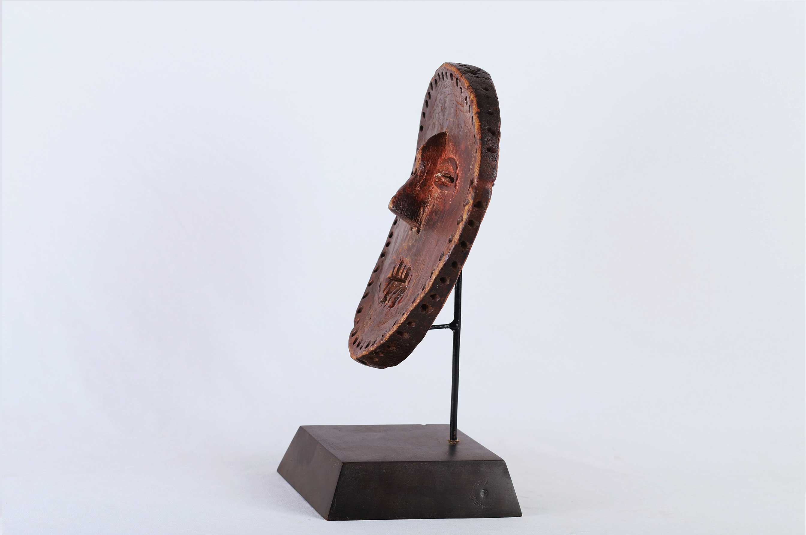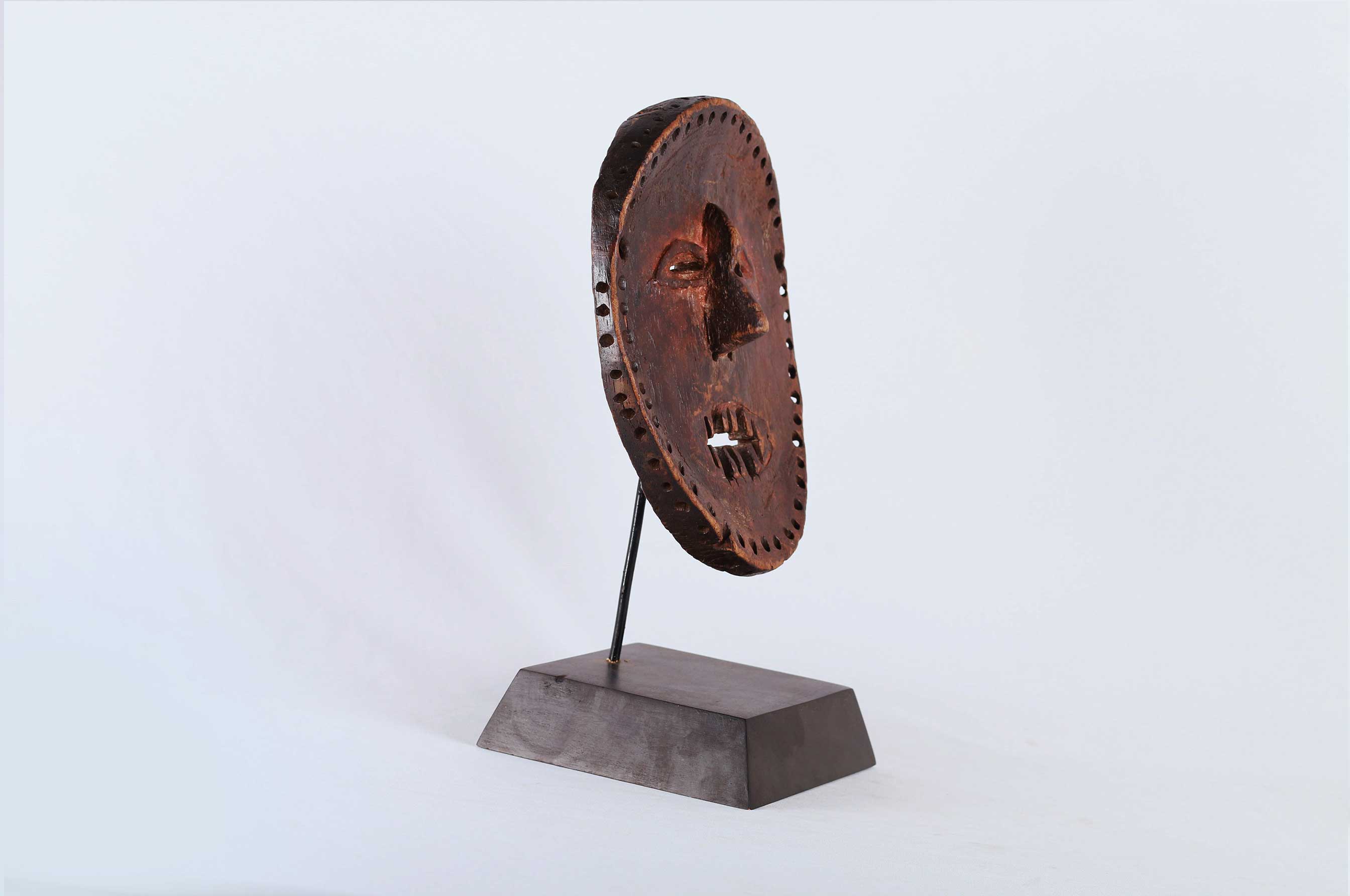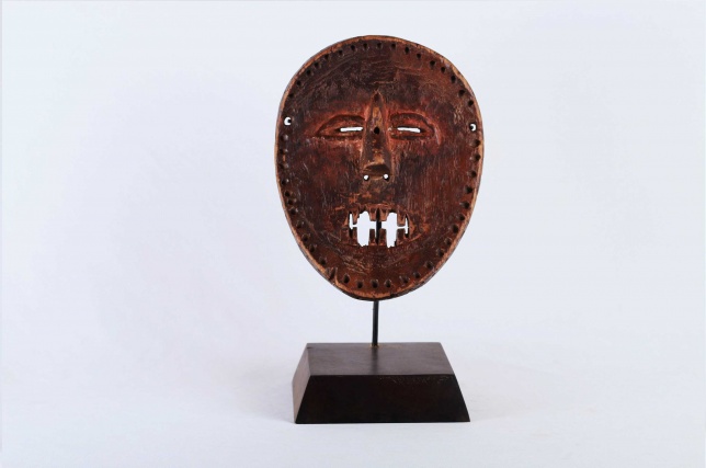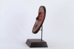 The Lombi are an ethnic group, located in the eastern Democratic Republic of Congo. They are not known for making masks but more famous for making sculpted figures. Little is known about the lombi masks so we could hardly find the use of this mask. This rare wooden lombi mask with red pigment, it has a nearly round face, small eyes, pointed nose. It has a worn-out patina, good signs of age, usage, exposure and seems to have lost a tooth.