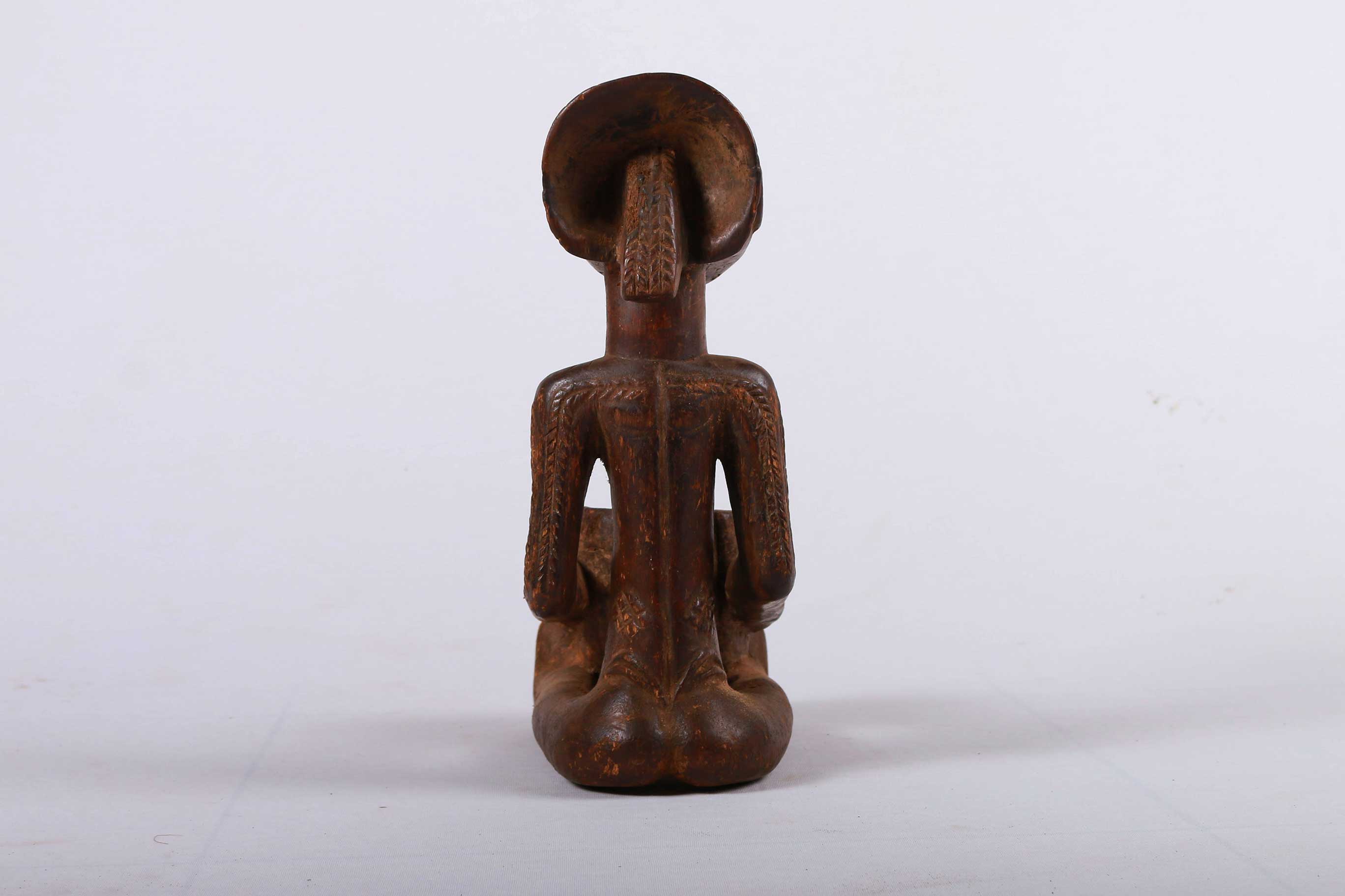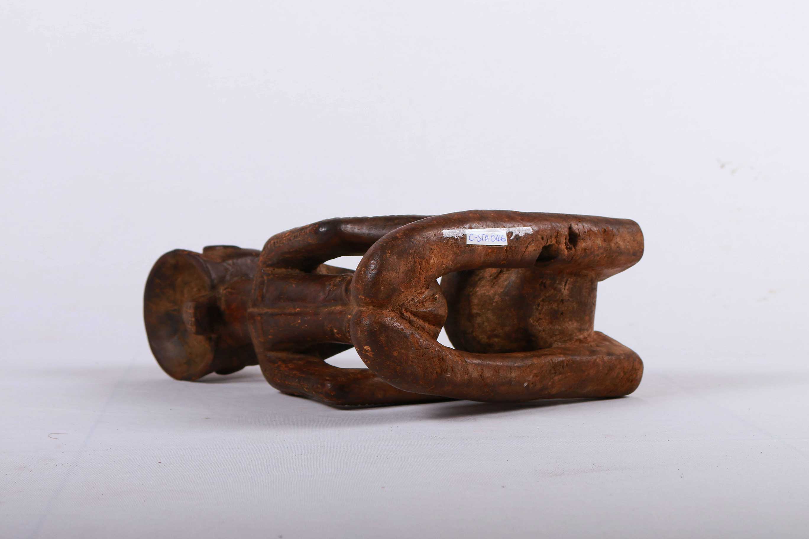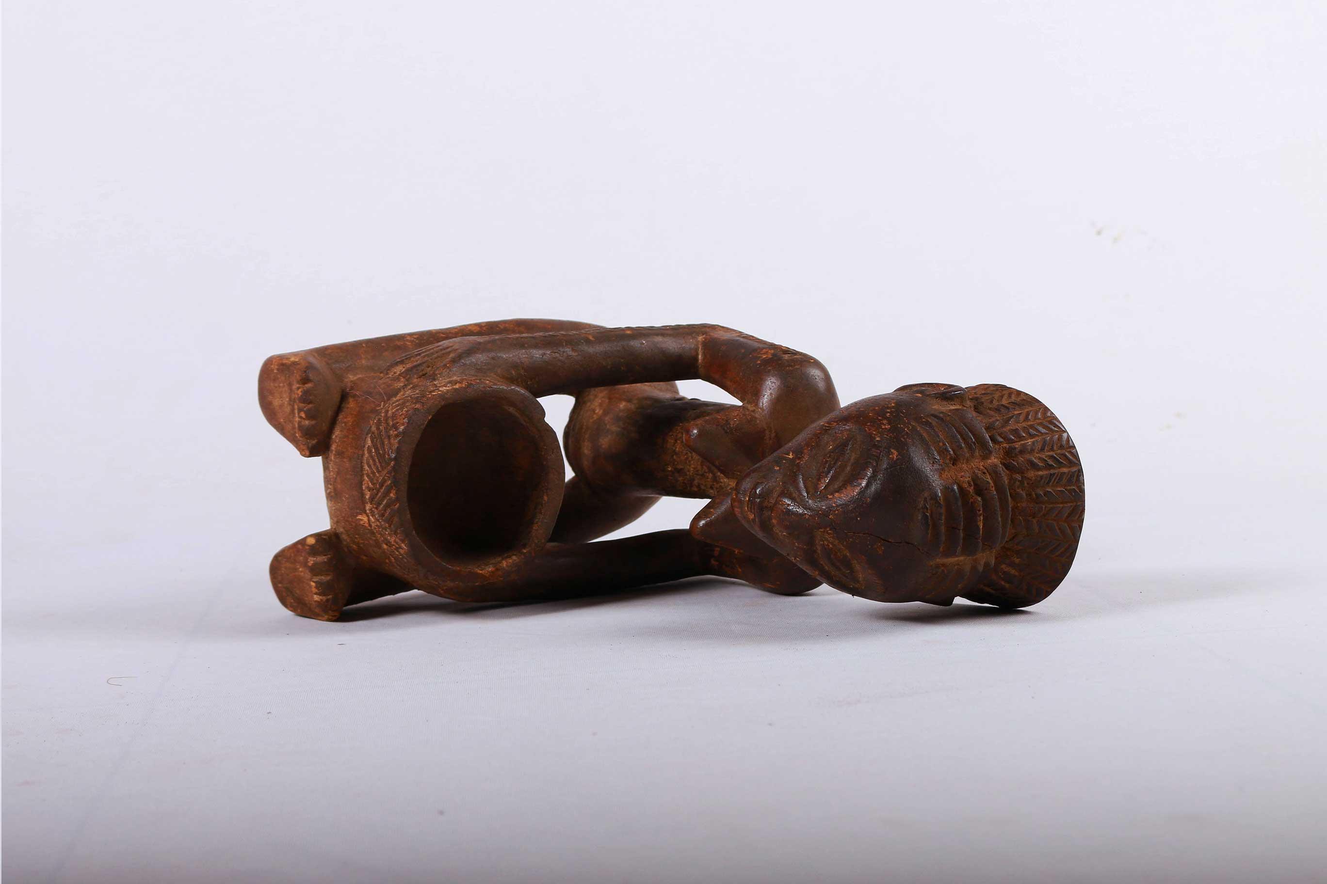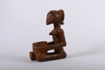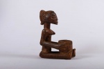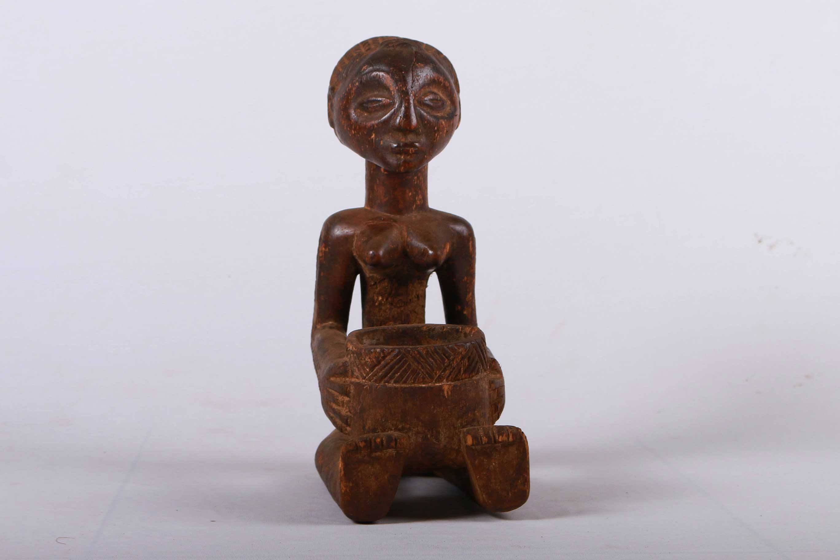 The Luba are found within the South-eastern Democratic Republic of Congo. The Luba turned to a diviner called a Bilumbu to seek for identifications of different illnesses and misfortunes, the diviner sought from the spirits for answers regarding the illnesses. They were also used in the induction ceremonies of new kings. The art of the Luba is known for the representation of women in Luba sculptures which is widespread and stresses the important role of women in Luba society. These representations of female bowl bearers served as instruments of communicating with the spirit world in the context of divination. The following is a beautiful wood carved sculpture with a dark brown patina.