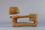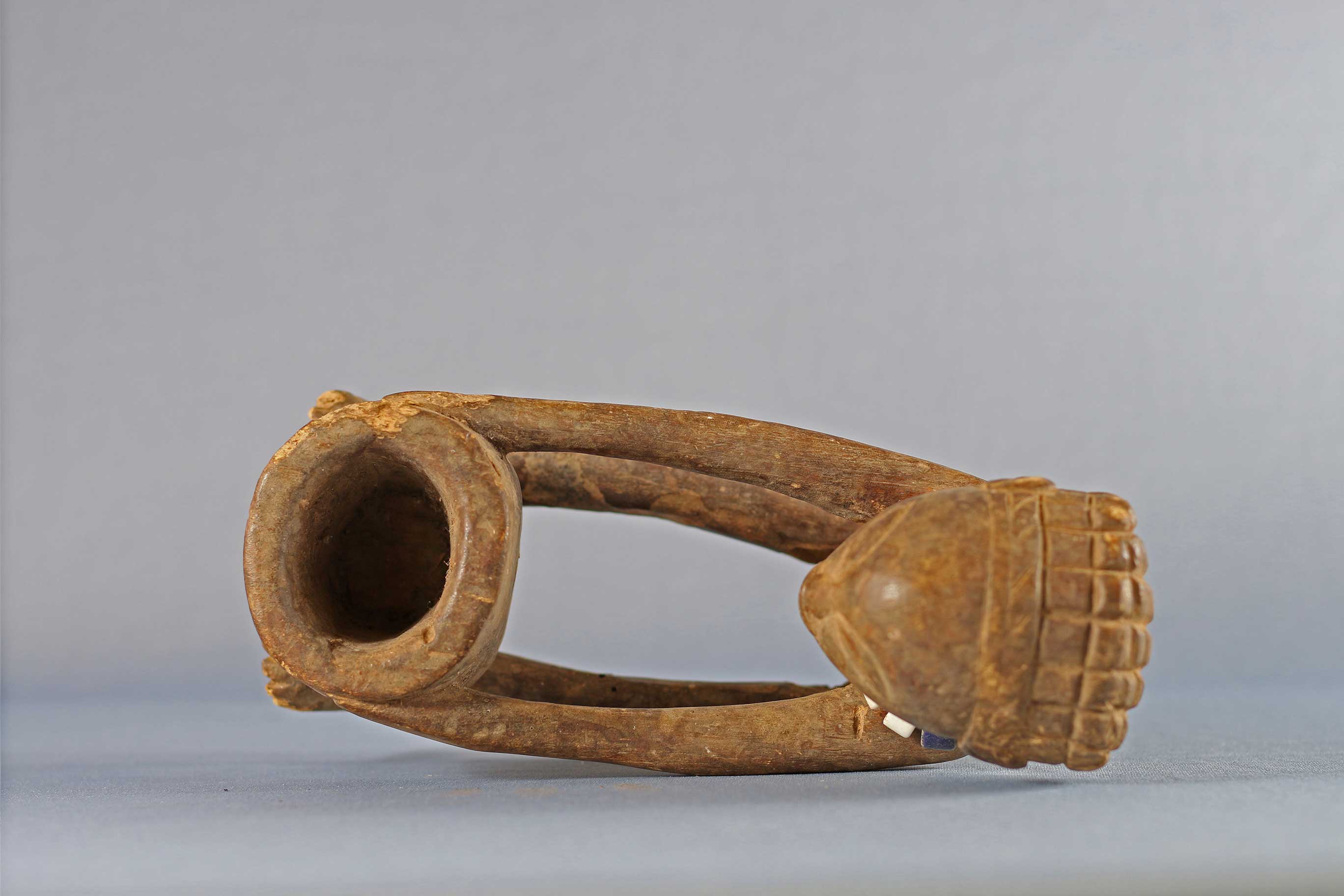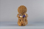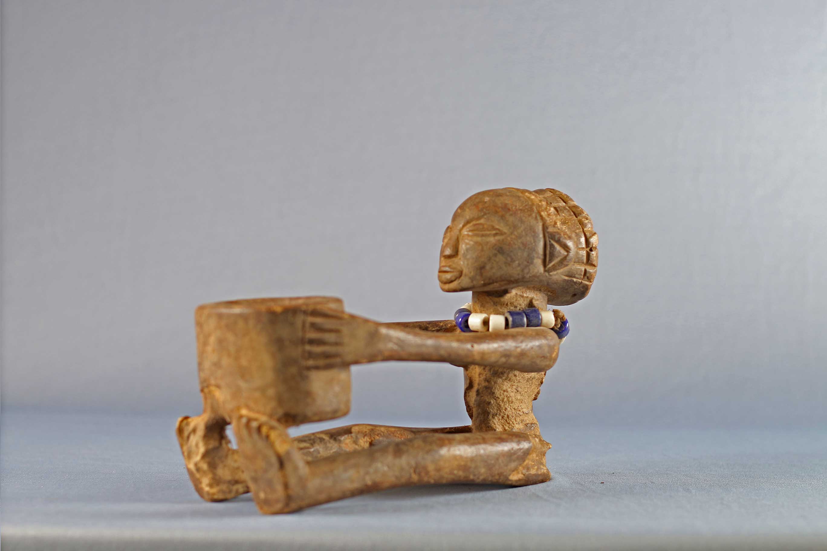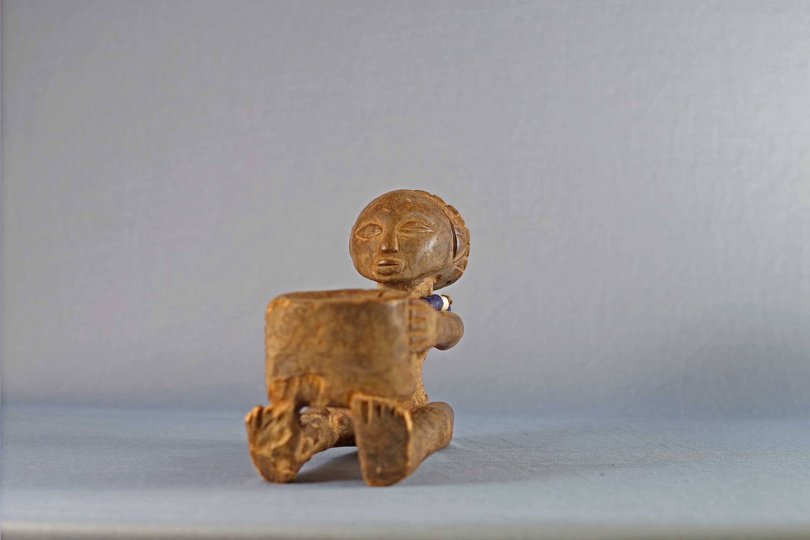 The Luba are found within the South-eastern Democratic Republic of Congo. The Luba turned to a diviner to seek for identifications of different illnesses and misfortunes, the diviner sought from the spirits for answers regarding the illnesses. They were also used in the induction ceremonies of new kings. The art of the Luba is known for the representation of women in Luba sculptures which is widespread and stresses the important role of women in Luba society. These representations of female bowl bearers served as instruments of communicating with the spirit world in the context of divination. The following is a beautiful wood carved sculpture with khaki patina.