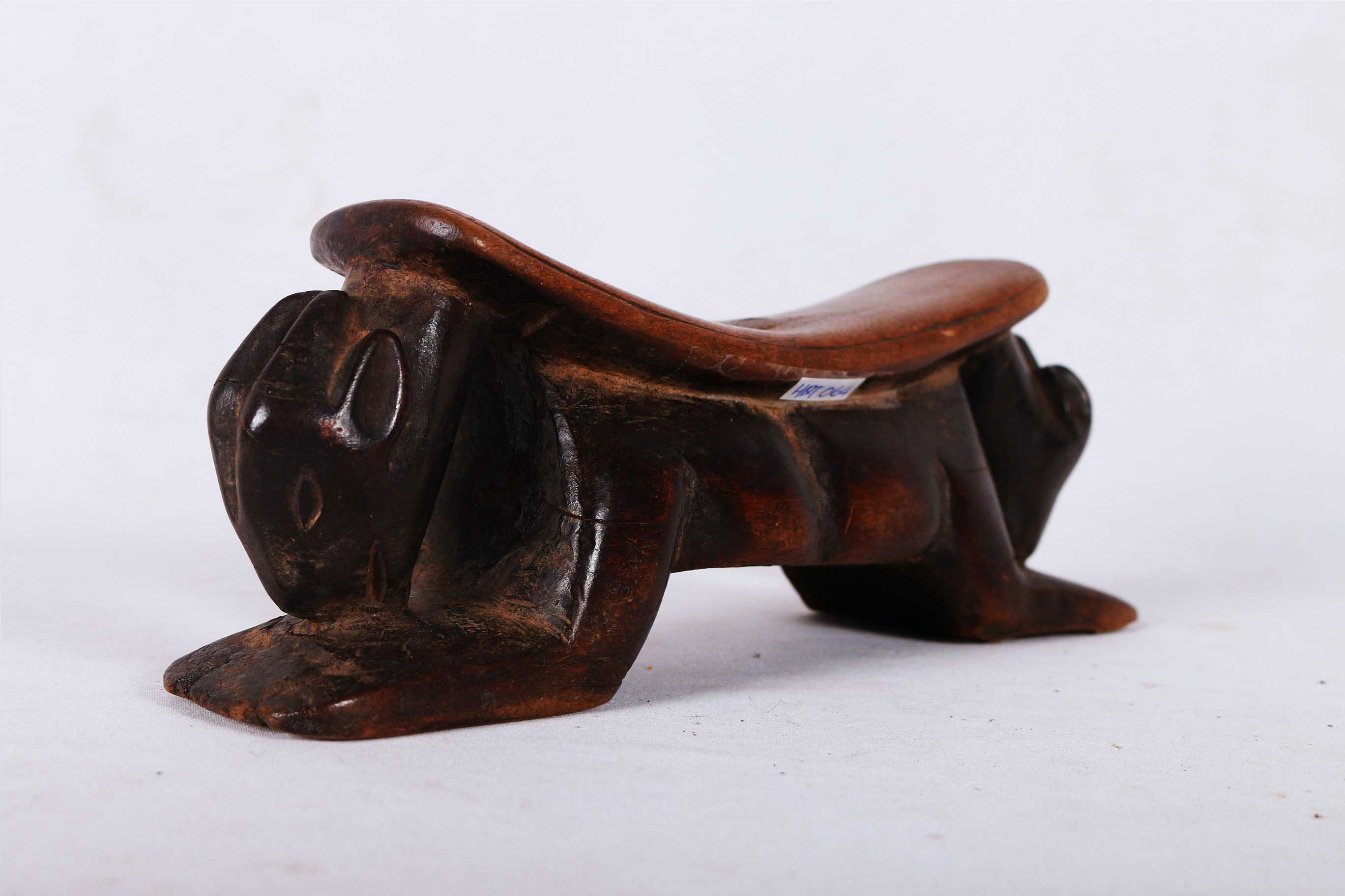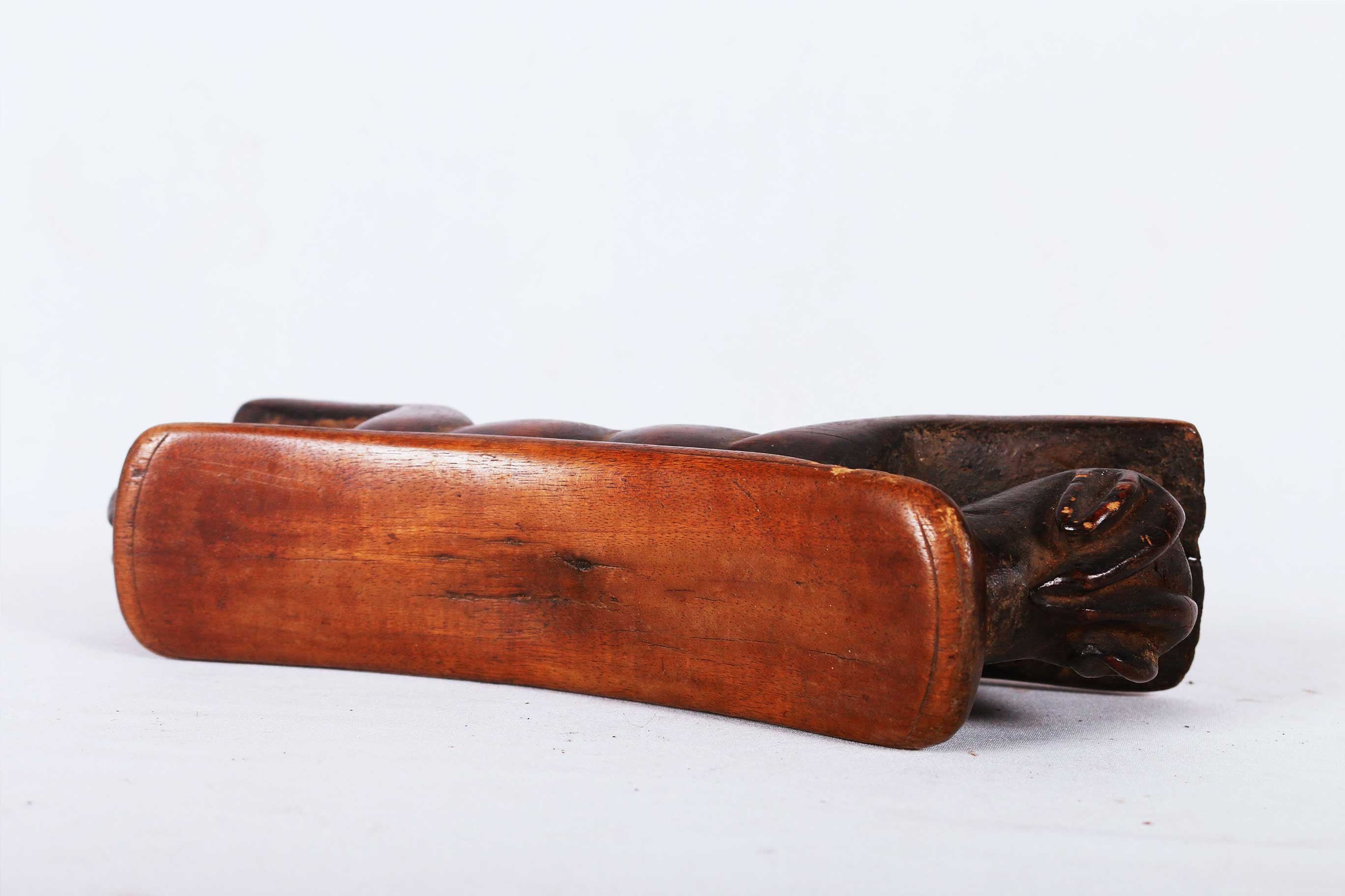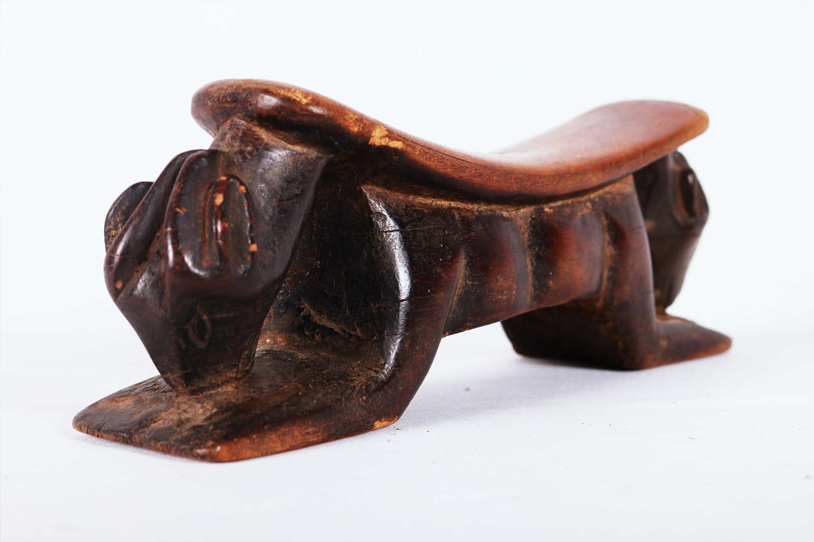 This African carved wood headrest was collected from the Luba tribe in the South-eastern Democratic Republic of Congo (Zaire). The art of the Luba is known for the representation of women and correlates to the important role of women in Luba society. Among the Luba, Headrests were used to support the head of the owner, essentially to preserve the elaborate hairstyles. The more intricate headrests belonged to high ranking members of the tribes. They had figural carvings, including people and animals.