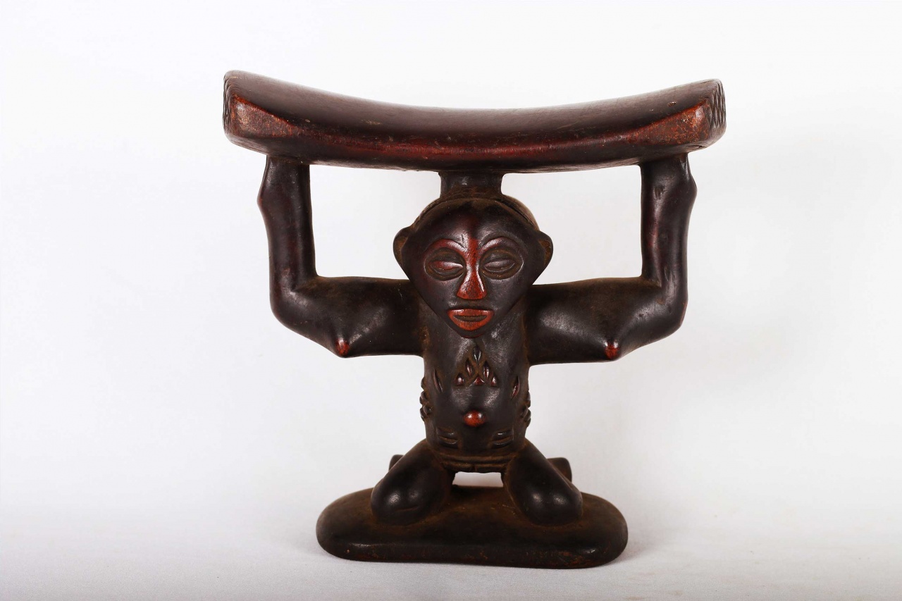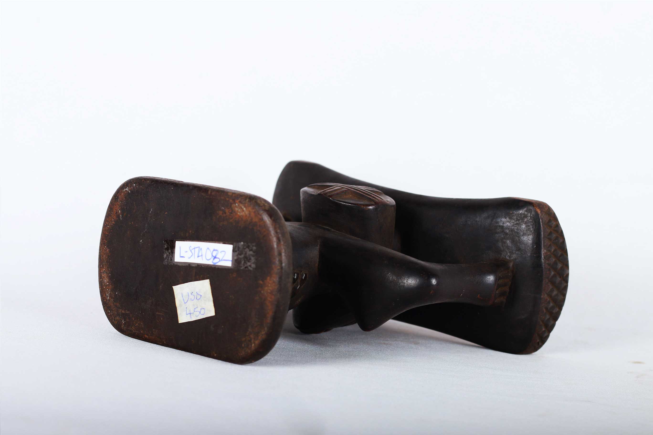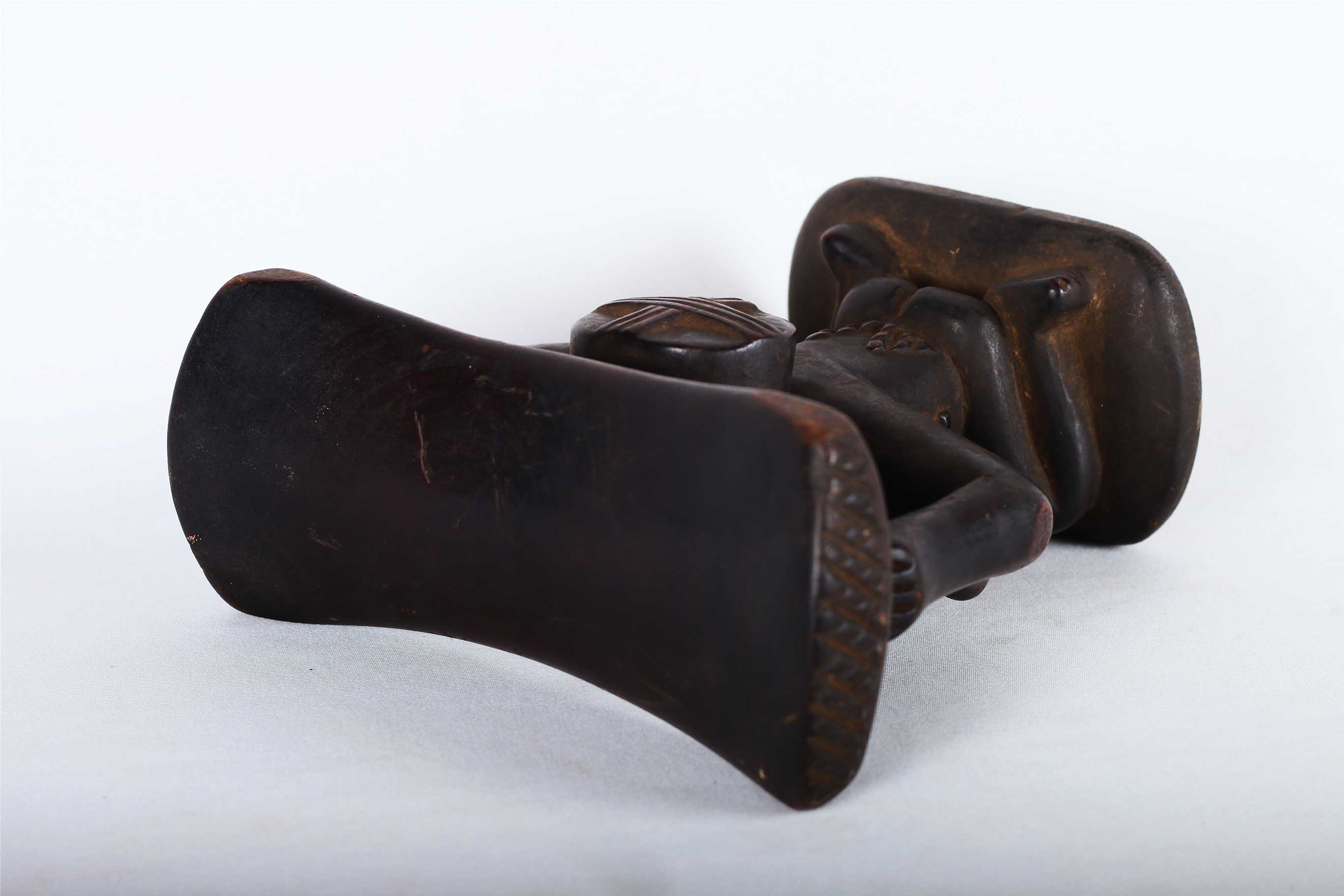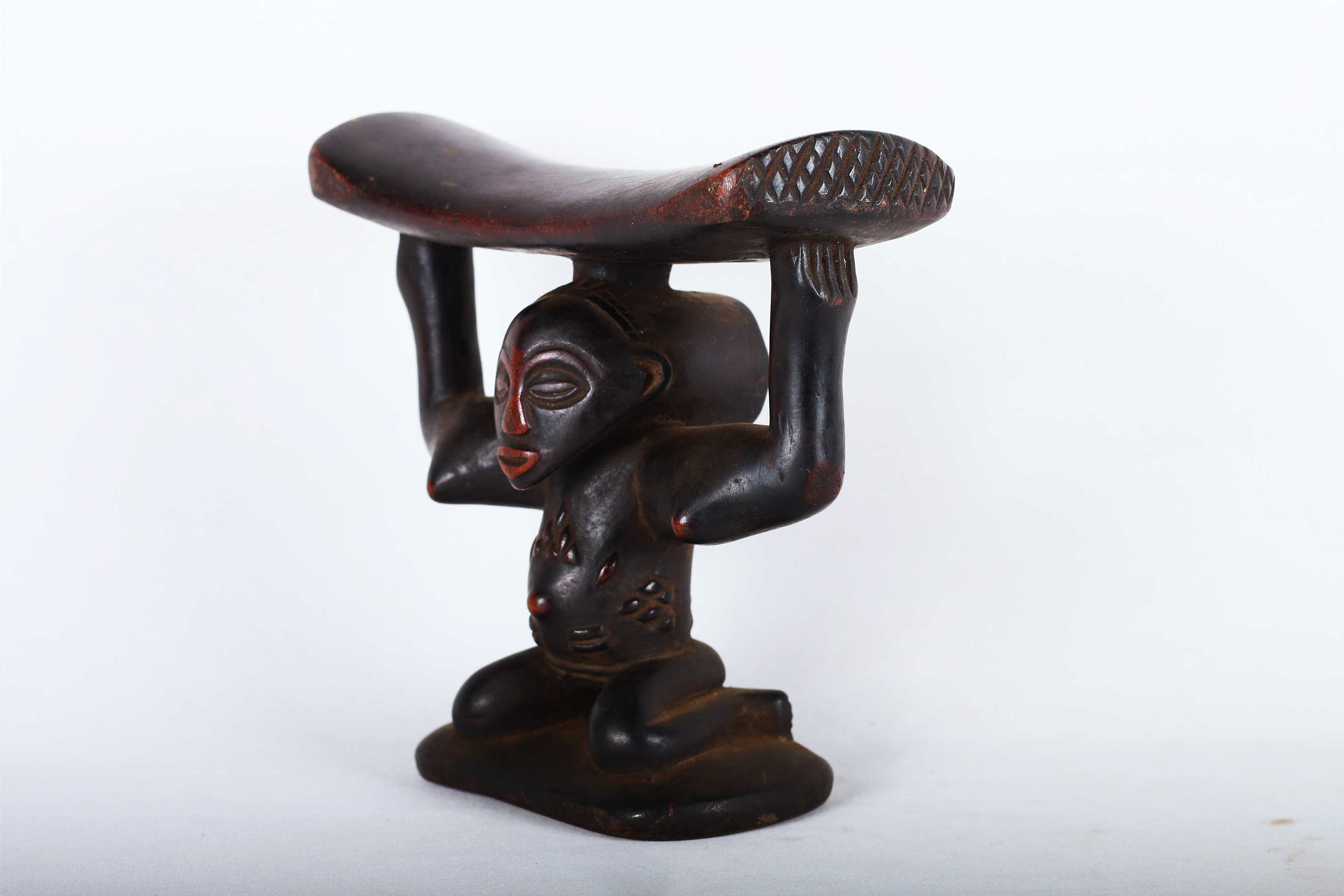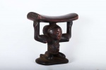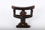 The Luba people live in the southeast of the West African Democratic Republic of the Congo. The Luba tribal art is commonly known for beautifully carved items with personal representations of importance to society. The wealthy and prestigious rulers commissioned fine works of art for personal, prestige and political purposes. This sculpture was used by high ranking people to lift their heads during sleep and also protecting the vulnerable ceremonial hairstyles. The following headrest displays a human form and has a shiny dark patina and shows visible signs of age and usage.