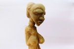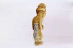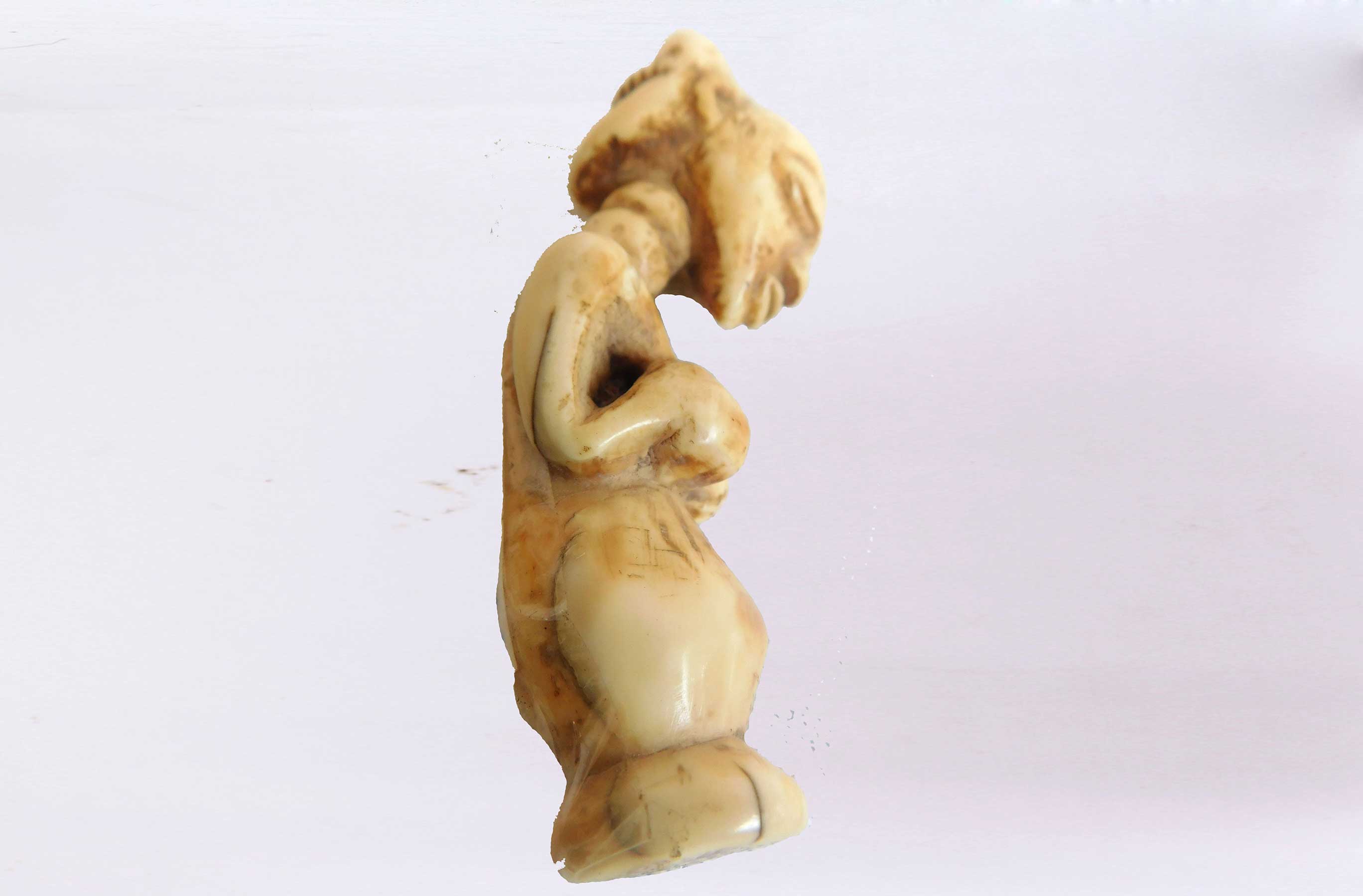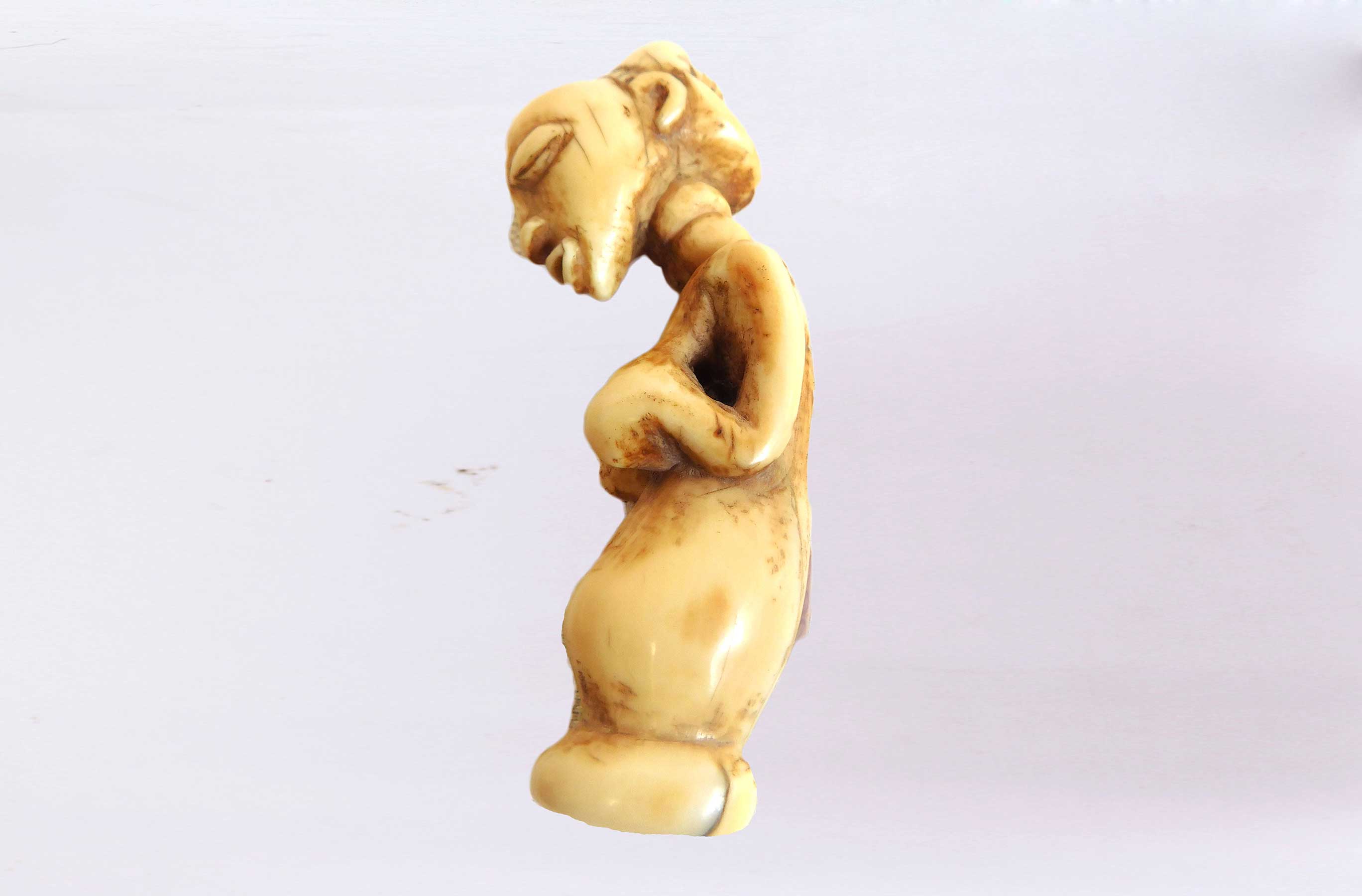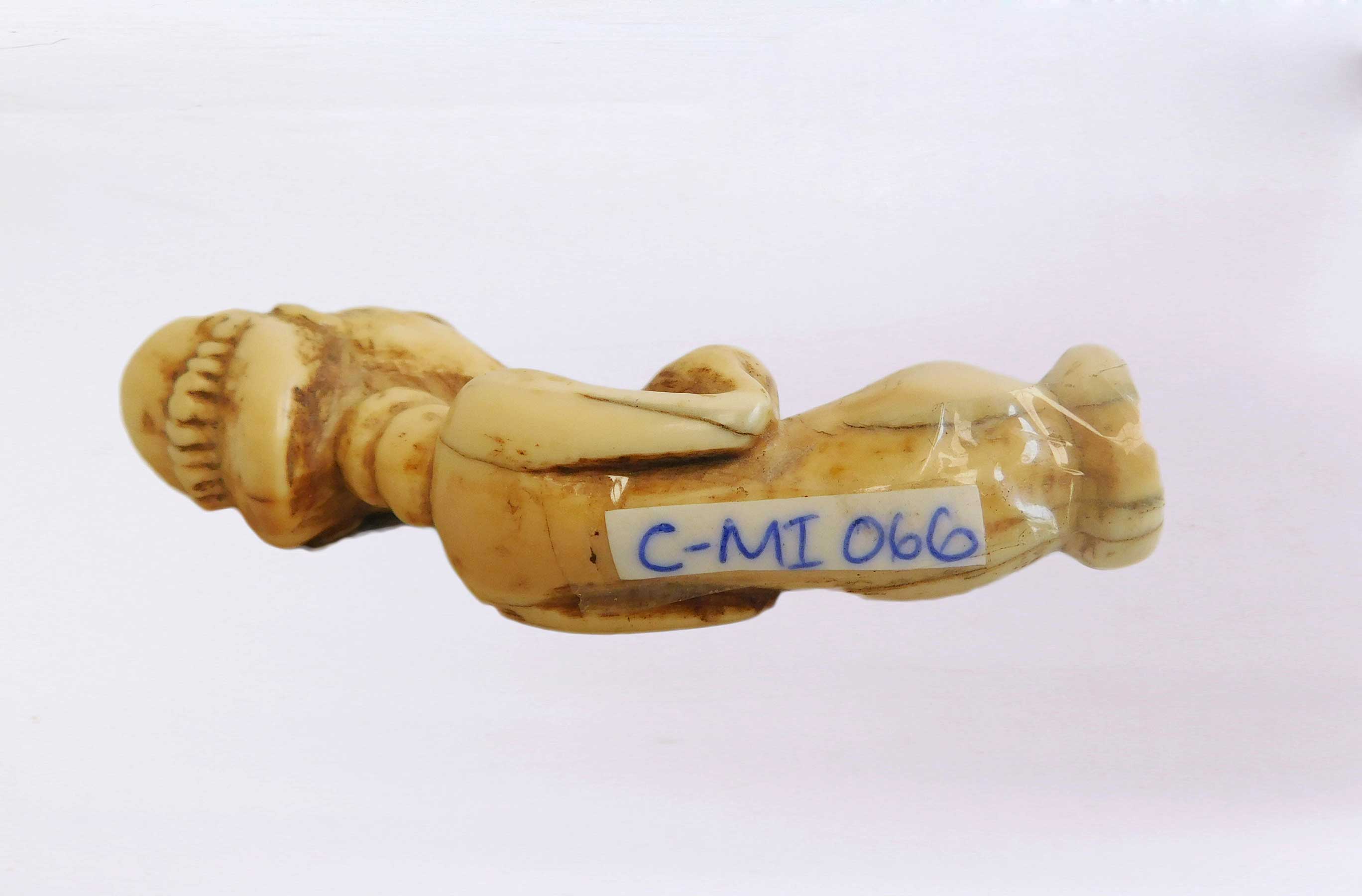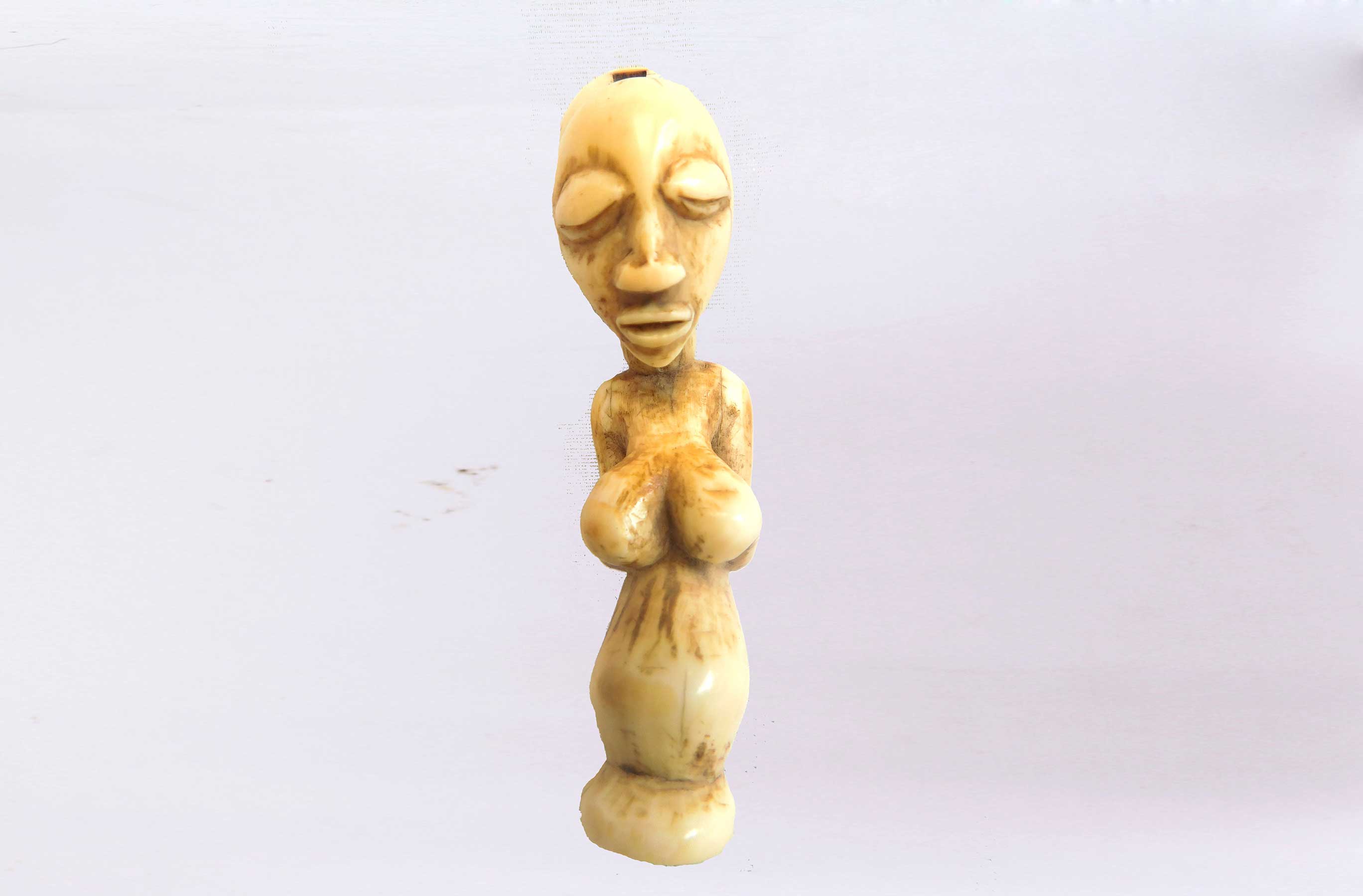Luba ivory pendants are portraits, or at least likenesses, and are named and honored in memory of certain revered ancestors. Sculpted from bone and horn as well as from ivory, these delicate diminutive figures were suspended from cords together with other objects, including amulets, beads, and horns. Luba ivory pendants are among the most intimate and personal of all Luba objects and reflect a close association with the human body. Tiny enough to be easily held and caressed in the hand, ivory pendants nevertheless uphold the same aesthetic as larger, more imposing Luba royal emblems. The following figure bares a khaki patina and shows signs of age and good usage.