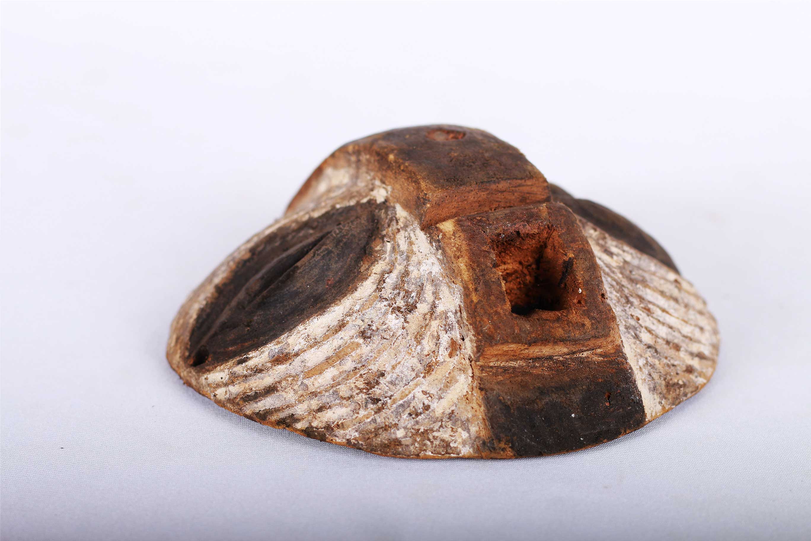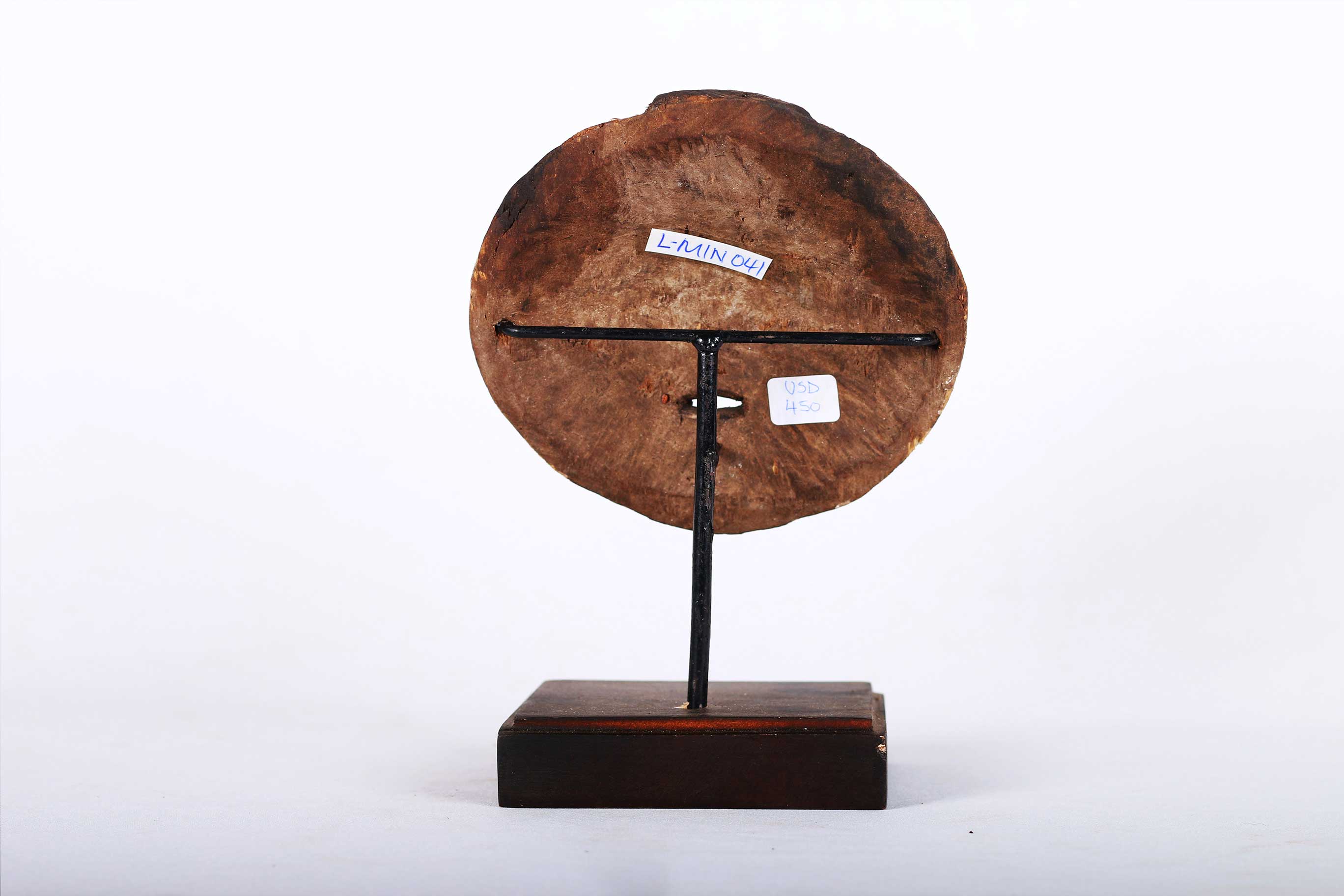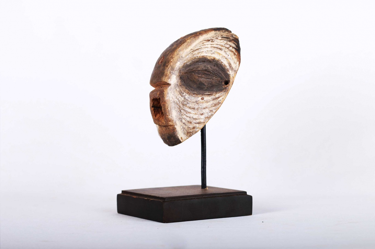 This is a small carved wood tribal commonly known as a “passport mask” carried with the traveller to show the tribe that they belong to. They were not worn on the face but exhibited, they were sown on a piece of cloth, tied to the upper arm, or hung on a fence during meetings of the society in order to allow the arriving members to see who was already present. The miniature masks were used to invoke ancestral spirits during secret society meetings, they were also used to serve as witnesses during initiation ceremonies. These maskettes were hand-carried in a dance, dragged or swung by their beards, hung over a shoulder. The following is a round-shaped shallow face mask with a dark patina, wide oval-shaped eyes, it has finely engraved streaks covered with white kaolin across the entire face, faded black paint-like substance on the eyes, mouth, and nose. It looks old with visible signs of wear.