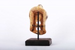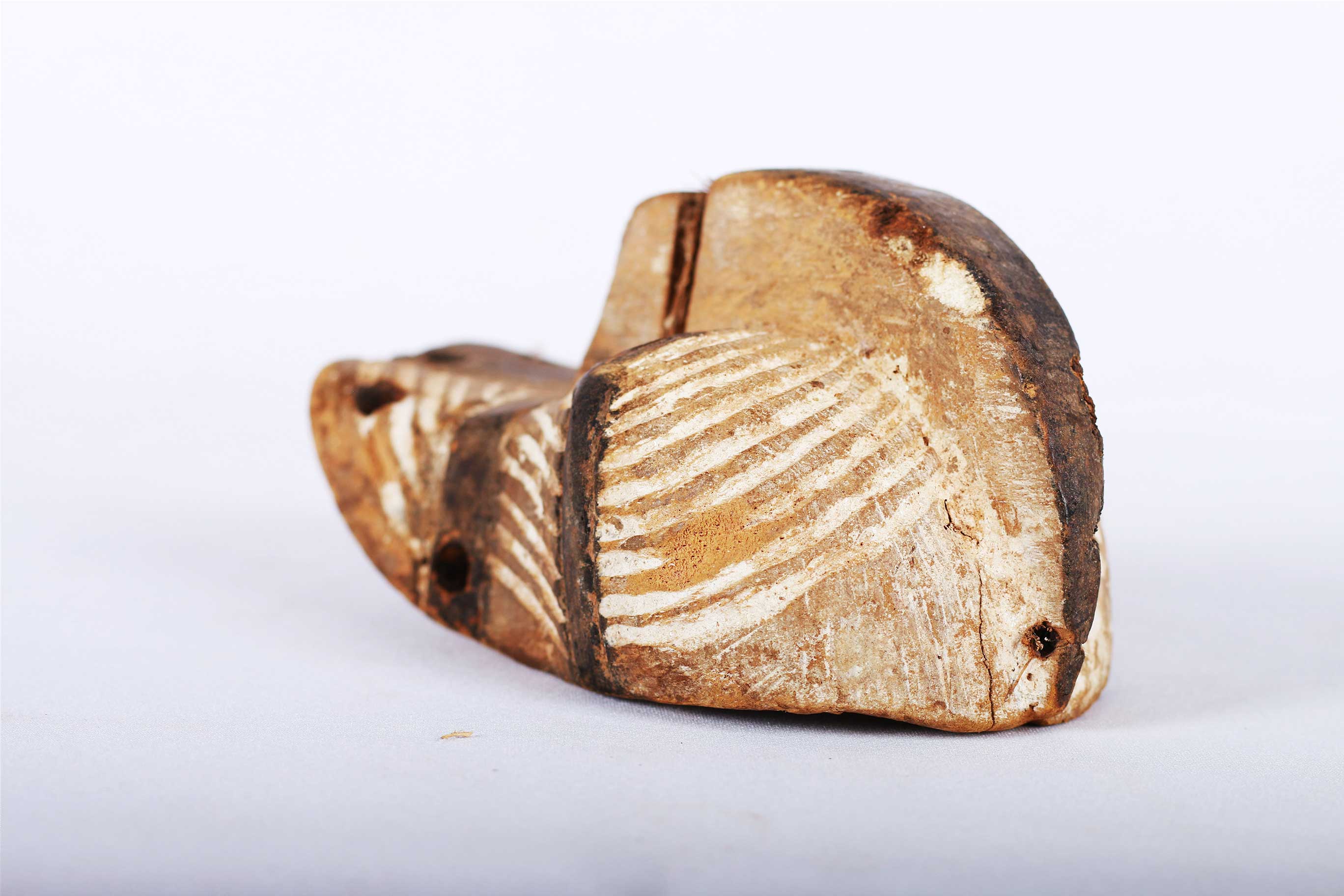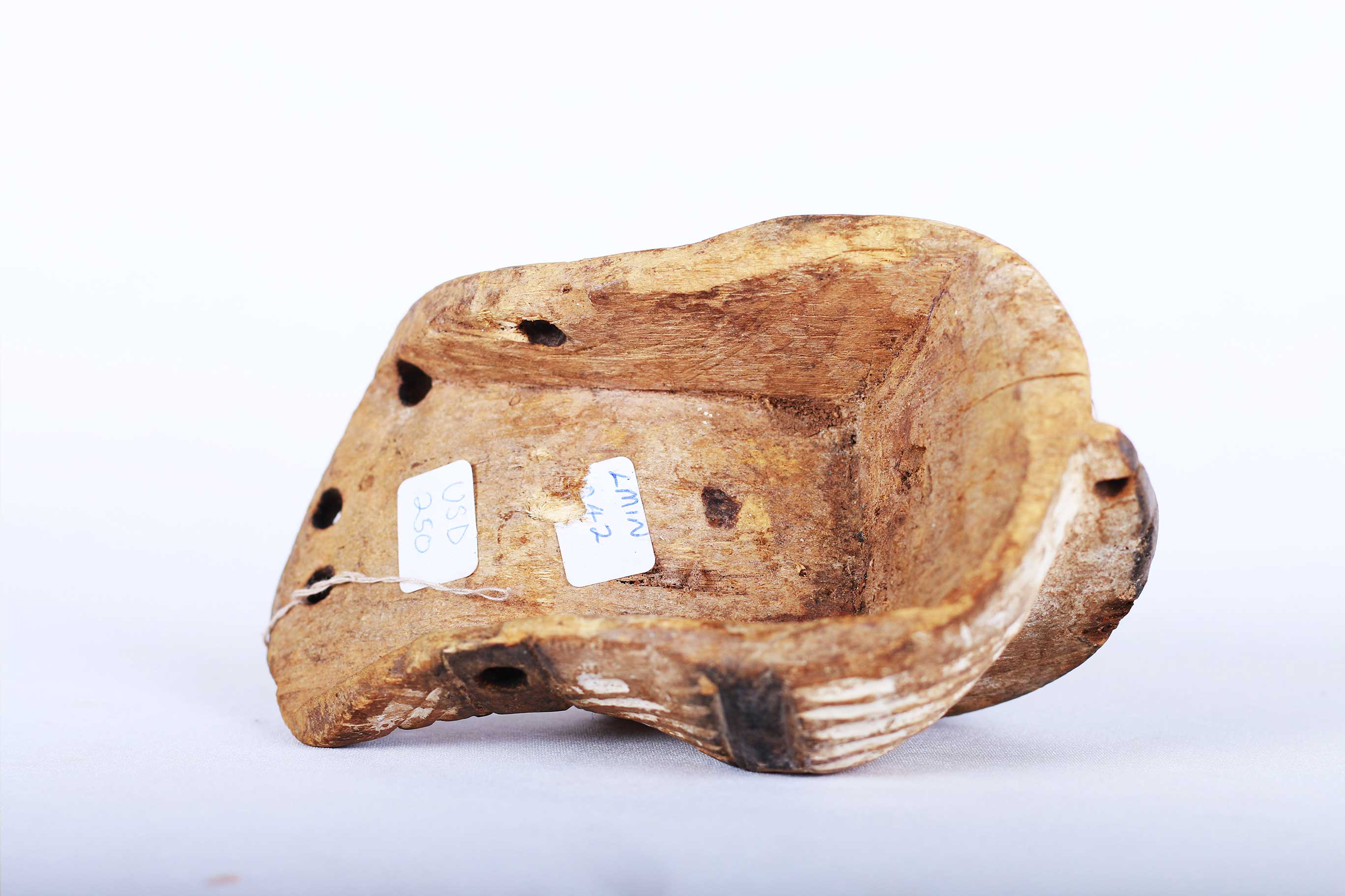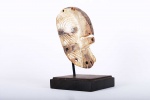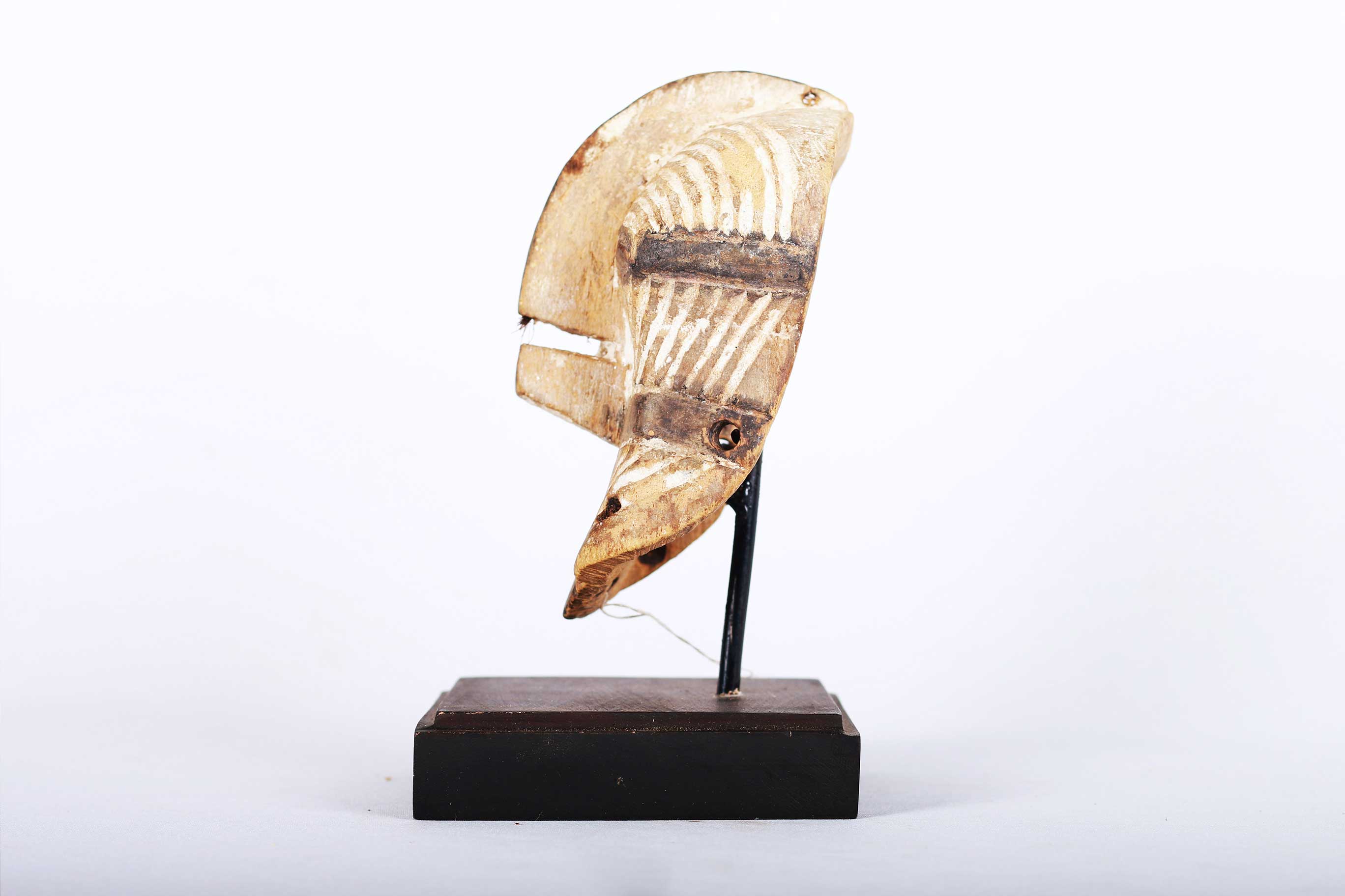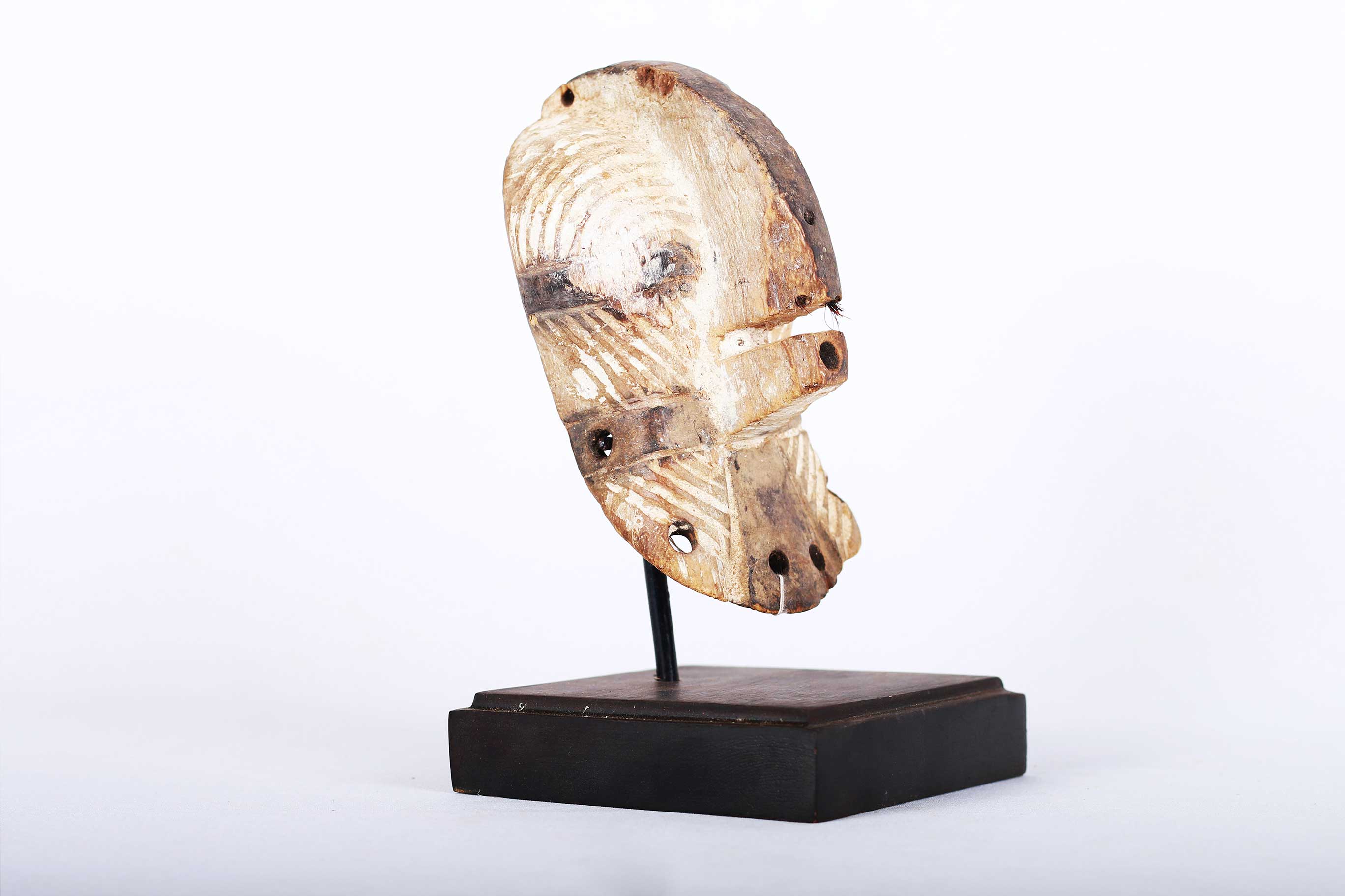 This Luba mask originates from eastern Songye in the Democratic Republic of Congo. The Luba people live near the Songye tribe and are mostly engaged in farming. Their masks share a similar characteristic as that of the Songye tribe and are also known as the Kifwebe. They used the masks for dances, lunar ceremonies or plays as artists hold a special place in the Luba tribe. Luba Masks differ in size, colour and look and this is simply because each Luba mask is hand-carved and hand-painted by individual artists so no two masks are exactly the same. This is a Luba Kifwebe mask from the Kabalo region, It was used in boys’ initiation rites. It has finely engraved streaks covered with kaolin across the entire face, faded black paint-like substance on the eyes, mouth, tubular nose and also on pattern stretching from the back edge of the mask across both sides of the mask. It is an old miniature mask carved in wood, khaki patina and looks a little worn out which reflects extensive usage and old age
