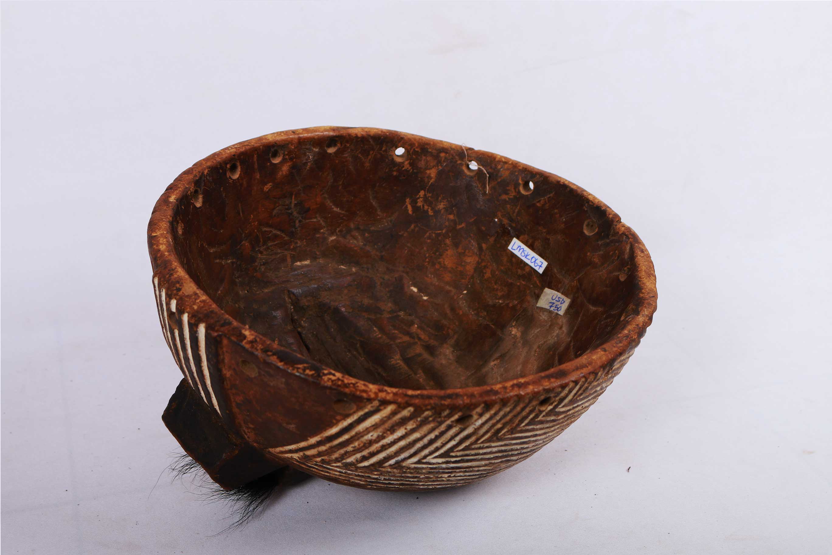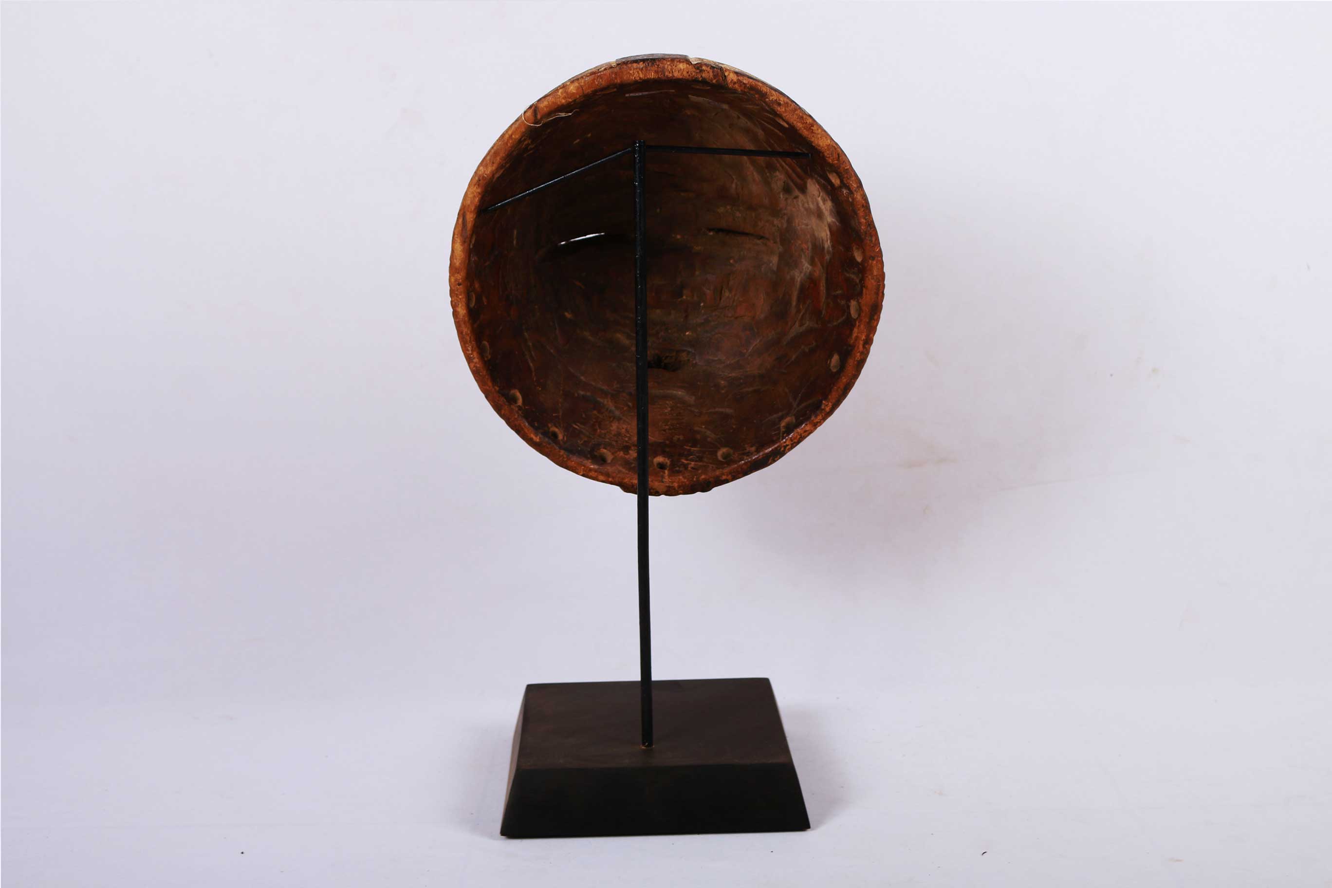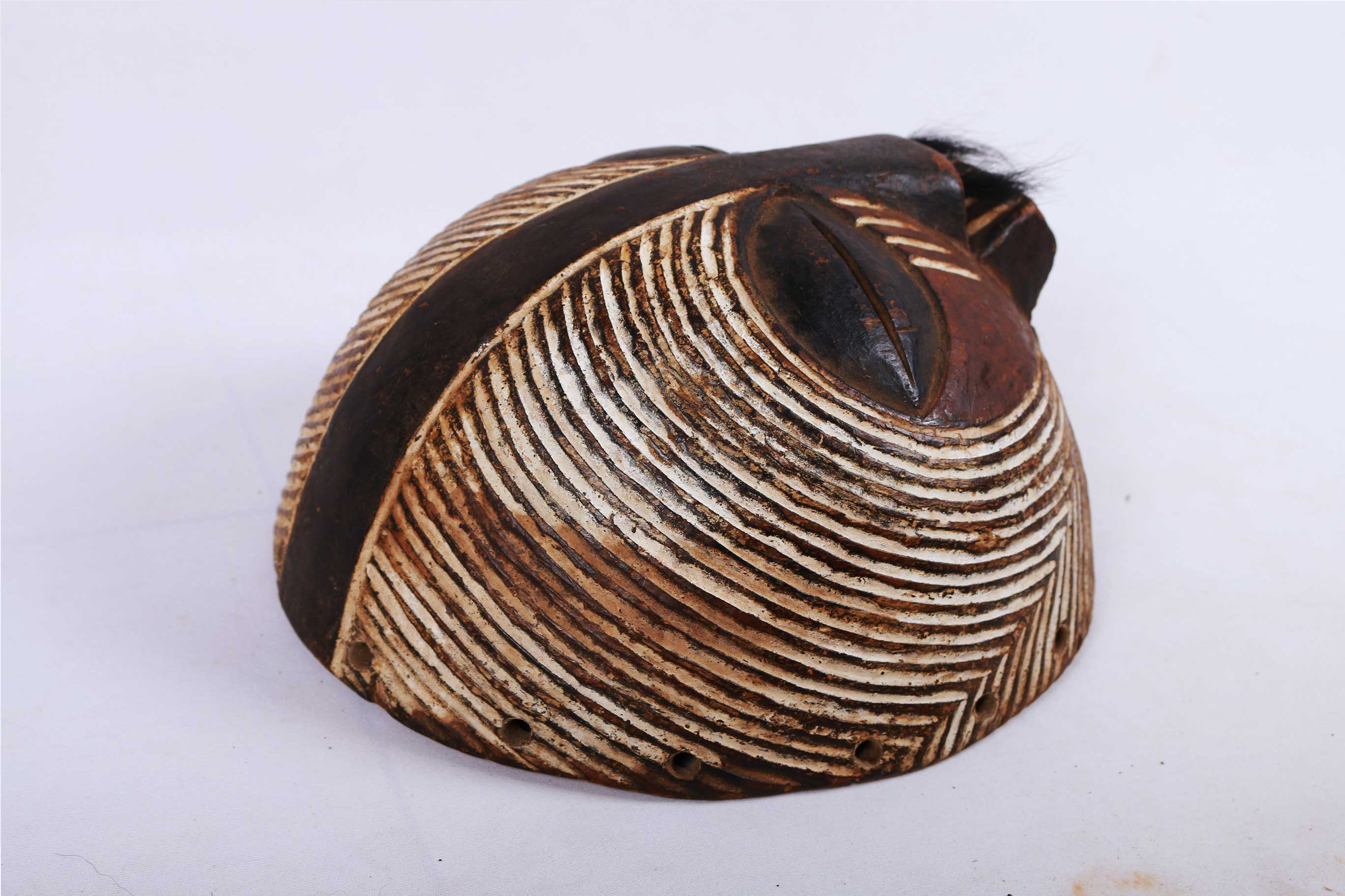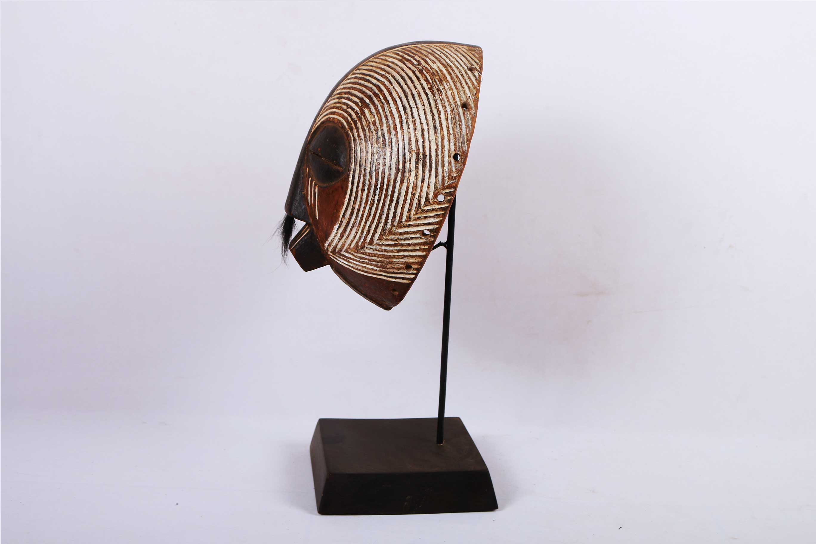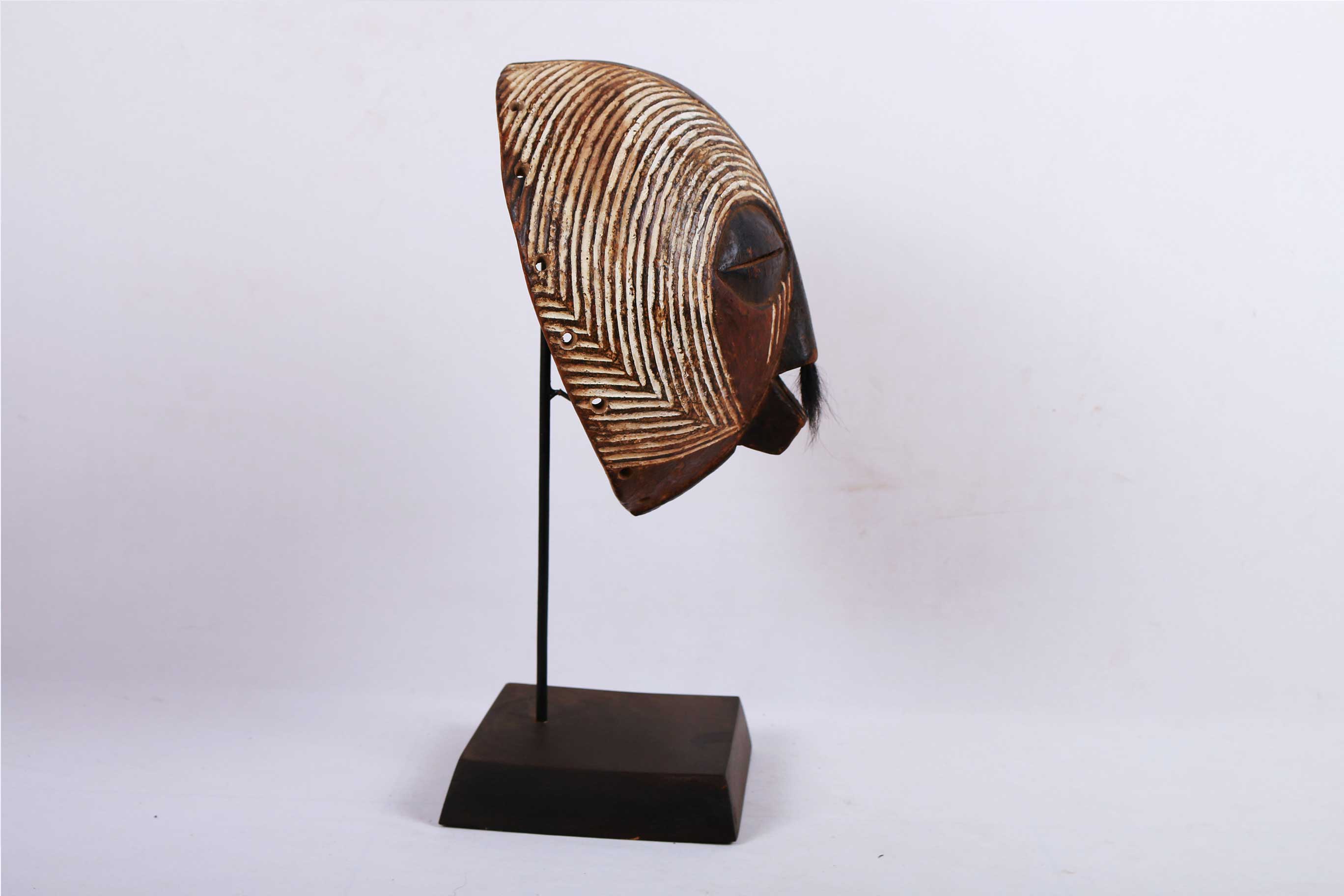 This Luba mask originates from the south-eastern Democratic Republic of Congo (Zaire). The Luba people neighbour the Songye tribe and their masks share similar characteristics to those of the Songye tribe. The Luba tribe are best known for their chairs, divination bowls, beautifully carved sculptures, memory boards, and masks. They used the masks for dances, lunar ceremonies or plays, artists held a special place in the Luba tribe. The Luba made many masks that looked similar but differ slightly in size, look, colour. Their masks were hand-carved and hand-painted by individual artists. This mask is crafted from wood, it has interesting facial features, a brown patina and painted white stripes.