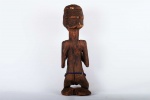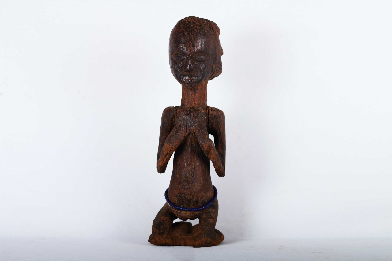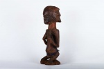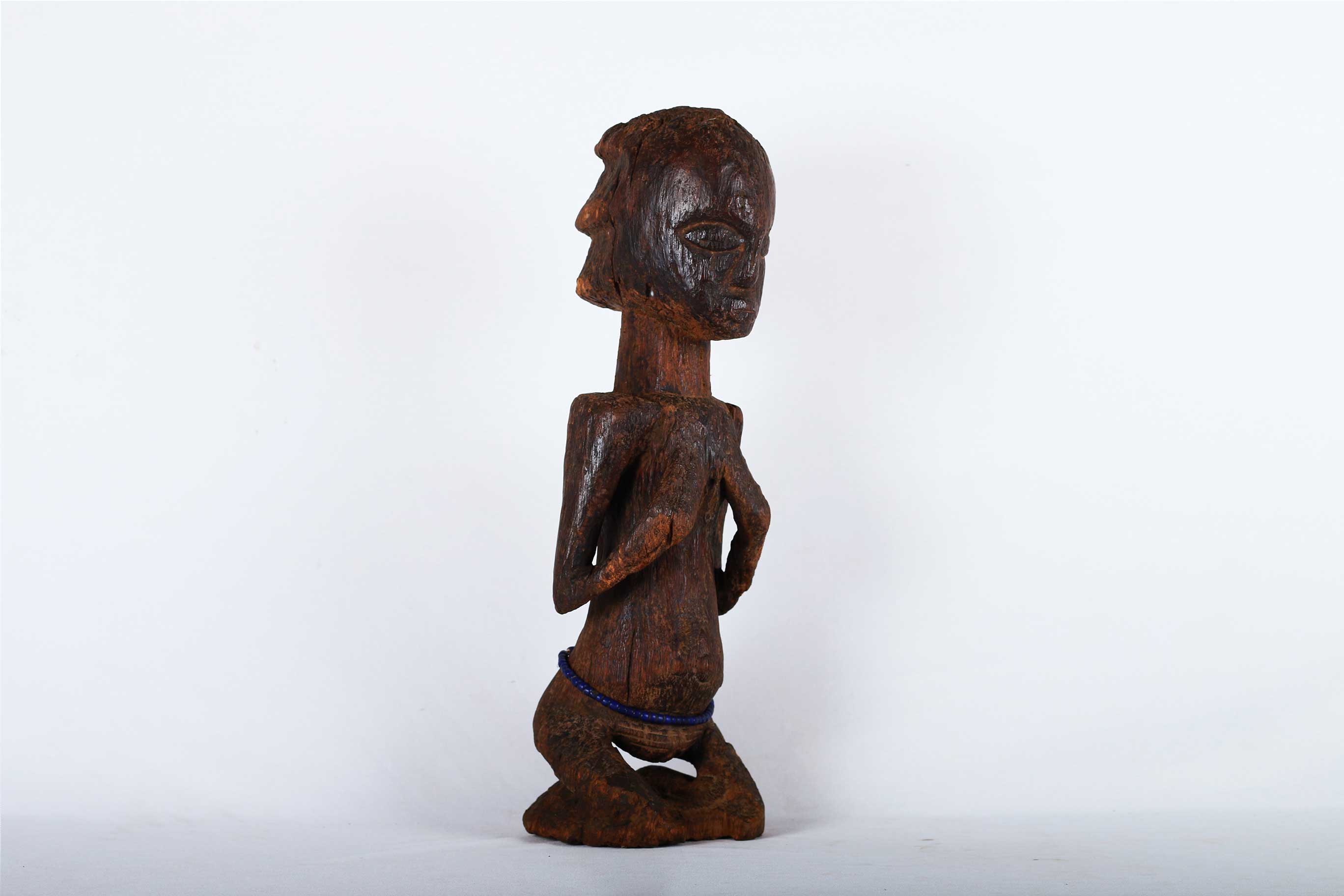 The following is a stunning Luba sculpture beautifully carved from wood with a dark patina, with visible signs of wear to mean extensive usage. The sculpture was carved elegantly to form a female figurative figure, these sculptures were a symbol showing the value of women in society.