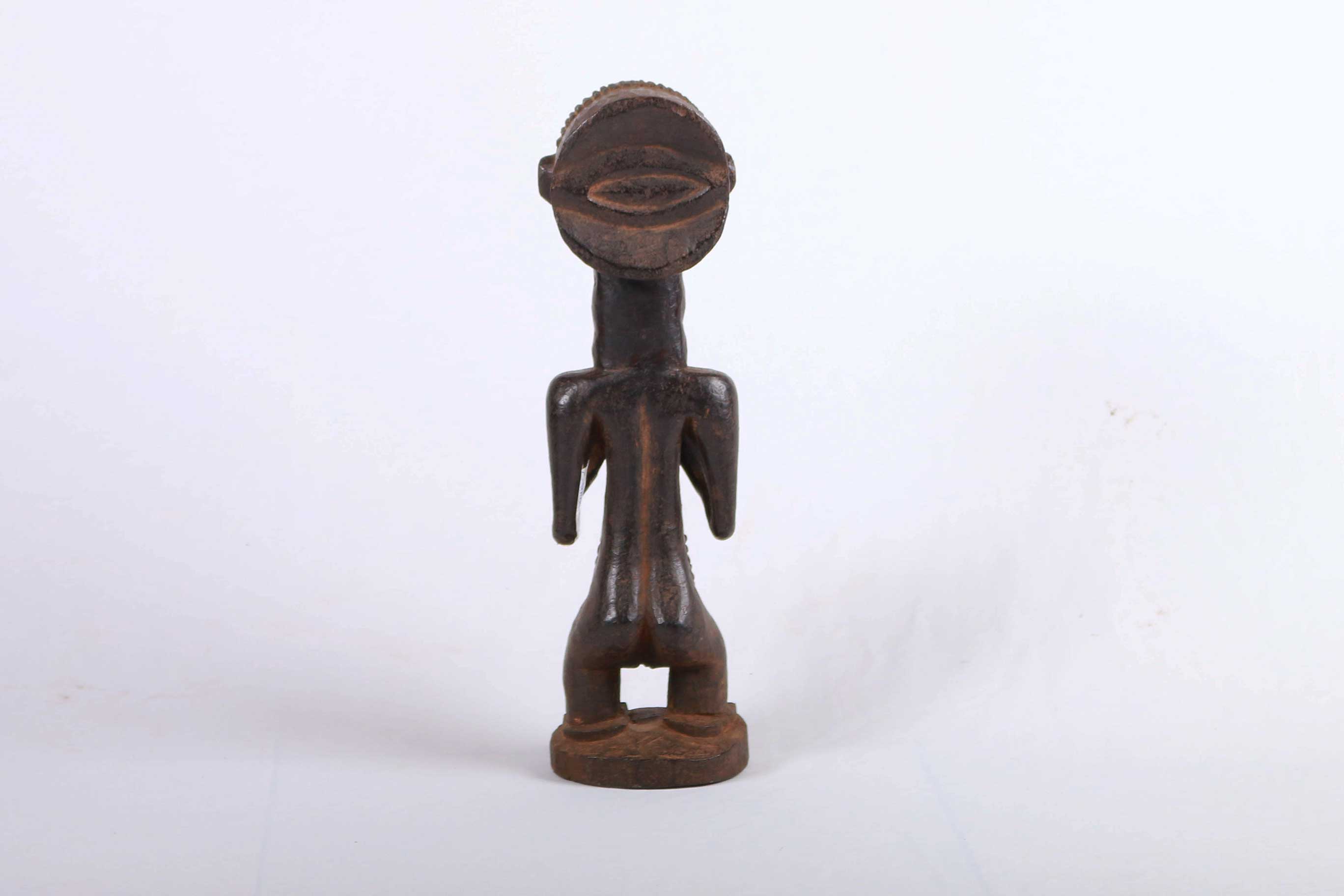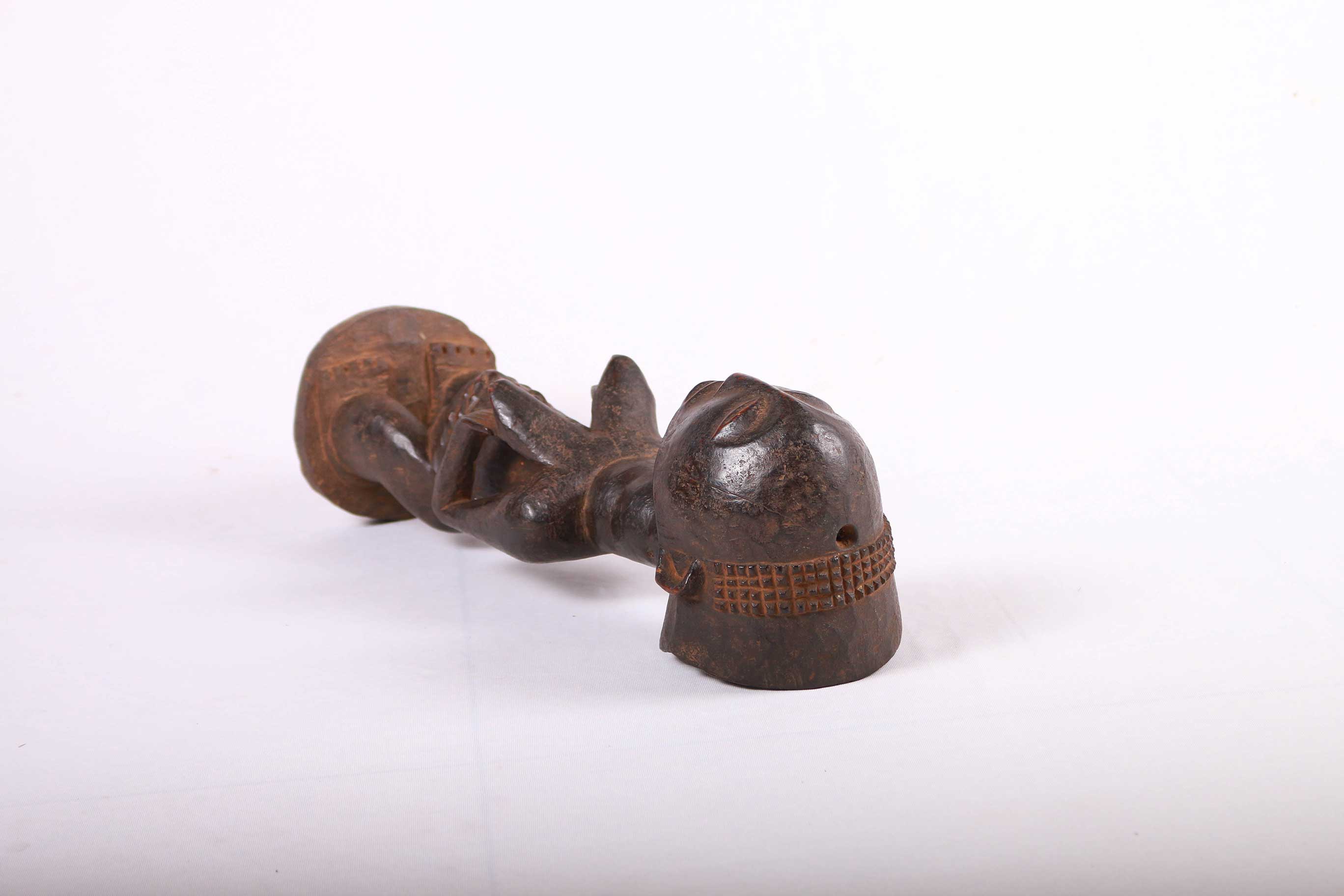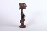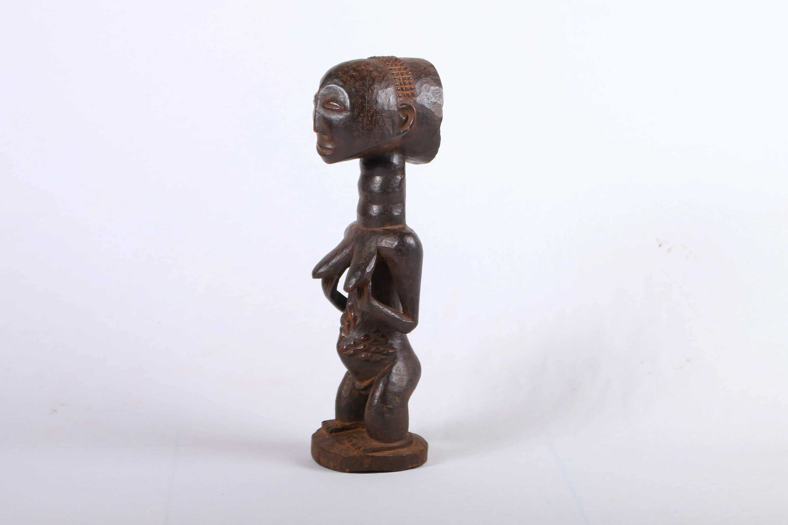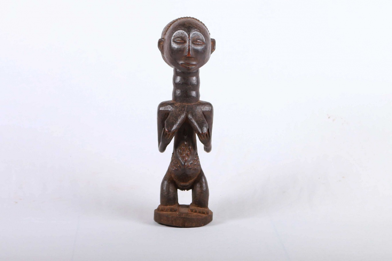 The Luba are an ethnic group found in the South-eastern Democratic Republic of Congo. Luba held women in high regard, women were looked at as the primary keepers of societal secrets. This sculpture was used as a symbol showing the value of women in society, it represented secrecy and power associated with women. This is an interesting Luba sculpture beautifully carved from wood with a long neck, extended folded hands, a good dark patina, with visible signs of old age.