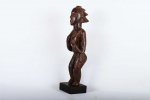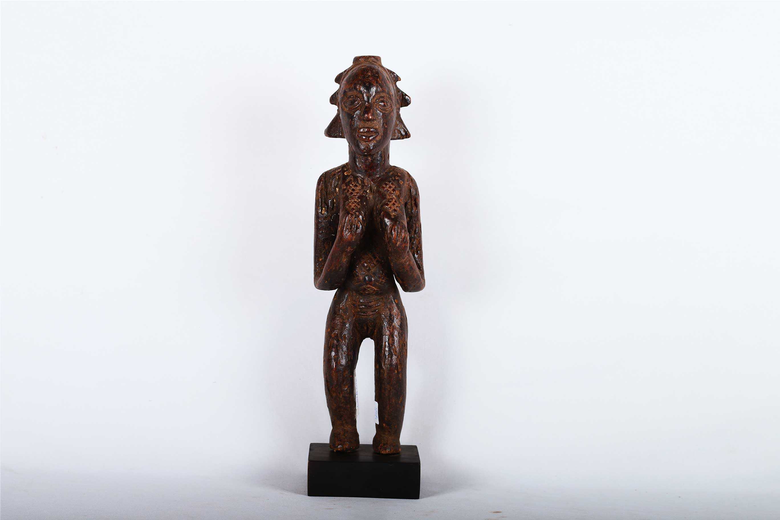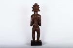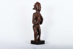 The Luba are found within South-eastern DRC (Zaire). The art of the Luba is known for the representation of women in Luba sculptures which is widespread and correlates to the important role of women in Luba society. The Luba tribe are best known for their chairs, divination bowls (mboko), beautifully carved bow stands, and memory boards (Lukasa). Among the characteristics of Luba sculpture are intricate hair-dress, often in the form of a cross, or falling down like a cascade; a grooved diagonal band separating the hairline from the forehead; eyes shaped like coffee-beans