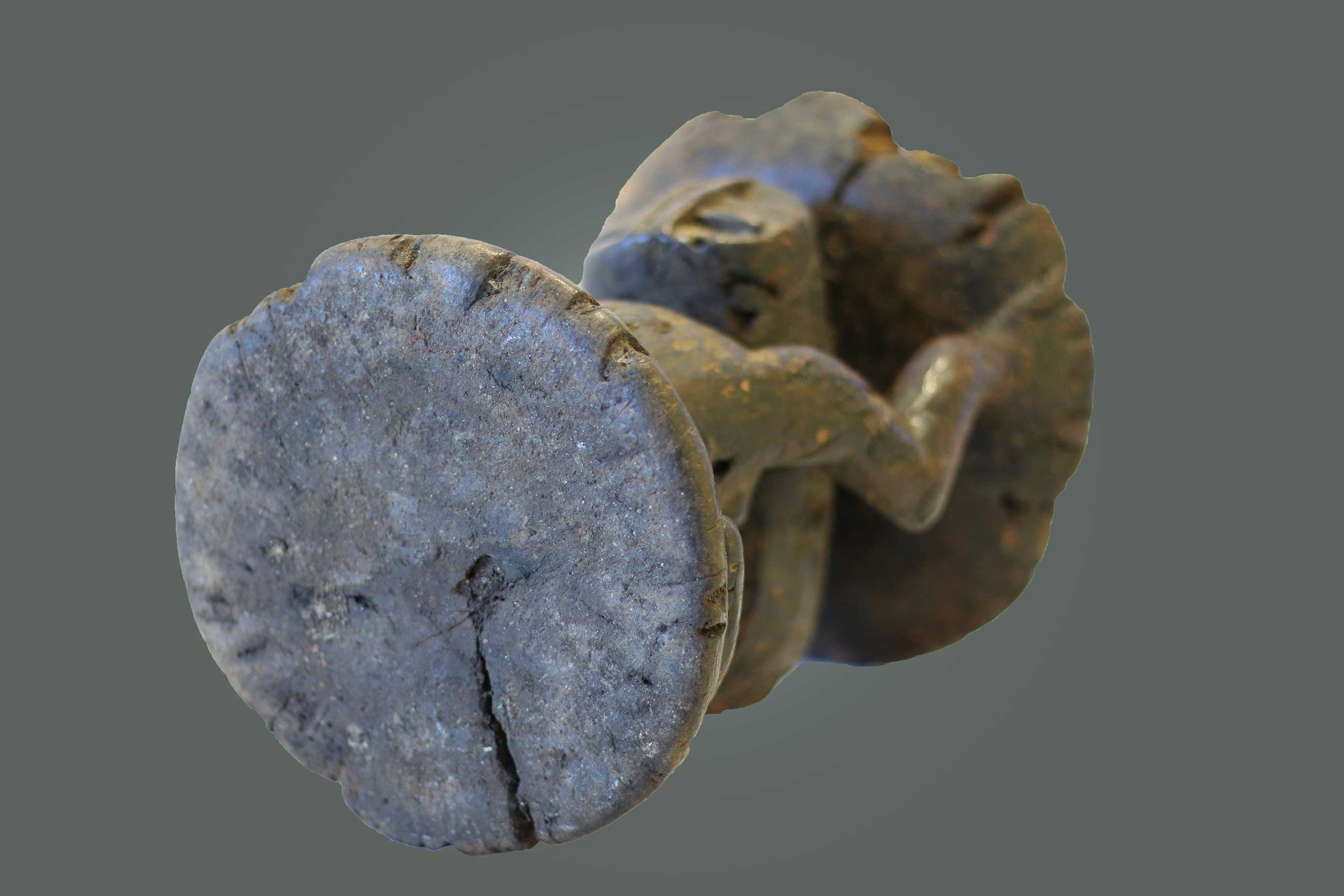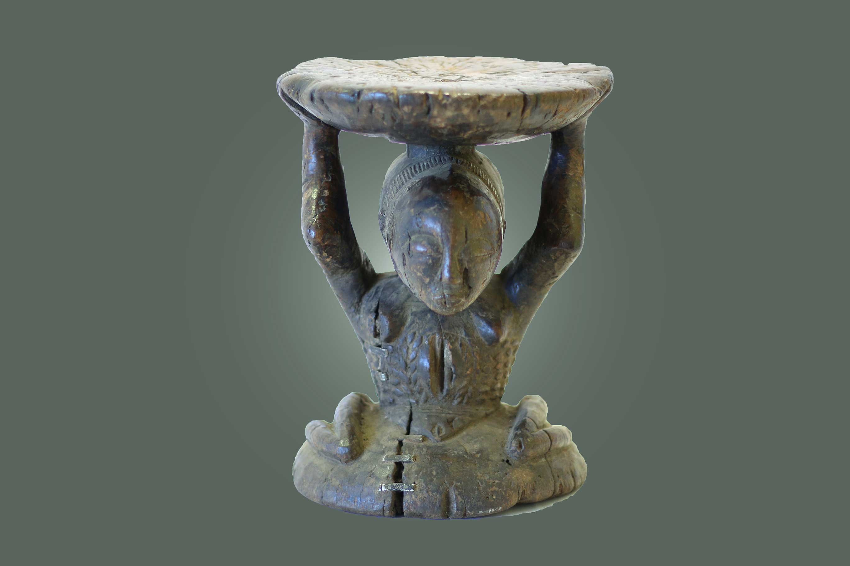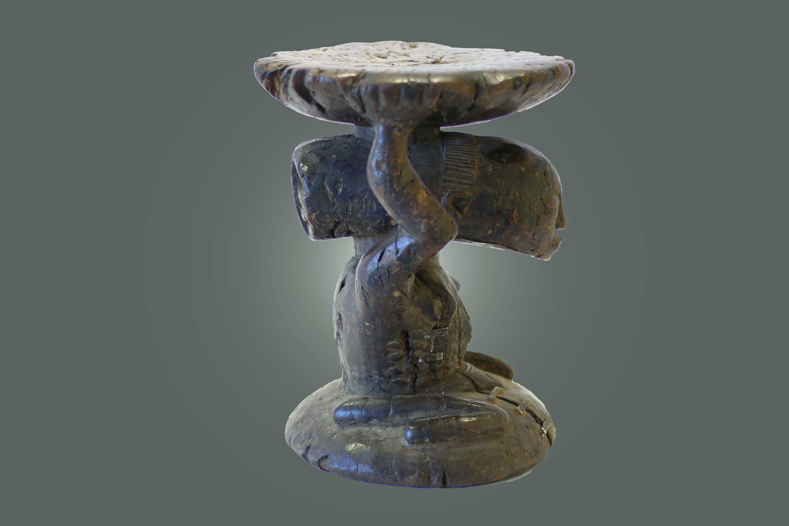 The Luba are an ethnic group found in the South-eastern Democratic Republic of Congo (Zaire). The Luba tribal art is mostly known for a feminine representation to show the importance of women in society. Much of the Luba art appears to serve a certain purpose although this has been replaced by symbolic purposes. Sculpted caryatid stools serve symbolically as seats of power and sites of memory for deceased kings and chiefs rather than serve as places to sit hence serve as metaphors rather not literal seats of kingship. Their design is mostly figurative and abstract. These stools represented a Luba concept of the female body as a spiritual receptacle that supports divine kingship. The aesthetic refinement of the female body through elaborate skin ornamentation serves as a metaphor for the civilization and refinement that Luba rulers disseminate within society. This stool is carved in heavy wood with a brown patina with visible signs of old age.