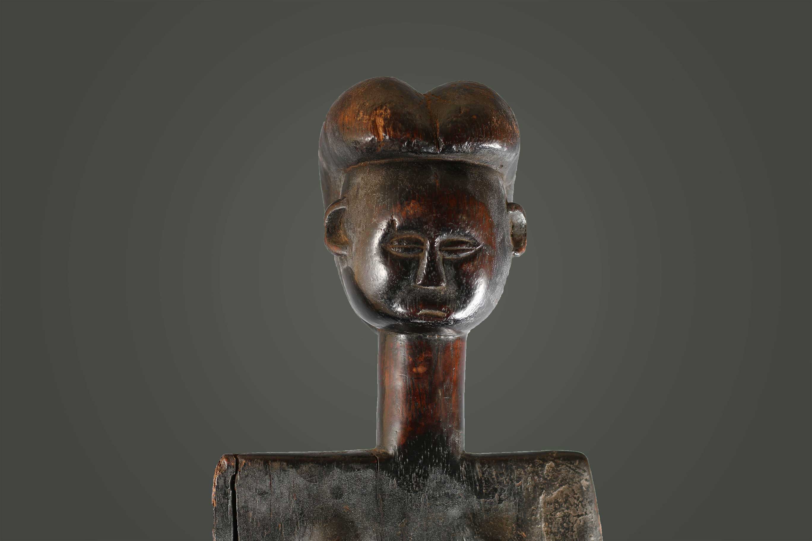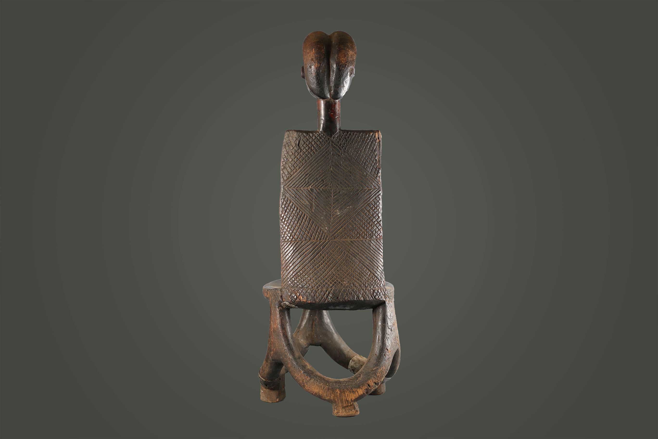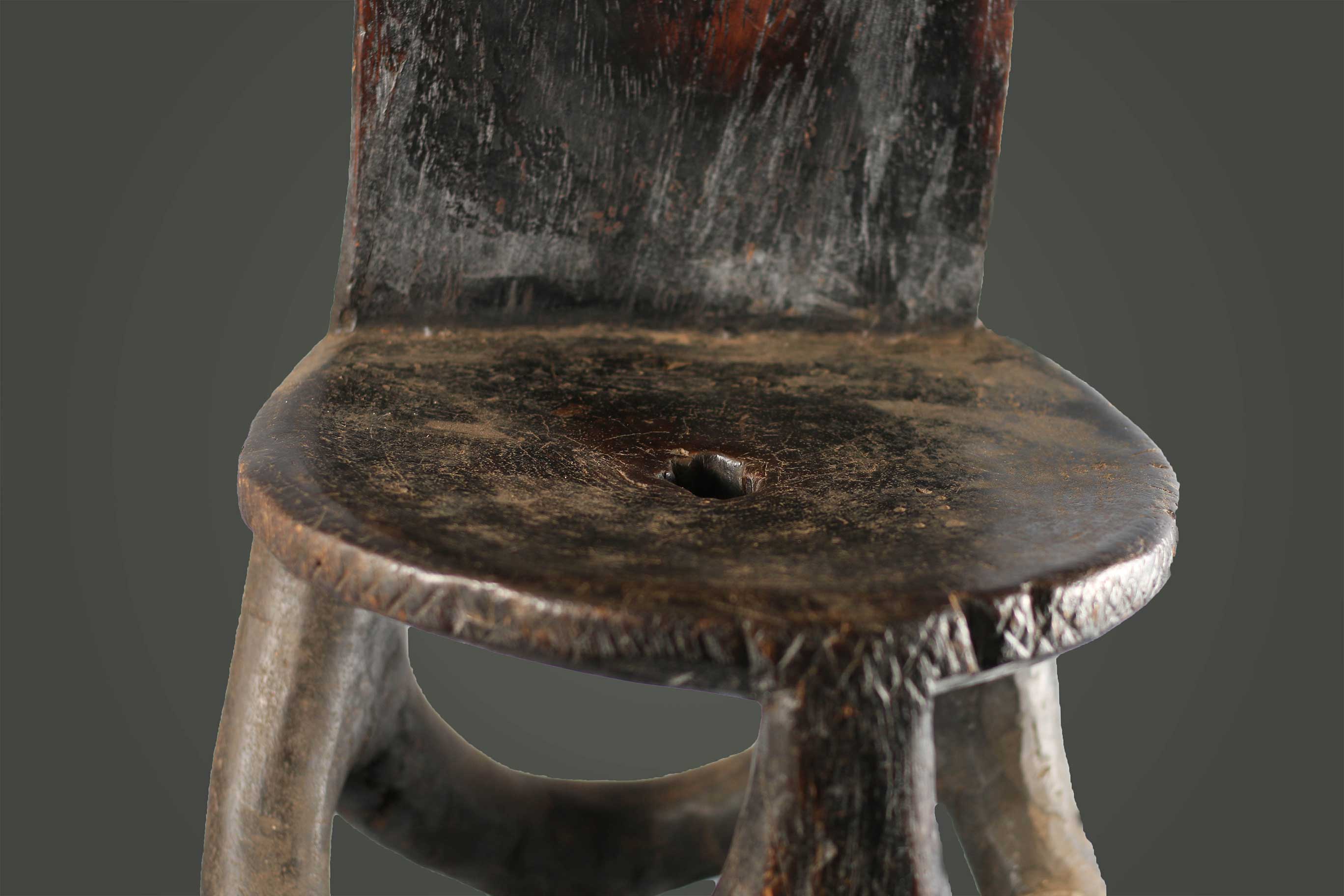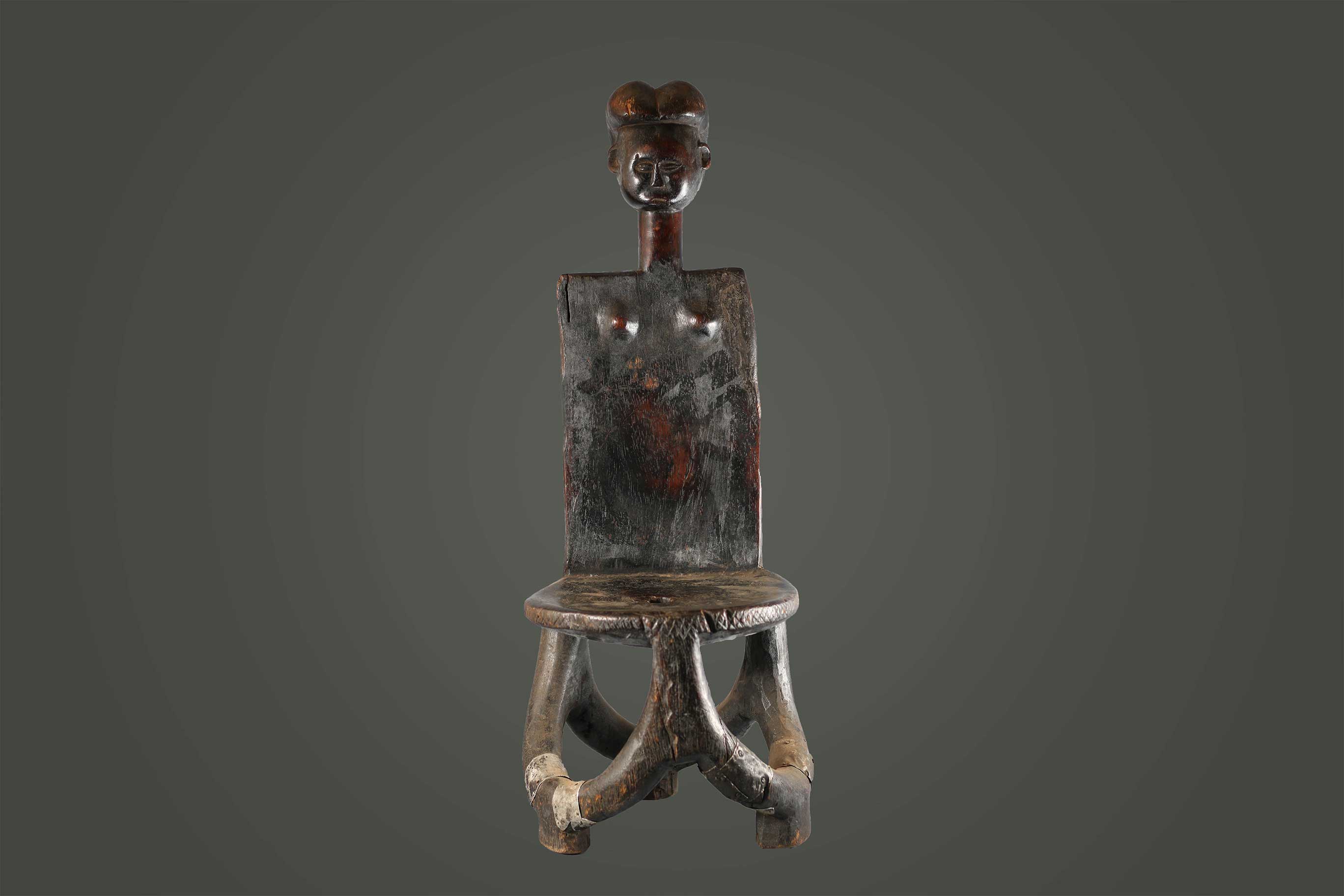 This is a nicely heavy-hard carved wooden piece with a dark patina and visible signs of old age. It is a high backrest that displays the abstract shape of a woman with breasts on the inside of the rest, and neck and head with high crested coiffure in the upper section. The round seat rests on three legs that are connected.
