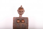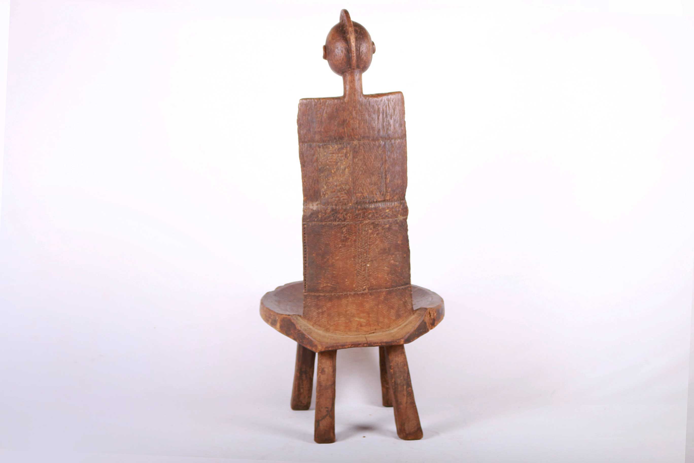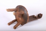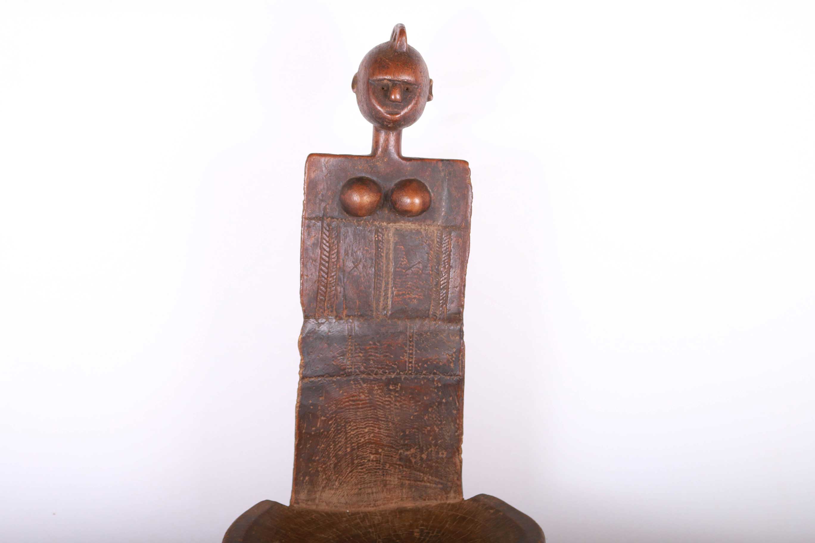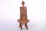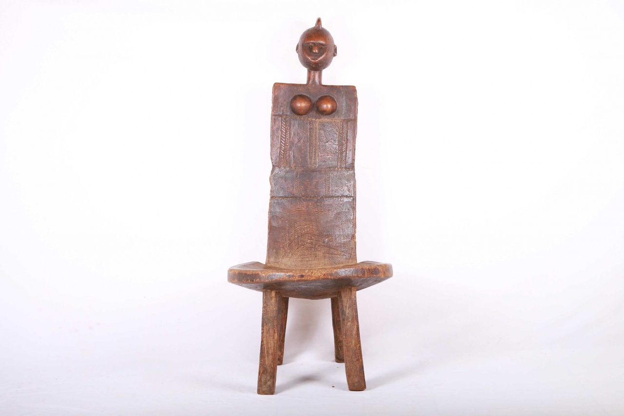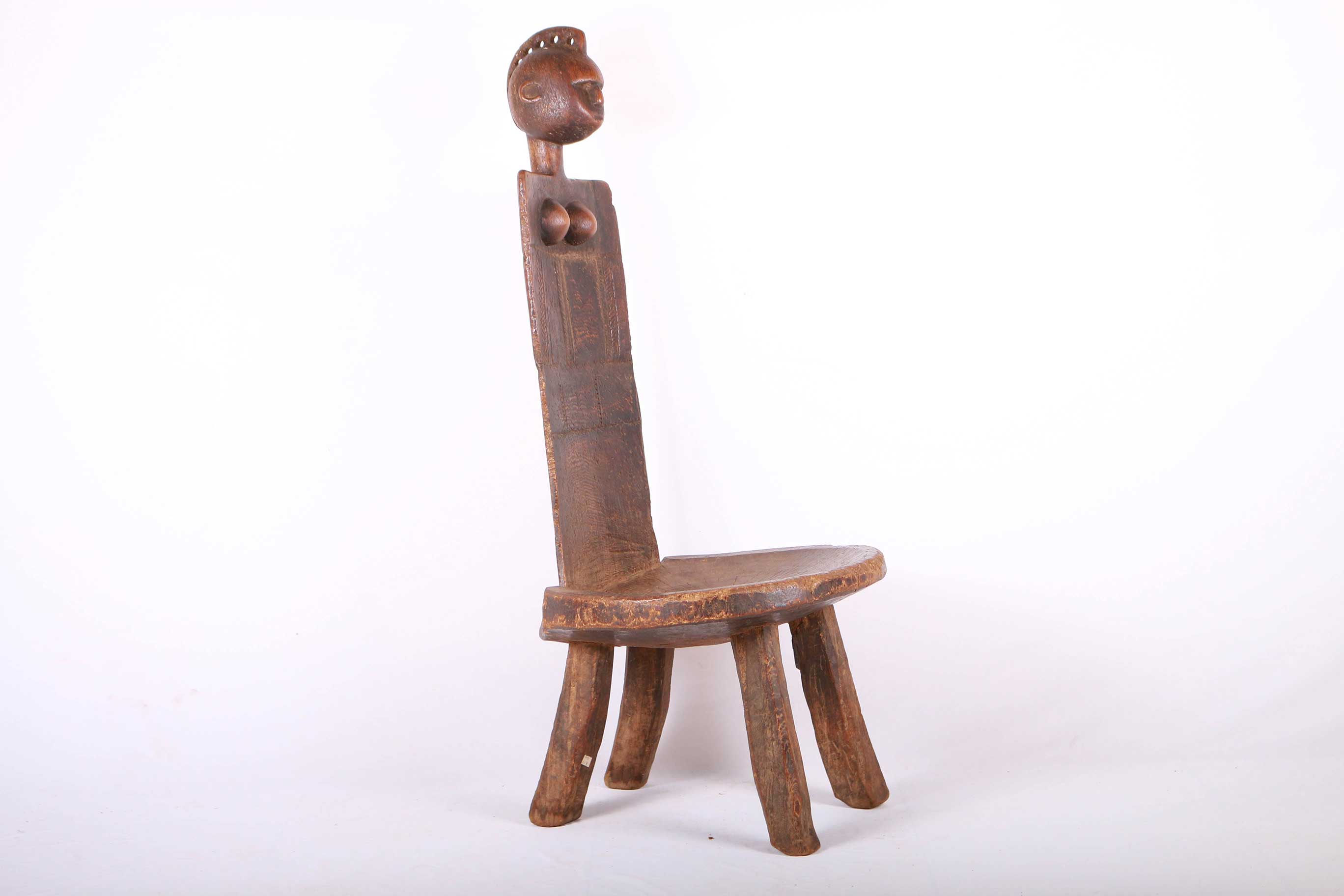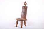 This fantastic high rest chair originates from the Luguru tribe in East Africa, Tanzania in East. Such stools (high rest) carved in human shape were reserved for chiefs only. They were used as throne seats for chiefs. This piece is carved from a piece of hard, heavy wood with a black and brown patination. It displays the abstract shape of a woman, with breasts on the inside of the rest, and neck and head with high crested coiffure in the upper section.