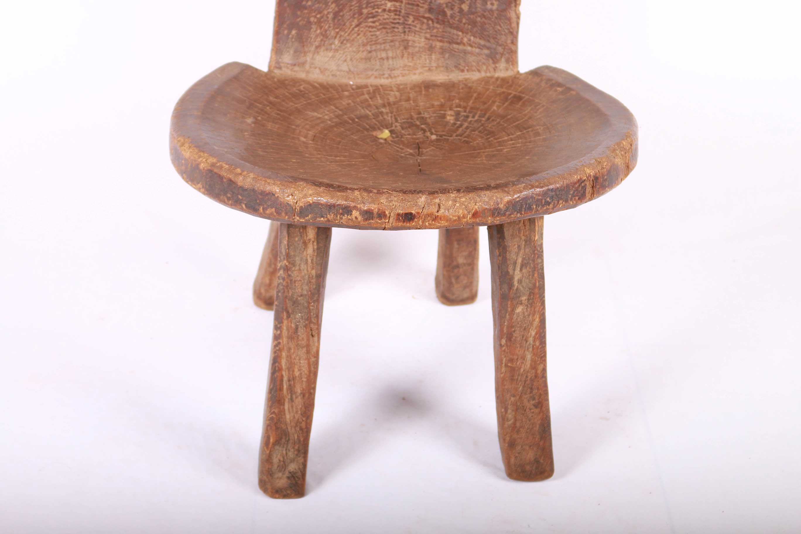 The almost round seat rests on four columnar legs. This is an old piece with good usage, traces are visible on the backrest. It was finely finished and it is in good condition.