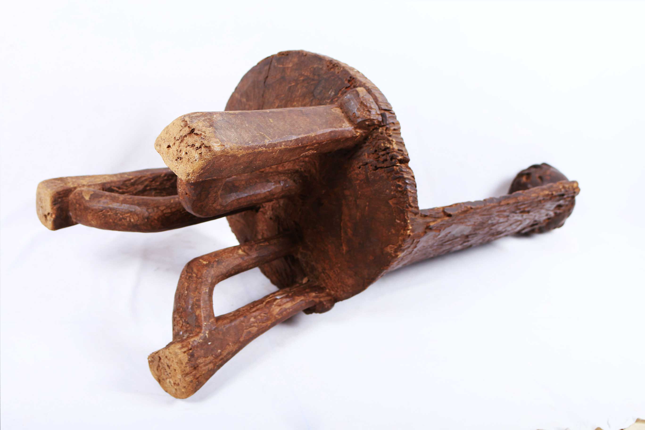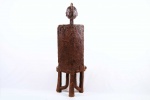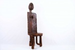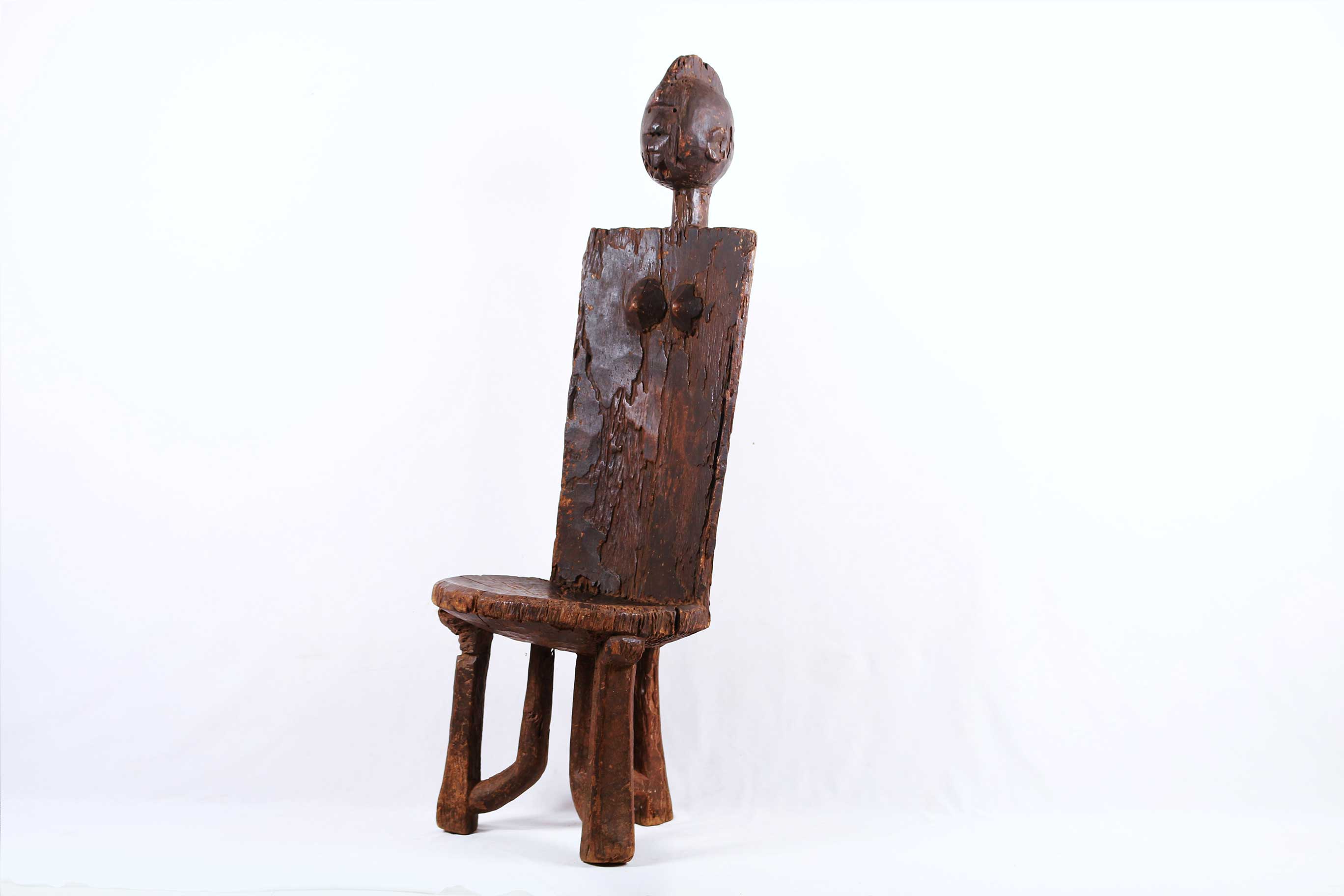 This is a nice heavy hard wooden carved piece with a brown patina, it is a high backrest which displays the abstract shape a woman with breasts on the inside of the rest, and neck and head with high crested coiffure in the upper section. The round seat rests on three legs that are connected by rhombs on the left and right sides and decorated with chip-carving motifs on the external side. Carefully crafted chip-carving decorations also embellish the back of the chief’s chair.