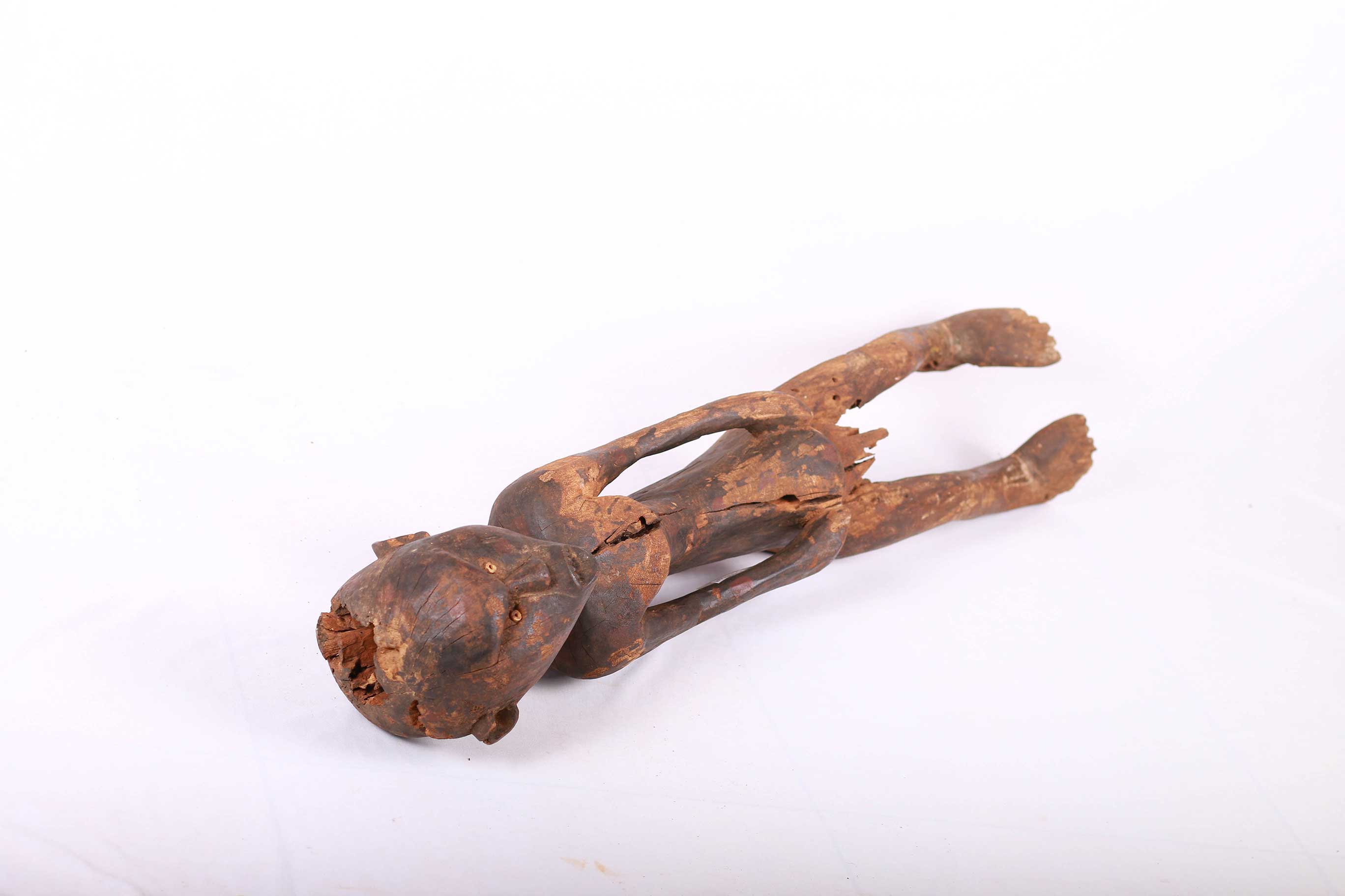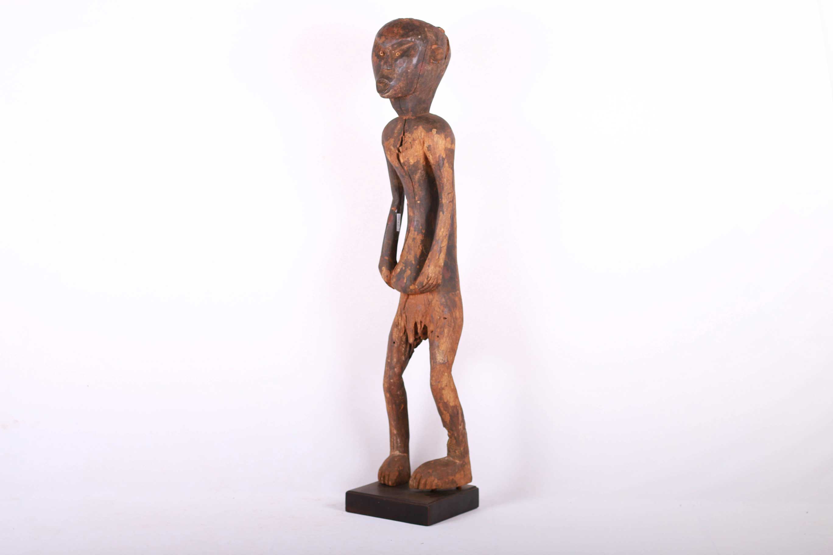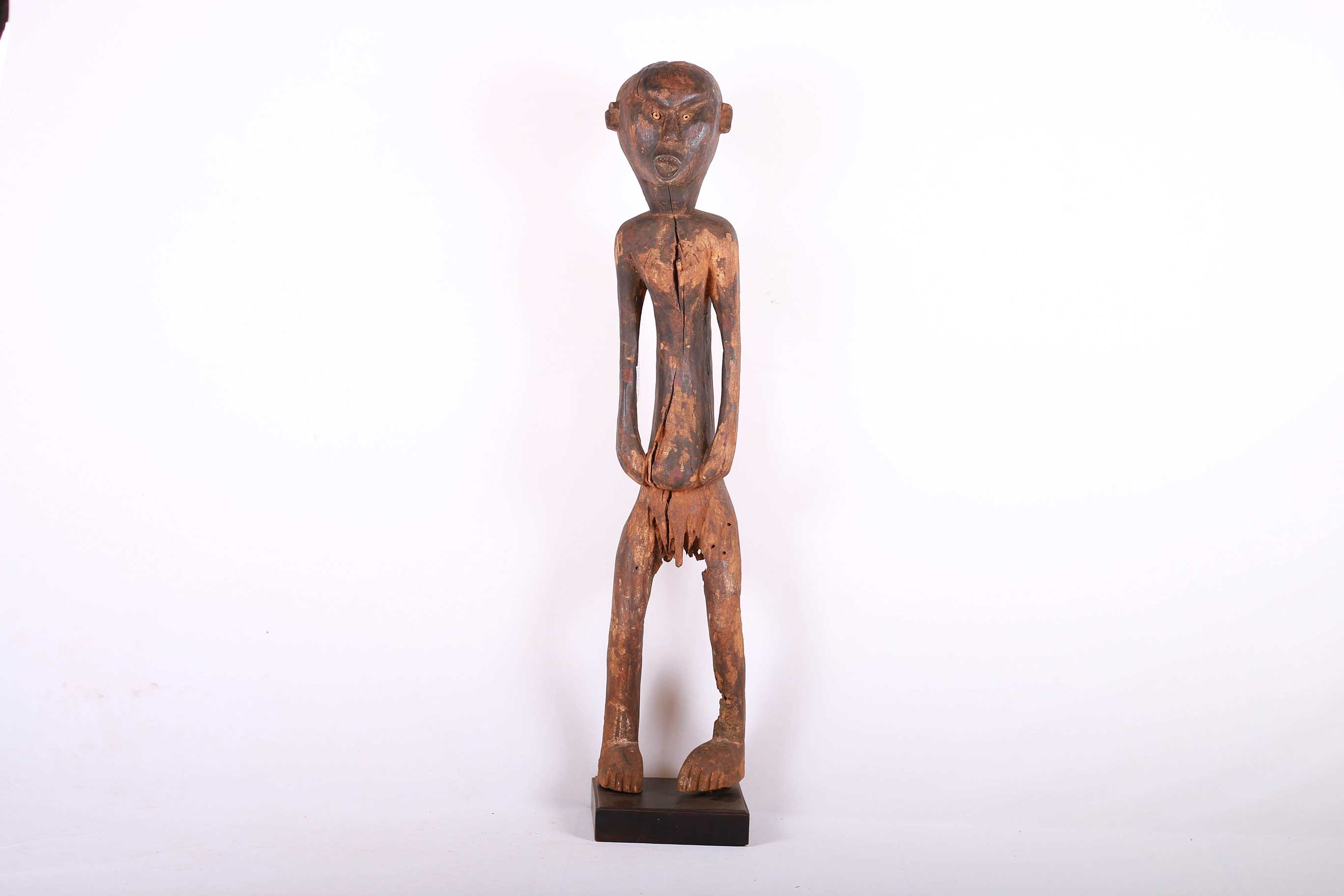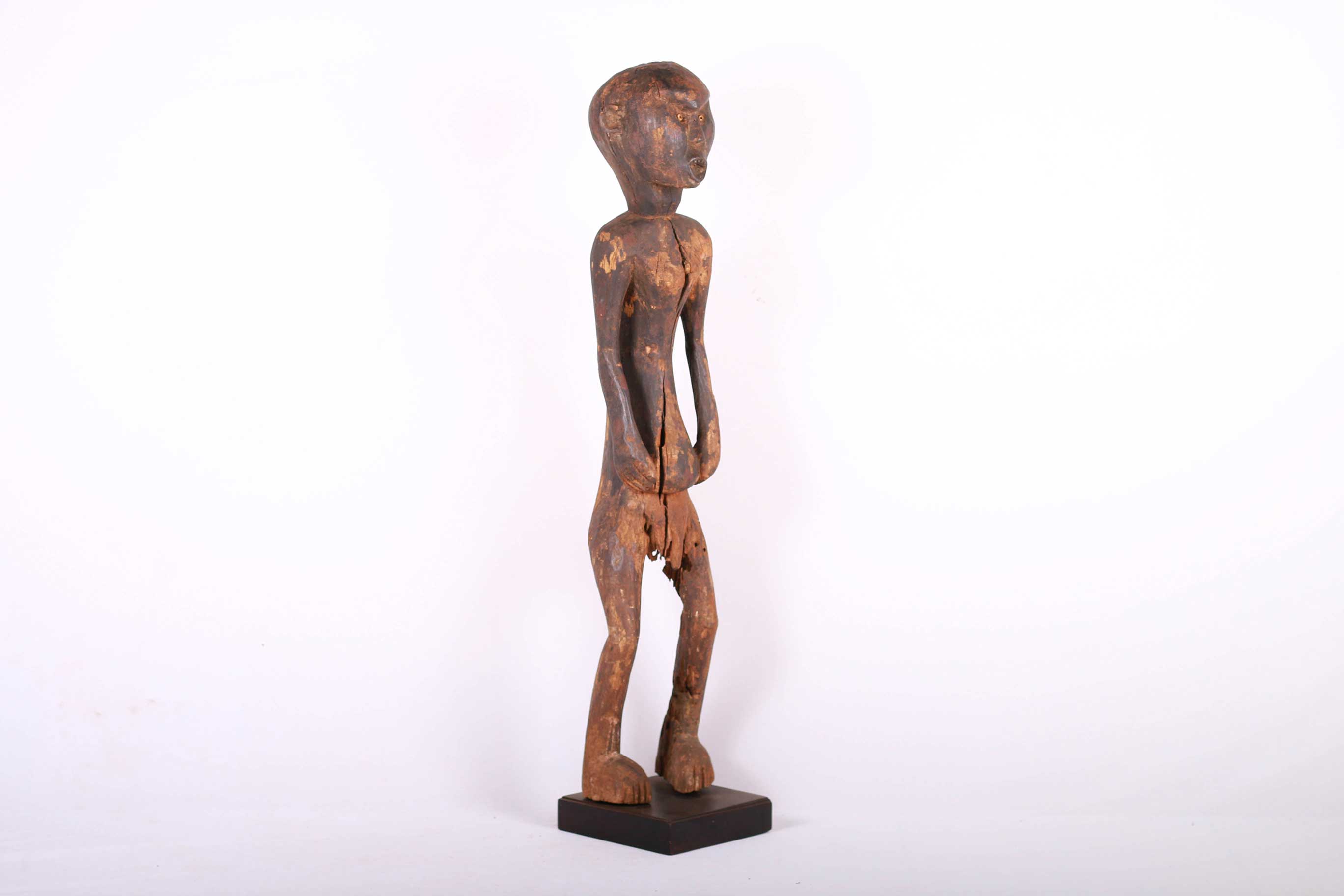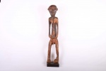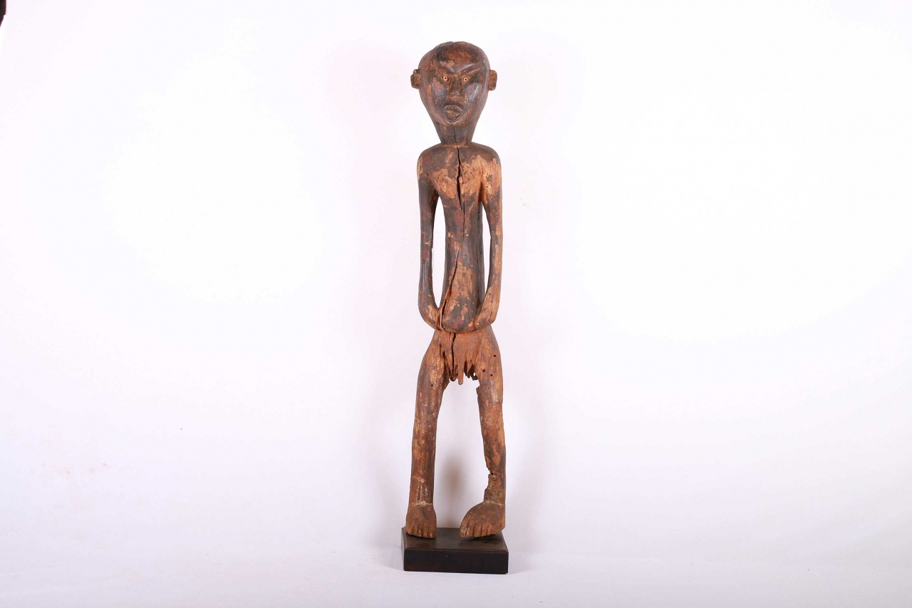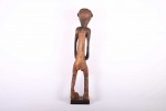 The Luguru are a Bantu cluster found in both east and central Tanzania in East Tanzania. Very little is known about the Luguru art. This sculpture represents a man standing straight with arms at the belly and such sculptures were personal to their owners. Very little is known about Luguru art so we are not well conversant with the use of this sculpture. It is a sculpture that is carved from wood, has visible signs of old age with a worn-out brown patina due to massive usage.