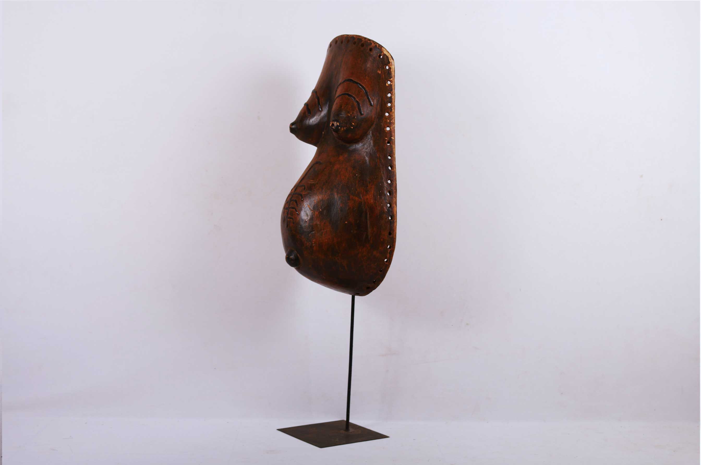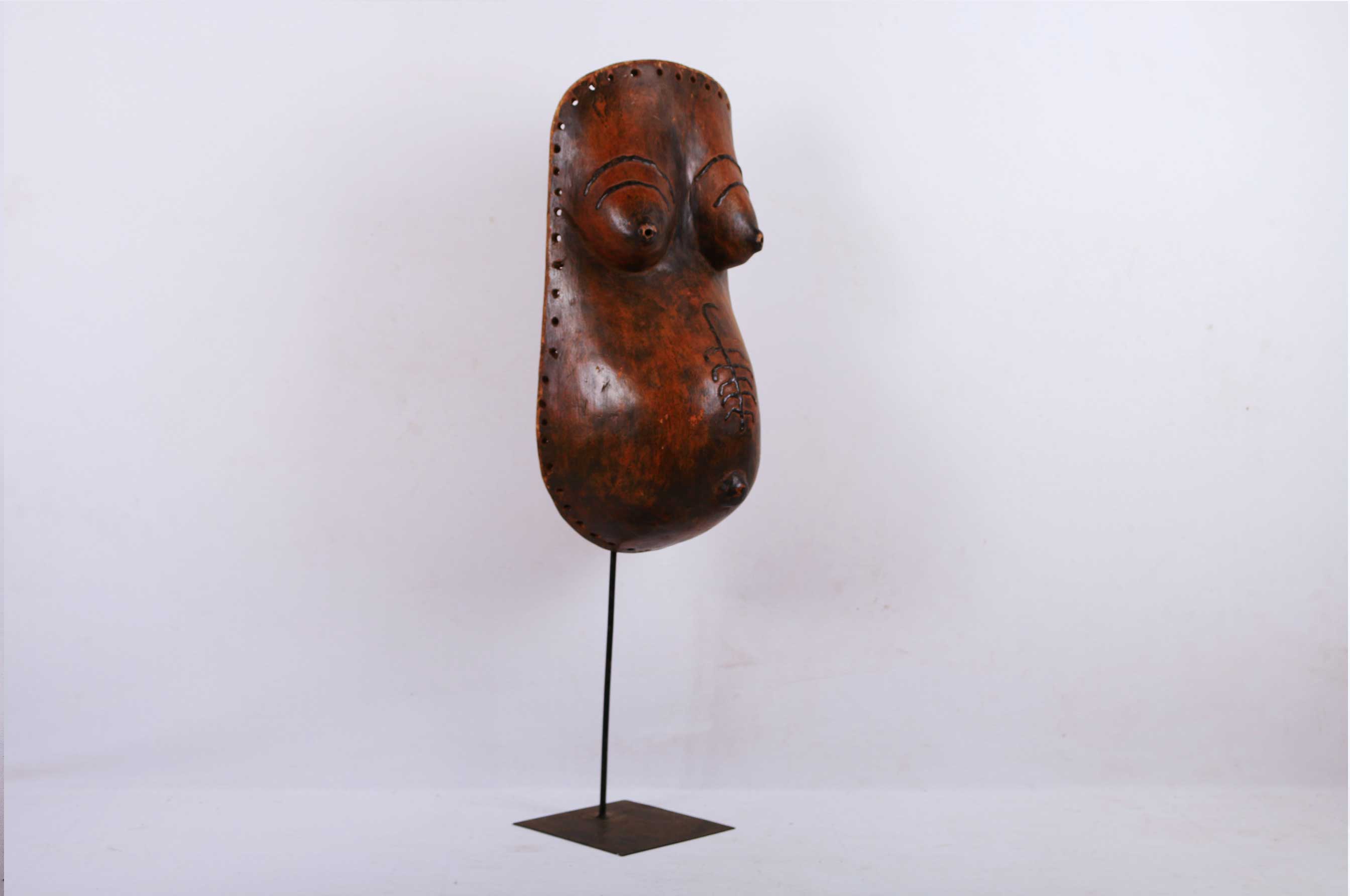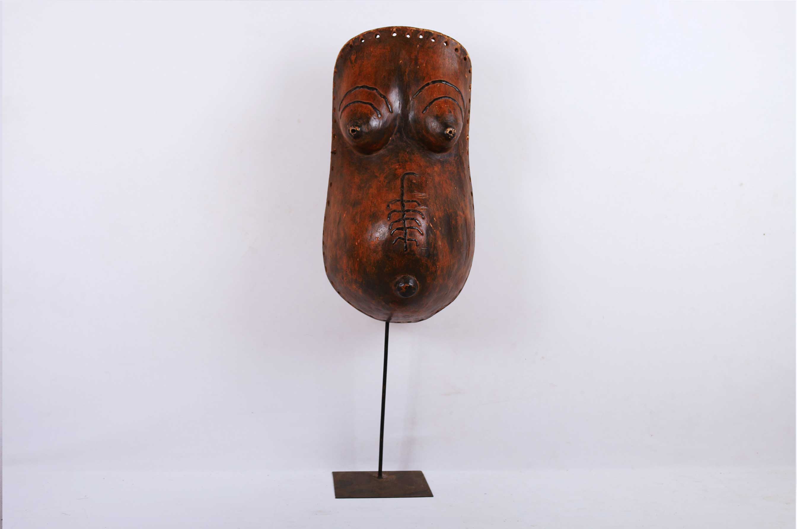 The Makonde have an ancestress cult. Female body masks, depicting a torso with breasts, pregnant belly, and sometimes scarification patterns, promoted fertility. This female body mask was part of the costume of a special Ndimu masker called amwalindembo presenting a young pregnant woman. The mask was worn by a man and his performances emphasize the difficulty of childbirth.