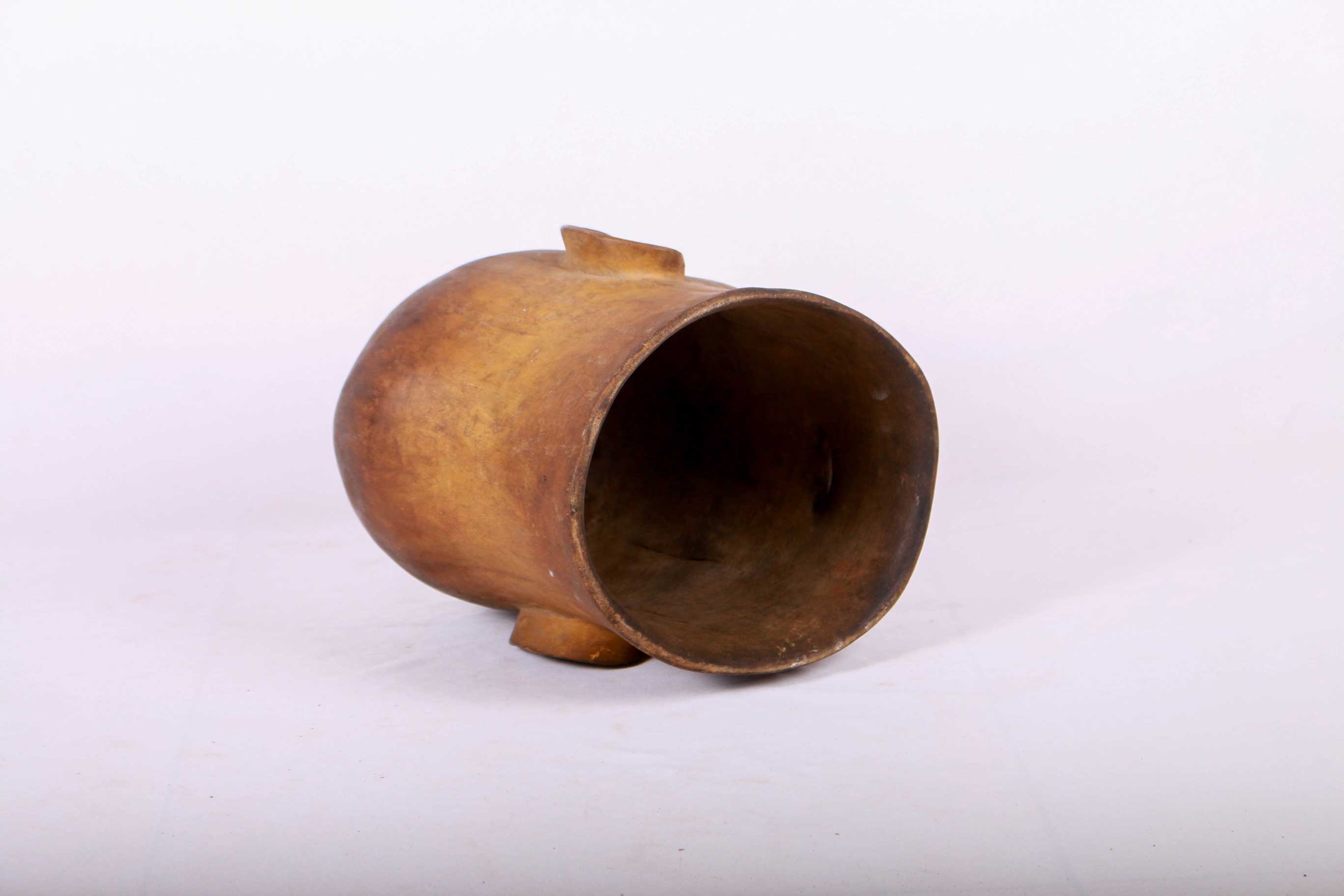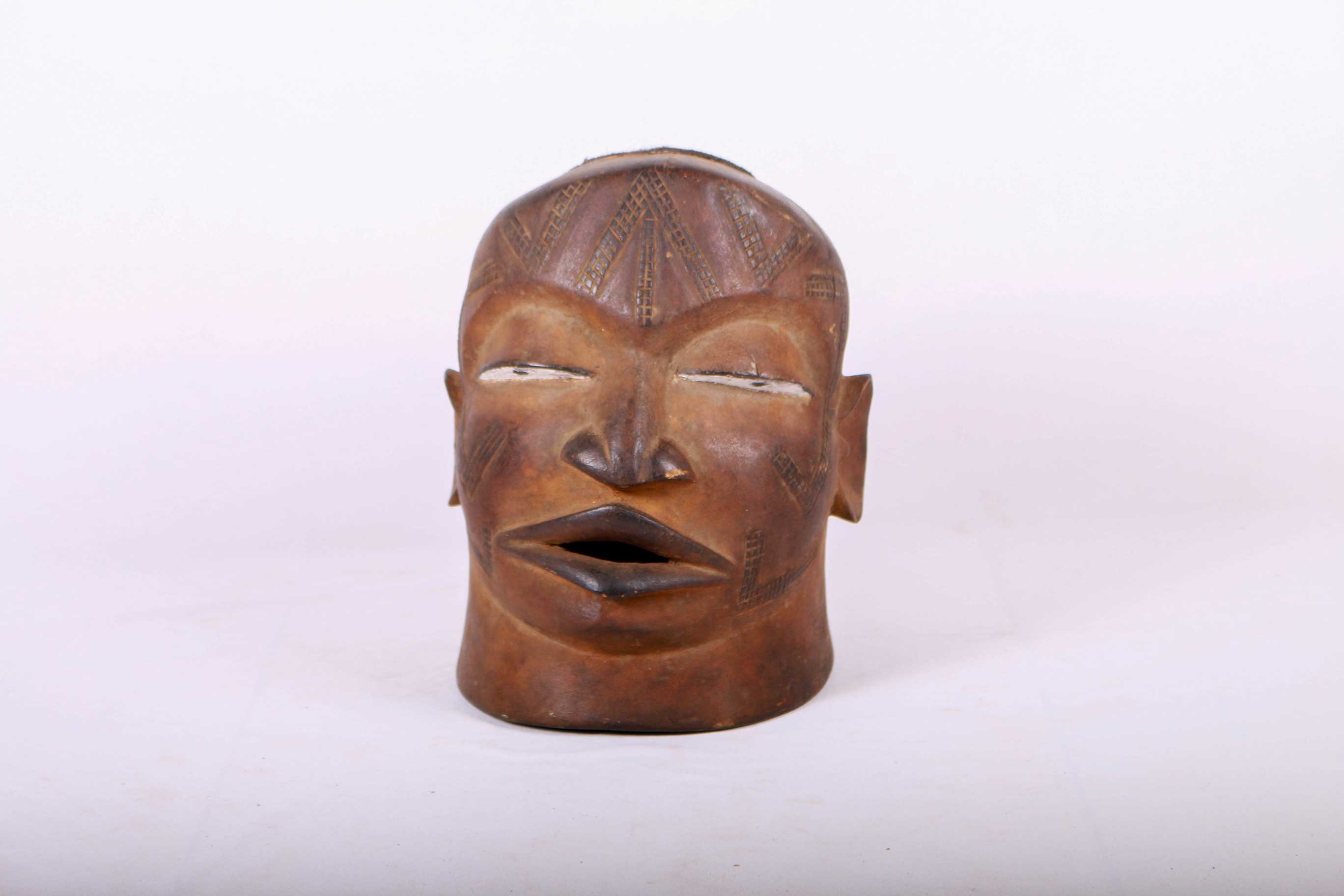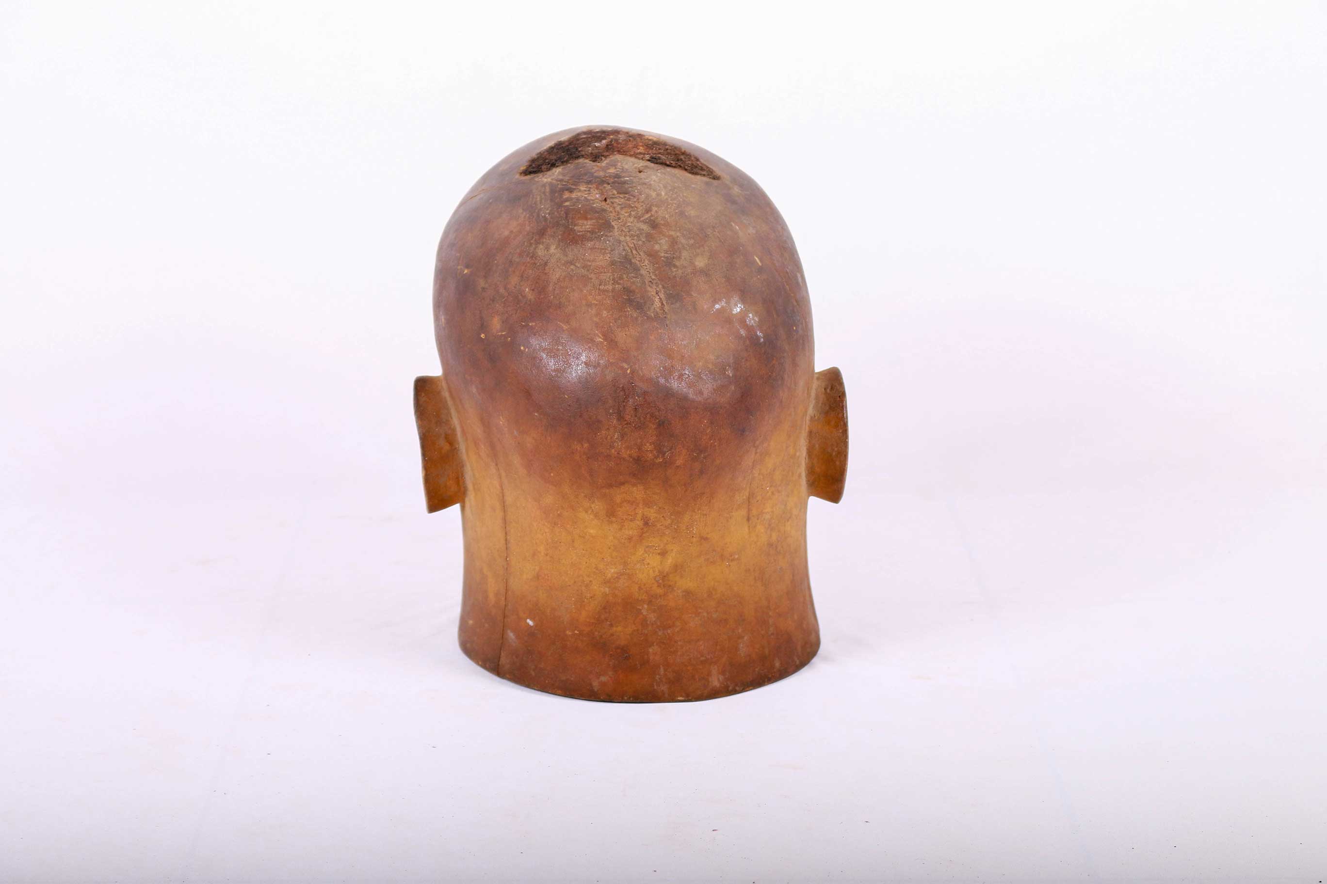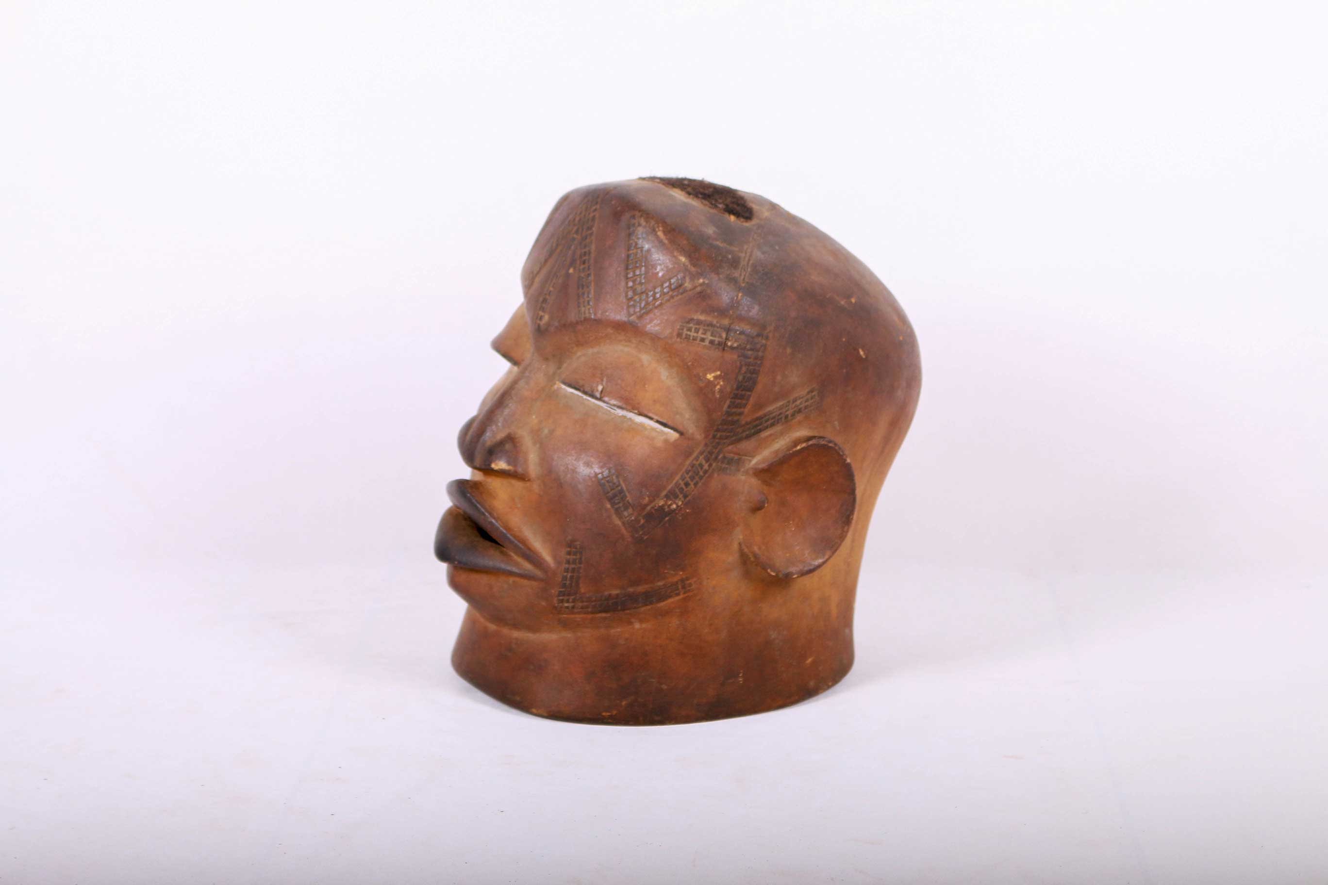 This Makonde helmet mask is locally called the Lipico, it was used during initiation and fertility-related rites. Helmet masks represent ancestors with finely carved detailed features and a slight mouth opening exposing the and the upper lip is adorned with geometric patterns. It has a brown patina and a considerably old age.