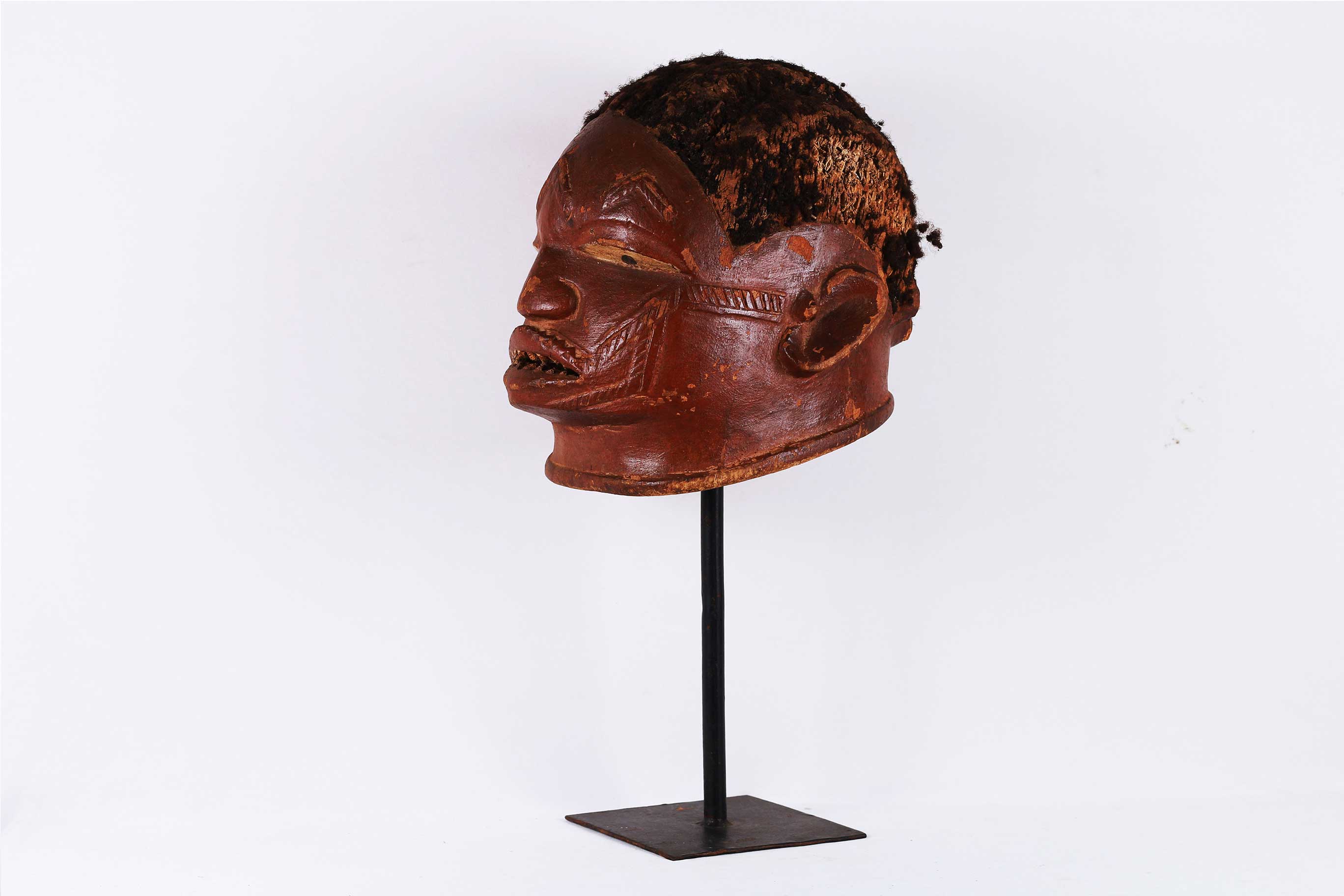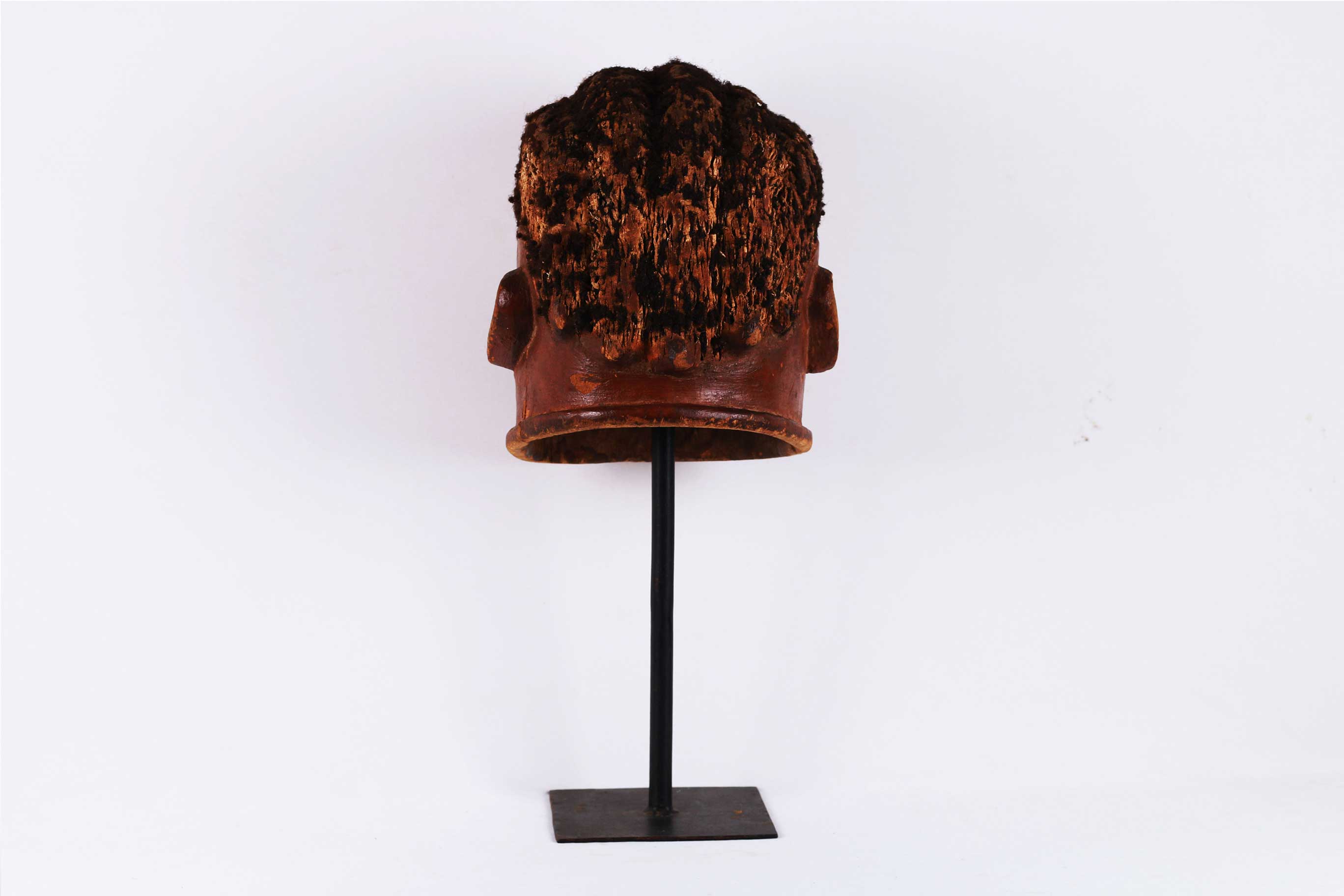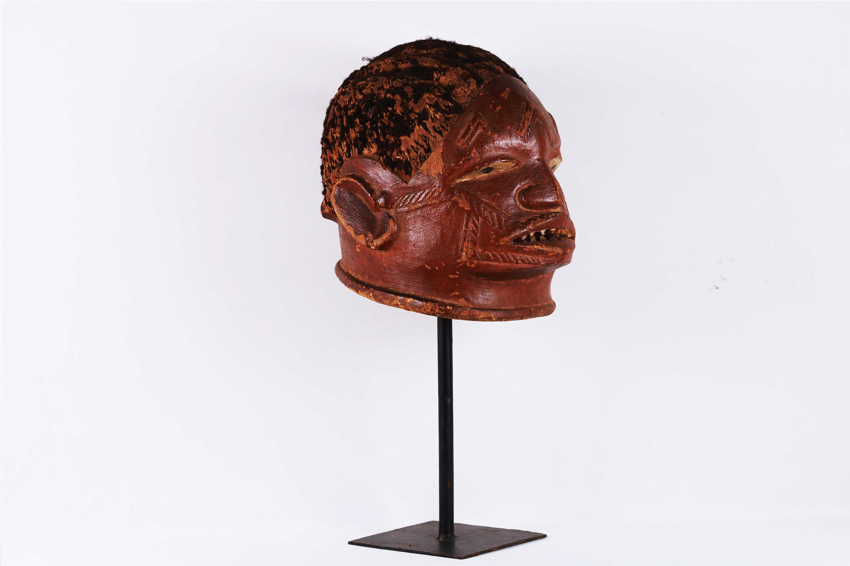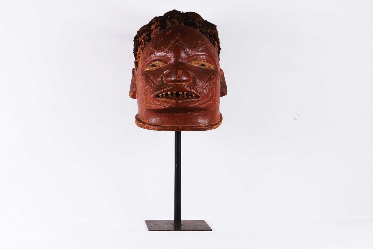 This Makonde helmet mask is locally called the Lipico, it was used during initiation and fertility-related rites. Helmet masks represent ancestors with finely carved detailed features and a slight mouth opening exposing the teeth and the upper lip is adorned with geometric patterns, The top of the head has human hair covering its head, the entire face has patterns of scarifications. It has a brown patina and a considerably old age.