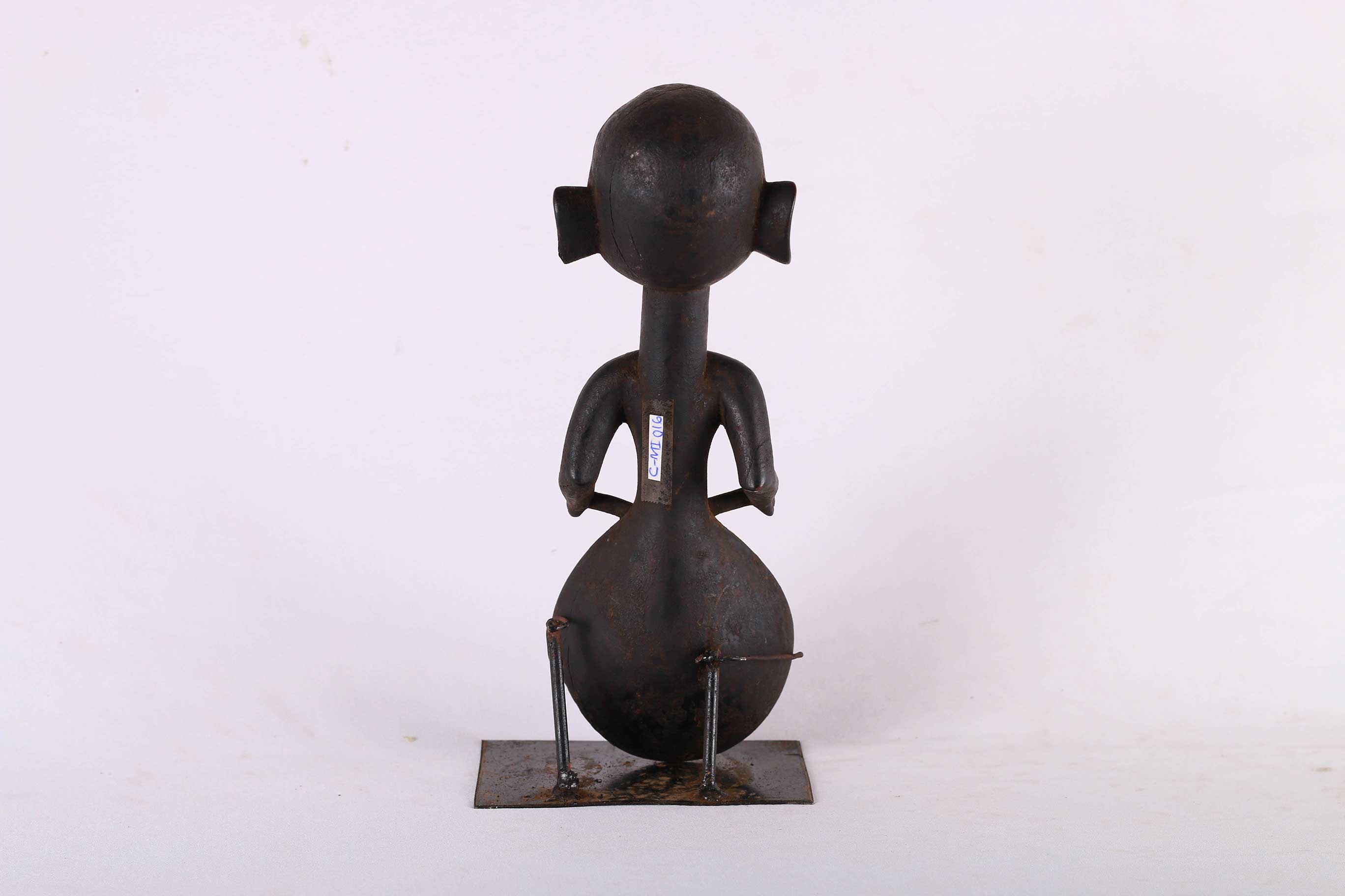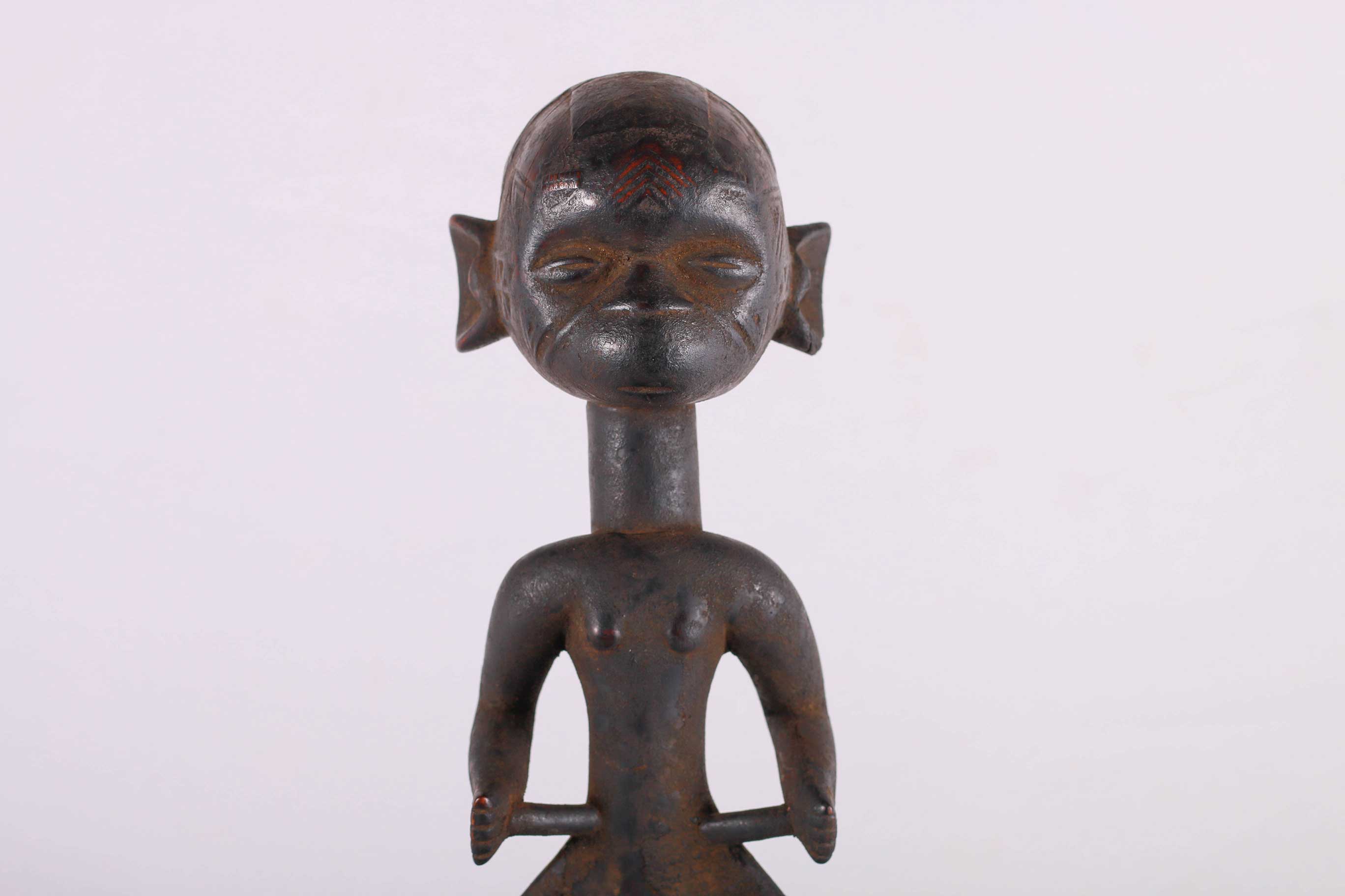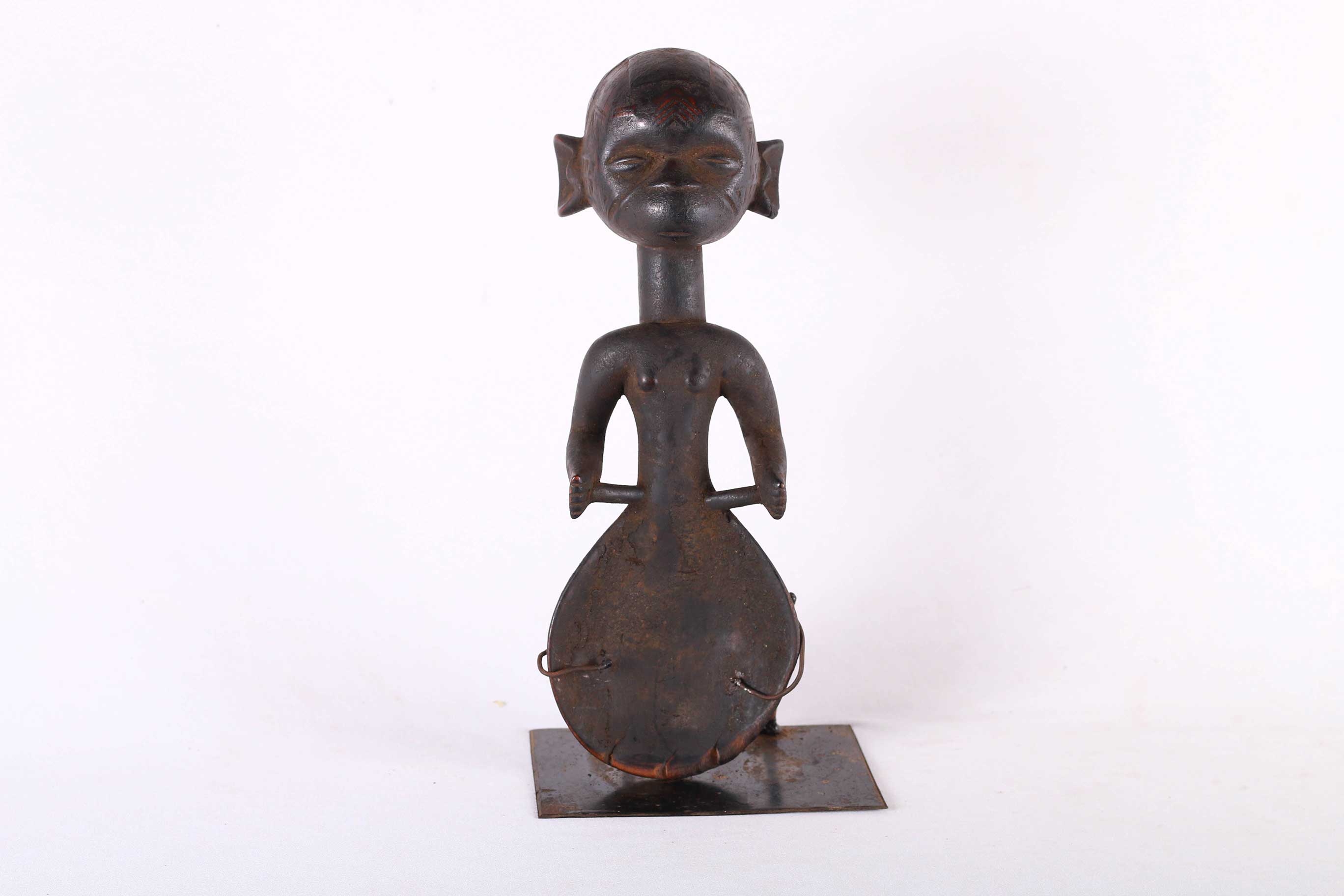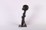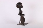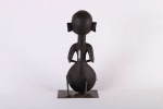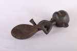 A ceremonial spoon by the Makonde people in Tanzania. with exqiusite design and creativity. Among the Makonde, female figures are said to represent the matriarchal founder of the group. Some figures, both male and female, are used in initiation rites. Most likely a ceremonial spoon, having a large circular bowl and a long shaft terminating in an elegantly and carved female figure with her arms to her side and delicate, raised scarification on the torso and face, accenting her tranquil expression; fine dark encrusted patina.