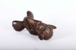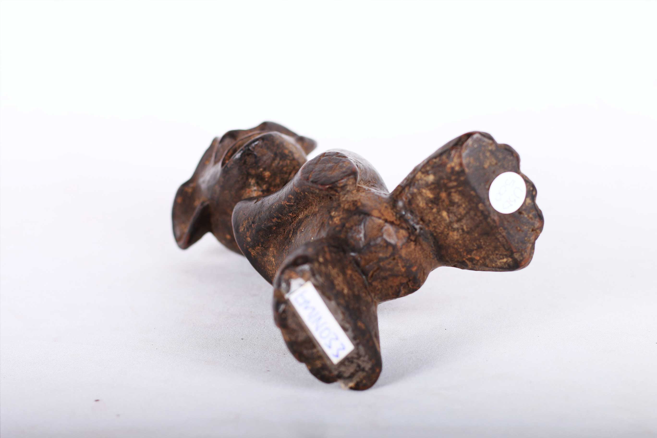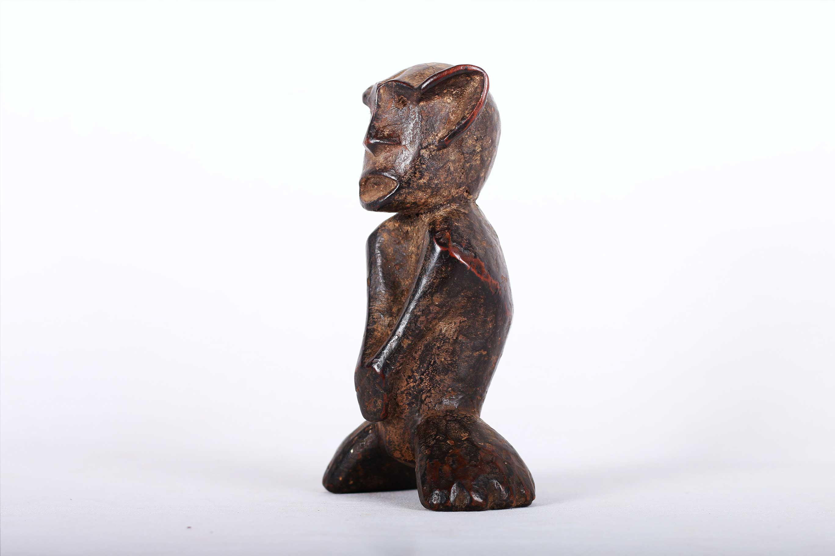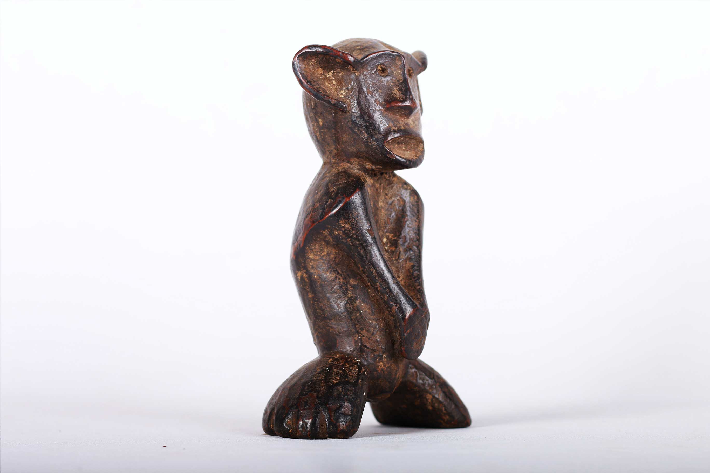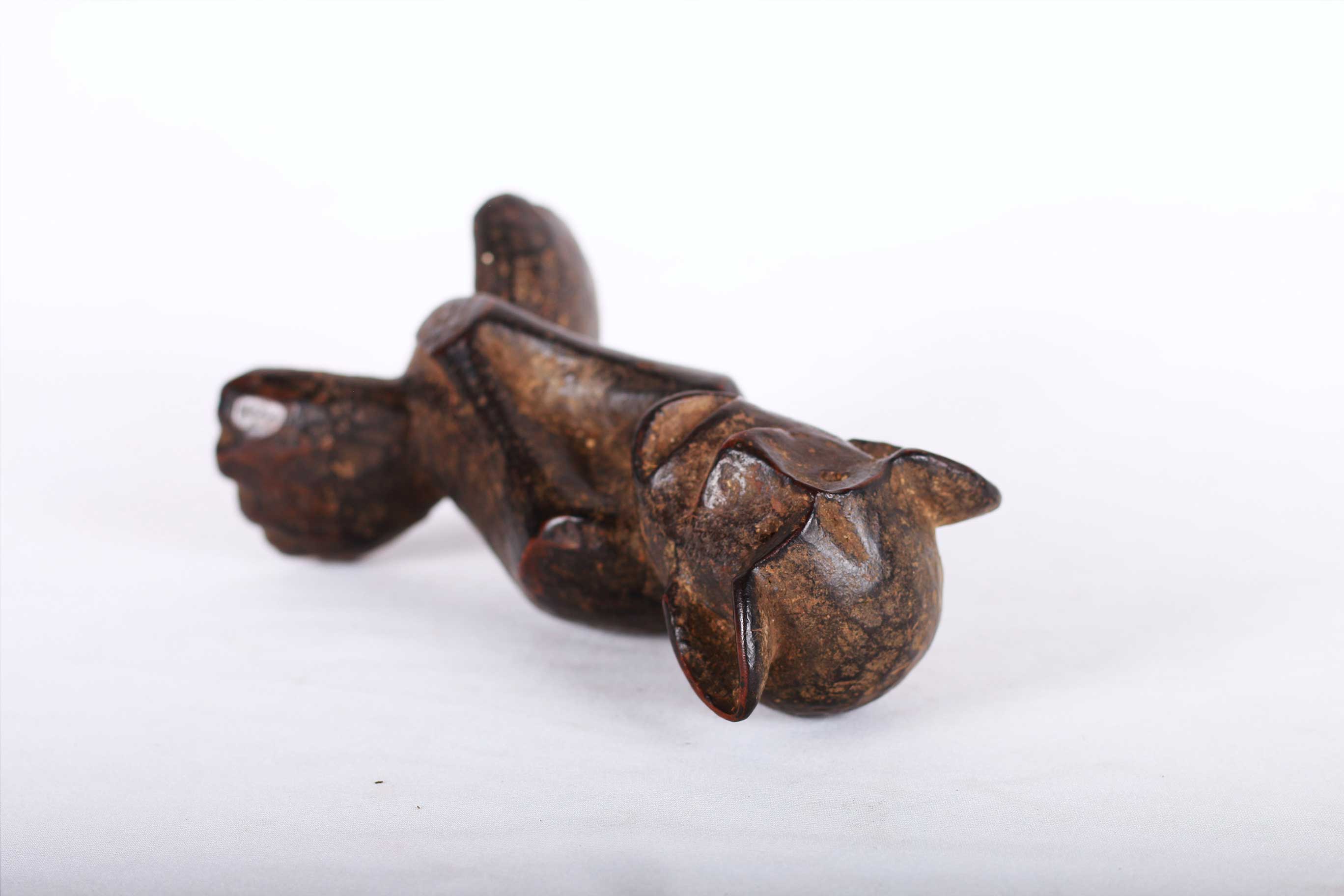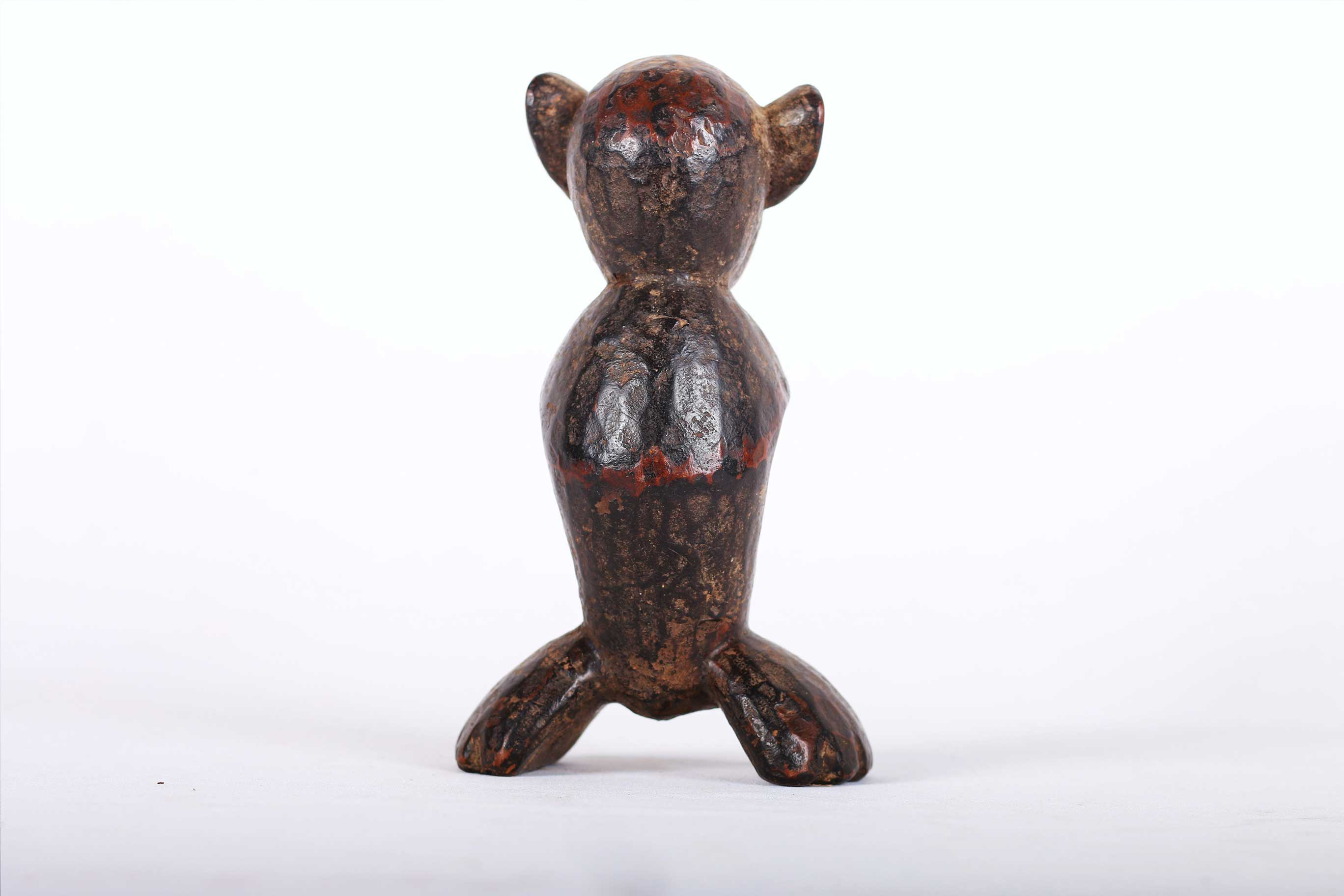 This is a fine small old wood carved Makua Makonde Sculpture from the Makua people, also known as Makhuwa located on the southern border provinces of Tanzania. This fine zoomorphic sculpture was used to represent an armless ancestor. It has a dark worn out patina, arms sculpted on the belly with interesting features and look visibly old due to extensive usage.