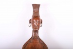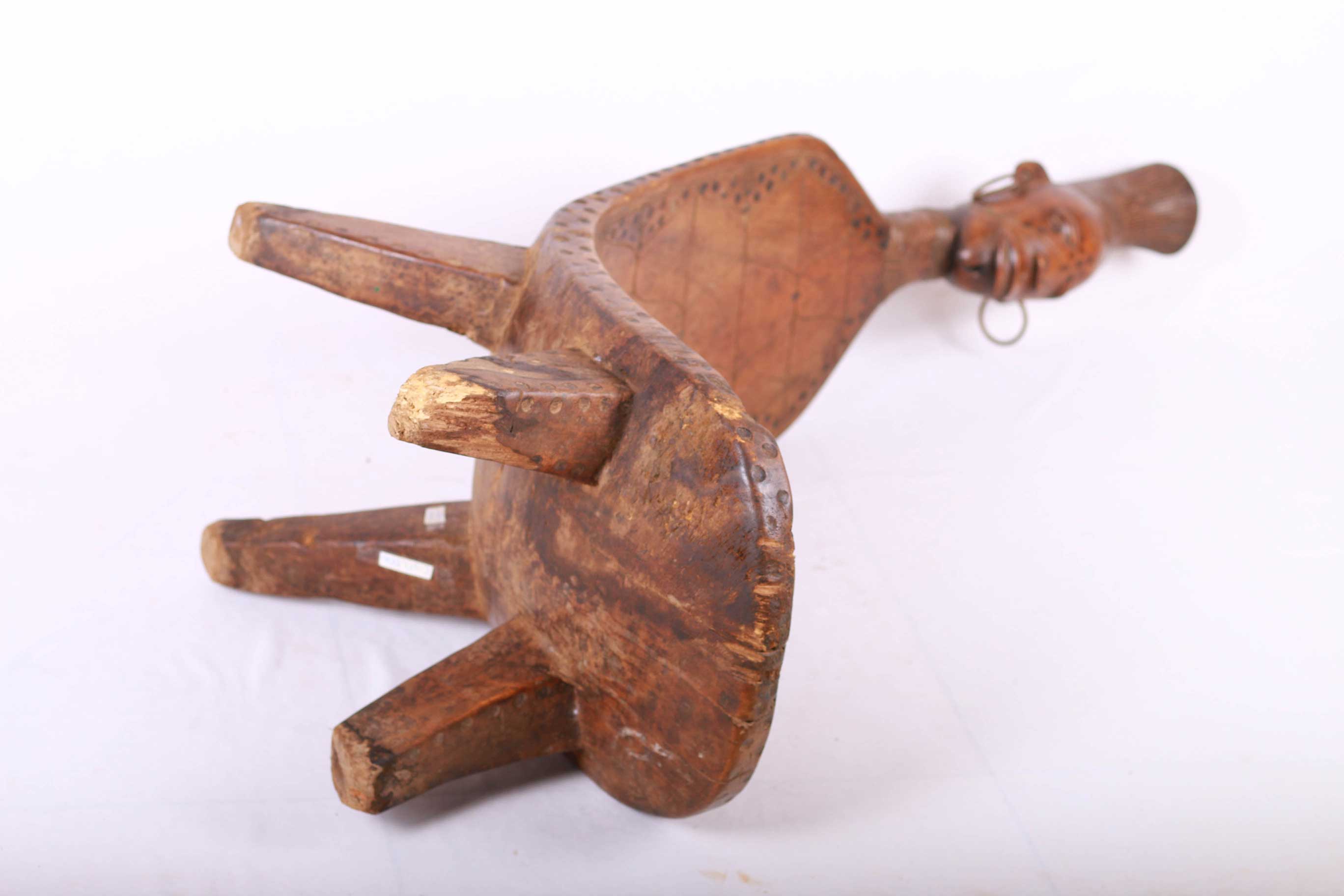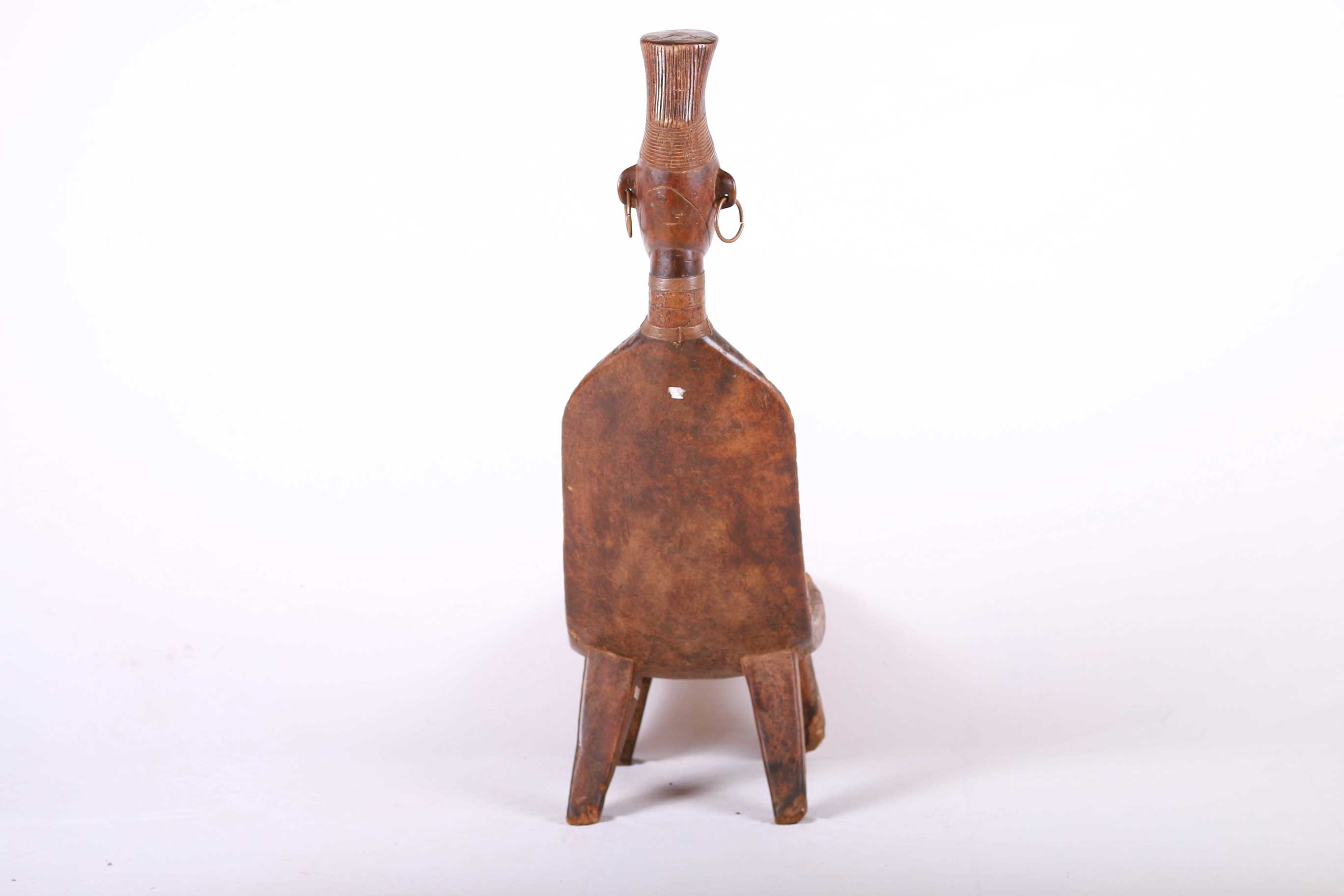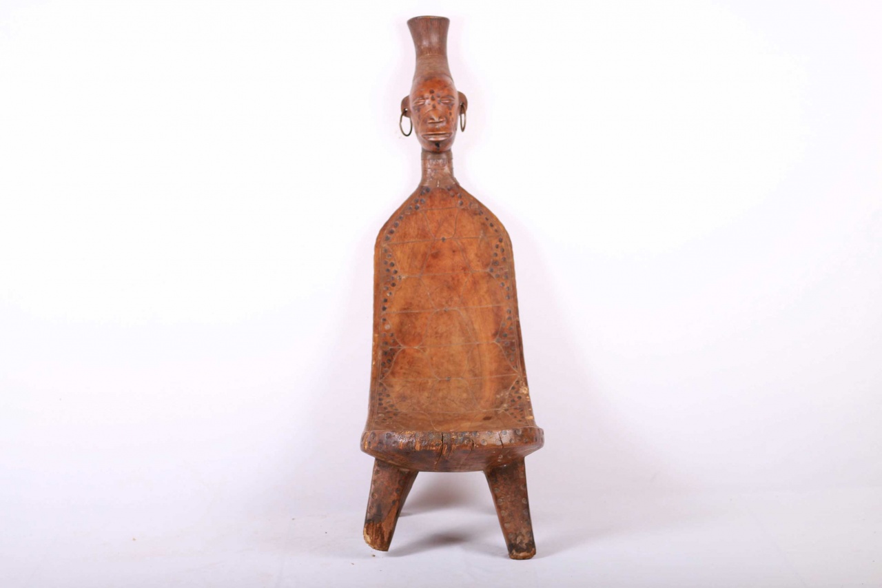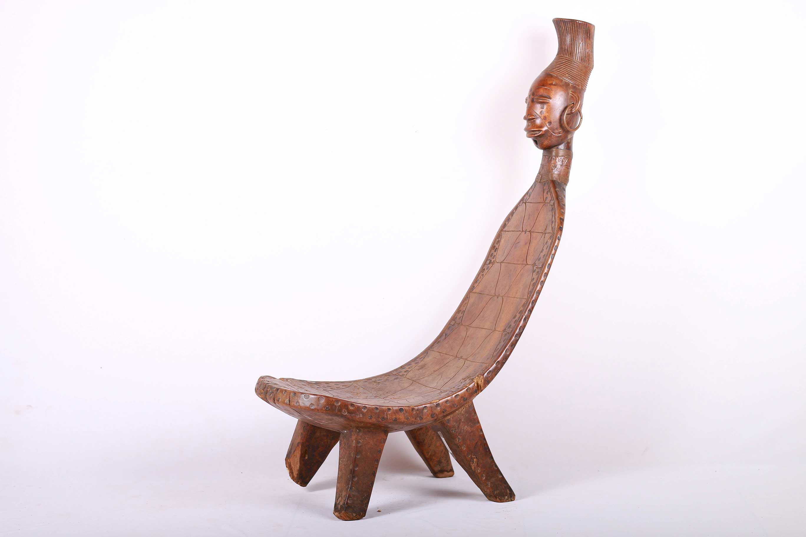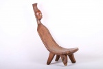 This fine high backrest originates from the Maghbetu tribe in the Democratic Republic of Congo. Such pieces (high backrest) carved in human shape were reserved for chiefs only. They were of personal importance to the owner and showed status and prestige by the chiefs. This piece is carved from a piece of hard, heavy wood with an old brown patination. It displays the abstract shape of a woman, with a female figure on top of the rest, and neck and head with high crested coiffure in the upper section.