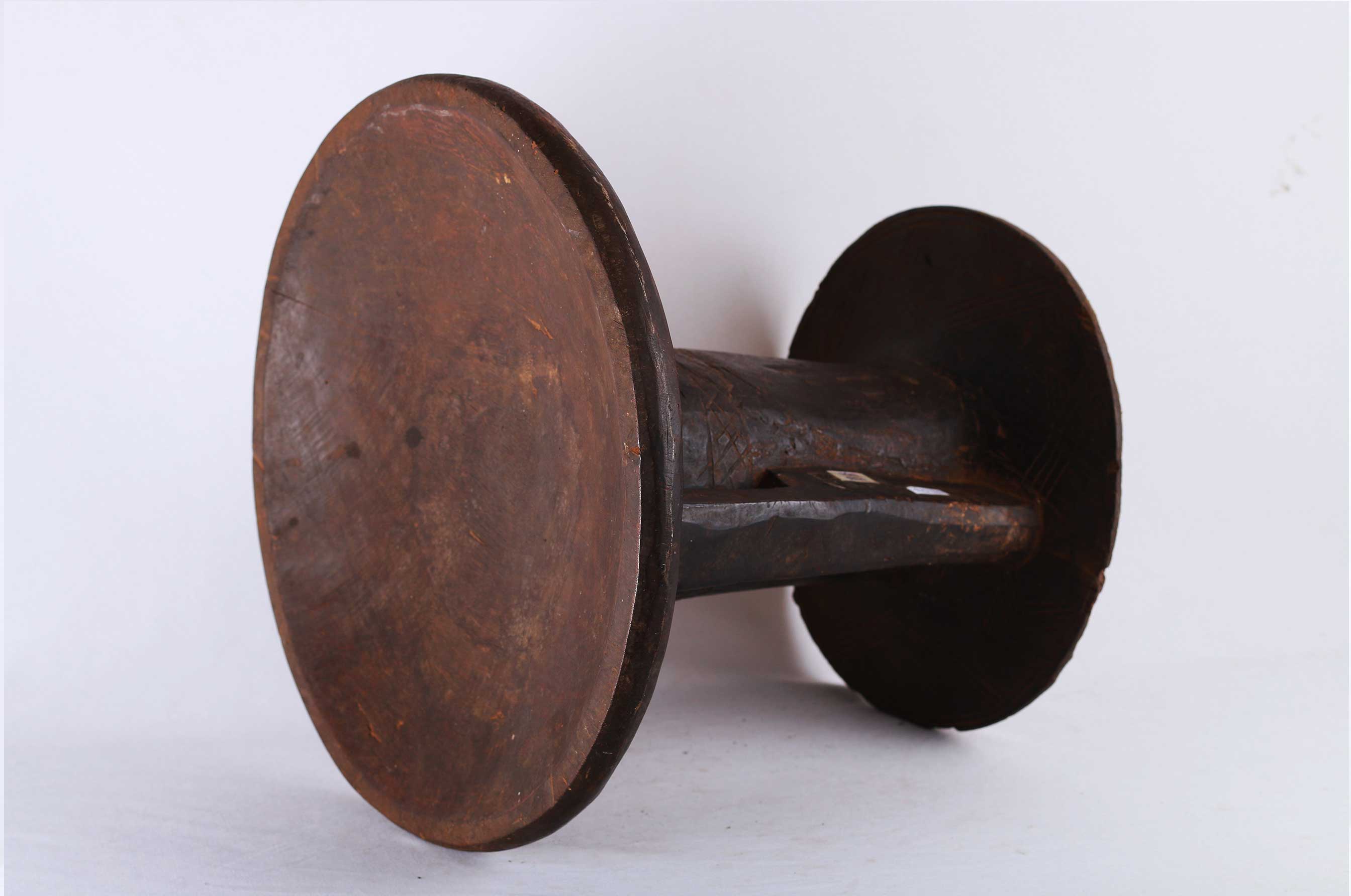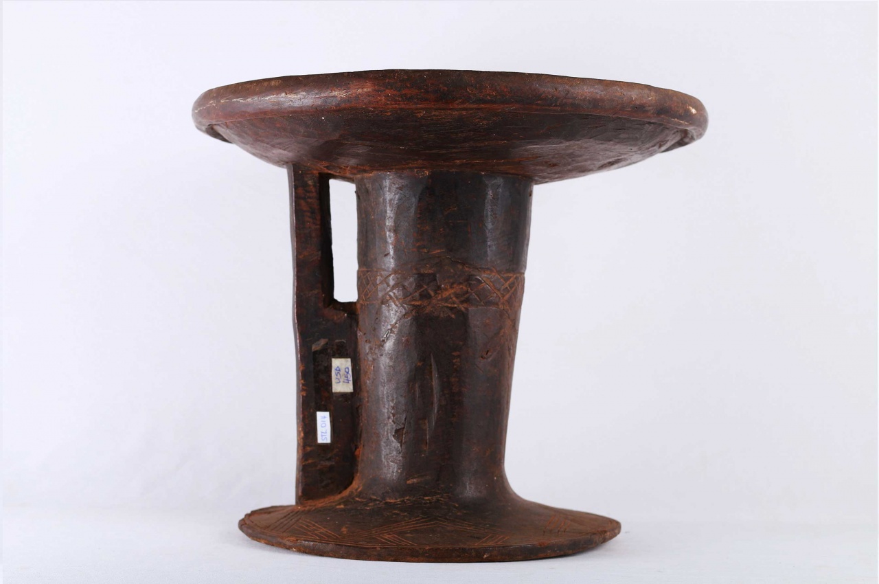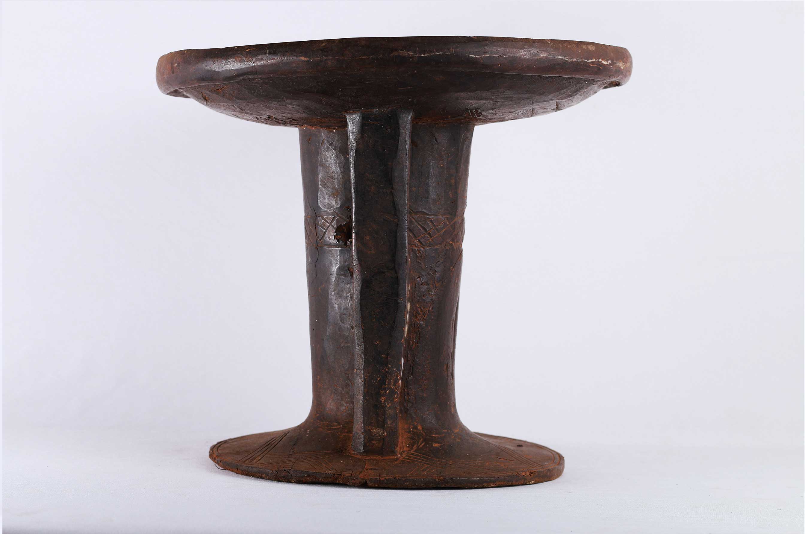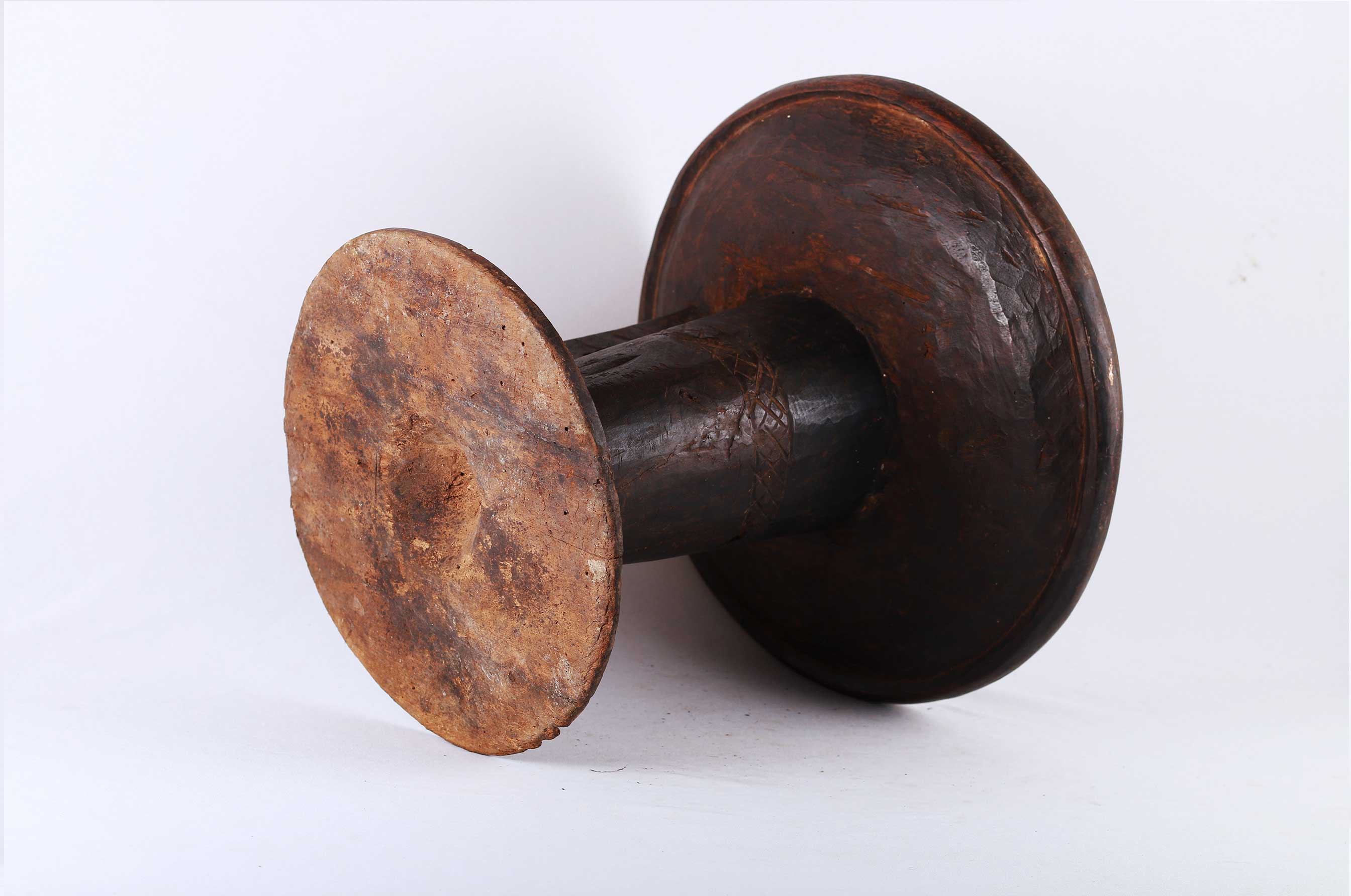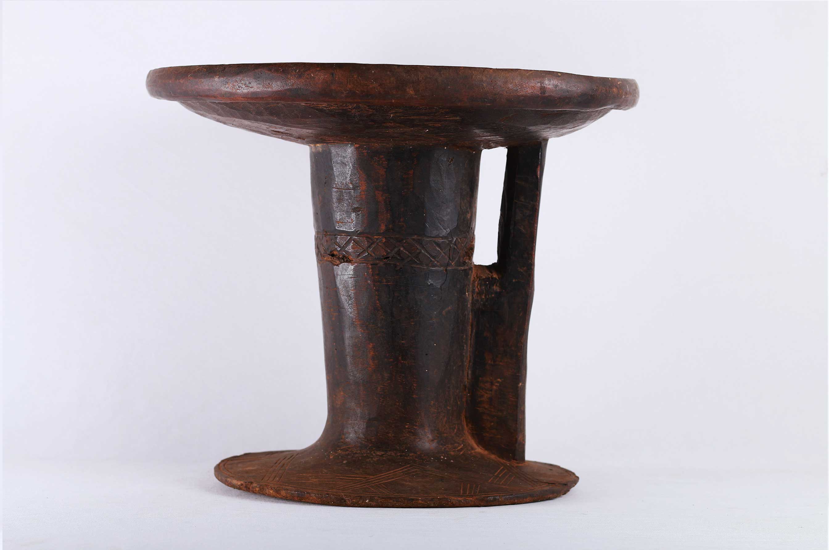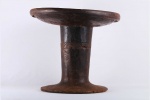 The Mangbetu peoples are located in the northeastern Democratic Republic of Congo. The major subgroups are the Mangbetu, Meegye, Makere, Malele, Popoi and Abelu. These stools were part of family treasures, which would be passed down from generation to and were used for ceremonies and rituals. They were also are token of leadership and, as it was not permitted to lay sacred objects on the ground, they were always placed on a stool. This stool is in good condition, though worn with age, and has evidence overall of old worm wear to the surfaces.