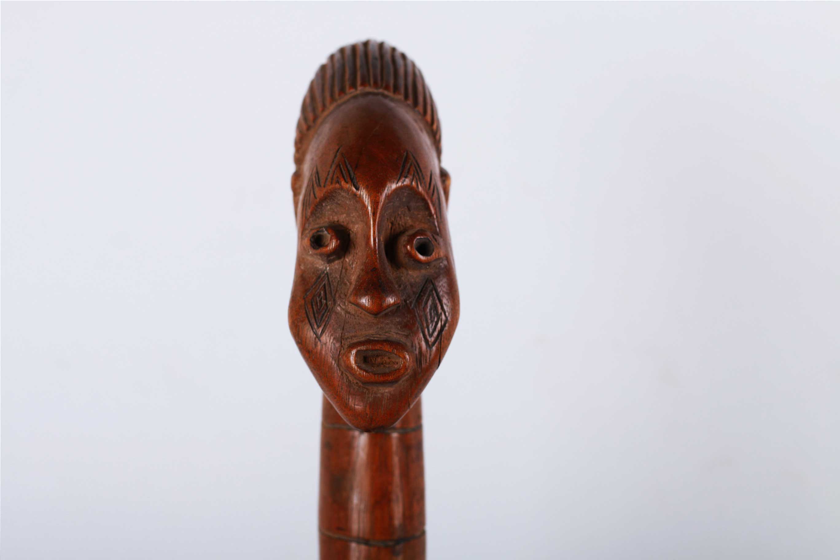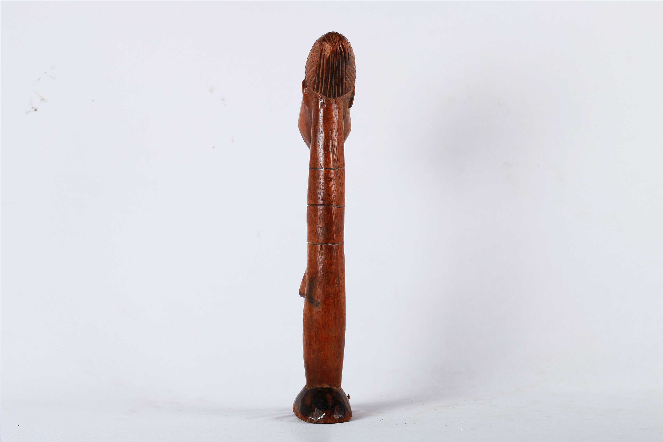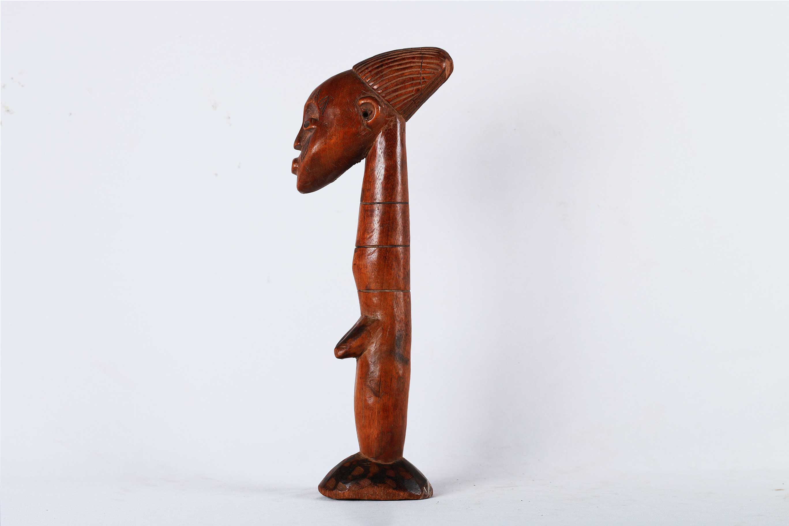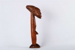 The Mangbetu are people living in the north-eastern part of the Democratic Republic of Congo. Most Mangbetu art was reserved for ruling class say kings and chiefs who wanted to show off their power and wealth, they were secular in nature. Wooden figures are believed to be ancestral portraits. This particular piece has a shiny brown patina, it is completely carved out of wood with visible signs of old age.