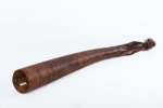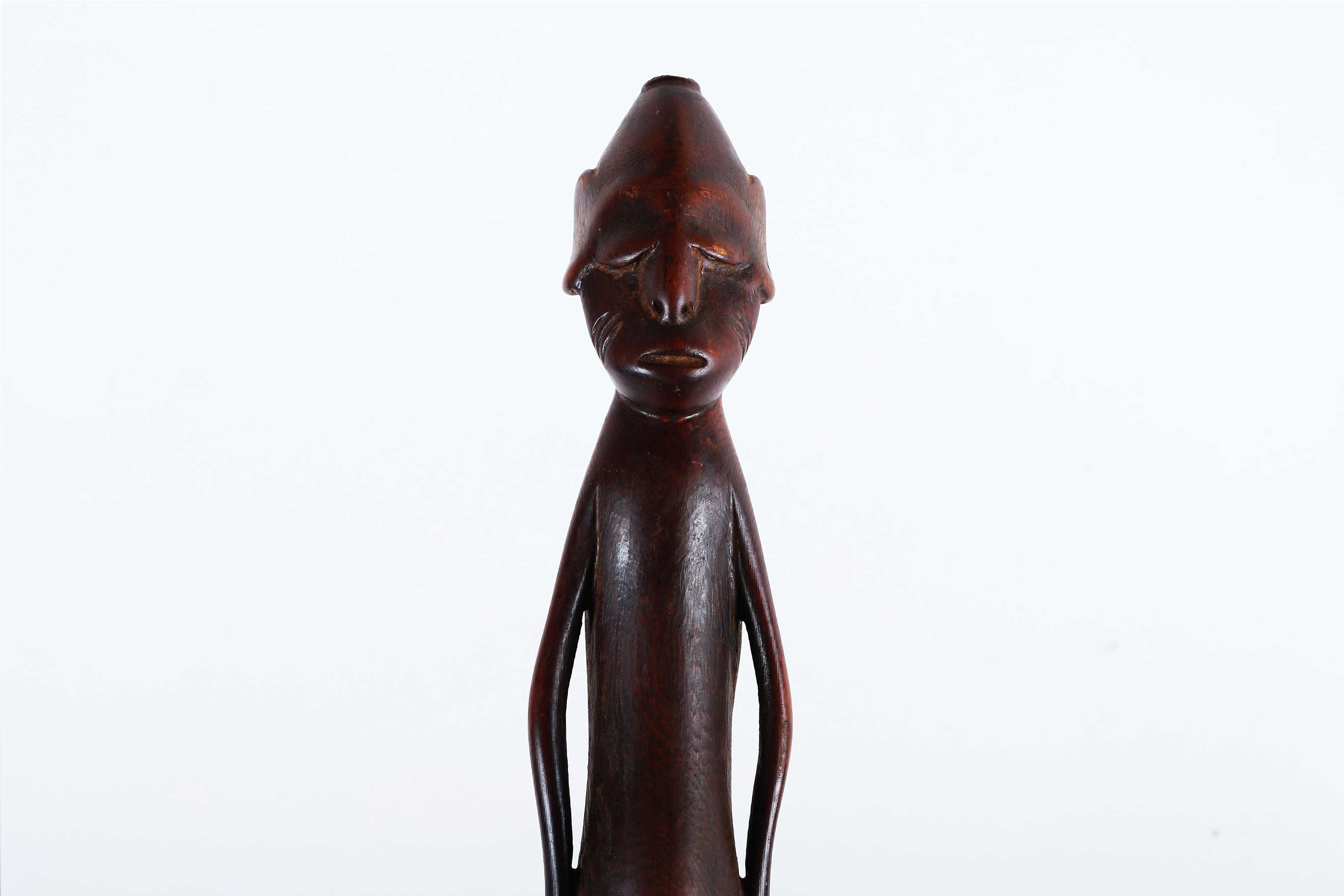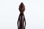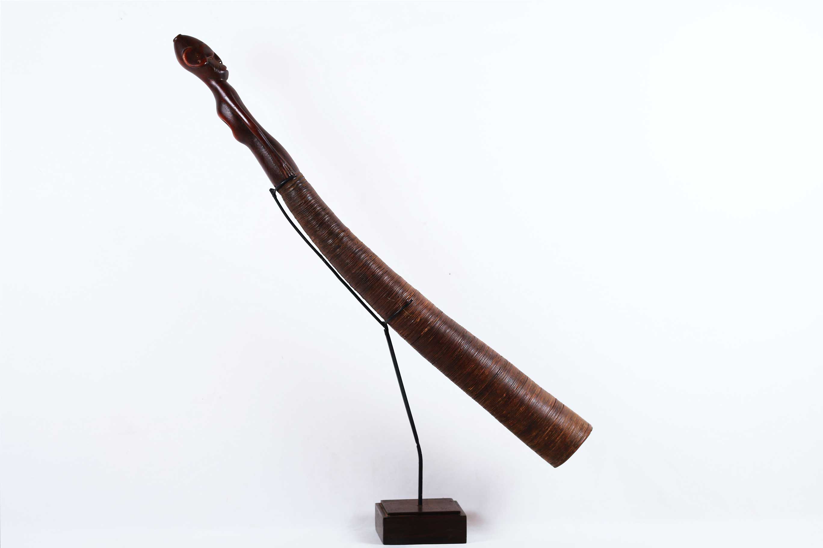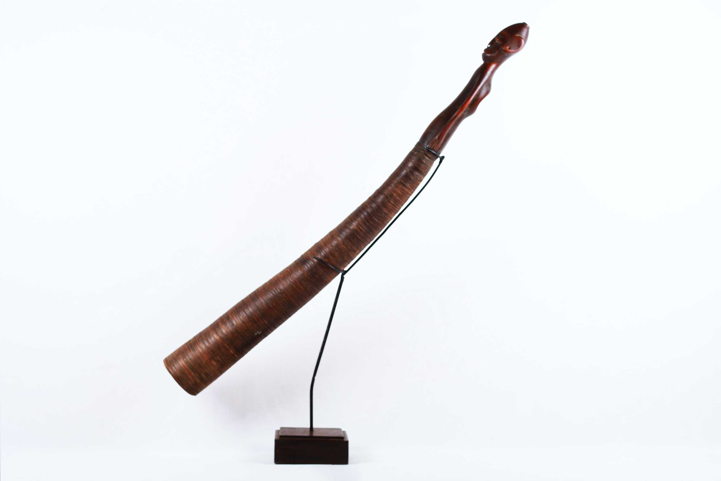 The Mangbetu are an ethnic group found in the Democratic Republic of the Congo, living in the Orientale region. Harps and trumpets t were used by court musicians and were often adorned with sculpted human heads. It is important to note that Mangbetu statues were employed in a post-contact environment and did not have any religious or magical use as they served a very specific purpose. The following sculpture has a brown patination and shows visible signs of age and use.