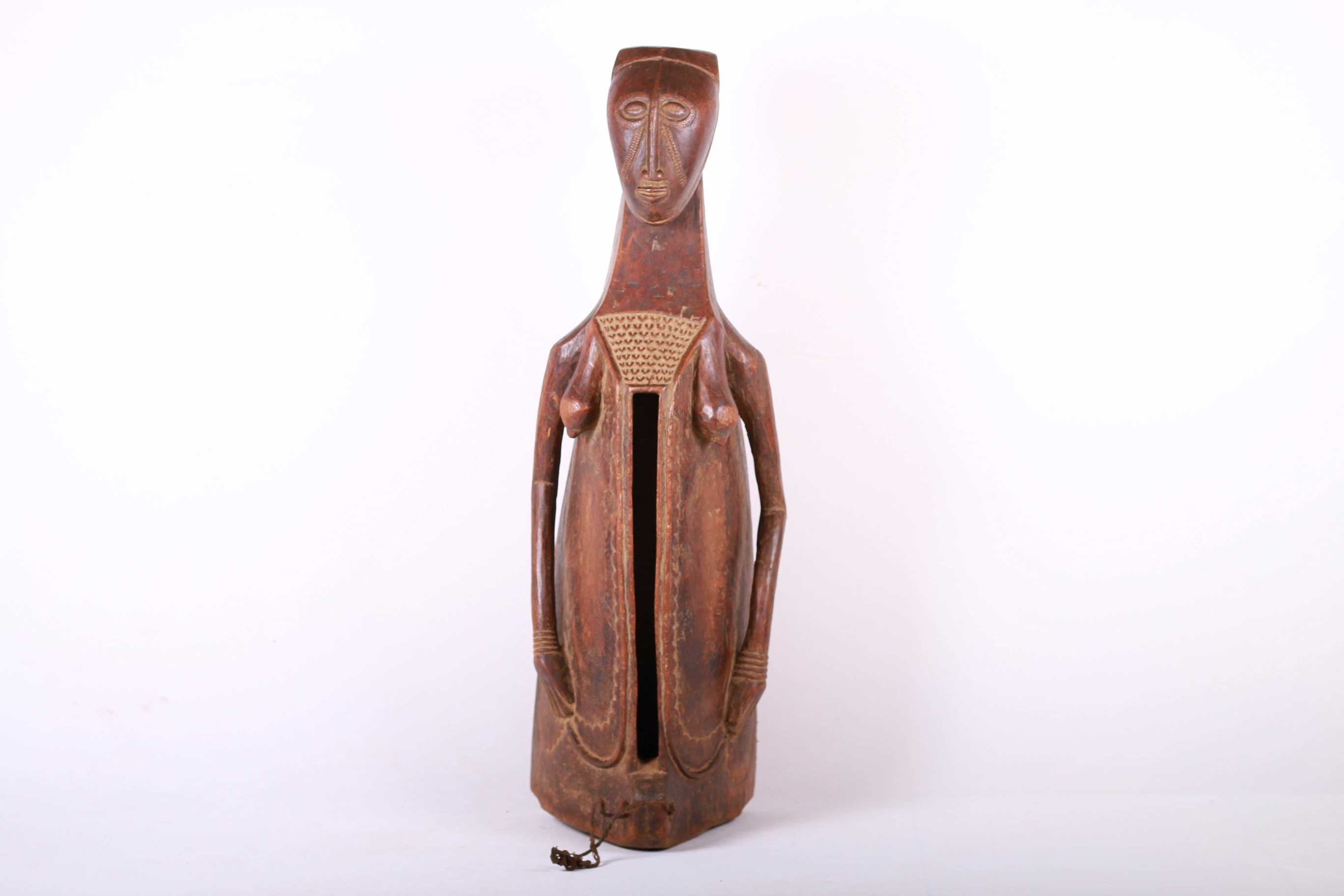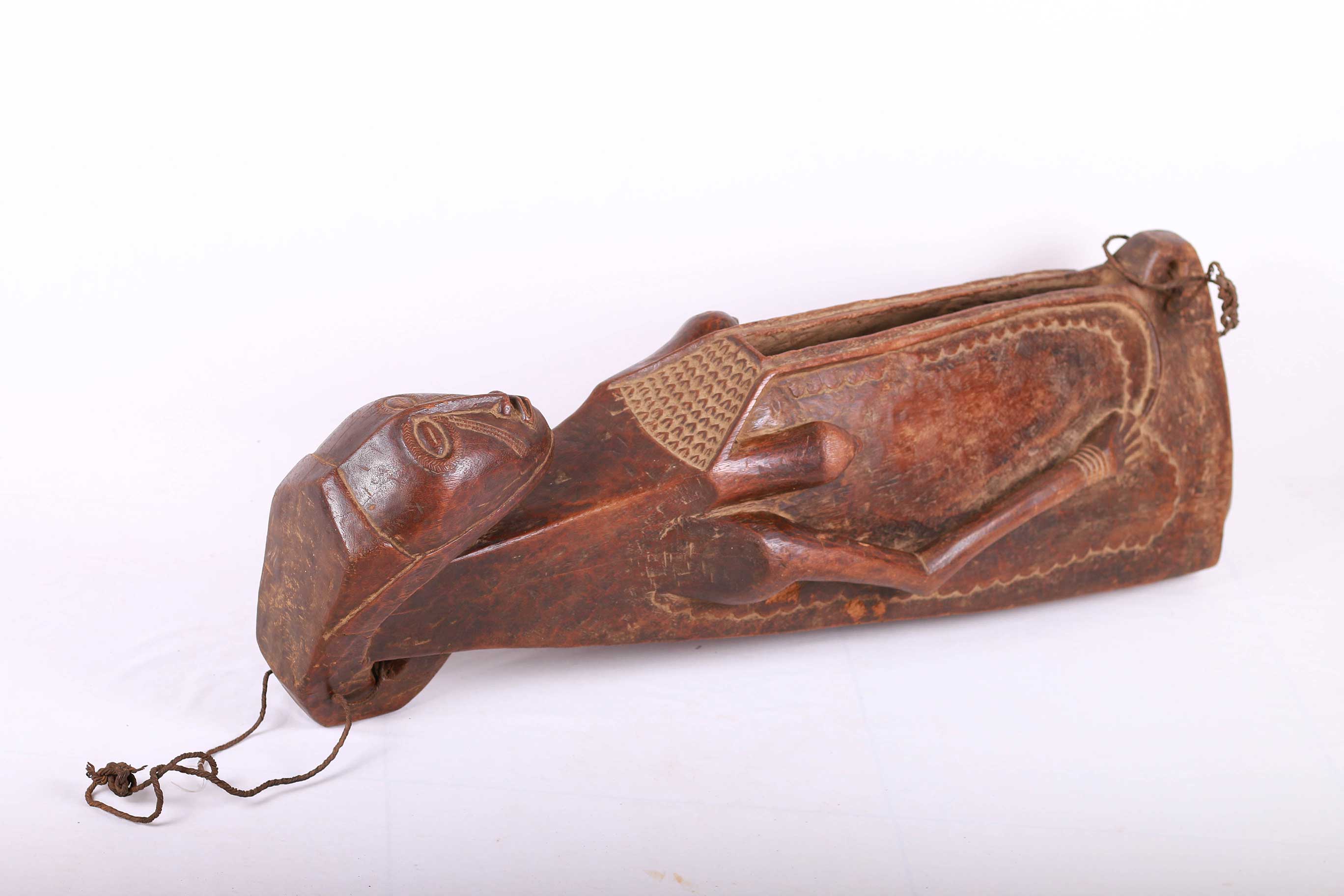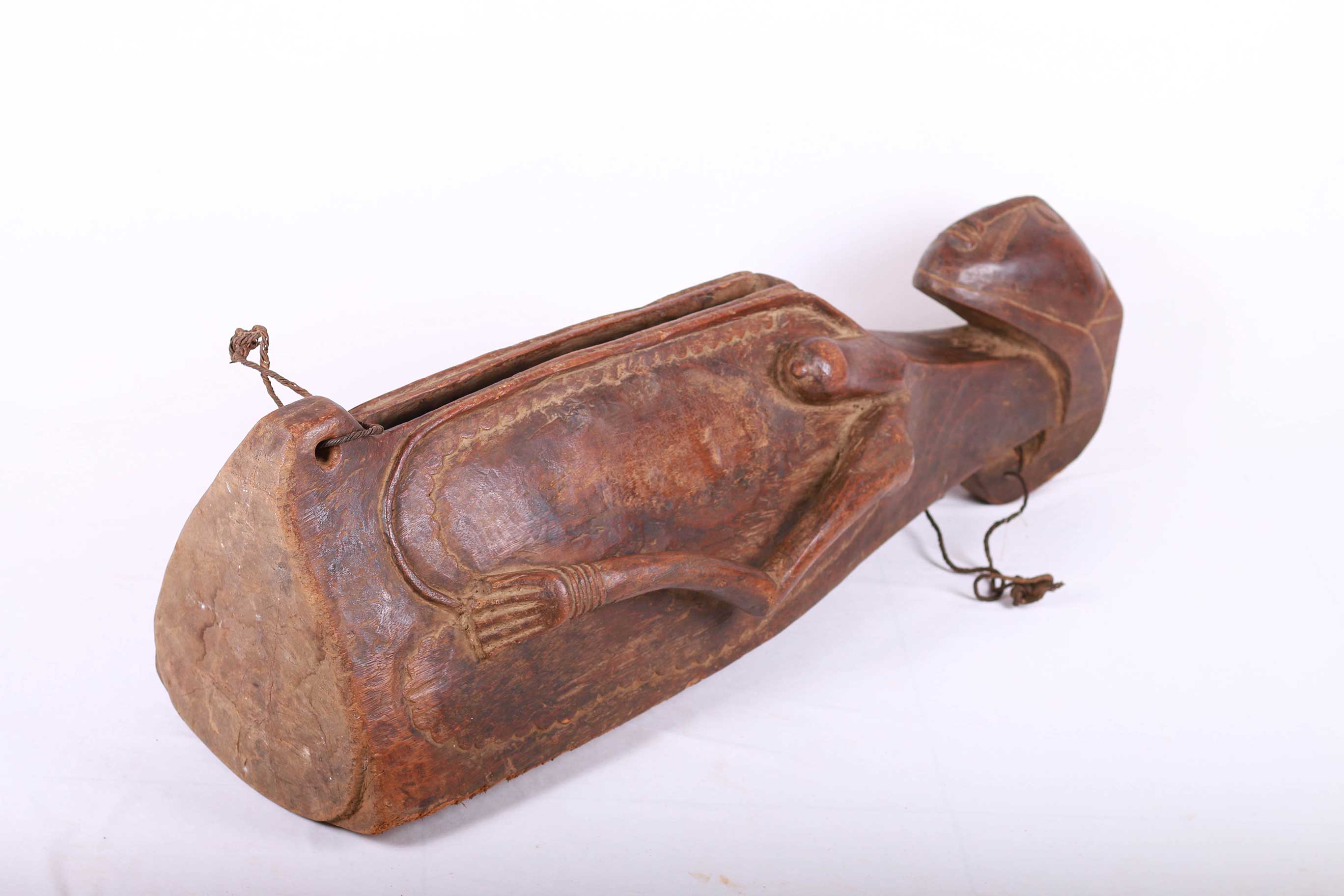 This type of slit drum is found in a large area of the Democratic Republic of Congo: Central Basin, Maniema, Kasai, Katanga, Kivu and the Kwango, and is called by several names (Lukumbi, Ikumvi). This slit drum is an idiophone drum craved from hollowed wood with a narrow groove that serves as a sound opening. The slit drum was struck with sticks on both sides of the narrow groove and it produced two different pitches. It was used as a means of communication by signalling messages among the Bantu people, it was also used as an entertainment instrument which produced deep tones and different pitches. The following drum has a brown shiny patina and shows visible signs of age and usage.