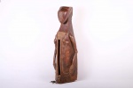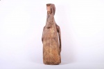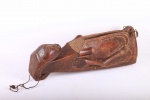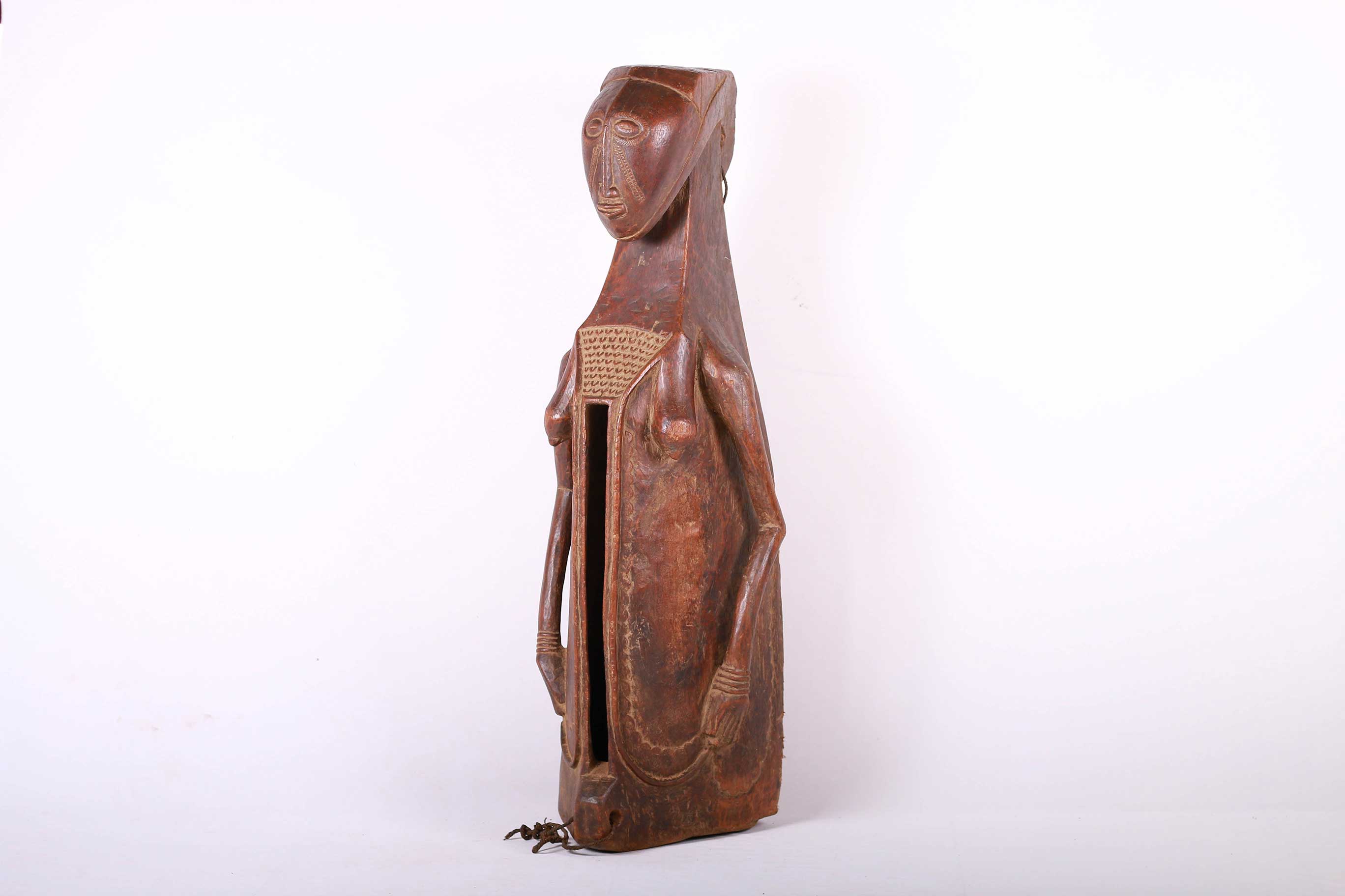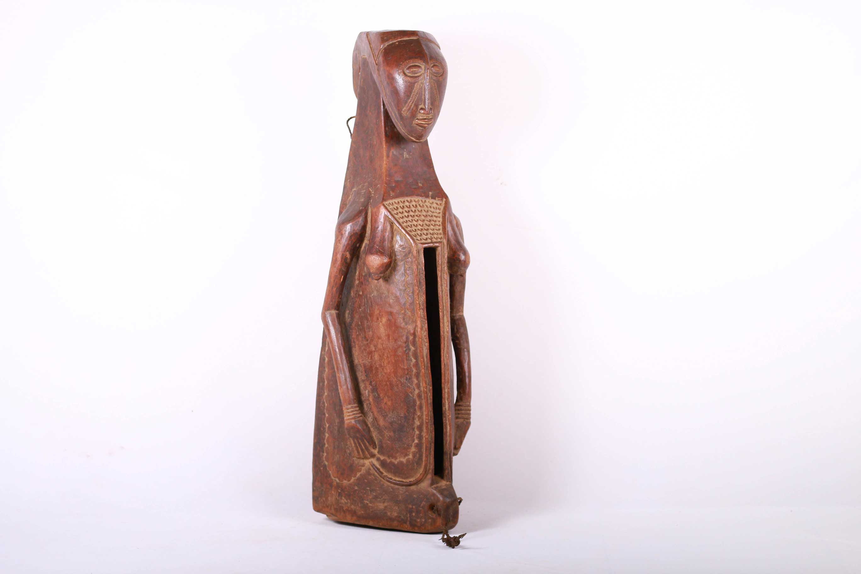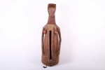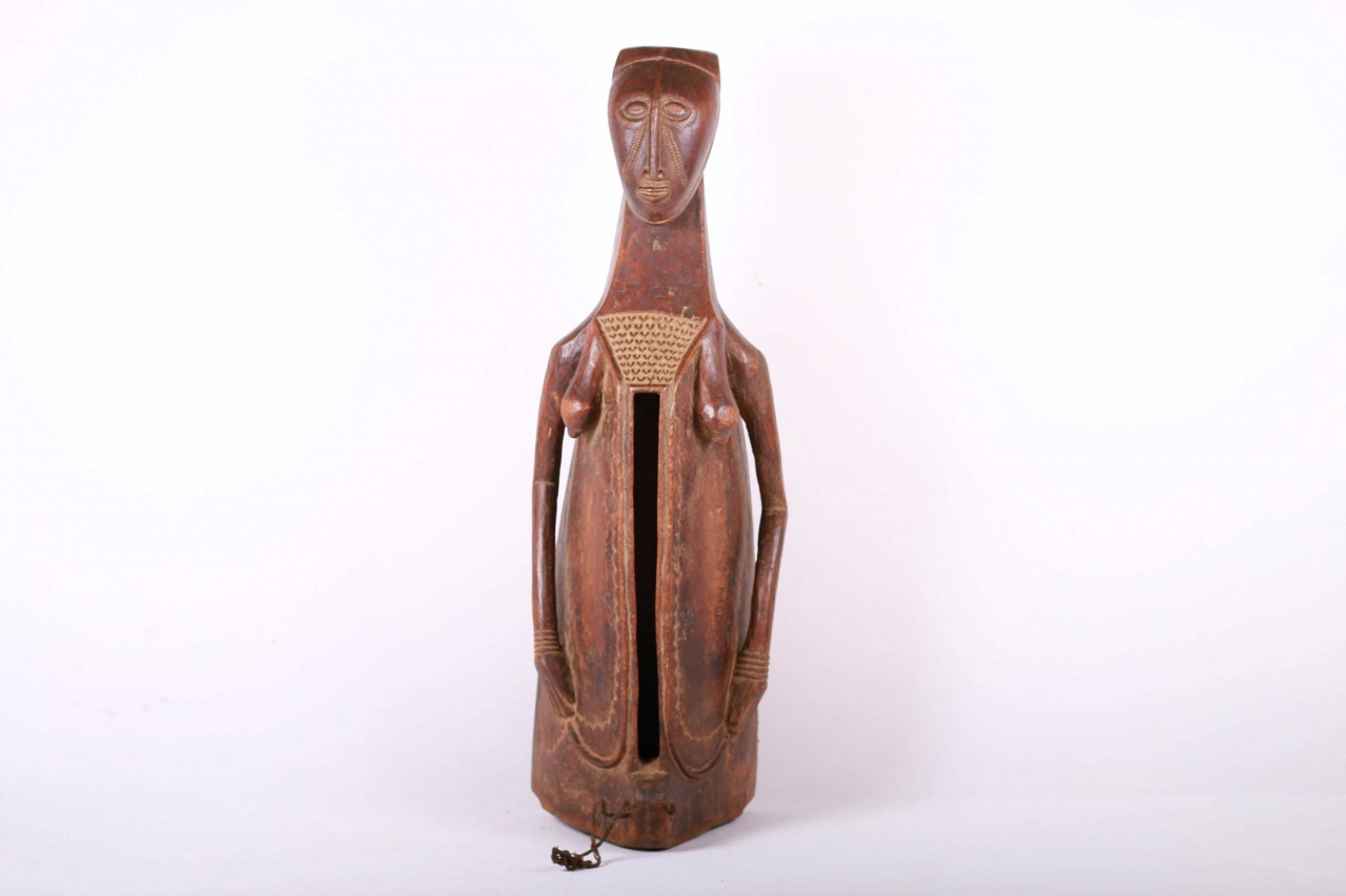 This type of slit drum is found in a large area of the Democratic Republic of Congo: Central Basin, Maniema, Kasai, Katanga, Kivu and the Kwango, and is called by several names (Lukumbi, Ikumvi). This slit drum is an idiophone drum craved from hollowed wood with a narrow groove that serves as a sound opening. The slit drum was struck with sticks on both sides of the narrow groove and it produced two different pitches. It was used as a means of communication by signalling messages among the Bantu people, it was also used as an entertainment instrument which produced deep tones and different pitches. The following drum has a brown shiny patina and shows visible signs of age and usage.