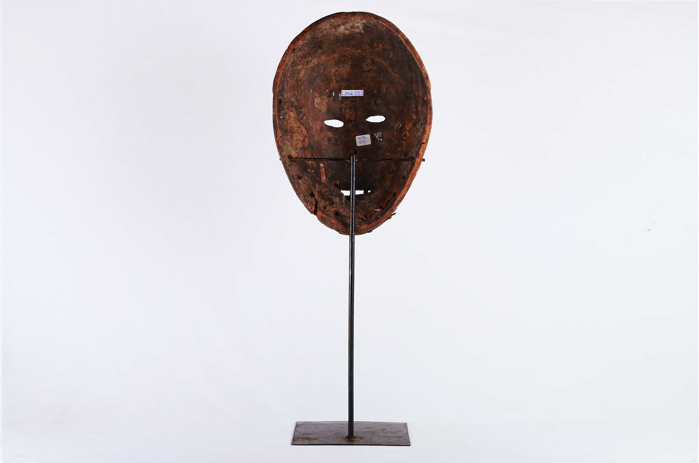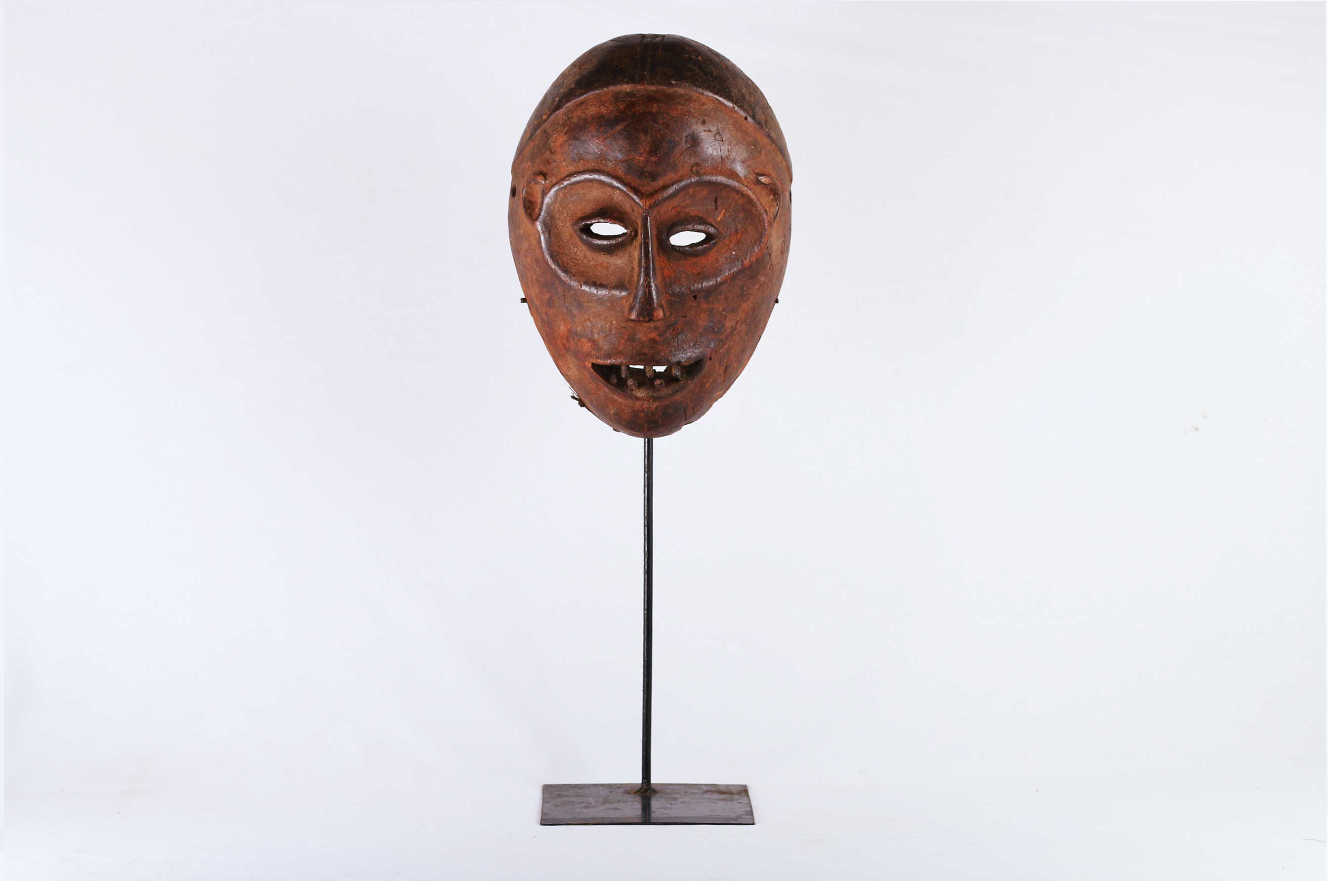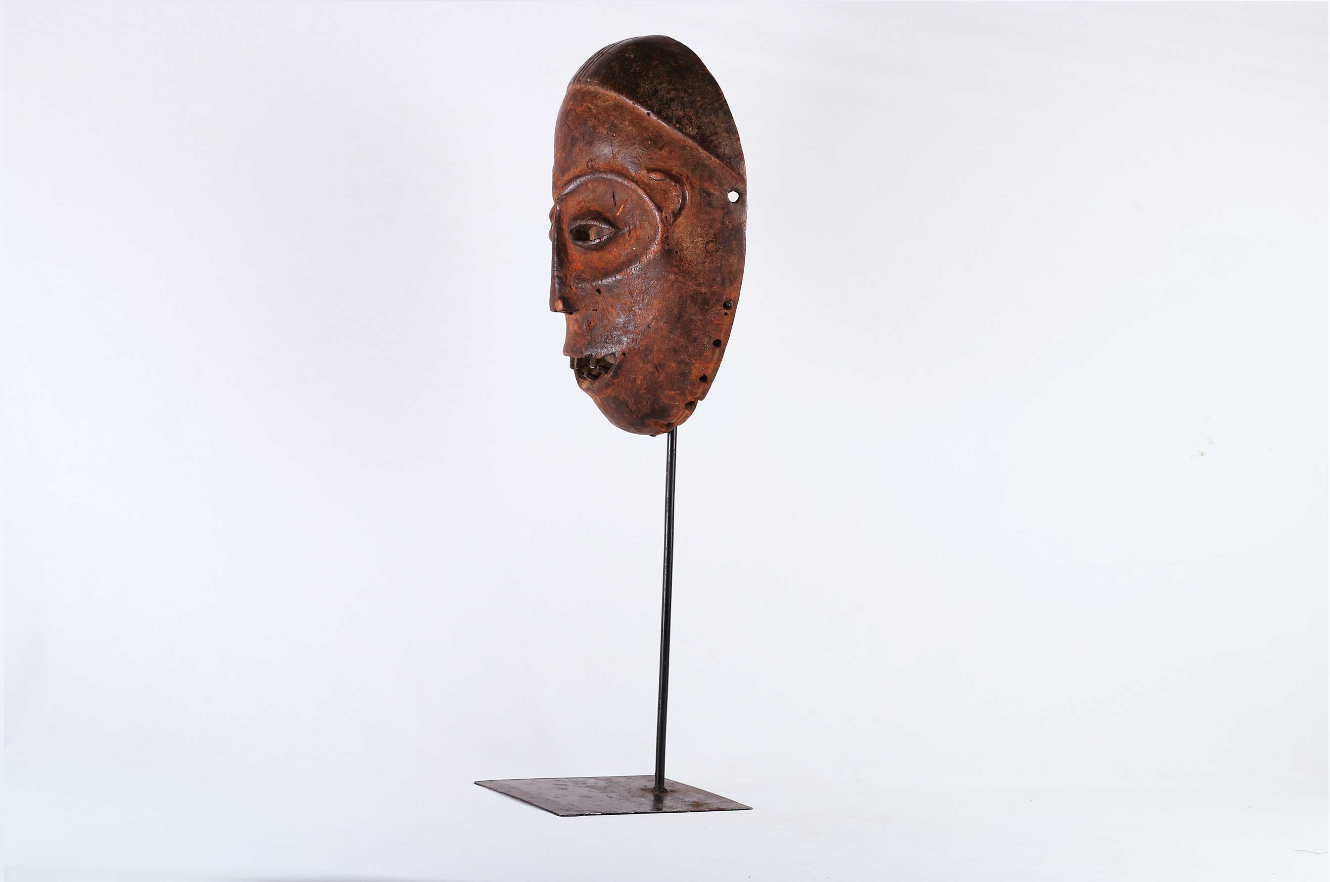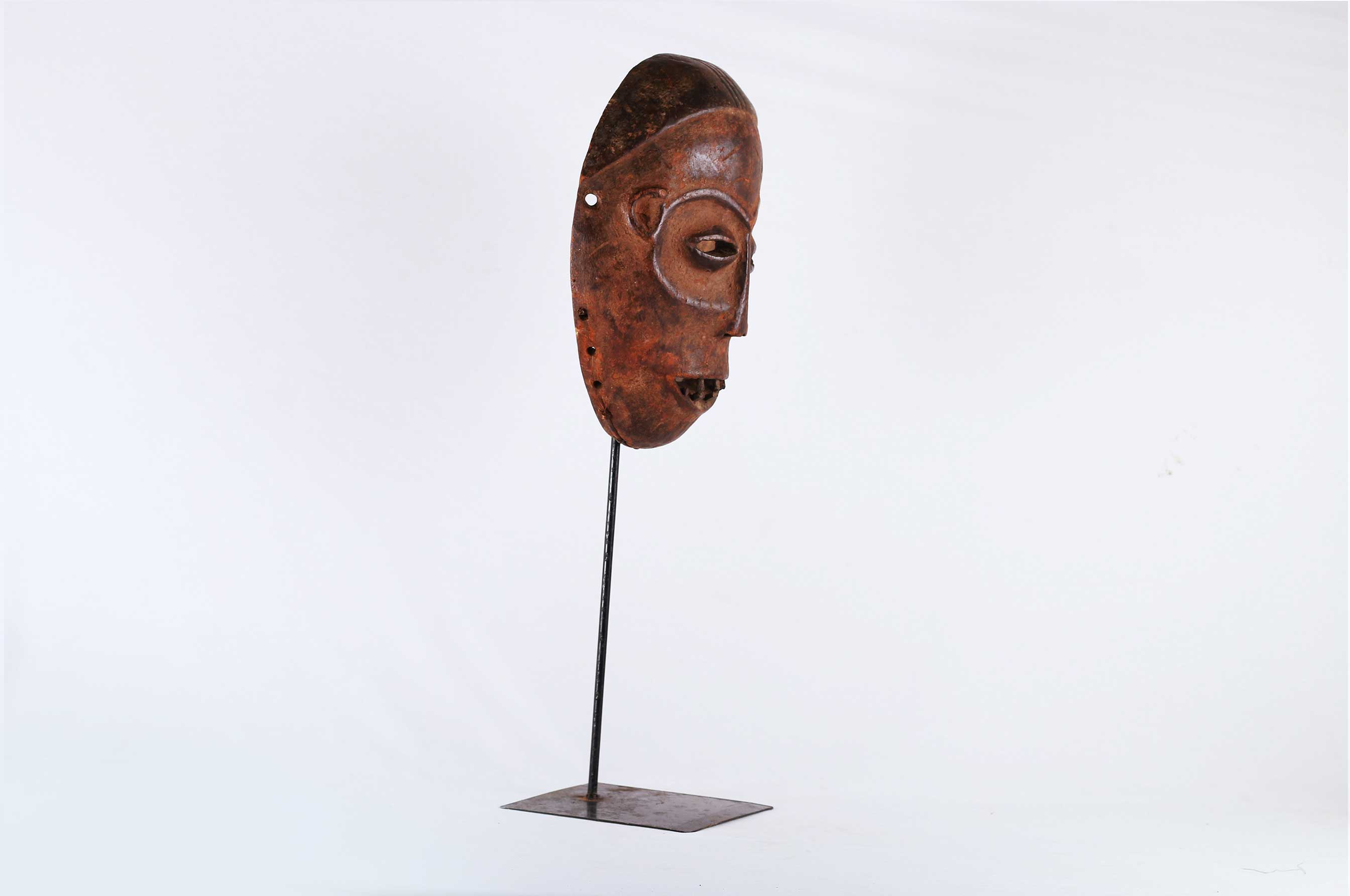 The following mask is identified with both the Ngbandi and Ngbaka from the Northwestern part of the Democratic Republic of the Congo. Masks of this area are known by the line of incisions or heavy bridge of scarification reaching from the hairline across the forehead ending more than half-way down the nose, as seen on this mask. Though both groups use masks they are less numerous among the Ngbandi than among the Ngbaka where masks are known as Dagara and are used during initiation ceremonies known as Ganza or Gaza for young men and when boys are circumcised. Their masks are also used for agricultural ceremonies. The following mask is made from light wood and looks visibly old.