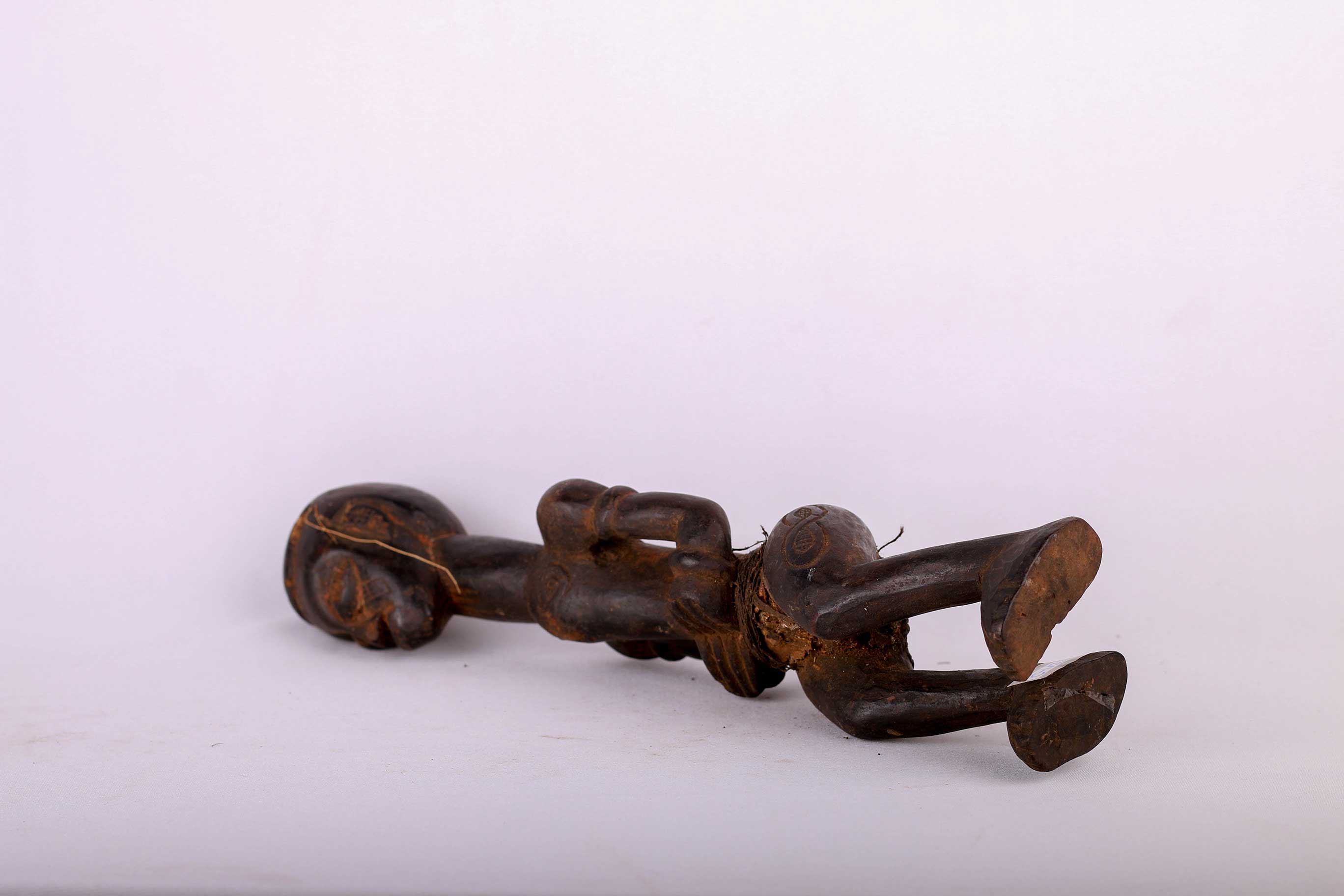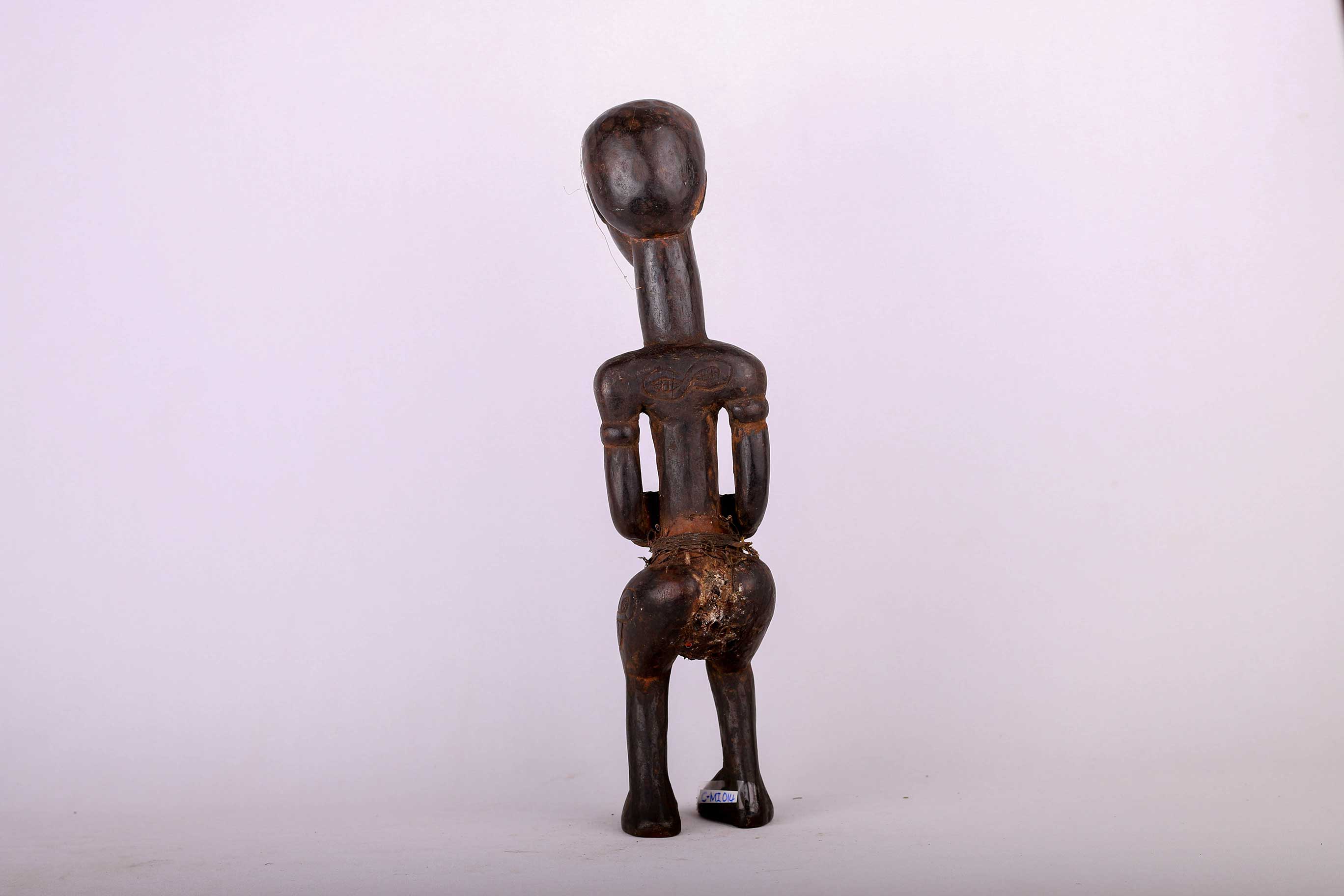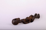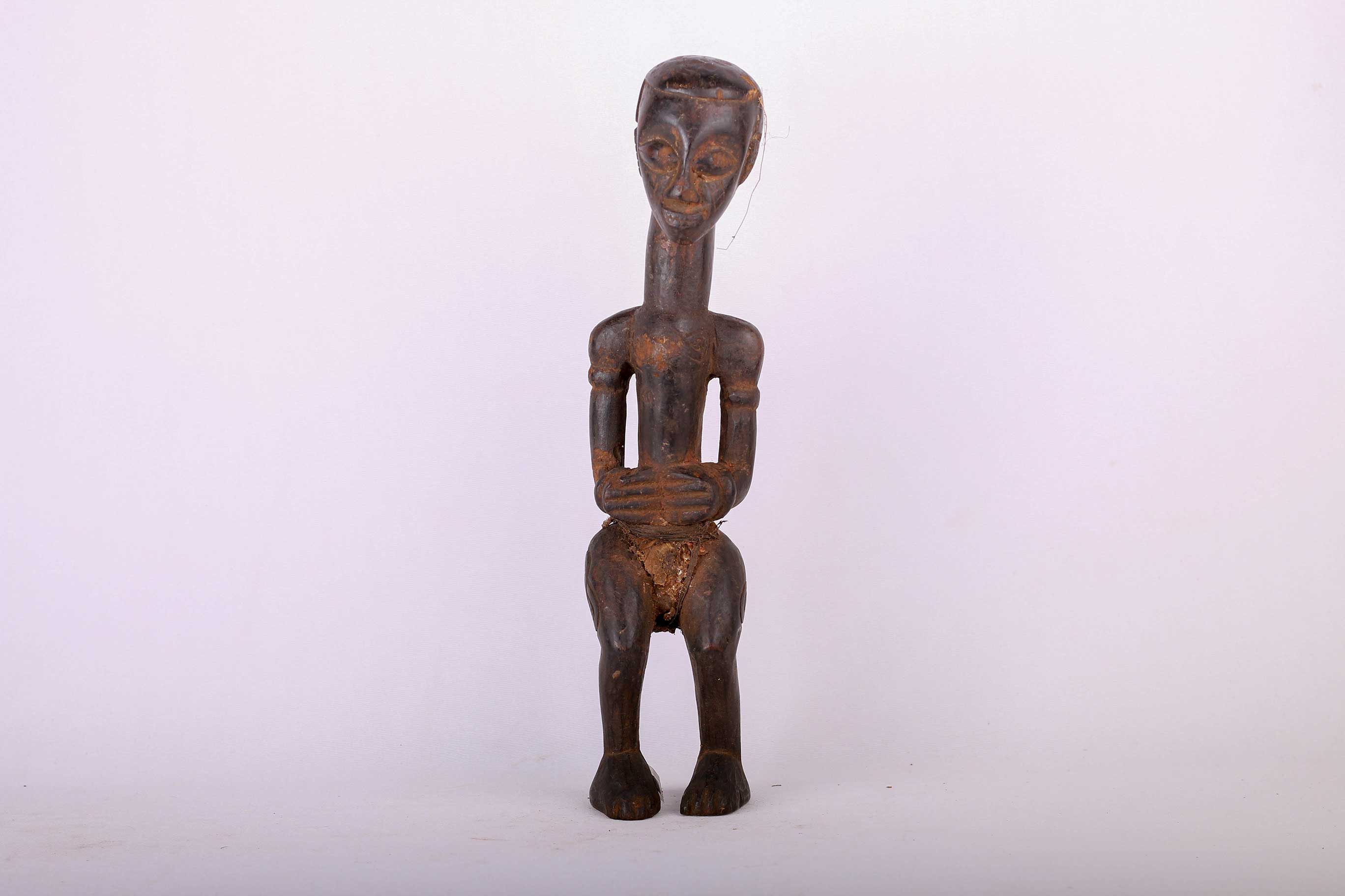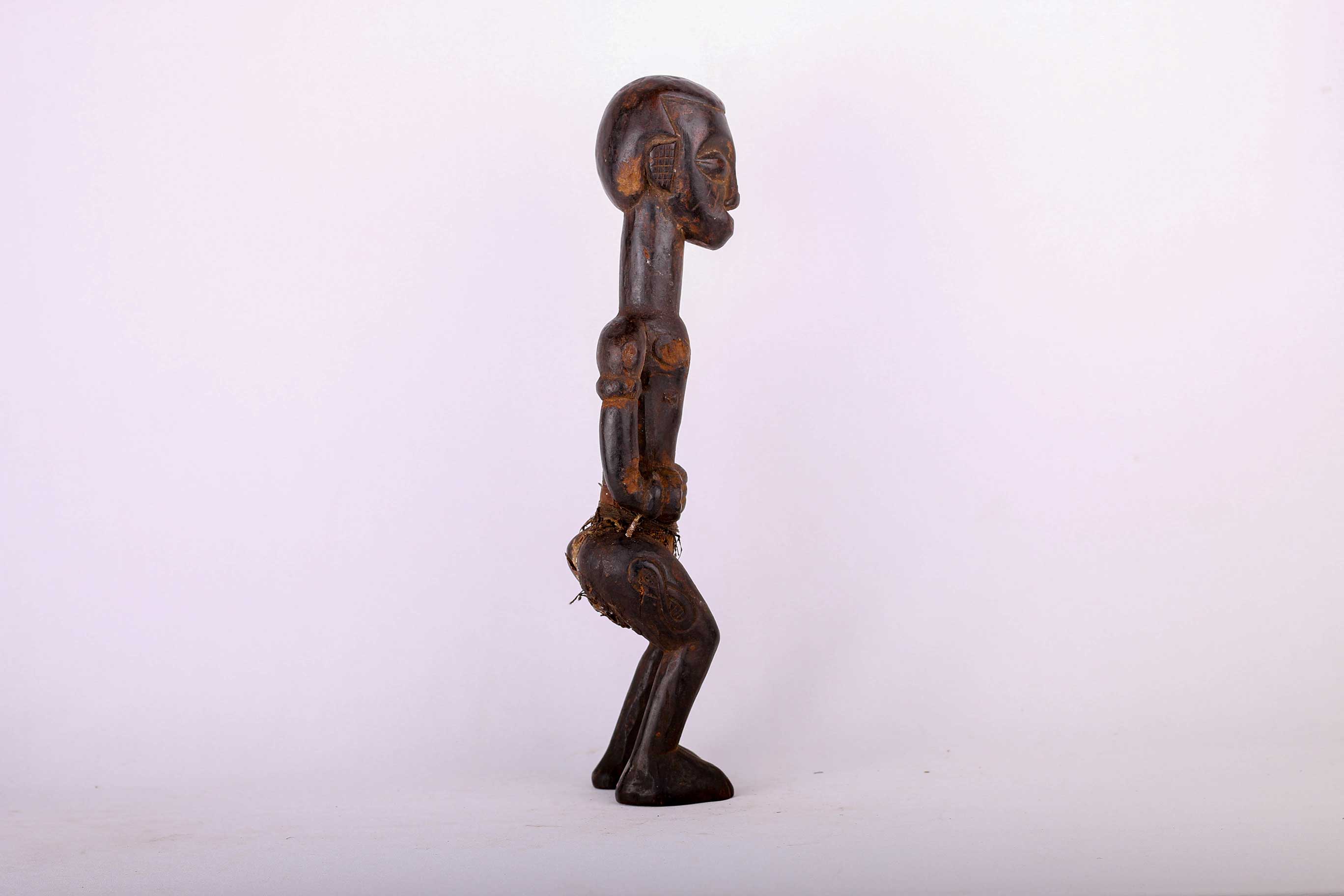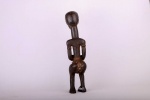 This is a miniature Kasai figure from Congo and it shows great signs of age and usage. The Ndengese is located in the North of the Kuba kingdom situated in the Democratic Republic of the Congo. The headdress on Ndegese figures represents the one placed on the king’s head during his installation and symbolizes understanding, intelligence, distinction, respect, and unity among chiefs. Numerous symbols are carved on the neck and on the elongated torso and arms in imitation of scarification patterns. The patterns on Ndengese statues simply allude to praise phrases that encode the mysteries of Ndengese chiefly authority. The following statue has a dark patina and is undoubtedly a bush collected figure.