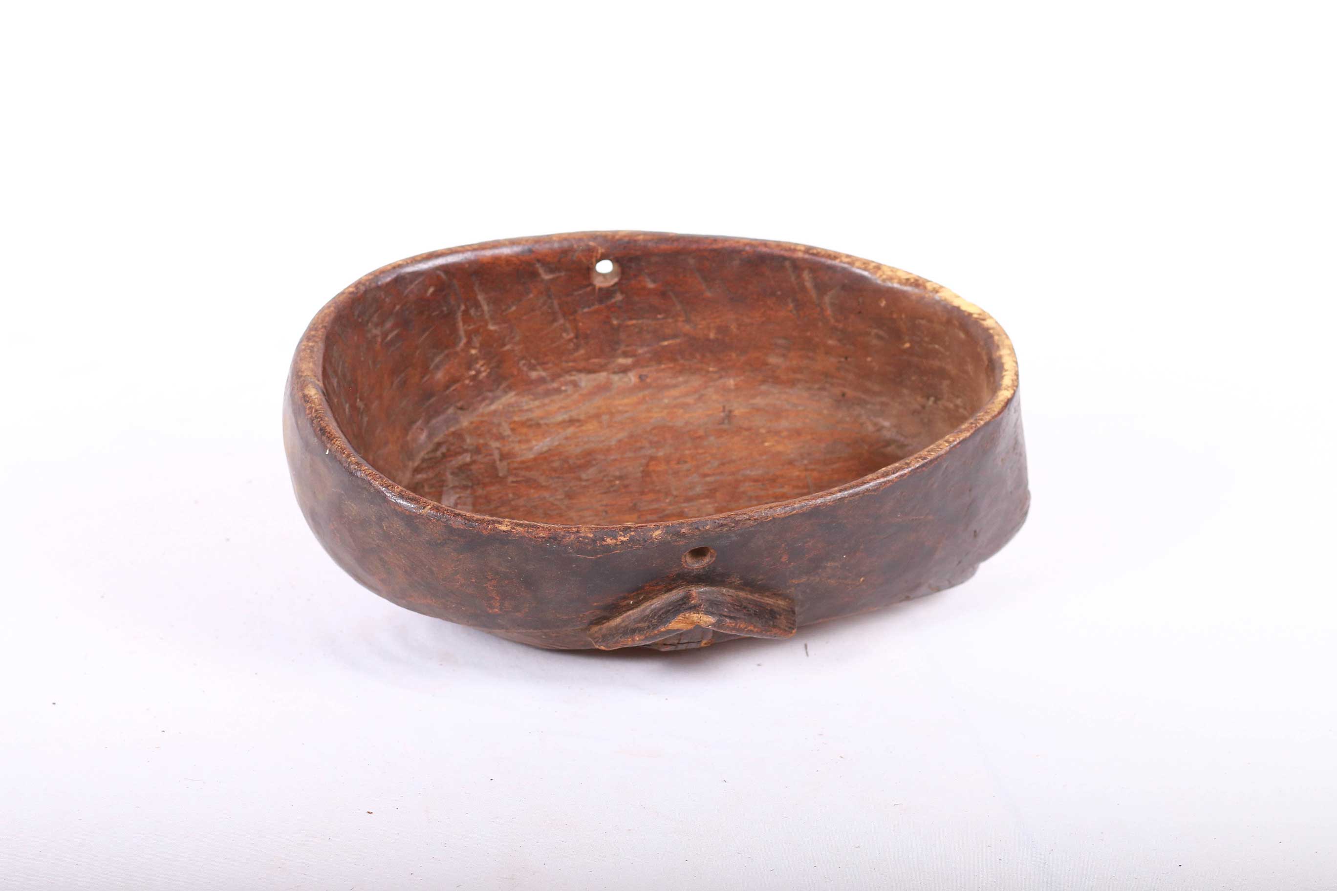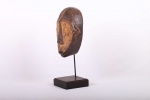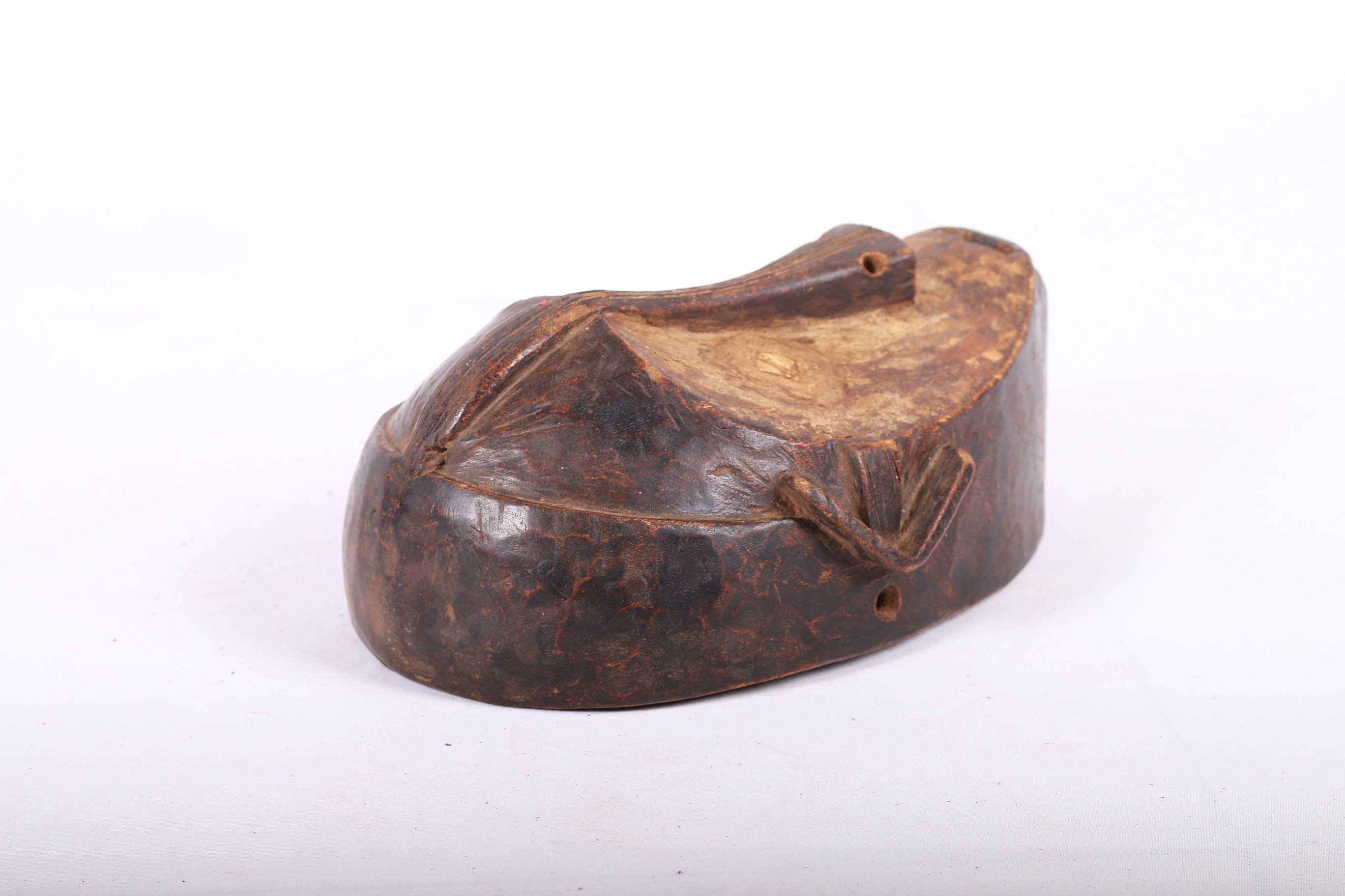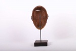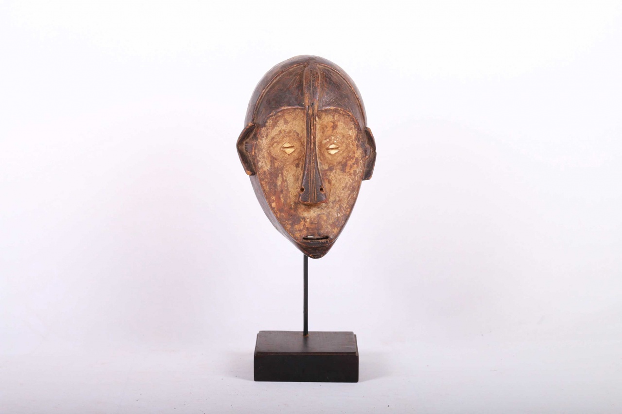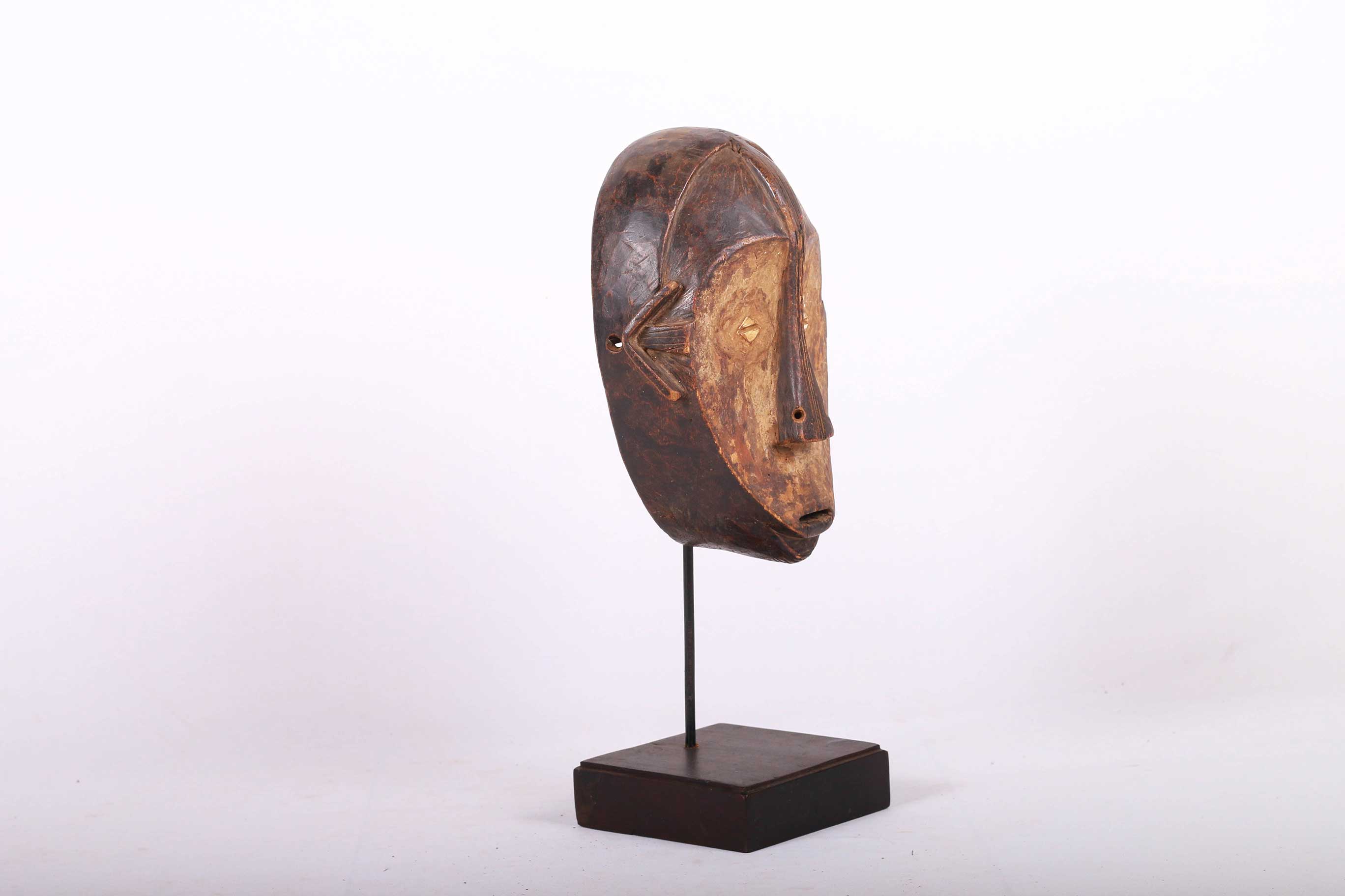 The Ngbaka are an ethnic group living on the Gemena Plateau of the northern Democratic Republic of Congo. They share cultural similarities with their neighbours, the Gbaya, Ngbandi, and Ngombe. This is a large helmet mask carved in heavy wood, massive concave facial planes, the concave heart-shaped face is covered in a layer of white kaolin and a small open mouth. It has a combined ear and cheek scarification which creates an arrow-like form with a striated shaft found on numerous masks from this region. These masks were used during initiation ceremonies known as Ganza or Gaza for young men and also during agricultural ceremonies. This is an interesting mask with a brown patina and signs of old age.
