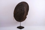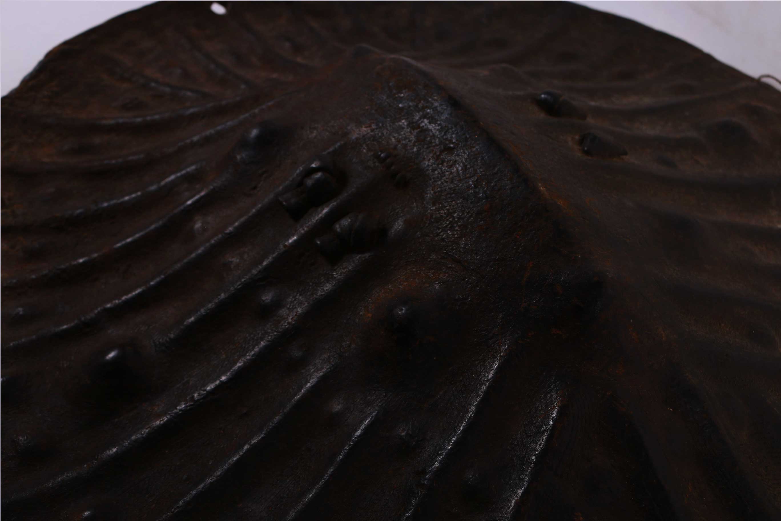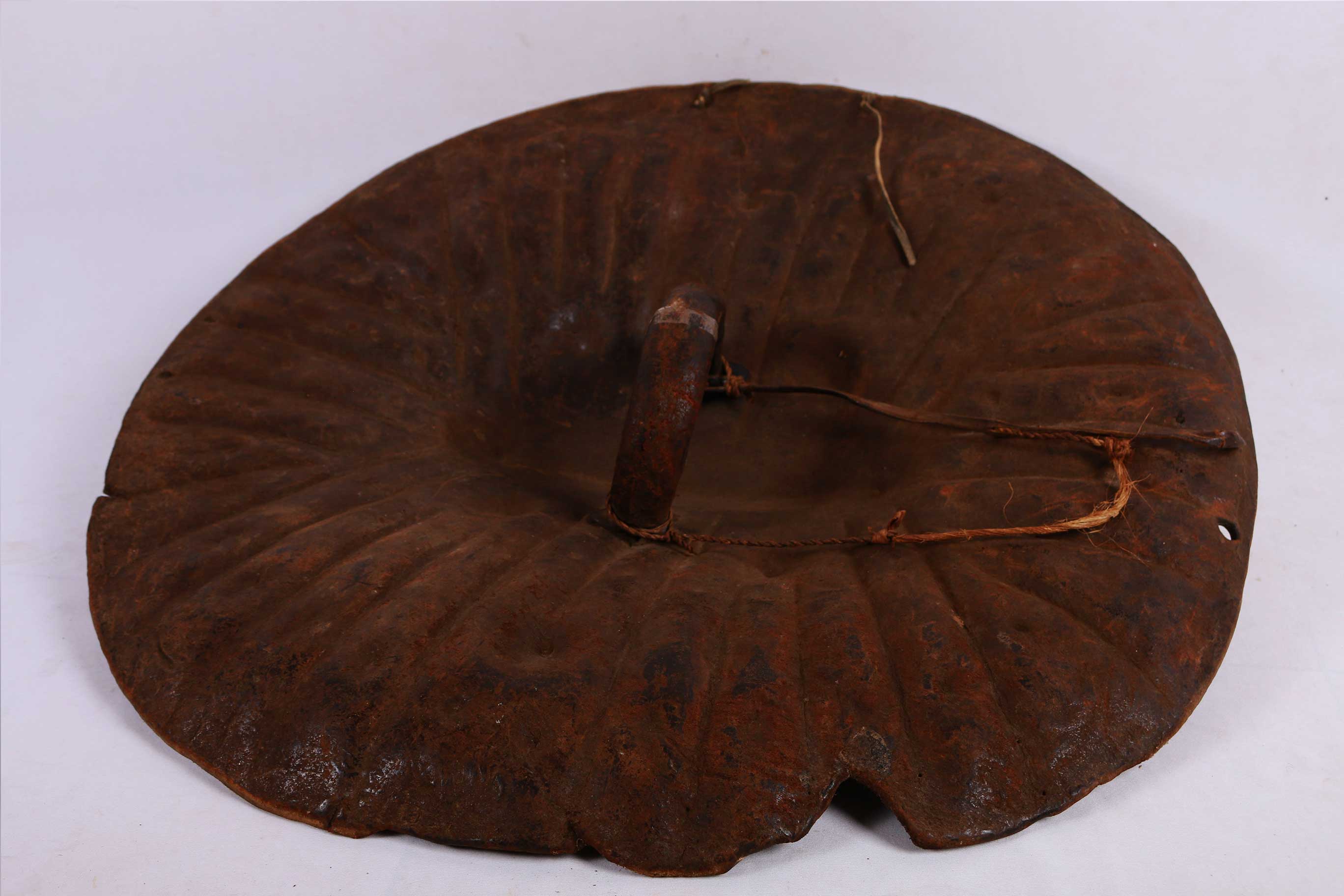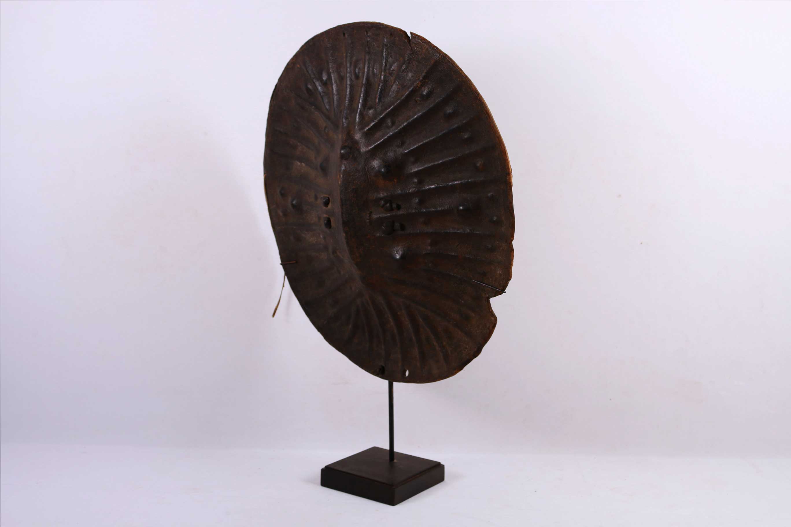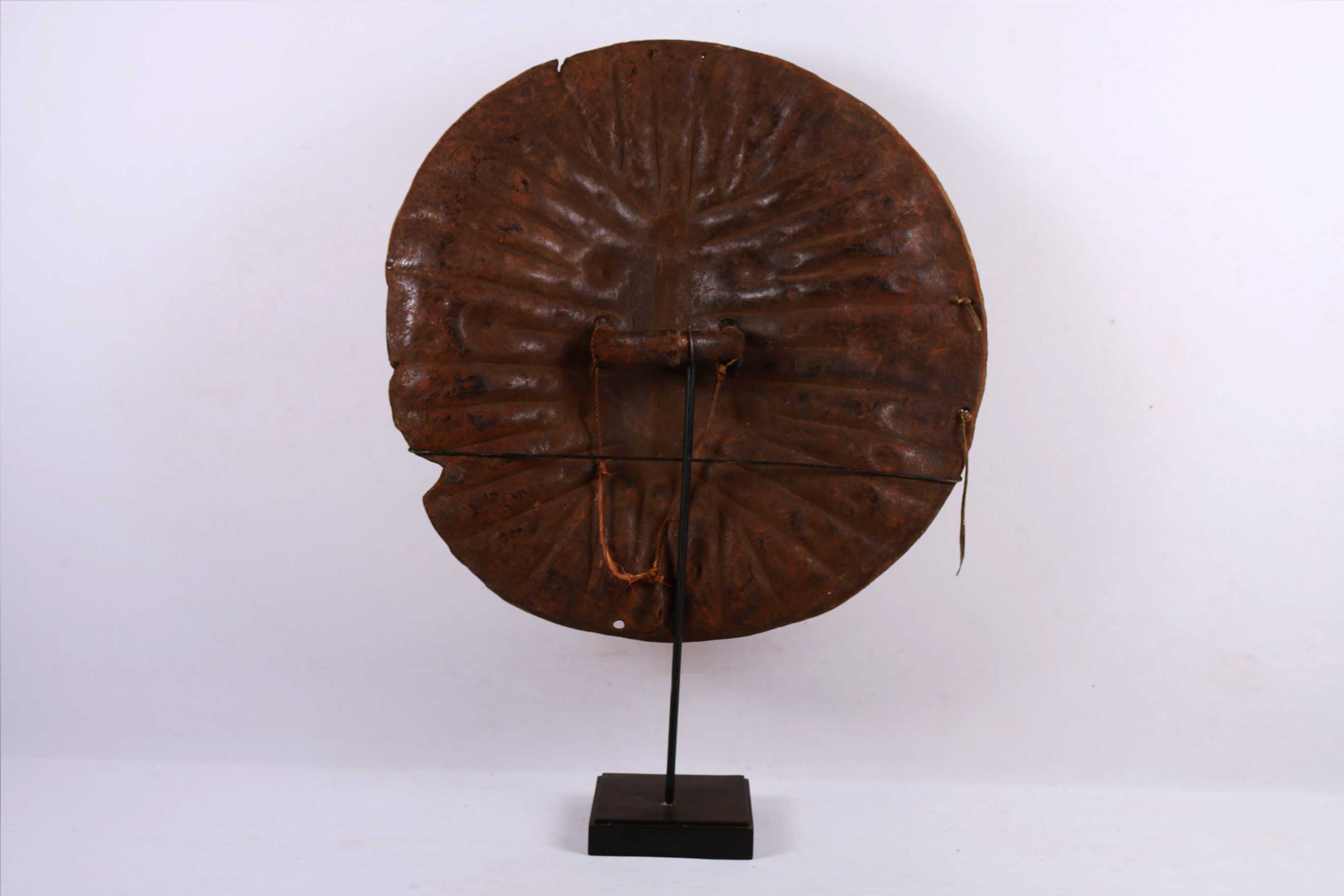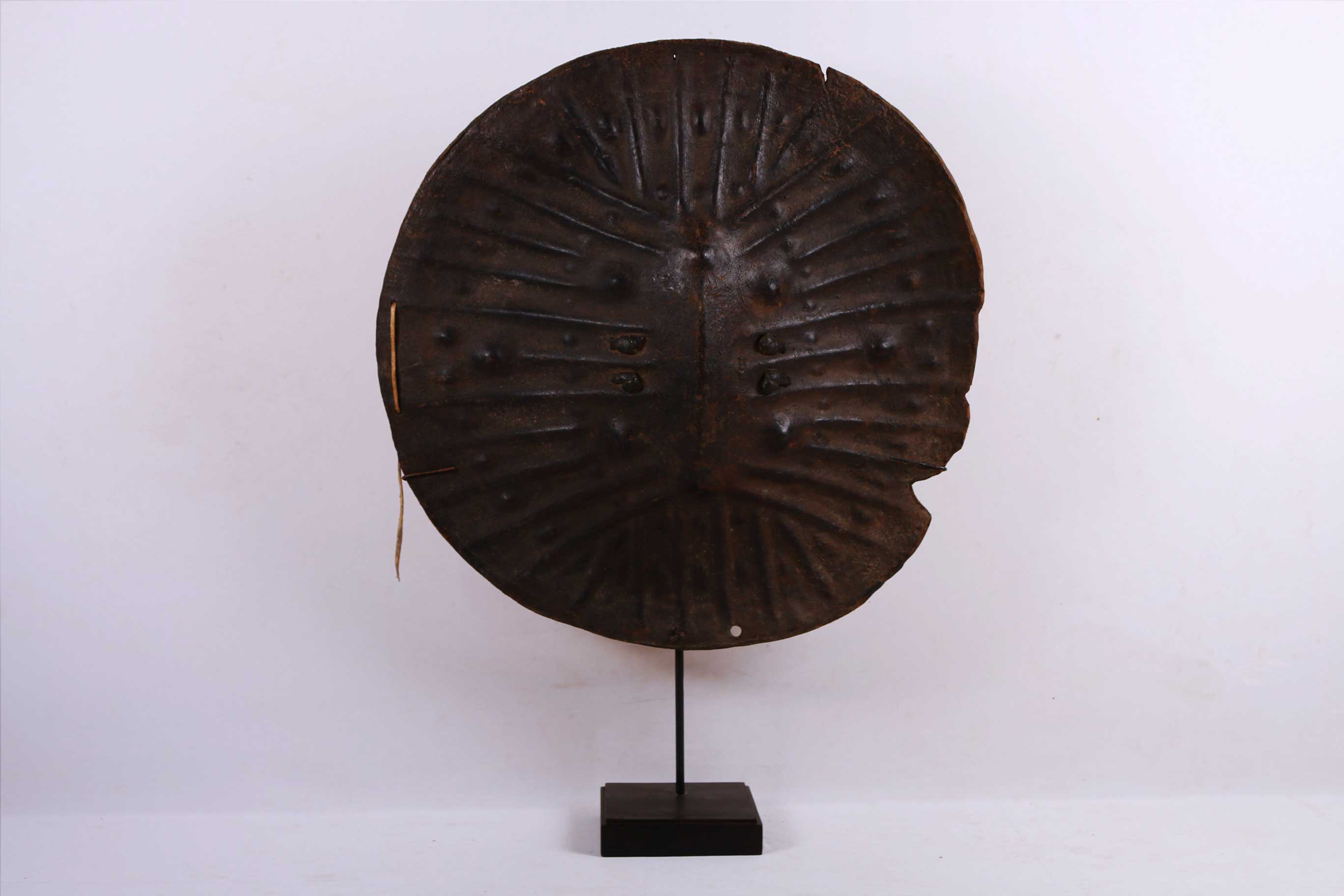 Distinctive and round, hide-covered shields have long been important insignia of manhood throughout the Horn of Africa, where they still connote the courage of warriors. In Ethiopia, shields are embellished in a variety of ways from the elaborate silver, velvet, and fur attachments of the Christian kingdom to the more subtle ridges and protrusions of the central and southern regions. This is a classic example of the kind of shield widely used by the Oromo and Sidamo peoples of southern Ethiopia. Such shields are made of buffalo hide or more rarely hippopotamus hide and are distinguished by sharp ridges radiating outward from a raised midrib and dotted protrusions forming outer and inner rings. The fringed edge of this shield adds to its visual interest.
