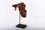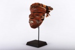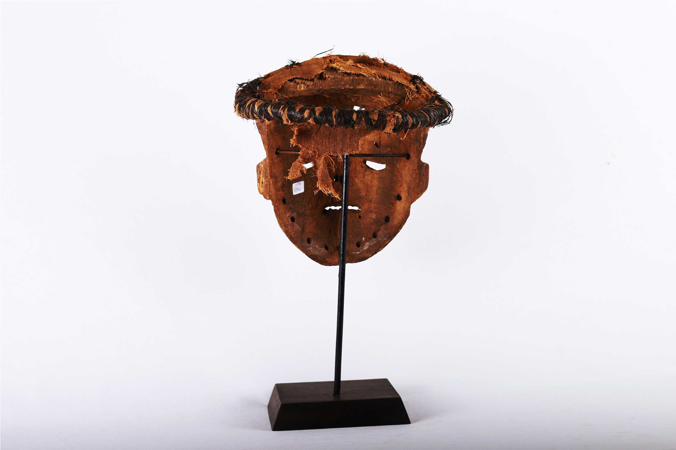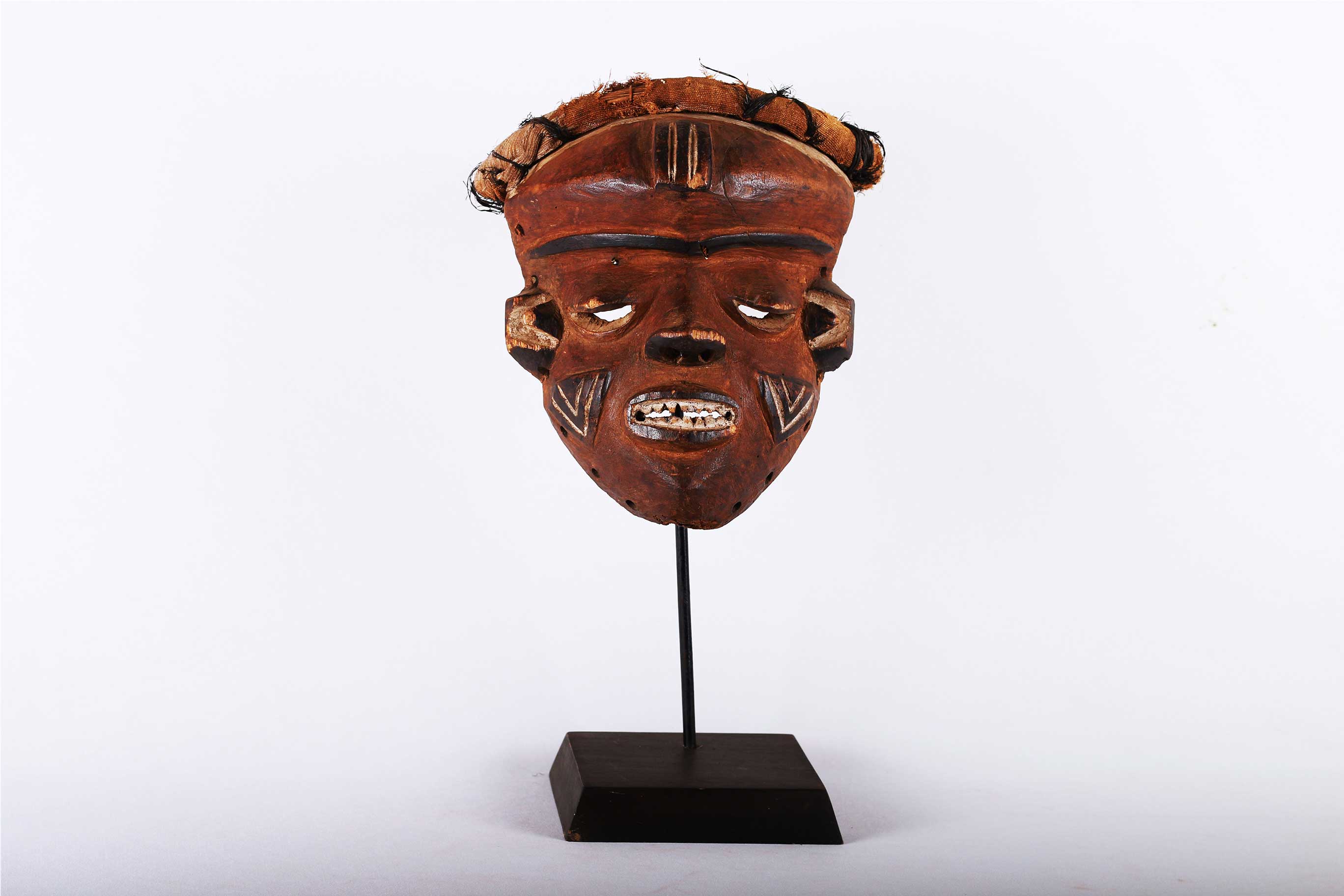The Pende also is known as the Phende people are an ethnic group in the south-western Democratic Republic of Congo. The Pende are divided into two cultural the Eastern Pende and the Western Pende, Kwilu and Kasai respectively. Pende masks are among the most dramatic works of all African art. The Pende masks appeared in ceremonies such as millet-planting and sowing celebrations, communal hunts, circumcision and initiation ritual, and the ritual of the enthronement of a chief. They were used to honour their ancestors and to thank them for their care. There are two styles: the western one of the Kwilu with its Mbuya mask characterized by a Somber, gloomy expression, and the Kasai style that is more geometric and colourful. Kasai masks are decorated with red and black triangles on a sienna background. The Minganji, or masks of power, represent the ancestors; the Mbuya, or village masks, represent human types, such as the chief, the diviner, the epileptic with a twisted mouth, the madman or man in a trance, the widow, the lover, or the executioner. It has a red patina and is worn out with age but still in good condition.
