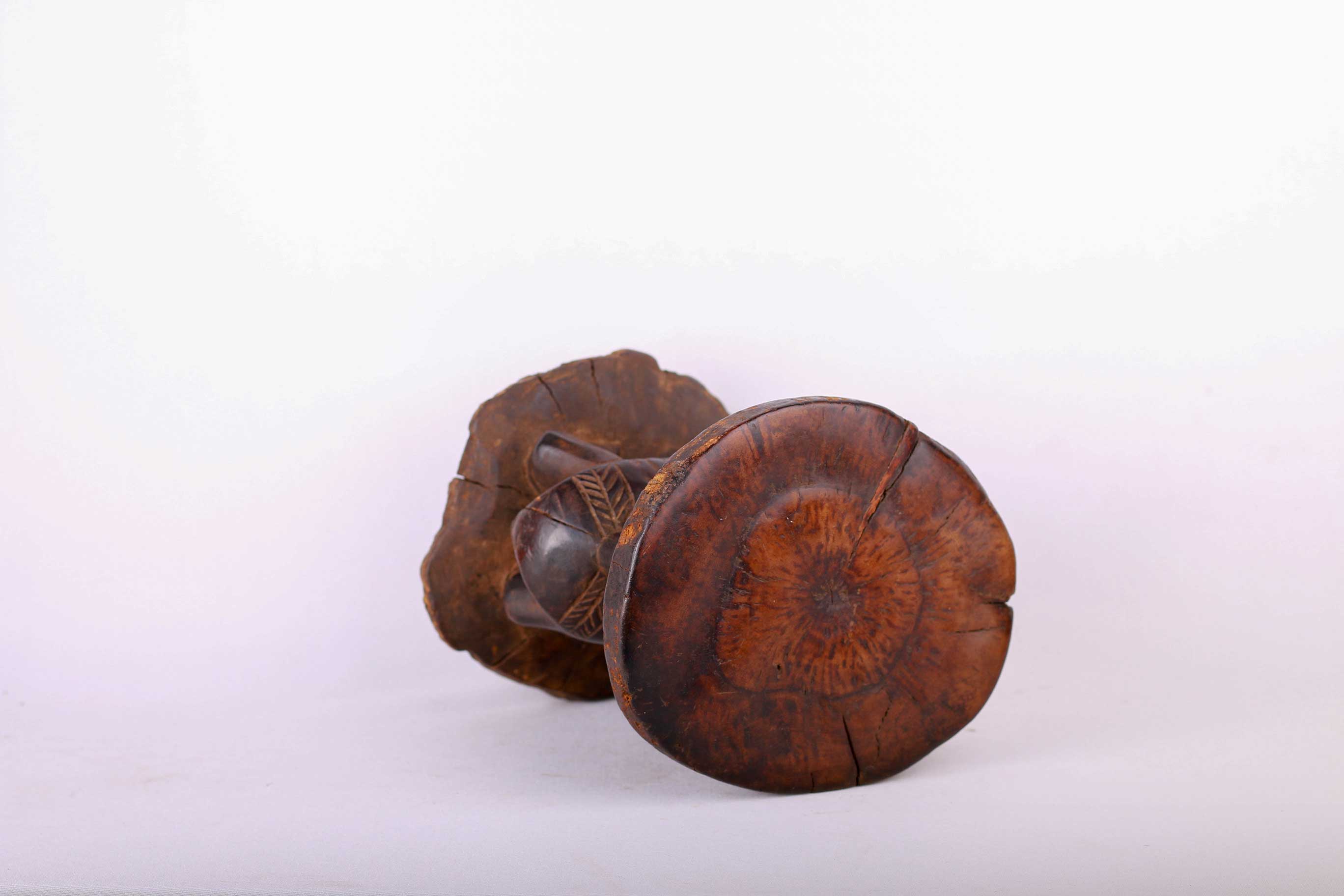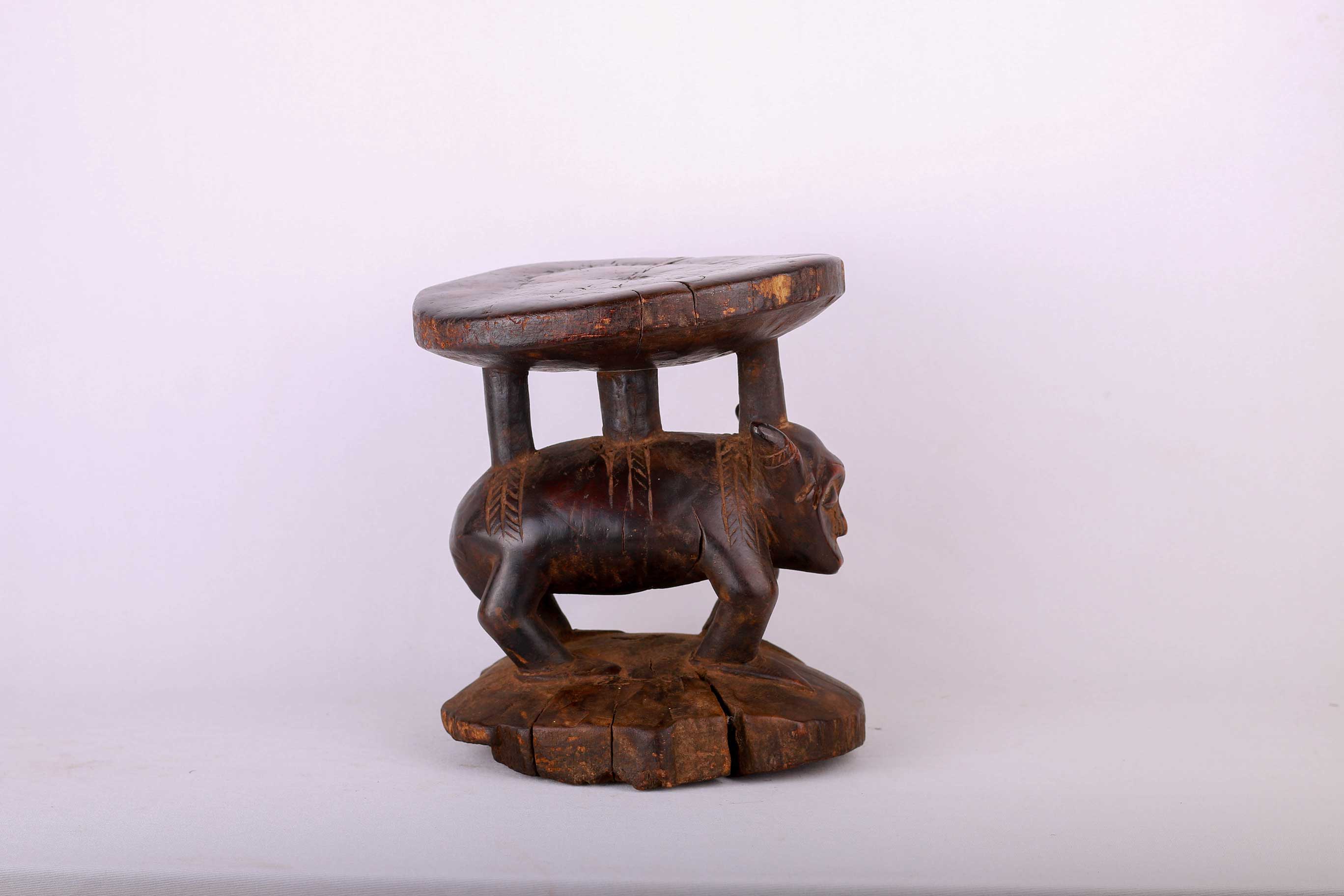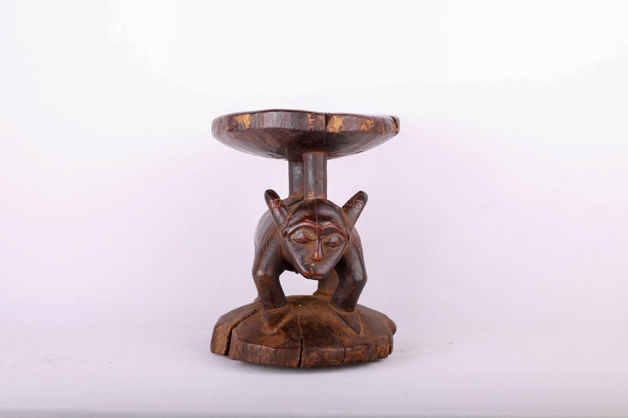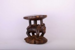 The Pende people settled in the region near the Loango and Kasai Rivers. The Pende also make ritual or practical objects, such as chairs, stools, commanders’ stuff, flutes, horns, whistles, drums, weapon, cups, mortars, and divination instruments. These stools were personal to the owner. They were not transferred or traded, so intimately associated were they with the person for whom they were made. The size of the stool was often in relation to the importance of the owner. This stool is in good condition, though worn with age, and has evidence overall of old worn wear to the surfaces and it bares a dark glossy patina