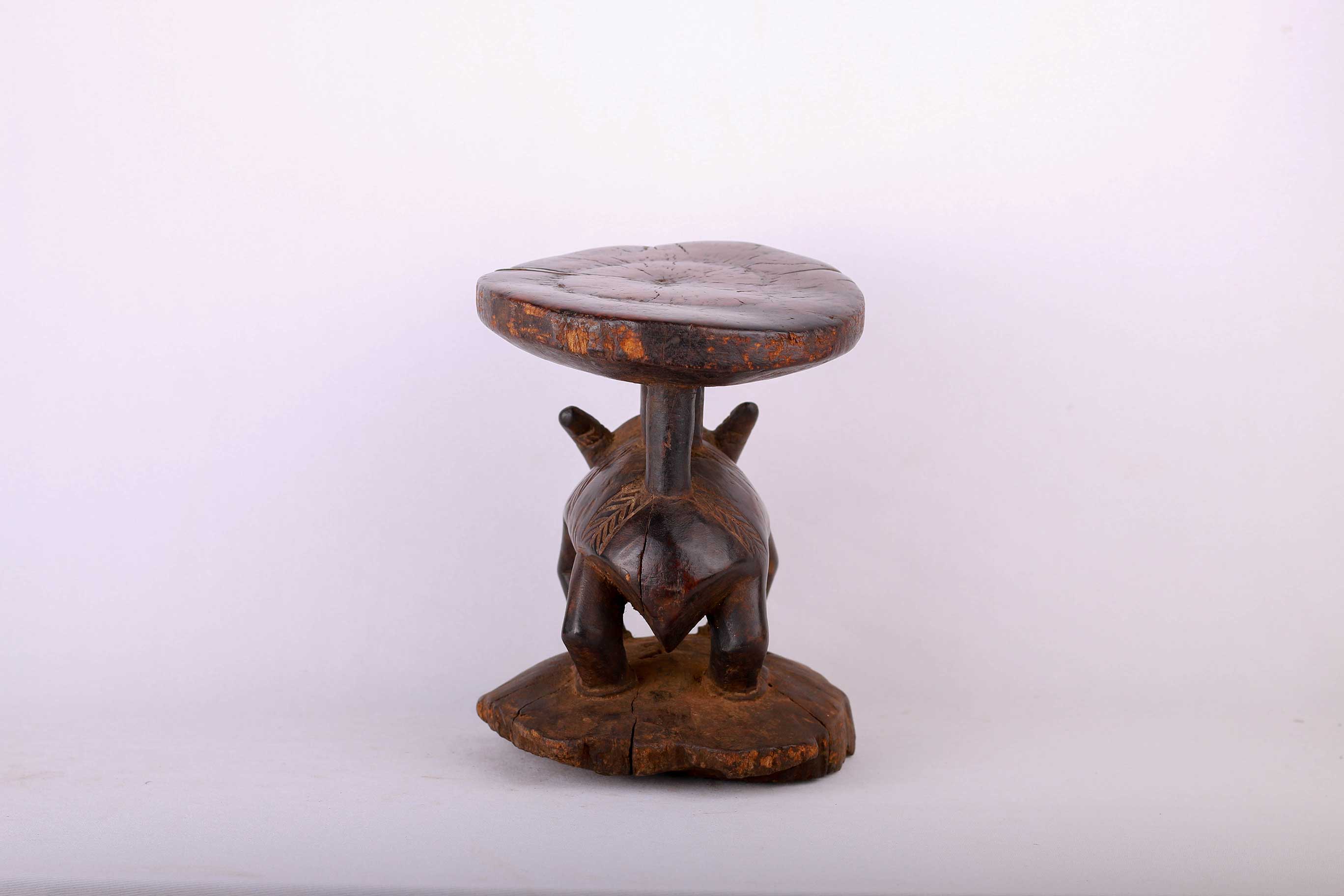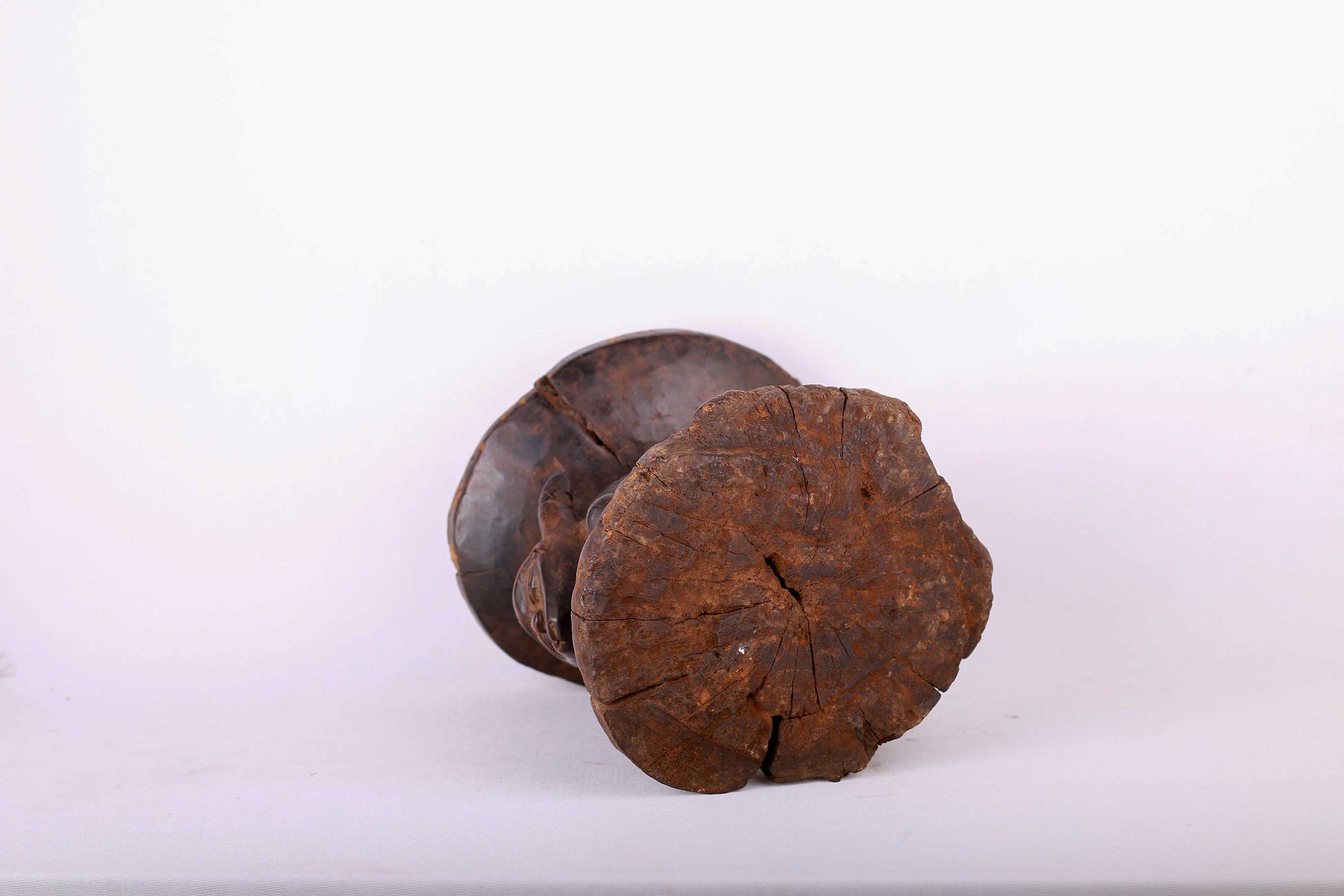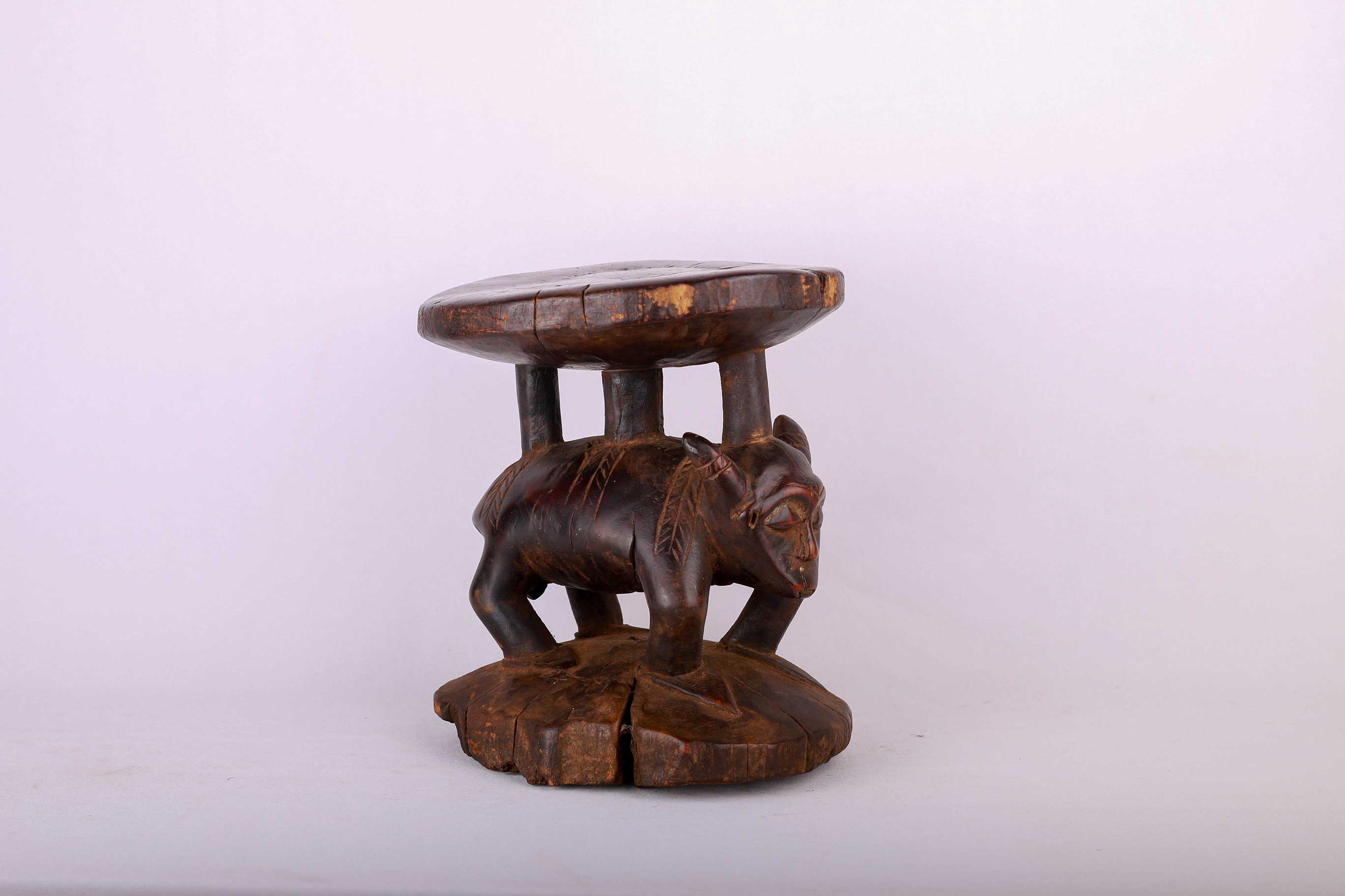 The Pende people settled in the region near the Loango and Kasai Rivers. The Pende also make ritual or practical objects, such as chairs, stools, commanders’ stuff, flutes, horns, whistles, drums, weapon, cups, mortars, and divination instruments. These stools were personal to the owner. They were not transferred or traded, so intimately associated were they with the person for whom they were made. The size of the stool was often in relation to the importance of the owner. This stool is in good condition, though worn with age, and has evidence overall of old worn wear to the surfaces and it bares a dark glossy patina