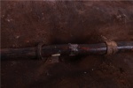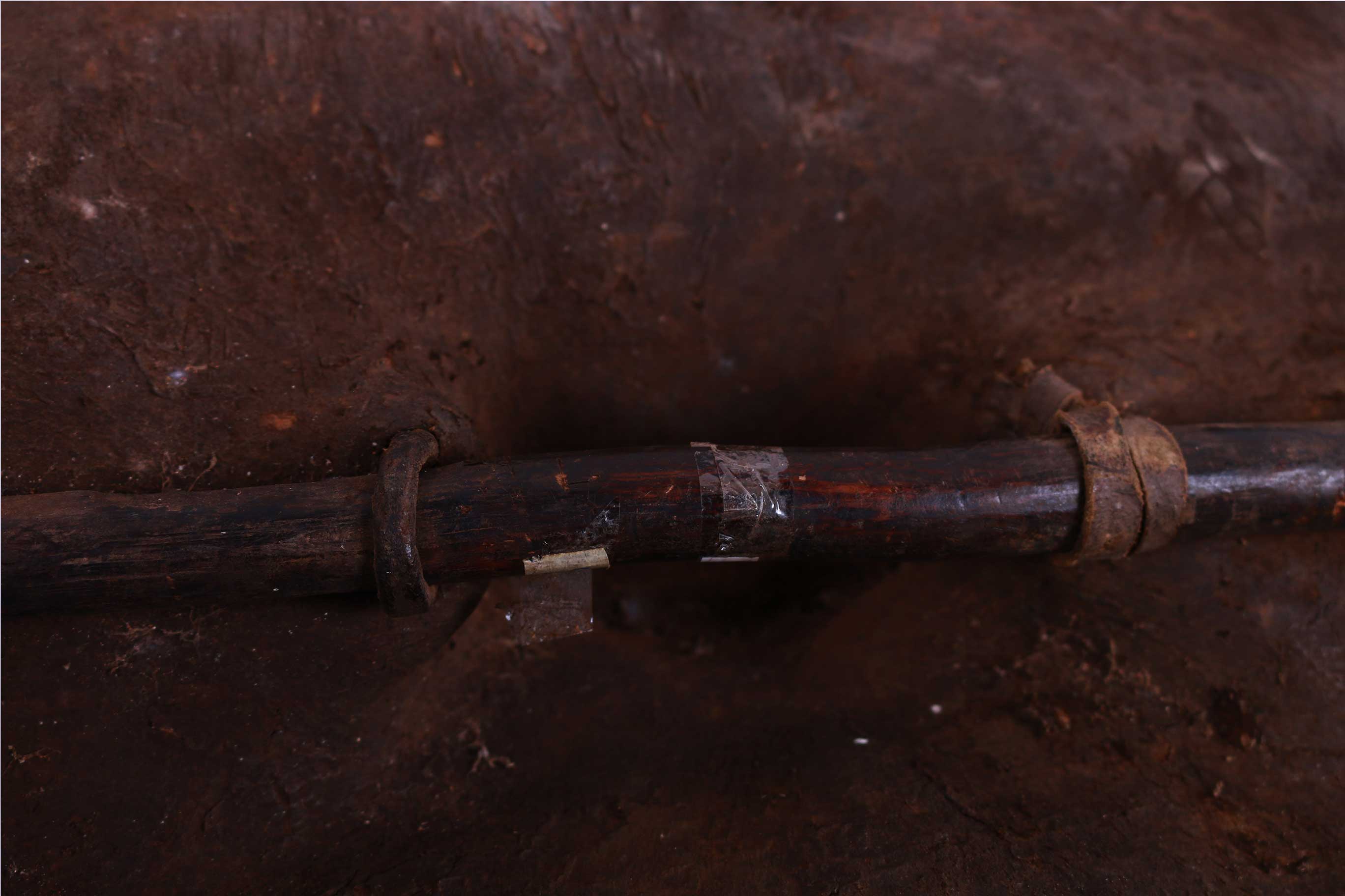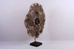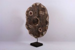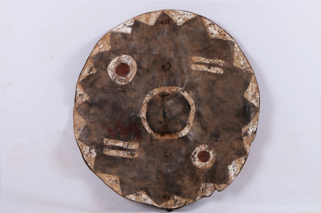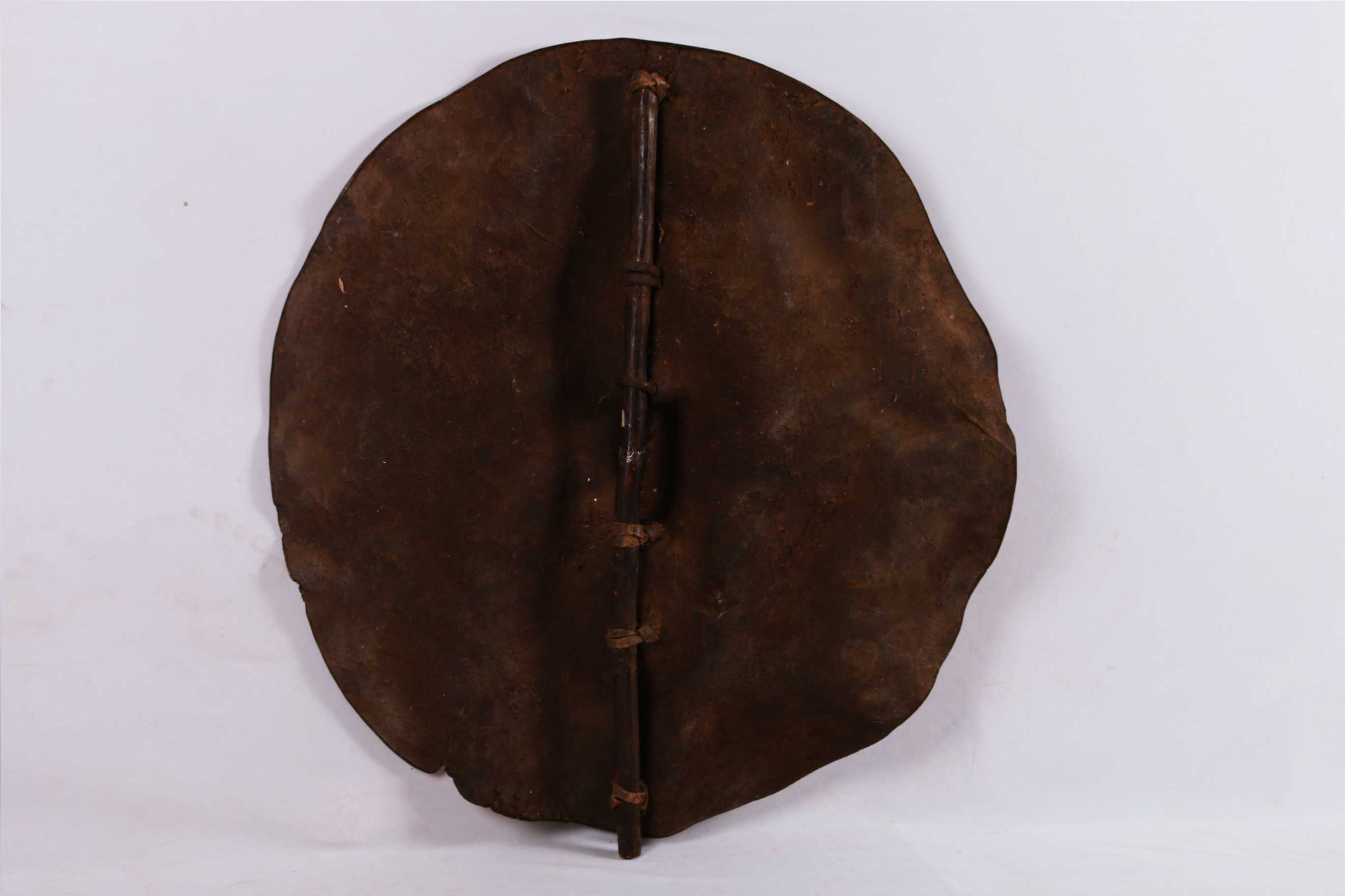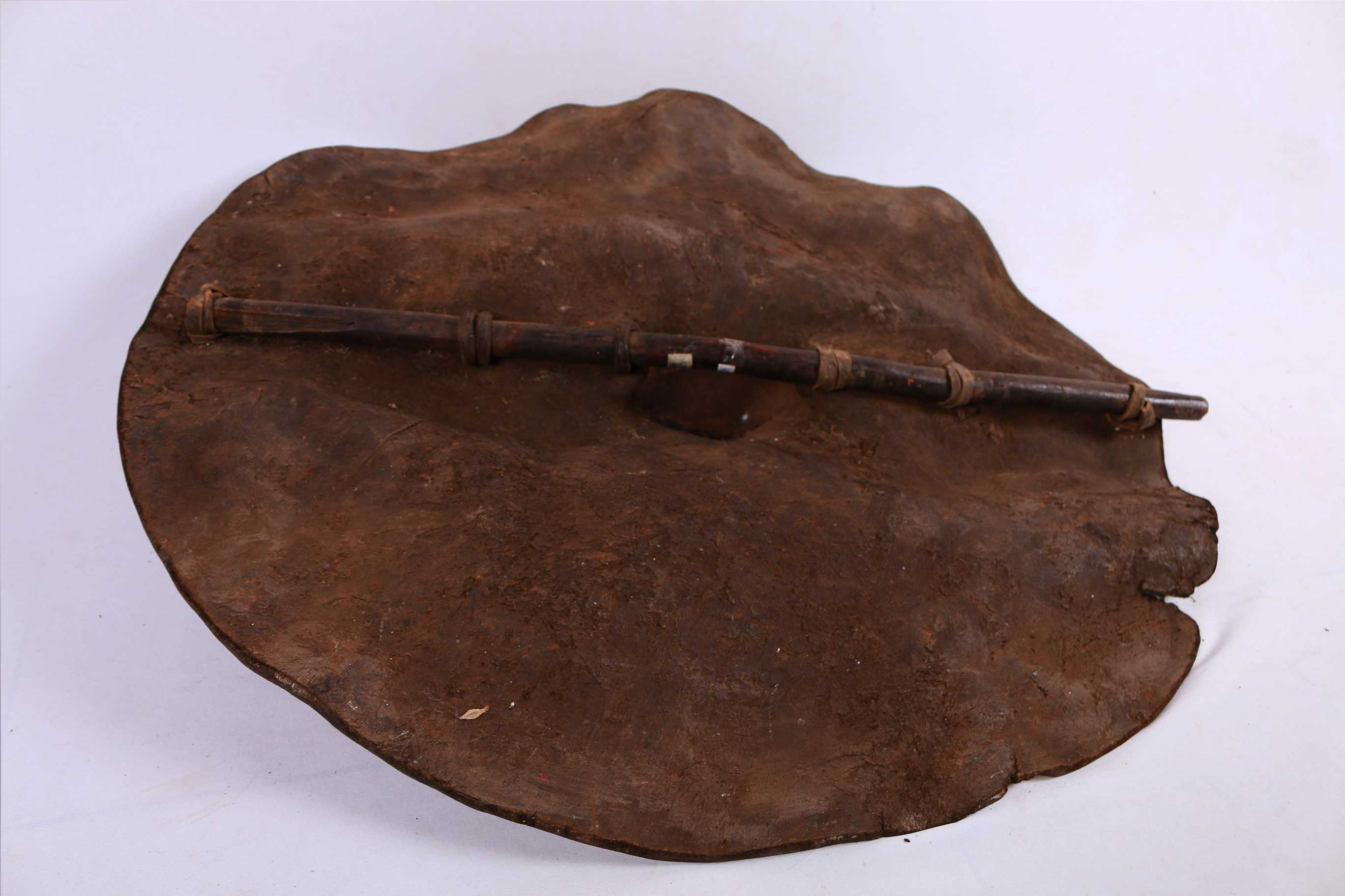 An unusually old Tanzania shield made of hard buffalo leather. C The leather of the shield is integrated into this wood construction and stretched by means of leather strips. The large vertical strut also serves as the grip of the shield, featuring a leather handguard. The front of the external side outside shows noticeable remains of the red, and white paintwork that is typical of Tanzania shields. Overall an interesting object with impressive age and usage
