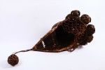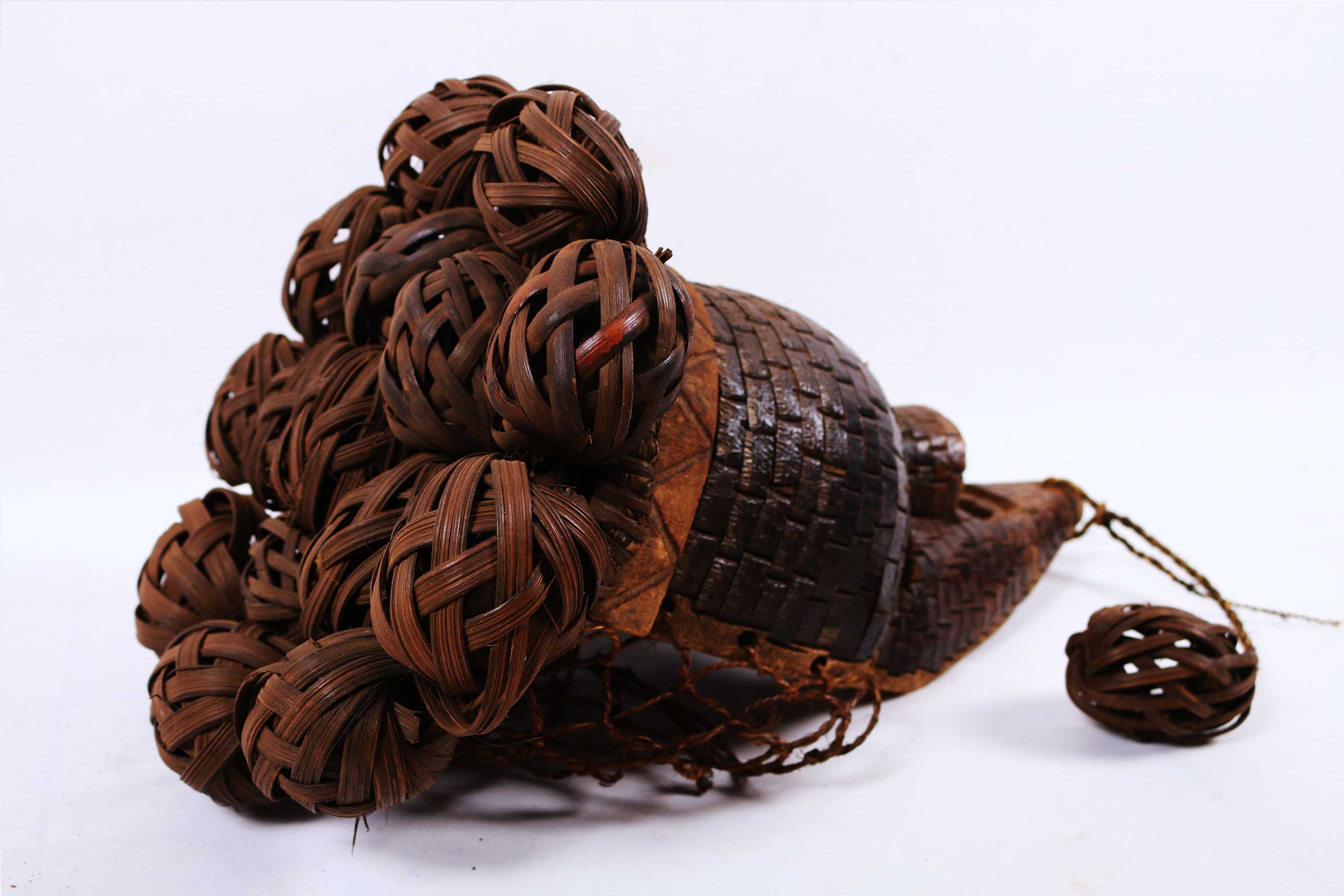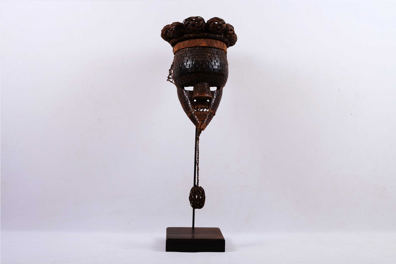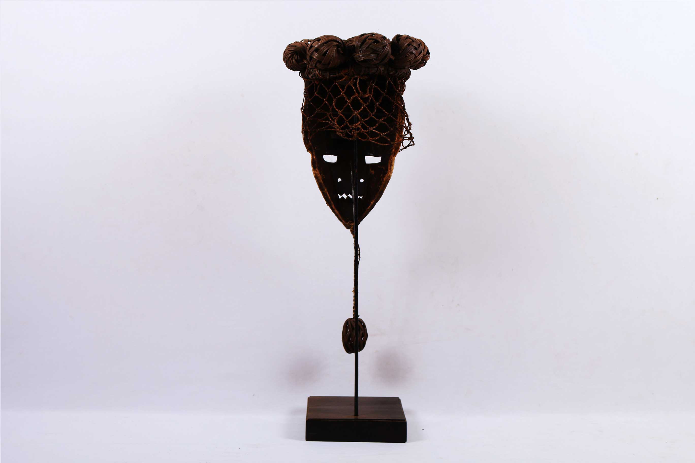 The Salampasu people live east of the Kasai River, on the frontier between the Democratic Republic of the Congo and Angola. Salampasu means “hunters of locusts”. They carved only two types of masks; anthropomorphic and zoomorphic. This is believed to be a feminine mask since there is no beard. This is an interesting mask carved out of wood and sisal, it has a white band separating an elongated forehead and headdress, it has a long pointed chin. These masks were used during initiation ceremonies where the masculine individual becomes a man, they were worn by warriors who have killed in battle. Possessing many masks indicated not only wealth but also knowledge. Filing teeth making part of many wooden masks were part of the initiation process for both boys and girls designed to demonstrate the novices’ strength and discipline. It has a dark patina and shows signs of age