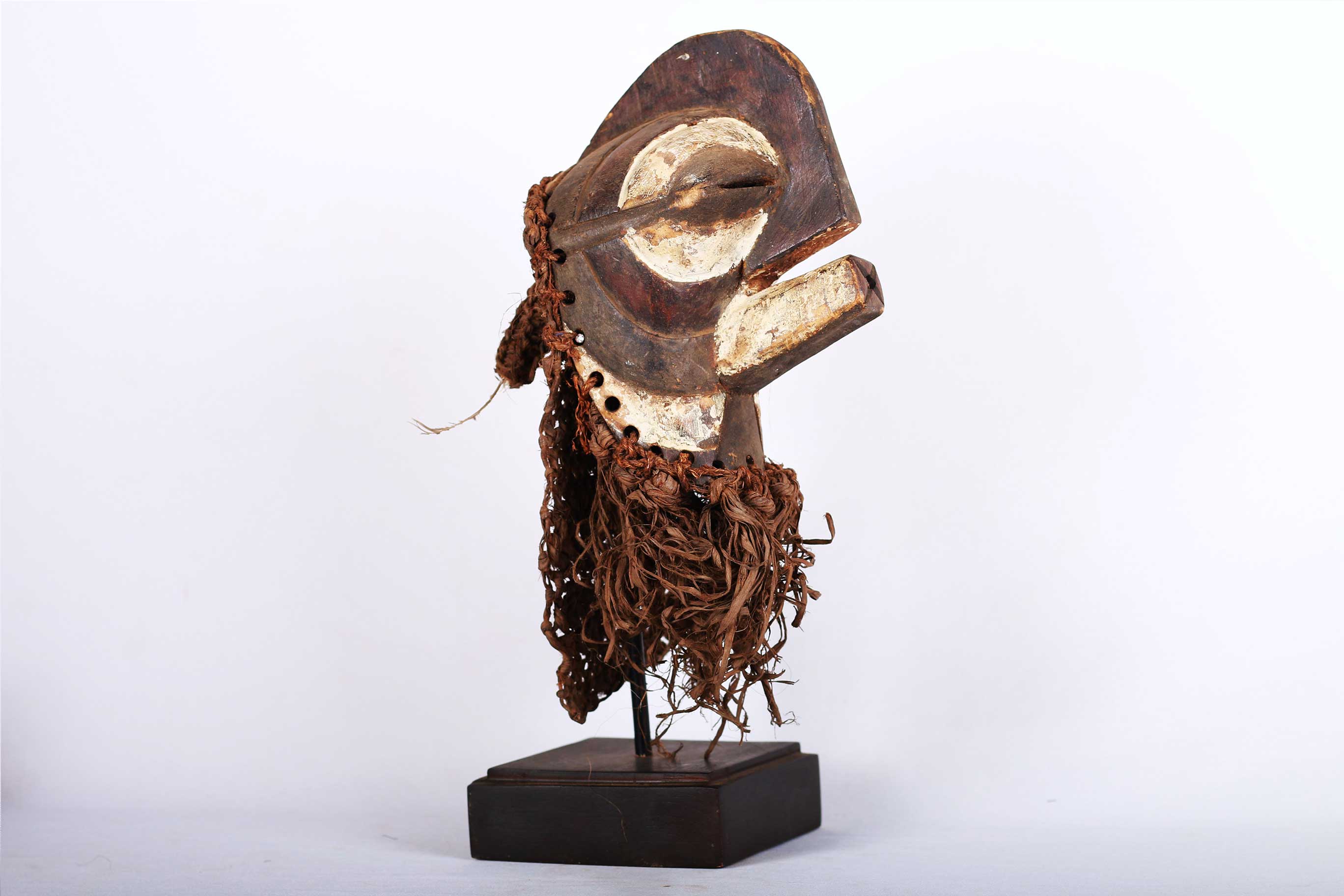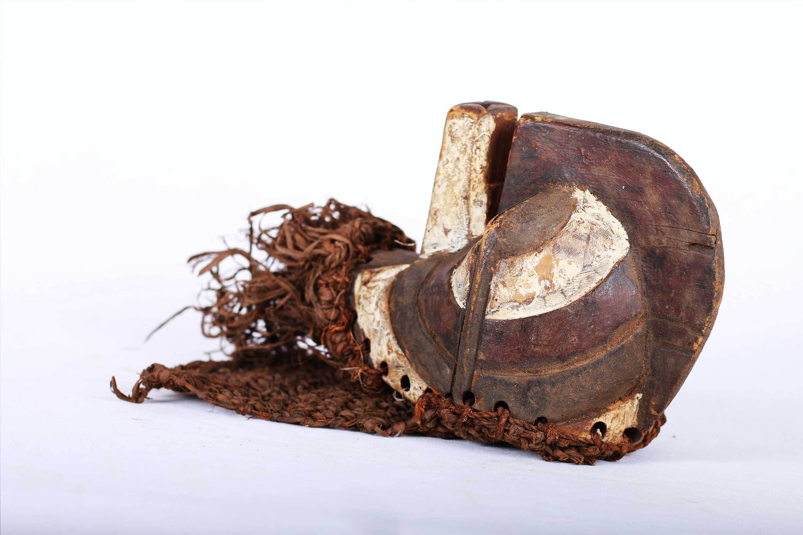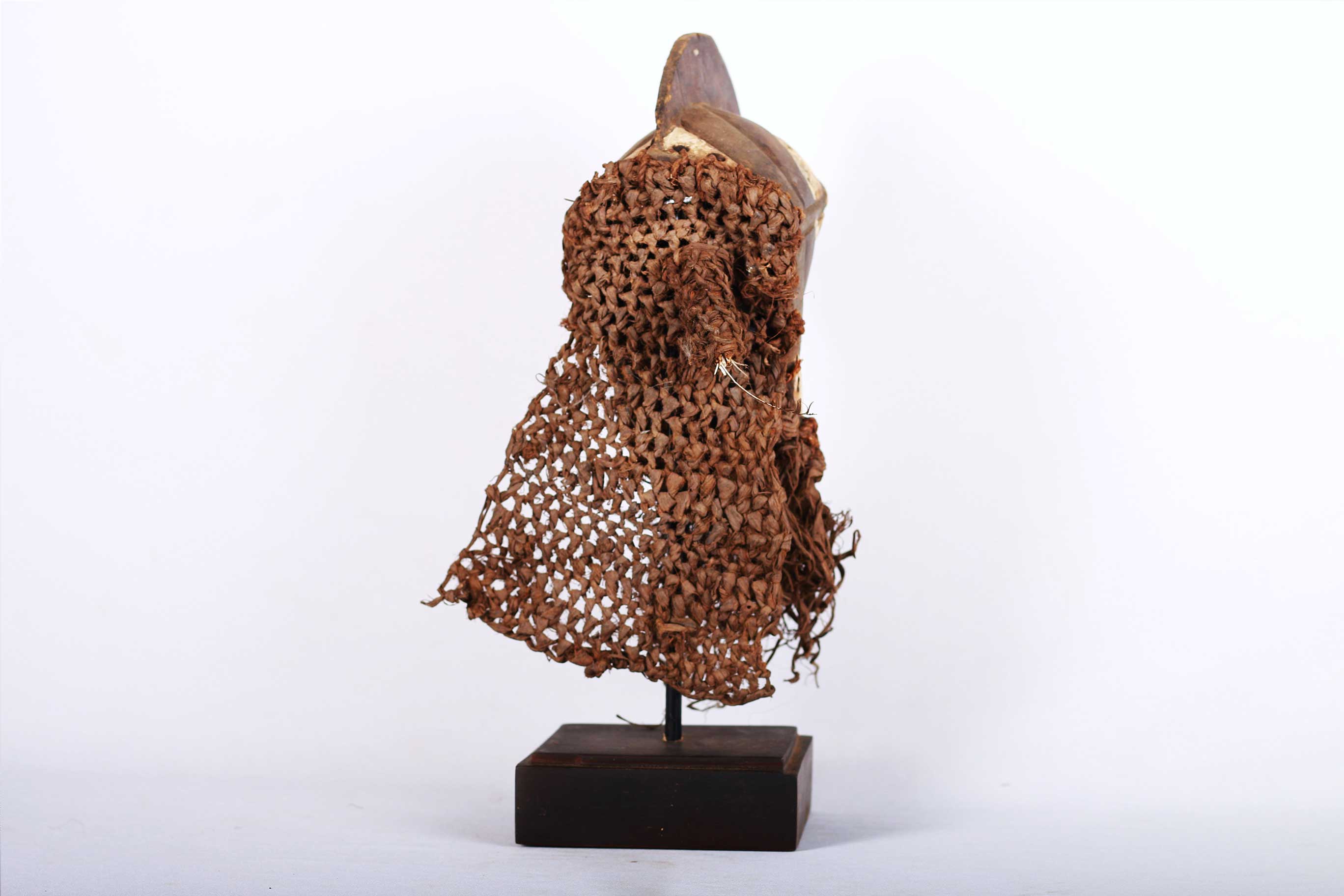 Kifwebe masks were made for the Bwadi Bwa Kifwebe association a masculine initiatory society in Songye a Bantu ethnic group from the central Democratic Republic of Congo. The Songye people are well-known woodcarvers for making ceremonial masks and power figures. Members of this society were believed to possess sorcerers’ powers, they exerted control over the population in order to maintain the status of the political elite. This is an interesting mask that provided a means of controlling social behaviour and neutralizing disruptive elements within the group, Senior masks have larger sagittal crests as an indication of their higher degree of social power. These smaller passport-style masks were used in a frightening ritual symbolically transforming boys into men, it has raffia on the chin, fibre woven in a mesh-like form covering the back of the mask and parts of the mask painted with white paint. This is undoubtedly an old mask with visible wear and tear both on the front and back and shows great signs of age and usage.