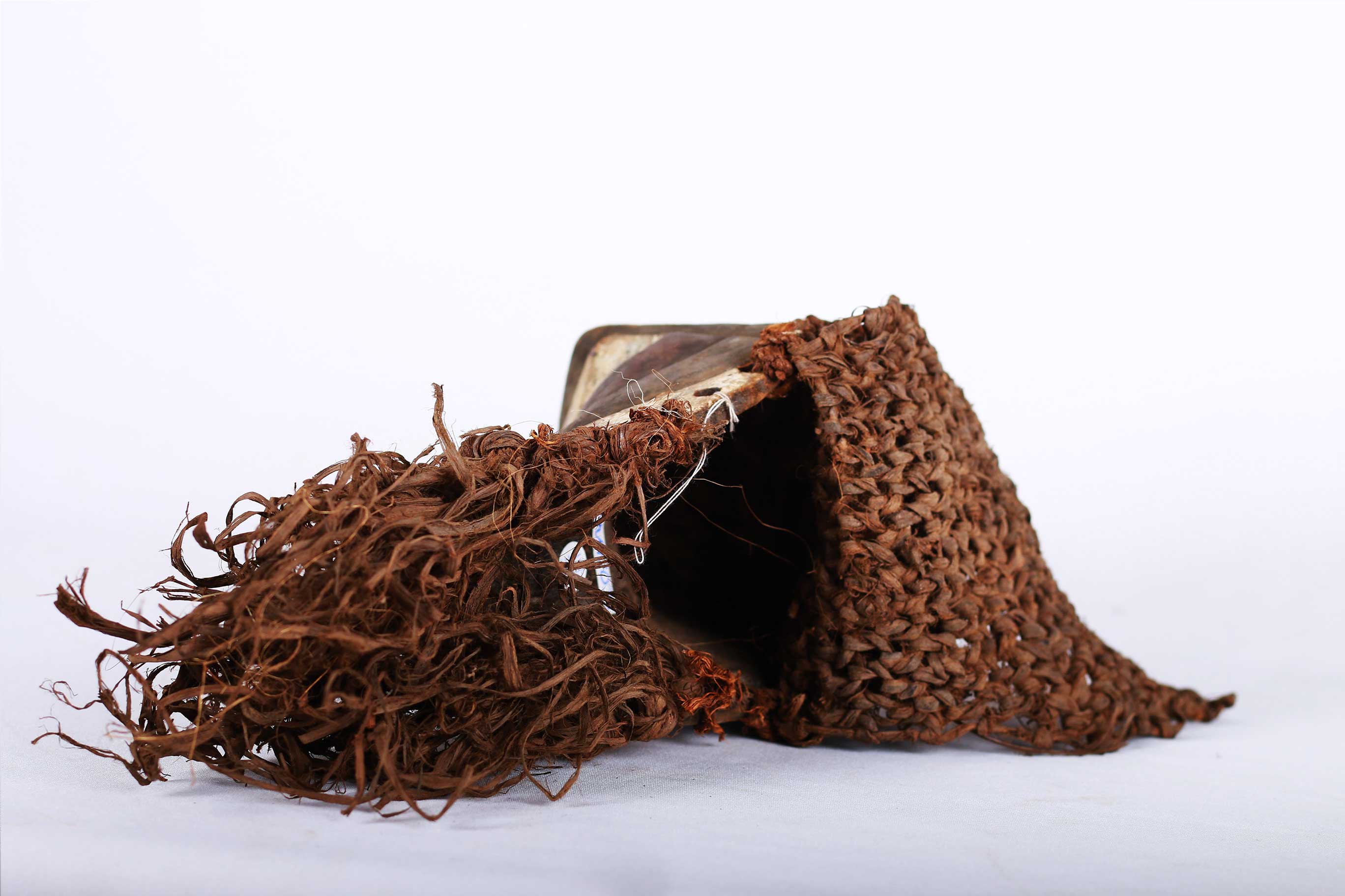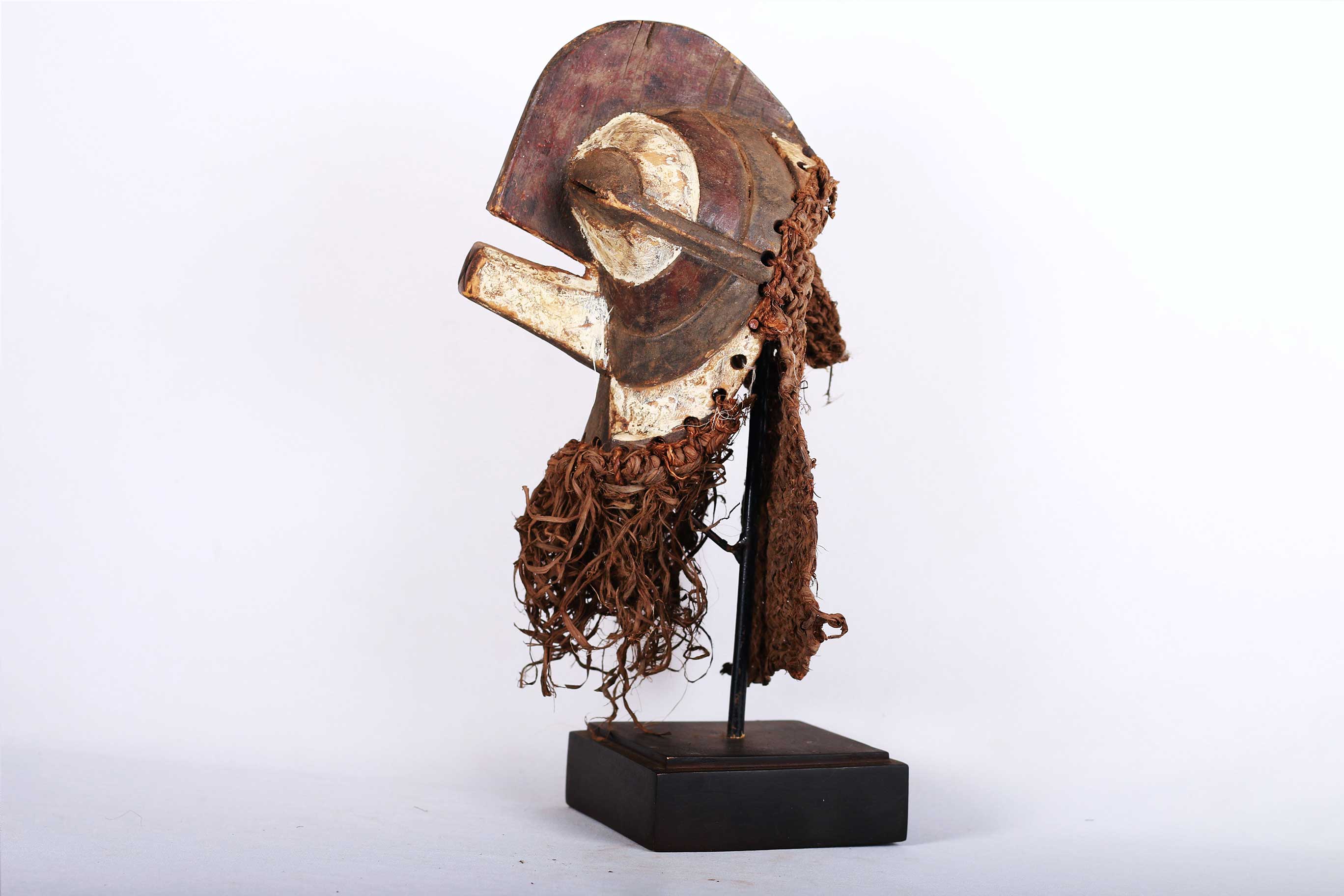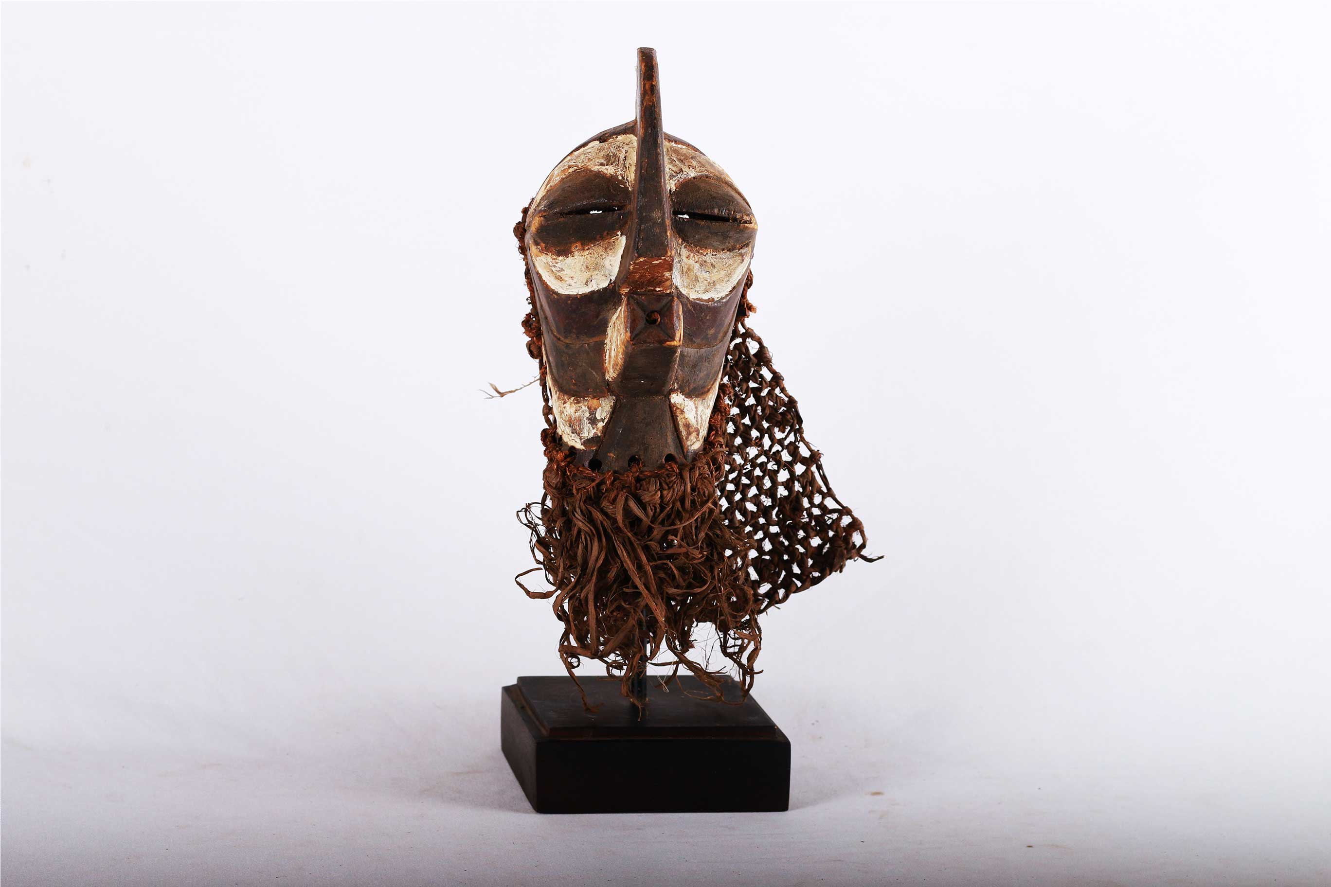 Kifwebe masks were made for the Bwadi Bwa Kifwebe association a masculine initiatory society in Songye a Bantu ethnic group from the central Democratic Republic of Congo. The Songye people are well-known woodcarvers for making ceremonial masks and power figures. Members of this society were believed to possess sorcerers’ powers, they exerted control over the population in order to maintain the status of the political elite. This is an interesting mask that provided a means of controlling social behaviour and neutralizing disruptive elements within the group, Senior masks have larger sagittal crests as an indication of their higher degree of social power. These smaller passport-style masks were used in a frightening ritual symbolically transforming boys into men, it has raffia on the chin, fibre woven in a mesh-like form covering the back of the mask and parts of the mask painted with white paint. This is undoubtedly an old mask with visible wear and tear both on the front and back and shows great signs of age and usage.