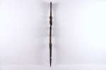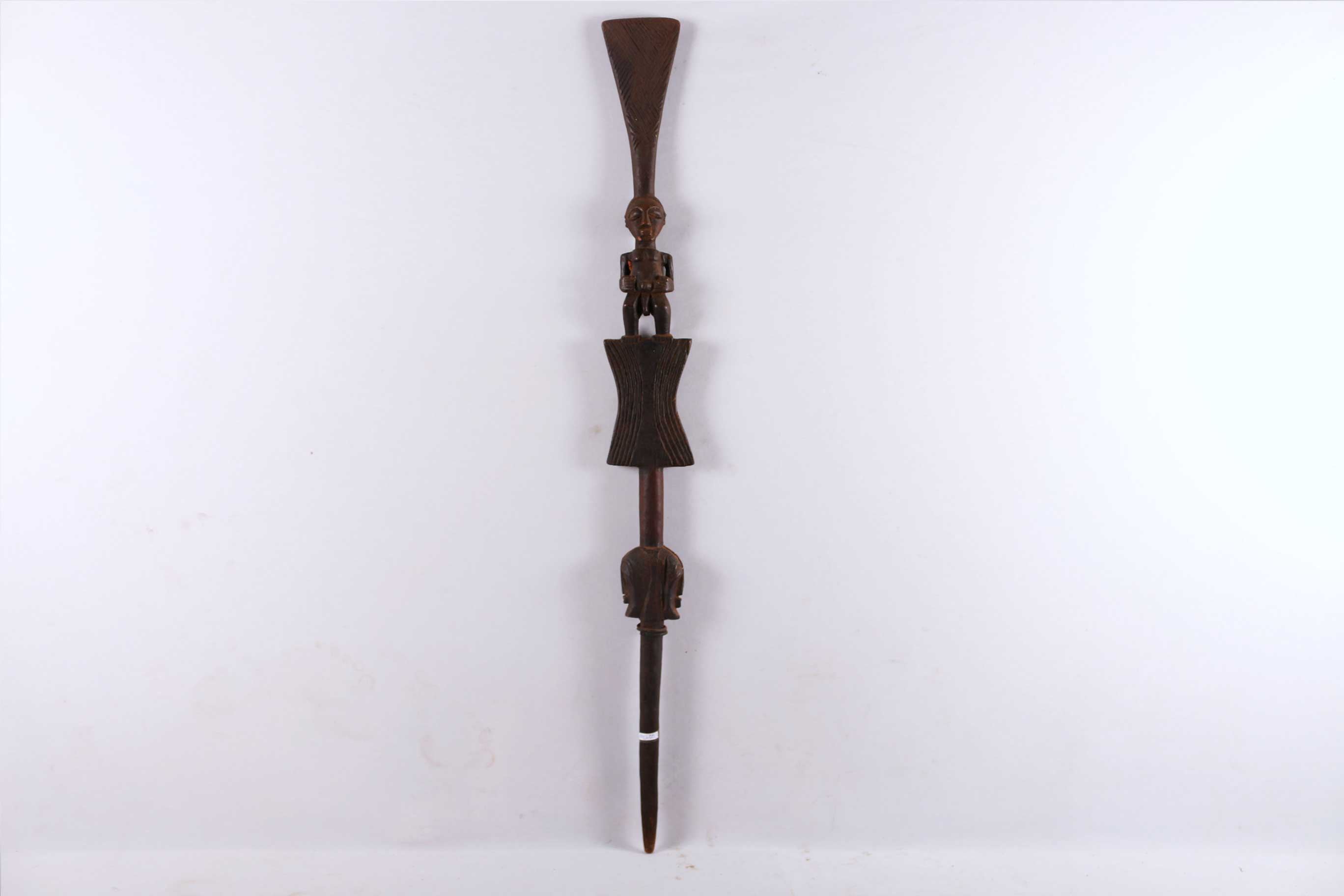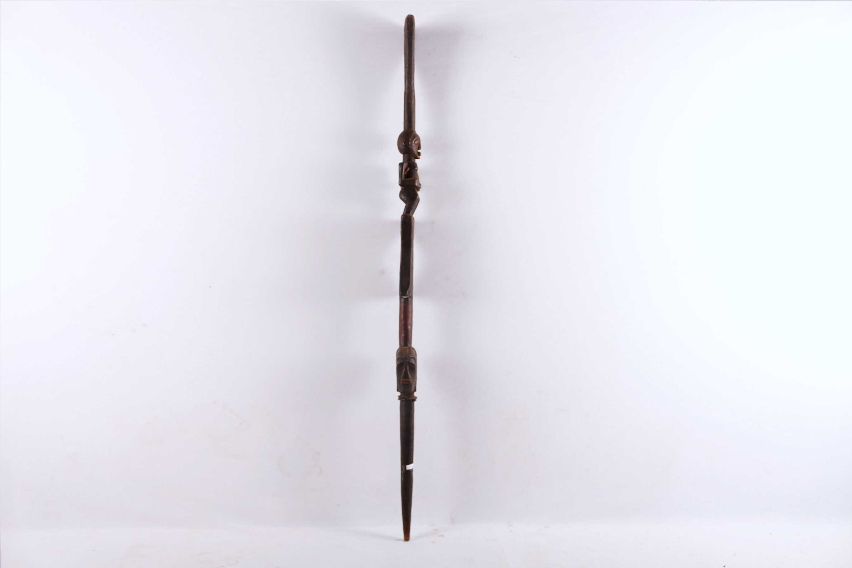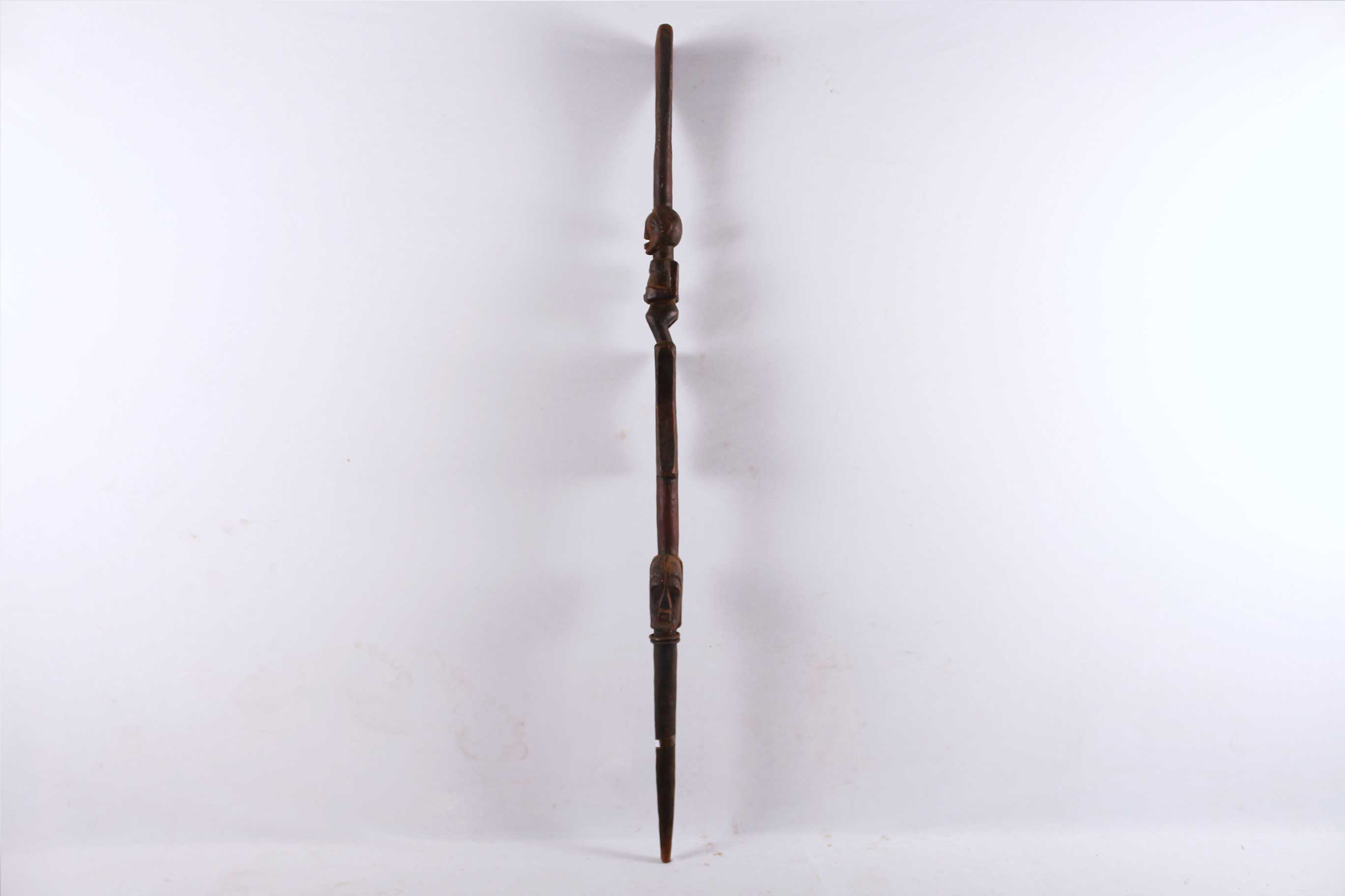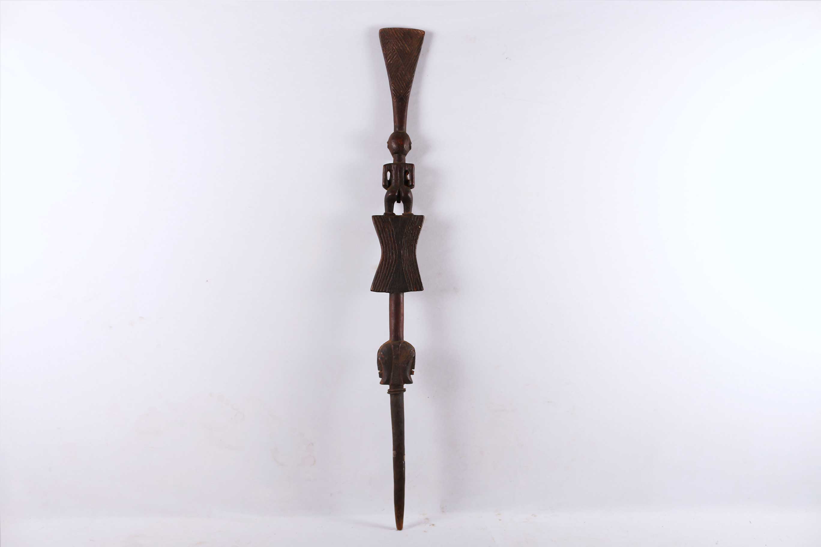 The Songye people are a Bantu ethnic group from the central Democratic Republic Of Congo, the Songye made power figures. Walking sticks/canes were carved for men’s attire, they were carefully carved ornamental objects made in different forms, they were used to provide support and as act as a symbol of authority among the Songye. This is an elegant cane decorated with a human figurine at the top standing on a wide convex side-shaped sculpted piece of wood and a long stick, it has a dark brown patina and shows signs of age.